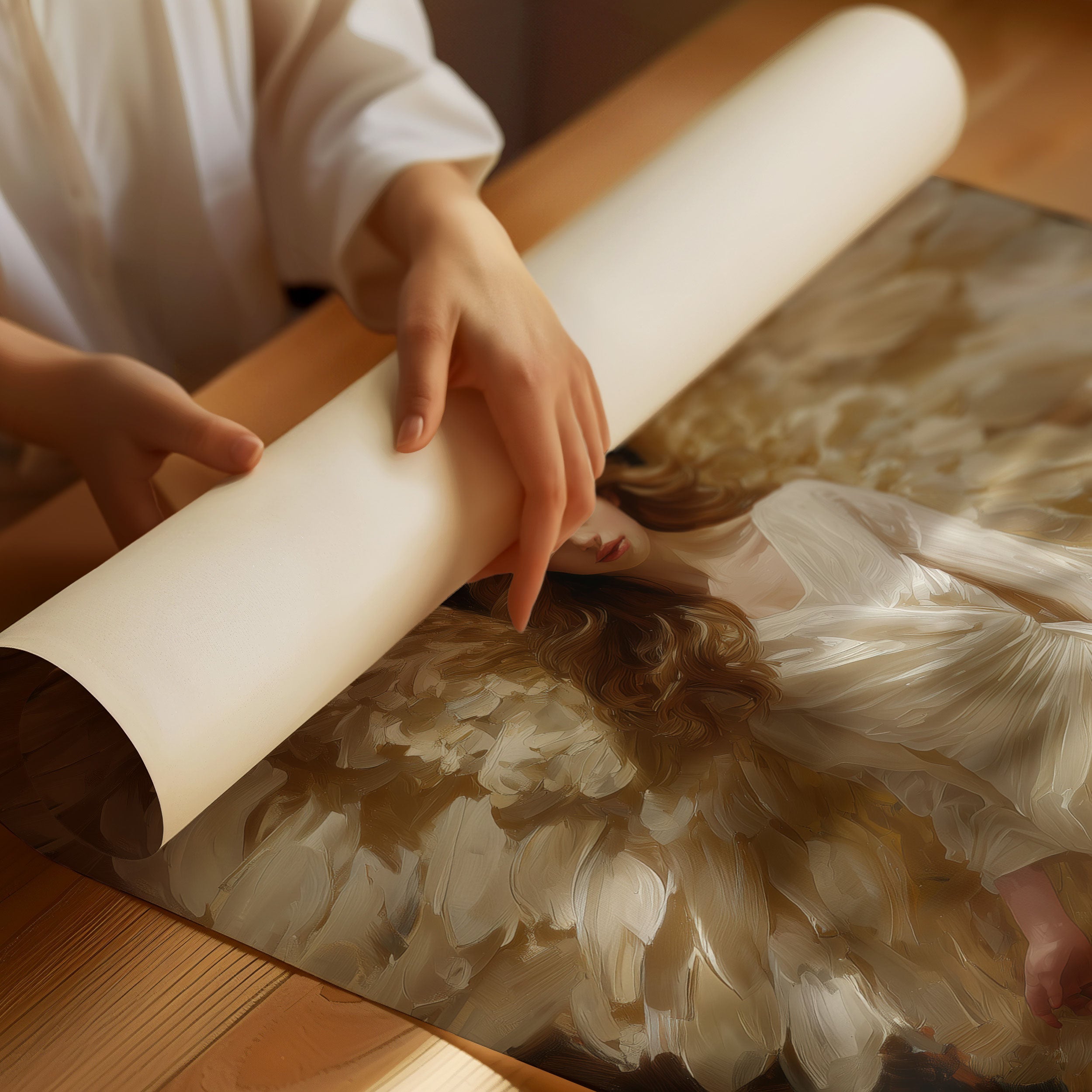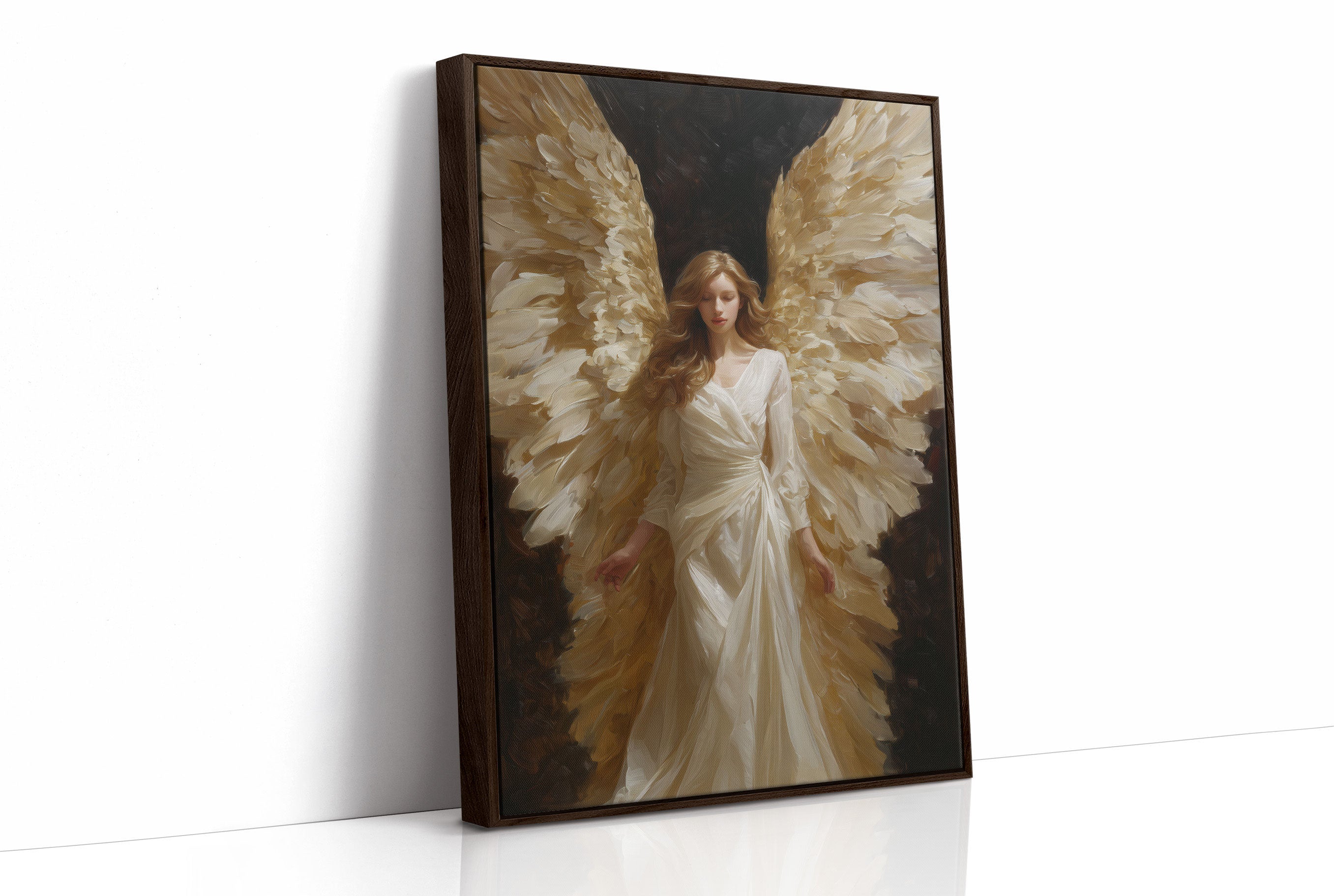 Soft golden light bathes a scene where celestial beauty meets holiday warmth. A striking portrait in ethereal whites and creams stands sentinel beside a frost-dusted Christmas tree adorned with copper and pearl ornaments. The interplay of warm bokeh lights and cool winter tones creates a harmonious balance, while wrapped presents in pristine white with copper ribbons echo the painting's ethereal palette. This piece captures the magical intersection of earthly celebration and divine presence. A perfect focal point for spaces seeking to elevate their spiritual ambiance, particularly suited for living rooms, meditation spaces, or elegant entryways where its presence can inspire contemplation and peace.