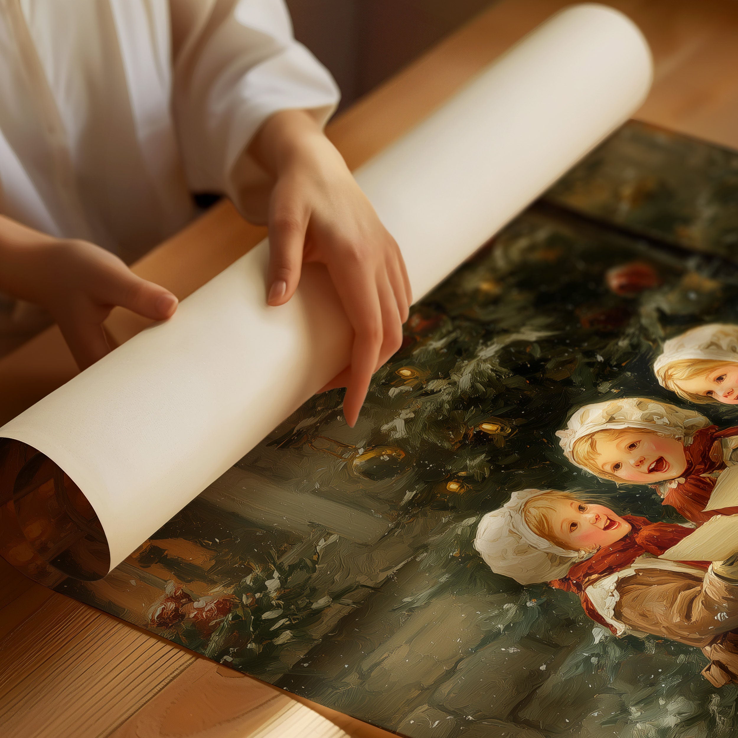 Soft winter light streams through sheer curtains, casting gentle shadows across a serene corner decorated for the holidays. A vintage-inspired artwork depicting carolers beneath a lamppost hangs above a minimalist wooden bench, while a luminous white Christmas tree glows with warm lights. The neutral palette of cream, beige, and natural wood creates a peaceful sanctuary where traditional holiday charm meets contemporary design. This thoughtful arrangement transforms an everyday space into a corner of seasonal magic. Perfect for creating an inviting entryway or peaceful reading nook where holiday memories can unfold.
