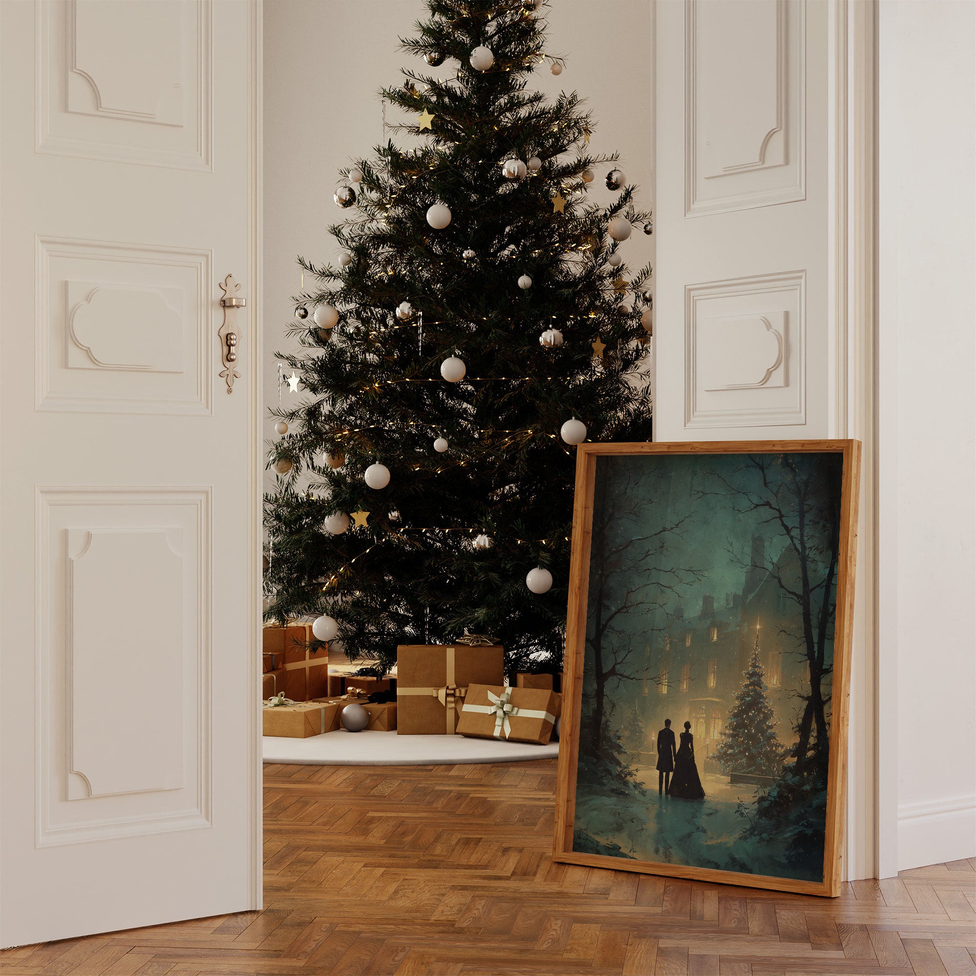 Soft lamplight spills across freshly fallen snow, creating a golden halo around two figures standing in peaceful contemplation. The mysterious teal-tinted darkness frames an elegant manor house, its windows warmly illuminated against the winter night. A decorated evergreen stands sentinel nearby, while bare branches reach across the misty sky, creating an enchanting scene that captures both romance and winter's quiet magic. Perfect for creating an atmospheric focal point in a formal living room or adding seasonal charm to an entryway during the holiday months.