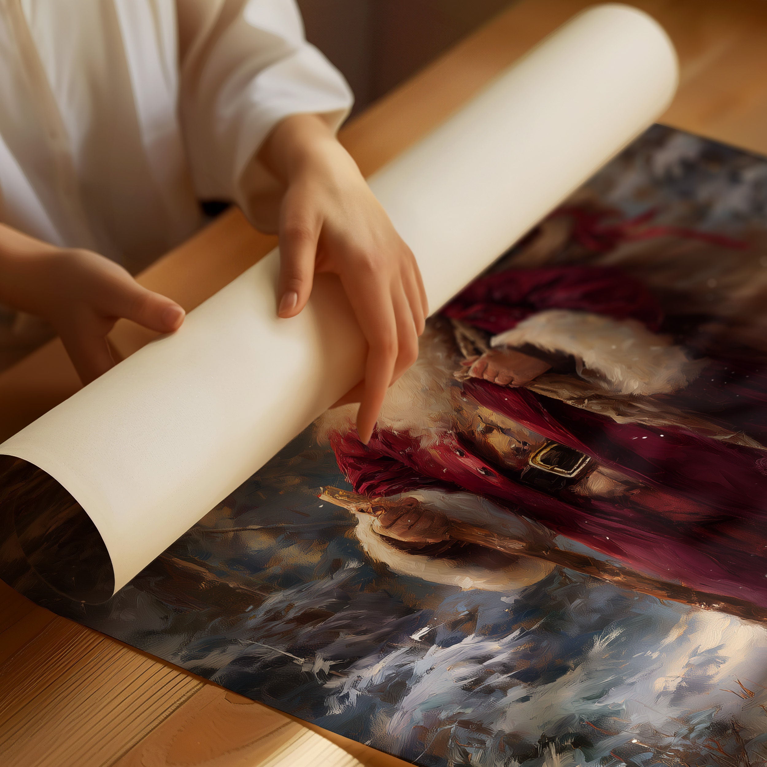 A warm glow radiates from this festive holiday scene, where a decorated Christmas tree sparkles with frost-kissed branches and copper-toned ornaments. In the framed artwork, a traditional winter scene unfolds through soft brushstrokes, capturing the magic of a snowy forest journey. The composition marries modern elegance with timeless holiday charm through a palette of whites, golds, and deep crimsons, while wrapped presents in pristine white and copper ribbons complete the seasonal story. Perfect for creating a sophisticated holiday atmosphere in living rooms, entryways, or any space where Christmas memories are cherished.