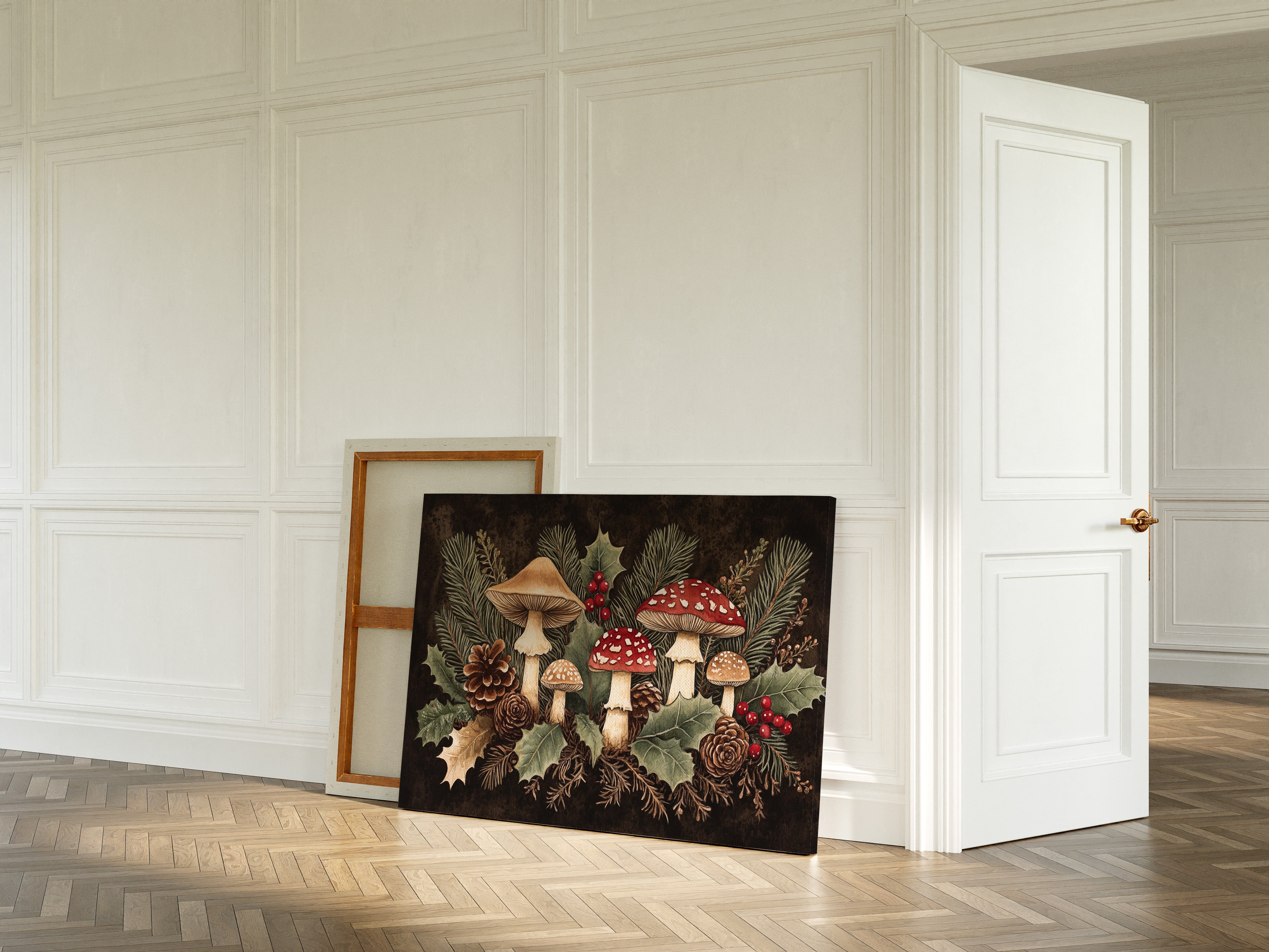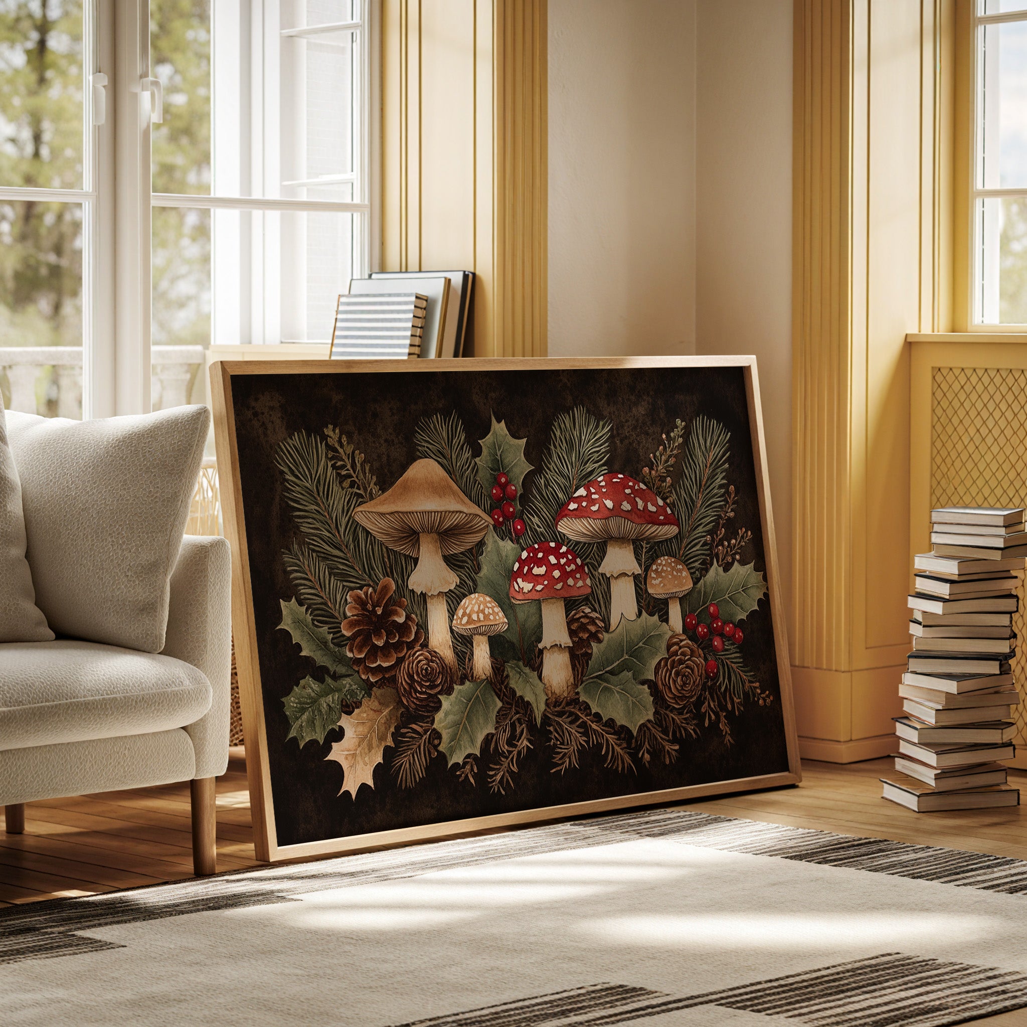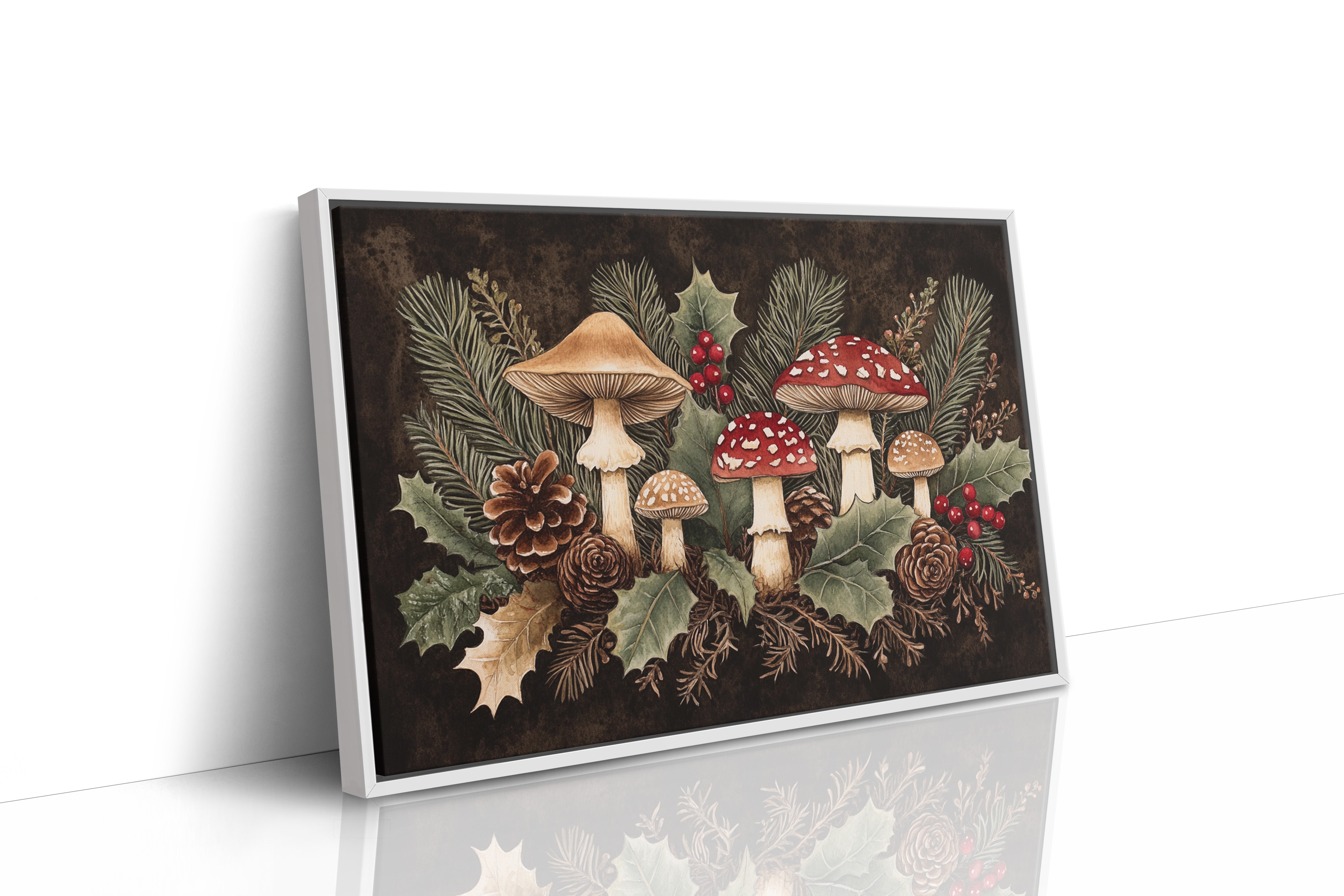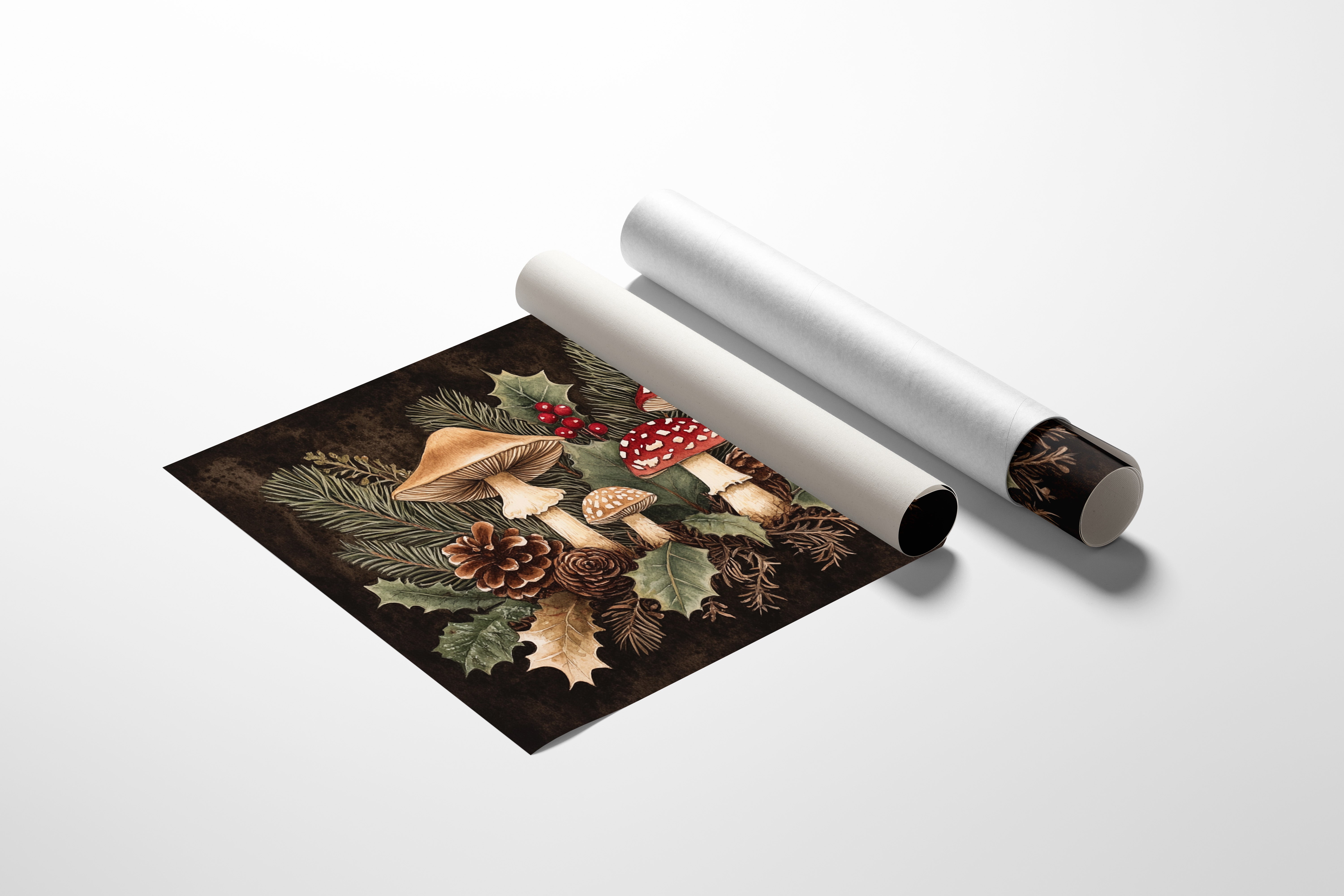 Deep in the winter woods, a magical gathering of mushrooms emerges among holly and pine. Crimson amanitas with their spotted caps stand proudly alongside creamy beige companions, creating a whimsical woodland scene. Pine needles weave through holly leaves while pinecones rest beneath, their brown spirals echoing the earthy palette of the forest floor. The rich contrast of red berries against dark shadows and verdant foliage captures the essence of winter's hidden treasures. Perfect for a cozy reading nook or kitchen space where its folkloric charm can inspire everyday magic.
