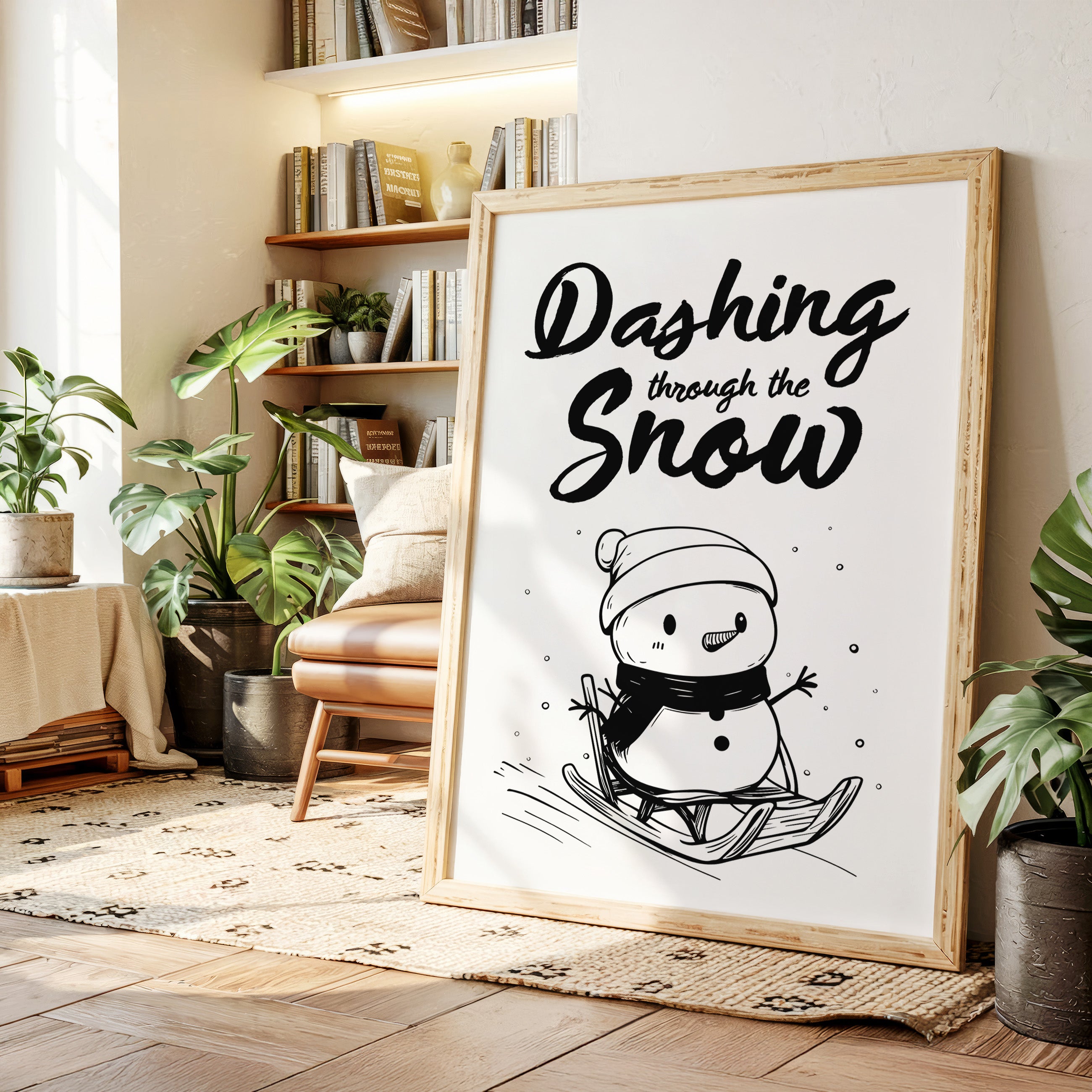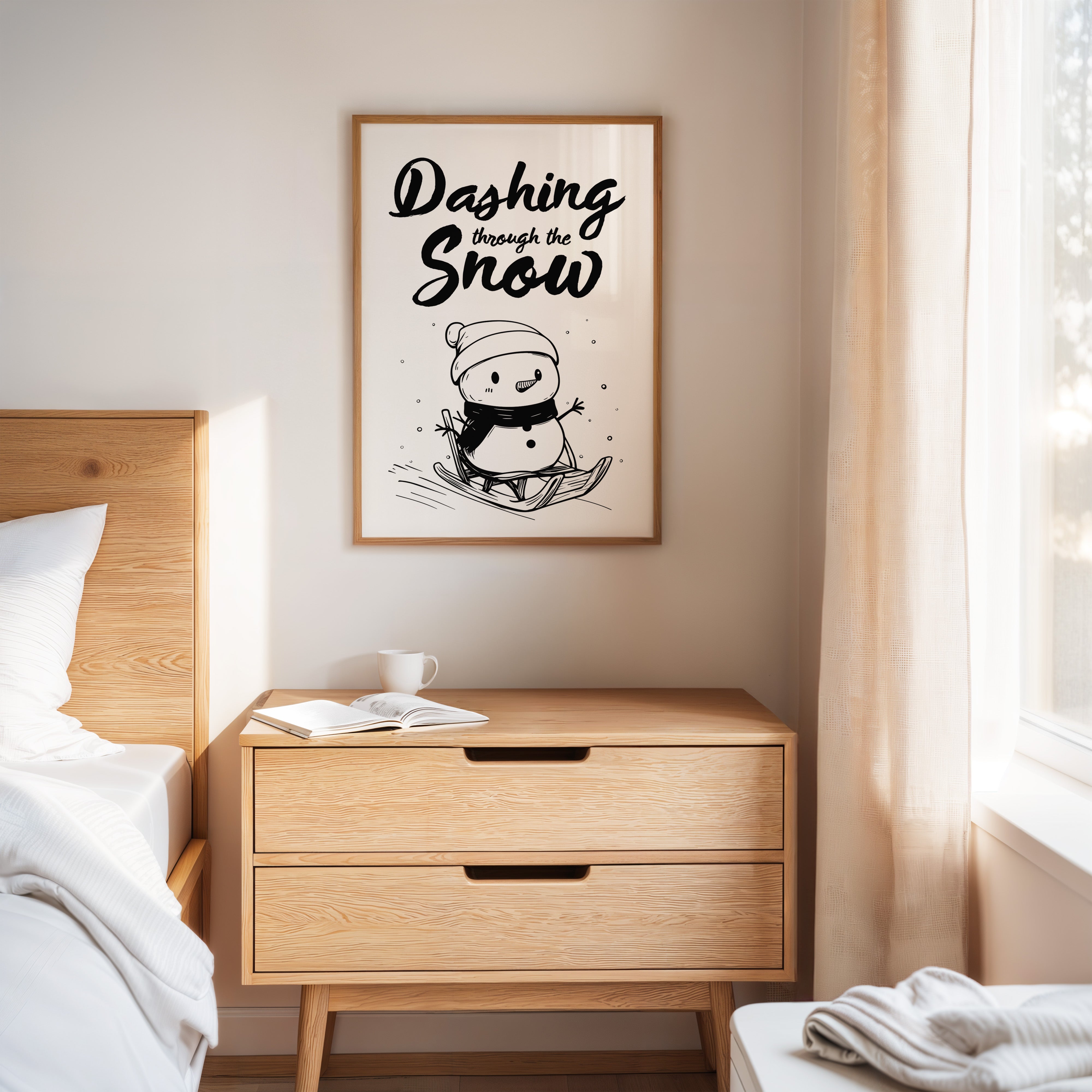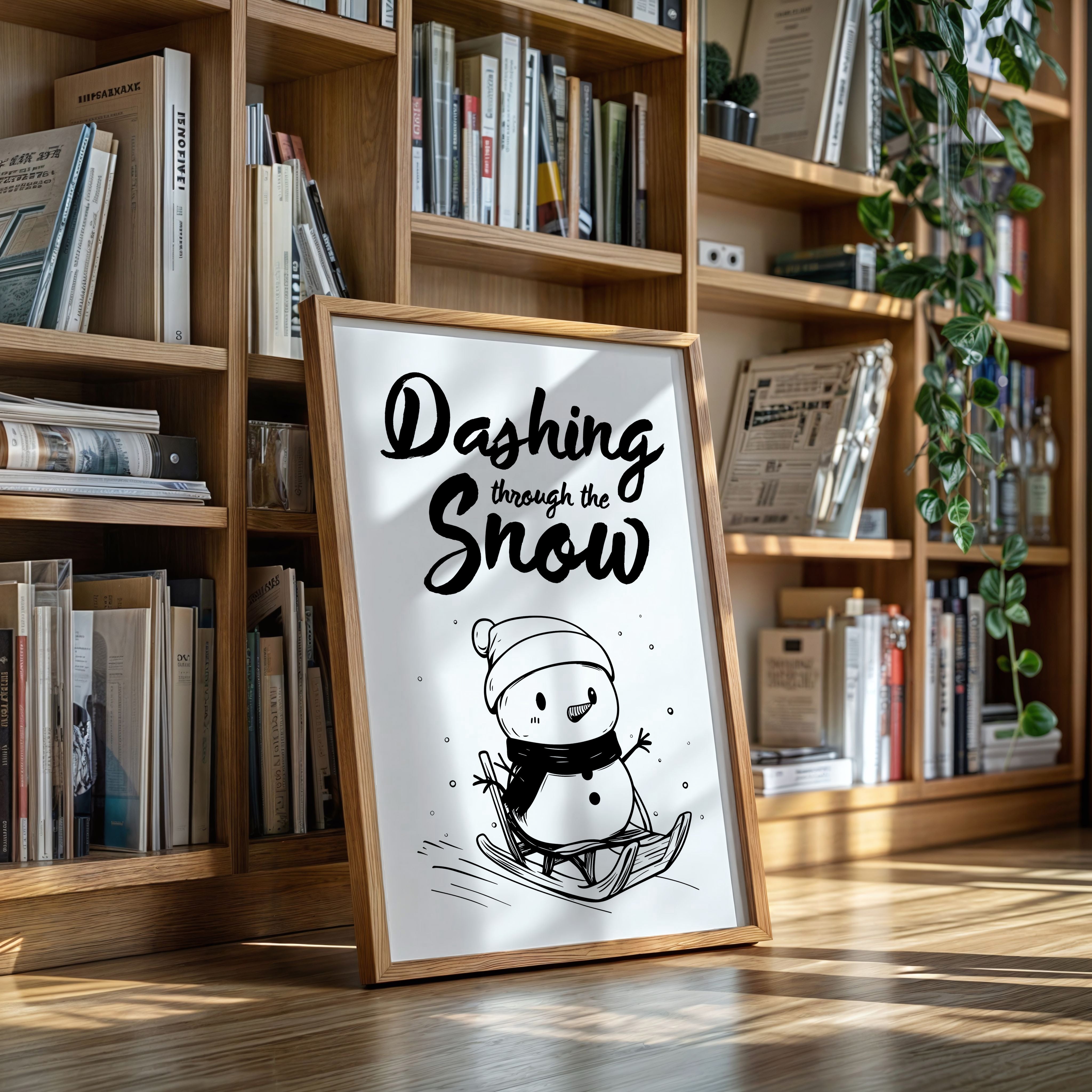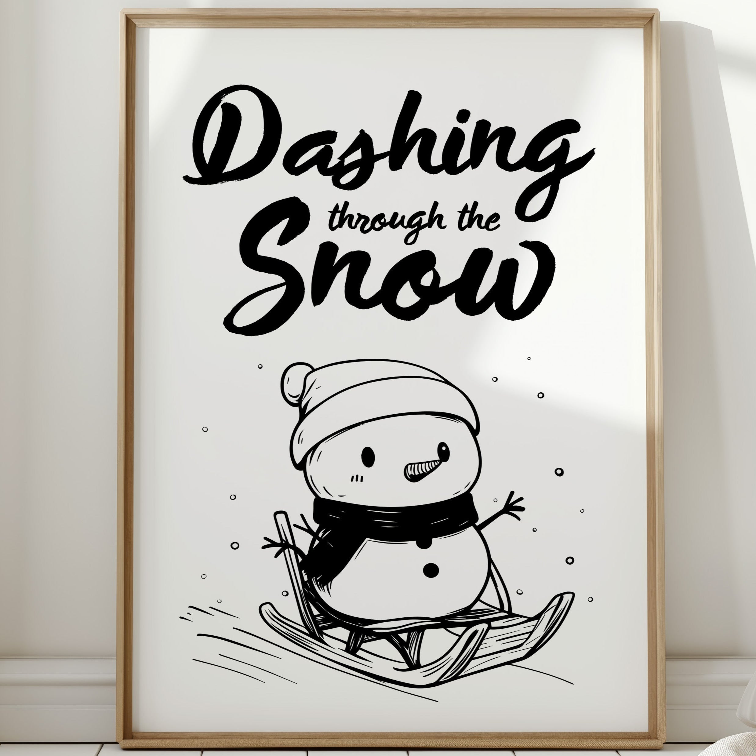 A charming snowman catches the thrill of a downhill adventure, his scarf flying in the winter breeze. This playful piece from our Contemporary collection captures childhood wonder in clean black and white strokes. The simple yet expressive illustration brings to life that magical moment of pure winter joy - a tiny snowman with a big personality, perched confidently on his wooden sled, ready for his next run down the snowy slope. Perfect for adding a touch of whimsy to a child's room or bringing seasonal charm to any casual living space. Each glance brings back memories of crisp winter days and the simple pleasures of playing in the snow.