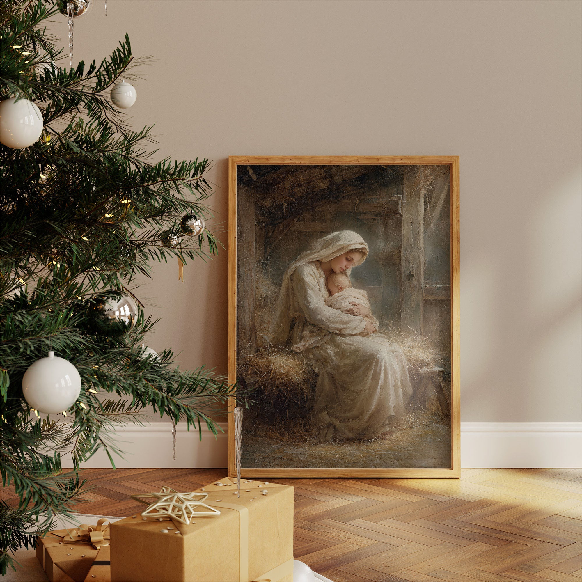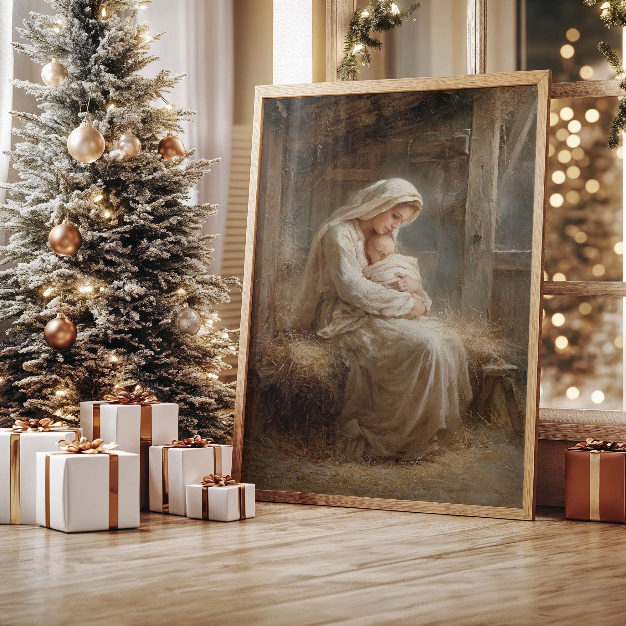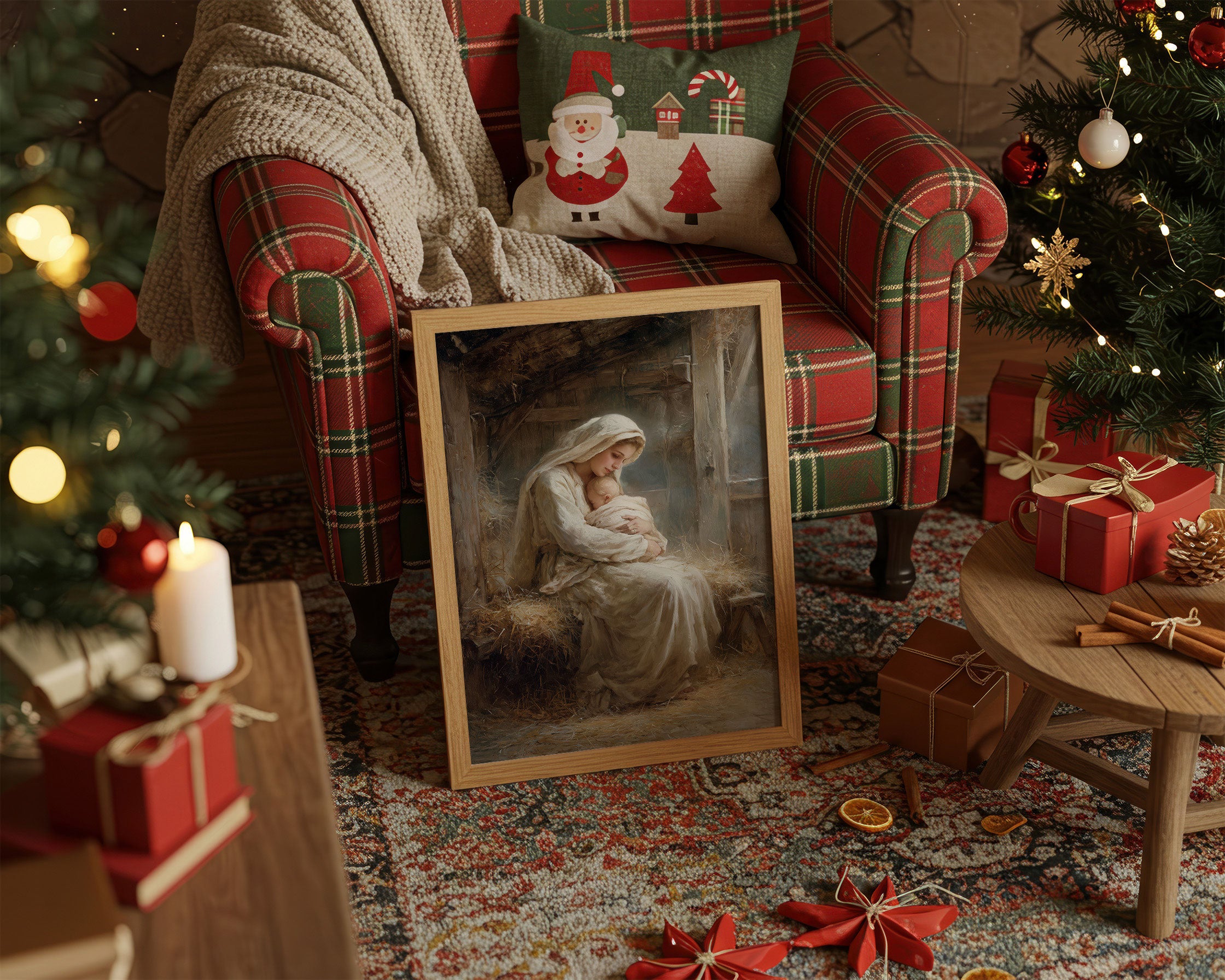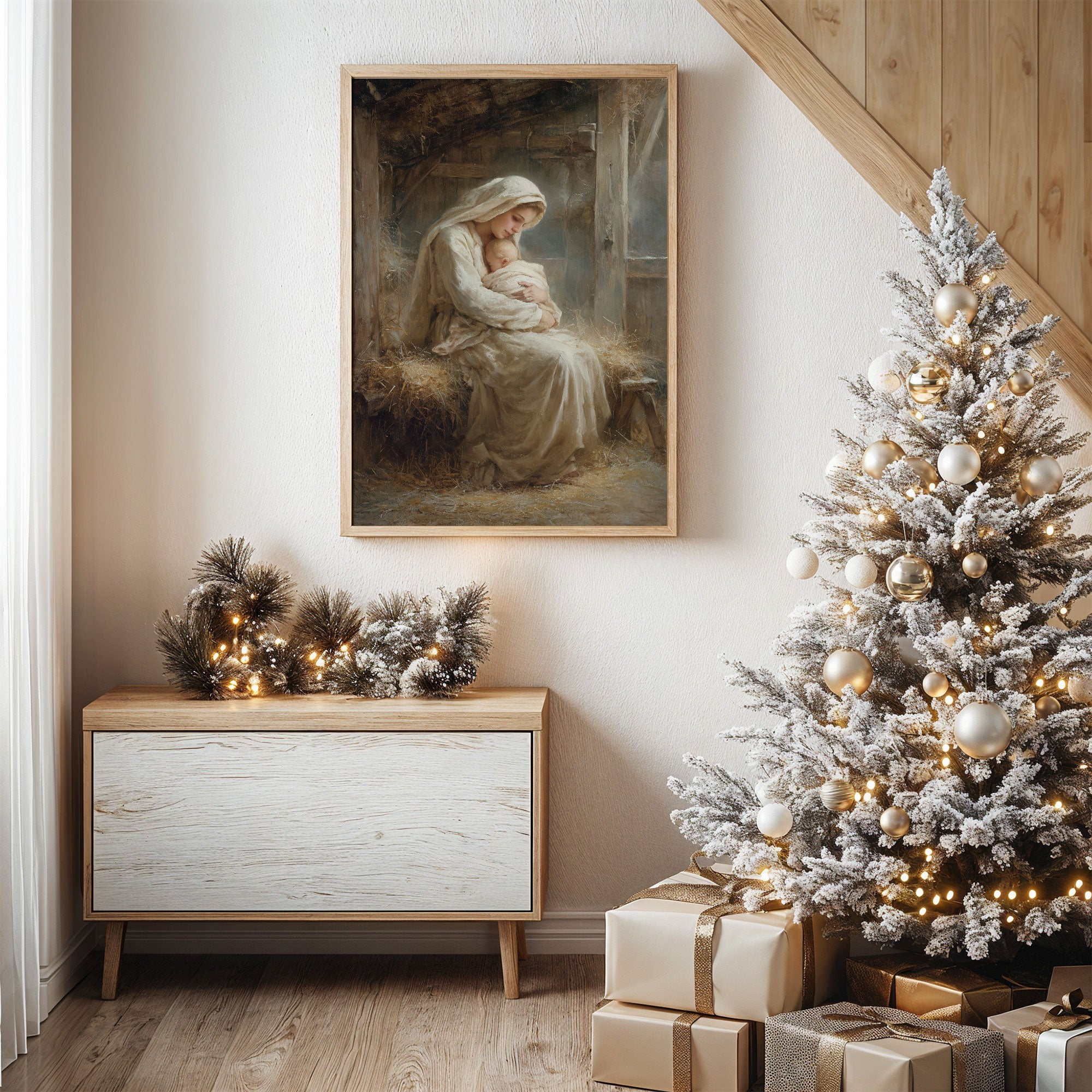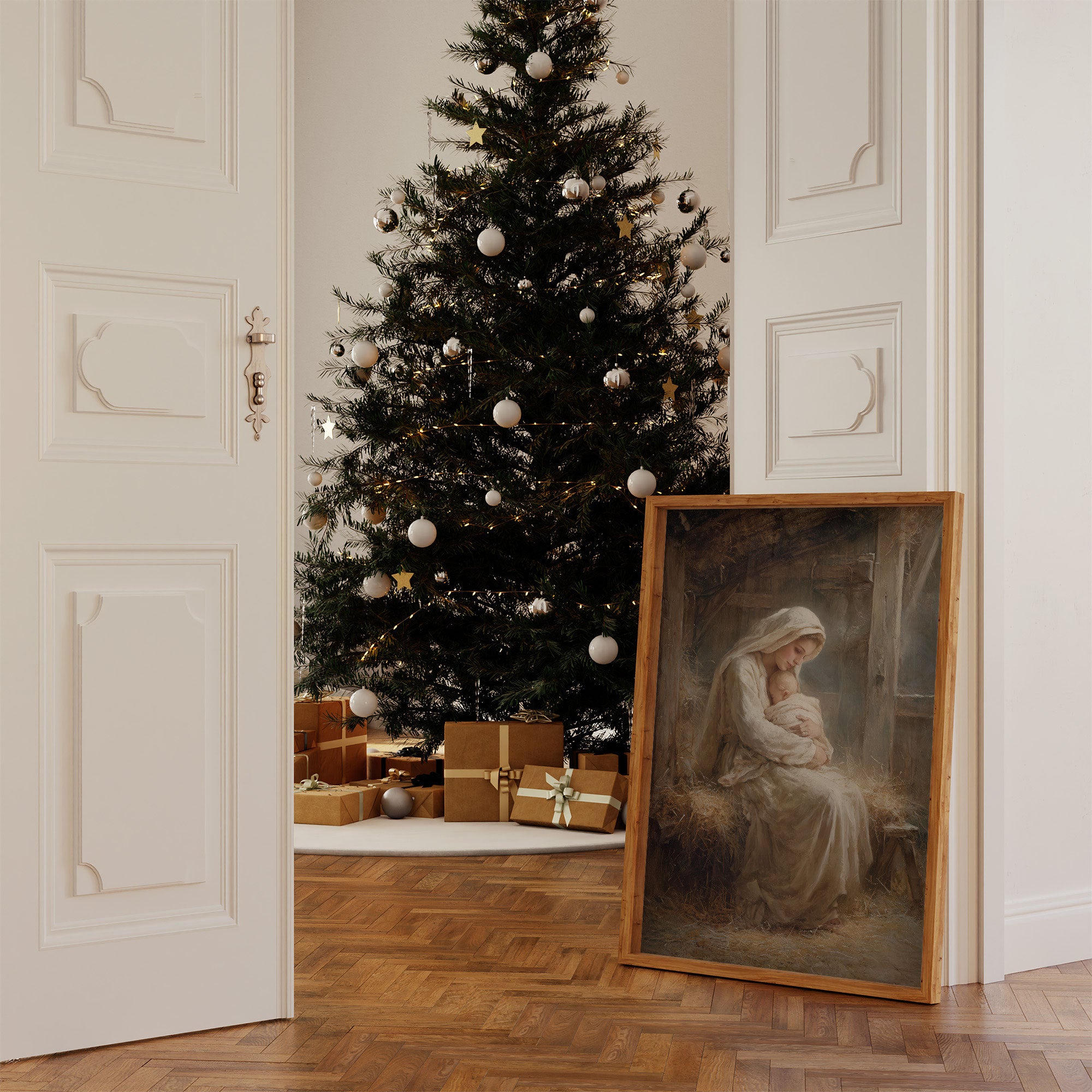 Gentle winter sunlight streams through sheer curtains, casting delicate shadows across a serene corner where past meets present. A classical painting in earthy tones hangs above a minimalist wooden bench, while a luminous white Christmas tree glows with warm light. The space speaks of thoughtful restraint and quiet celebration, where traditional artwork harmonizes with modern simplicity. This peaceful vignette creates an ideal meditation spot in a contemporary home, perfect for morning reflection or evening contemplation.