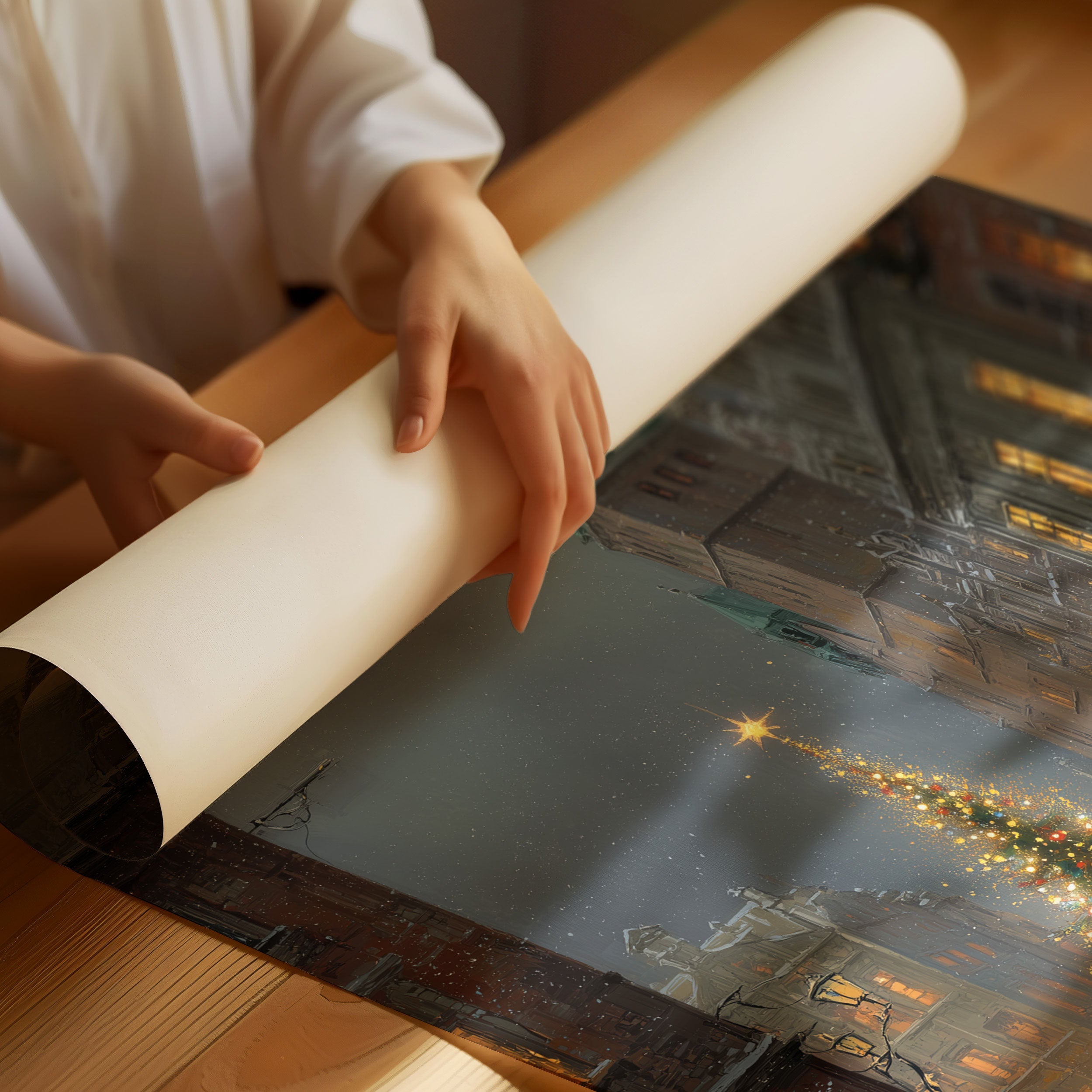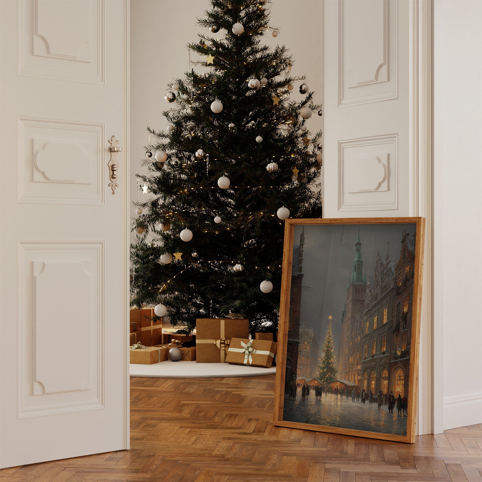 Snow falls softly on cobblestone streets as golden light spills from historic windows, creating warm havens against the winter twilight. The majestic church spire rises above the medieval square, its verdigris dome a silent sentinel over the festive Christmas market below. Glowing lanterns and a towering Christmas tree cast their gentle radiance across rain-slicked streets, while bundled figures move through the ethereal scene like brushstrokes in a living painting. This atmospheric piece brings old-world European charm into modern spaces, perfect for creating a cozy corner in living rooms or adding seasonal warmth to entryways during the holiday season.