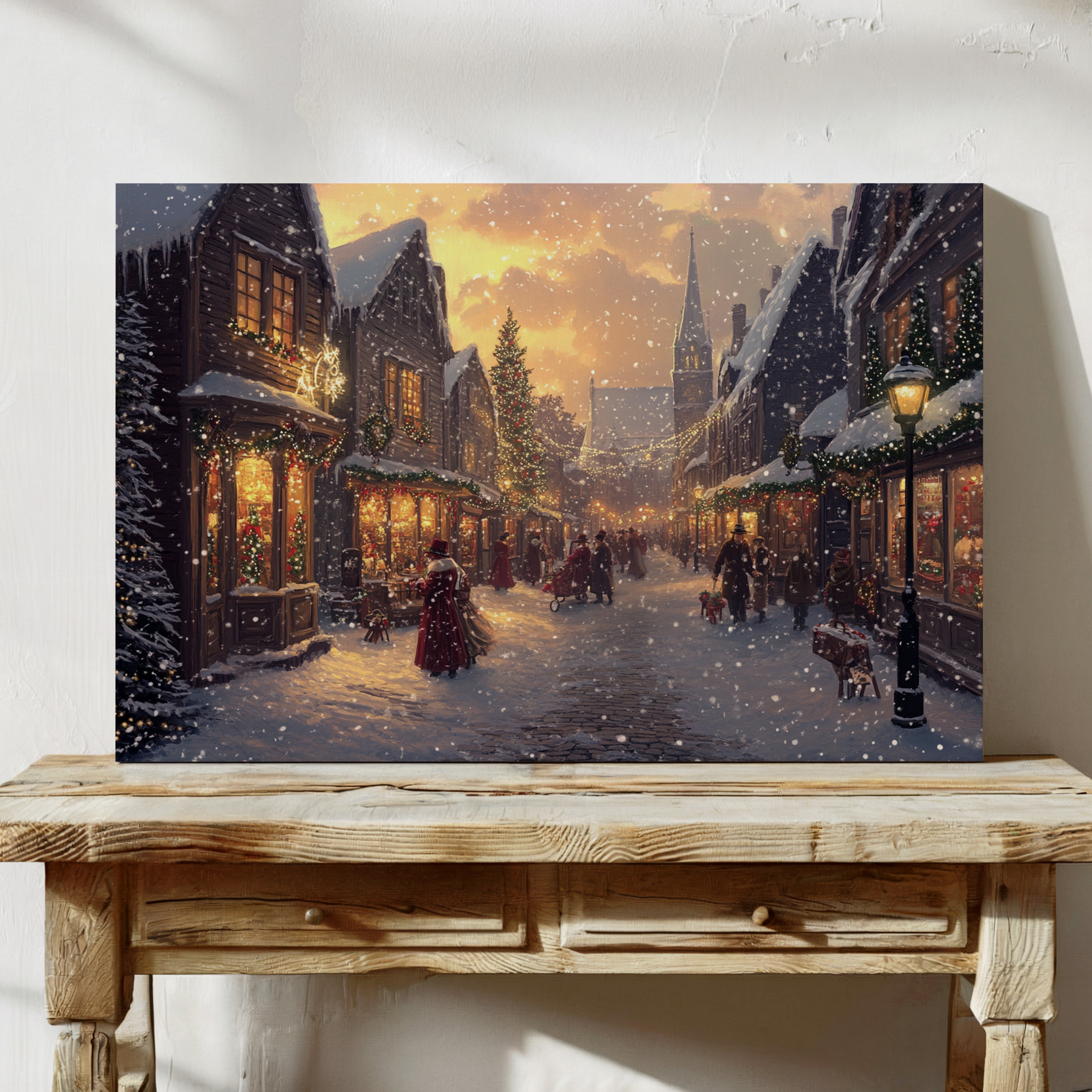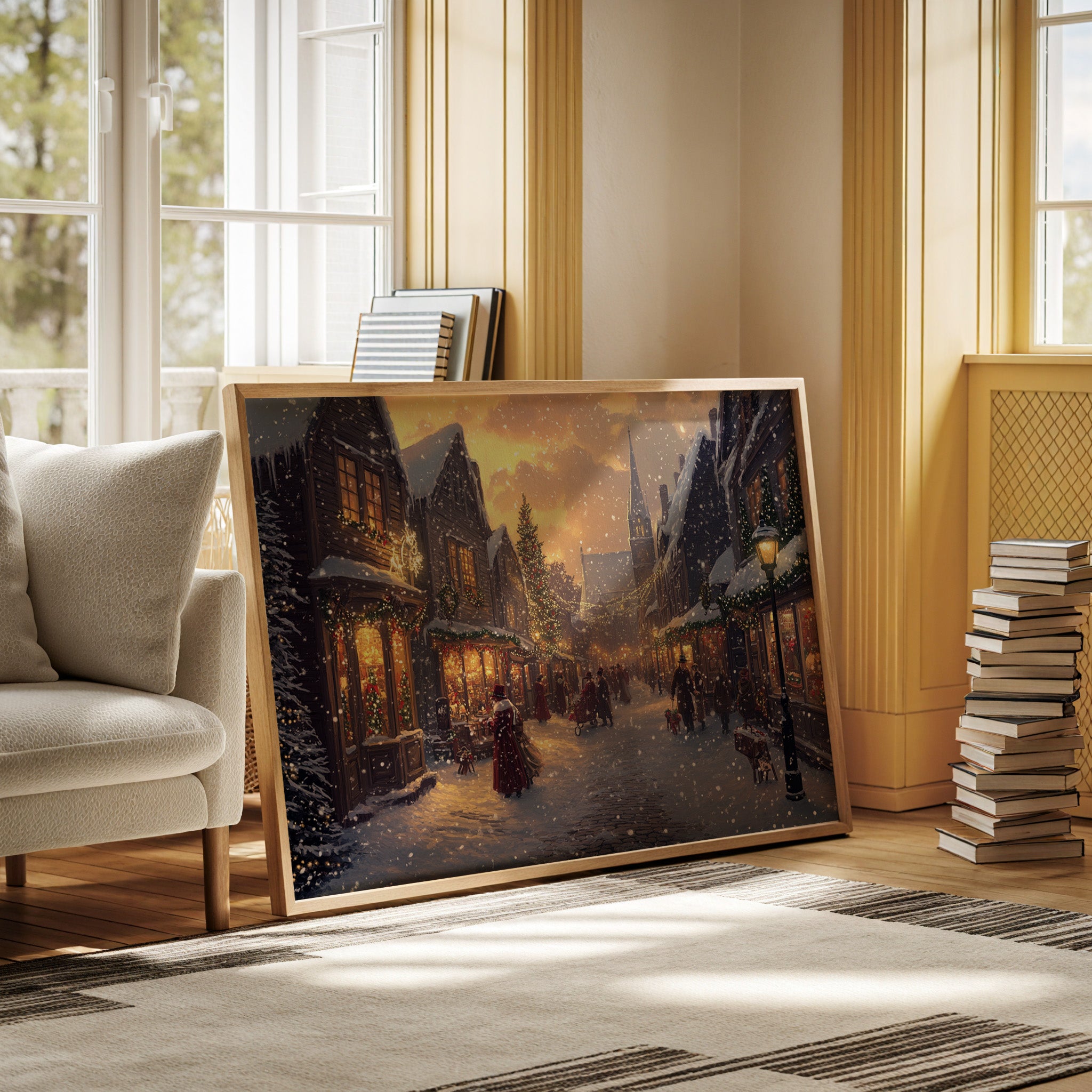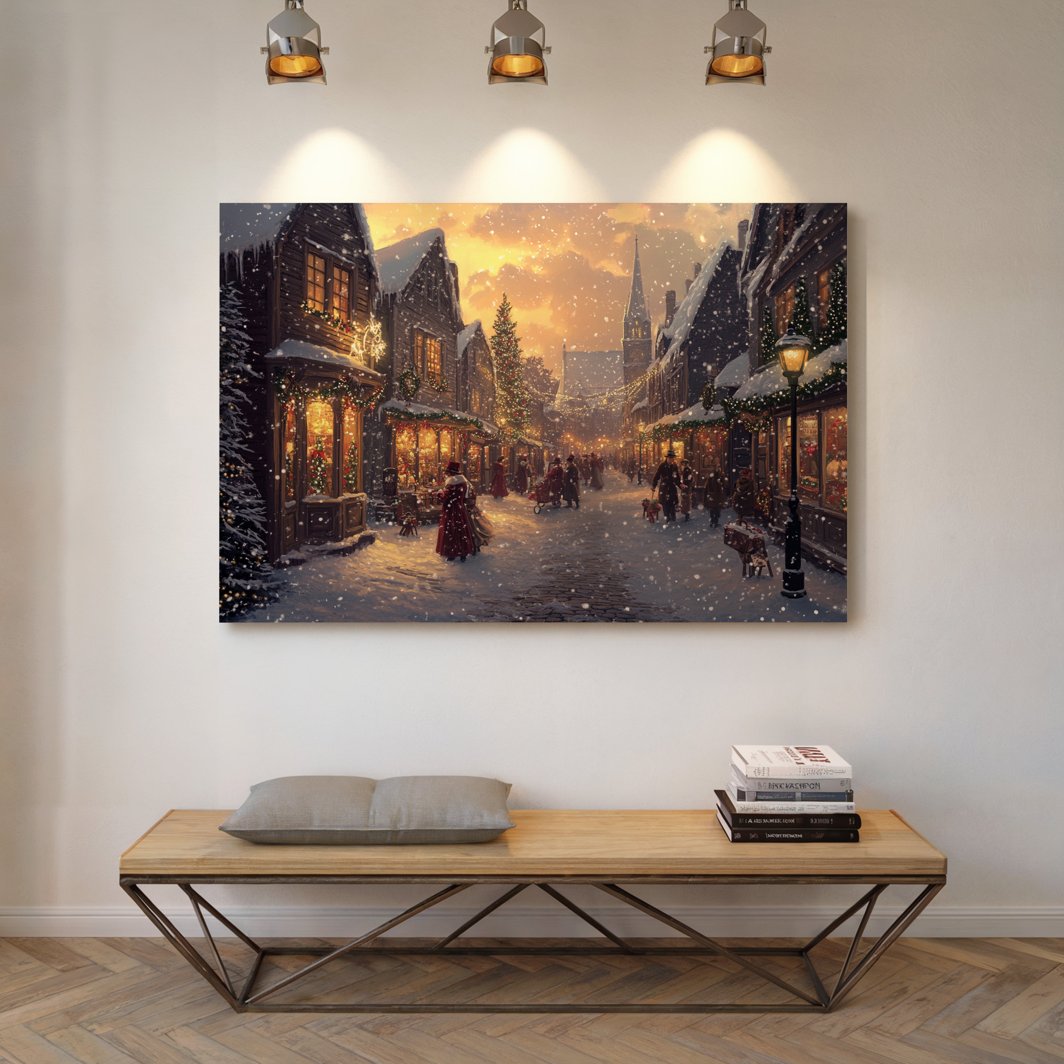 Gentle snowflakes drift through golden lamplight, casting a spell over the bustling Victorian thoroughfare. Shop windows glow with warmth, their festive displays drawing evening shoppers into pools of amber radiance. Garlands and twinkling lights trace the architecture of snow-laden buildings, while the distant church spire pierces a luminous sunset sky. This enchanted scene captures the timeless magic of winter festivities, where cobblestone streets echo with footsteps and laughter beneath strings of glowing lights. Perfect for creating a cozy focal point in living rooms or bringing seasonal charm to entryways and dining spaces.