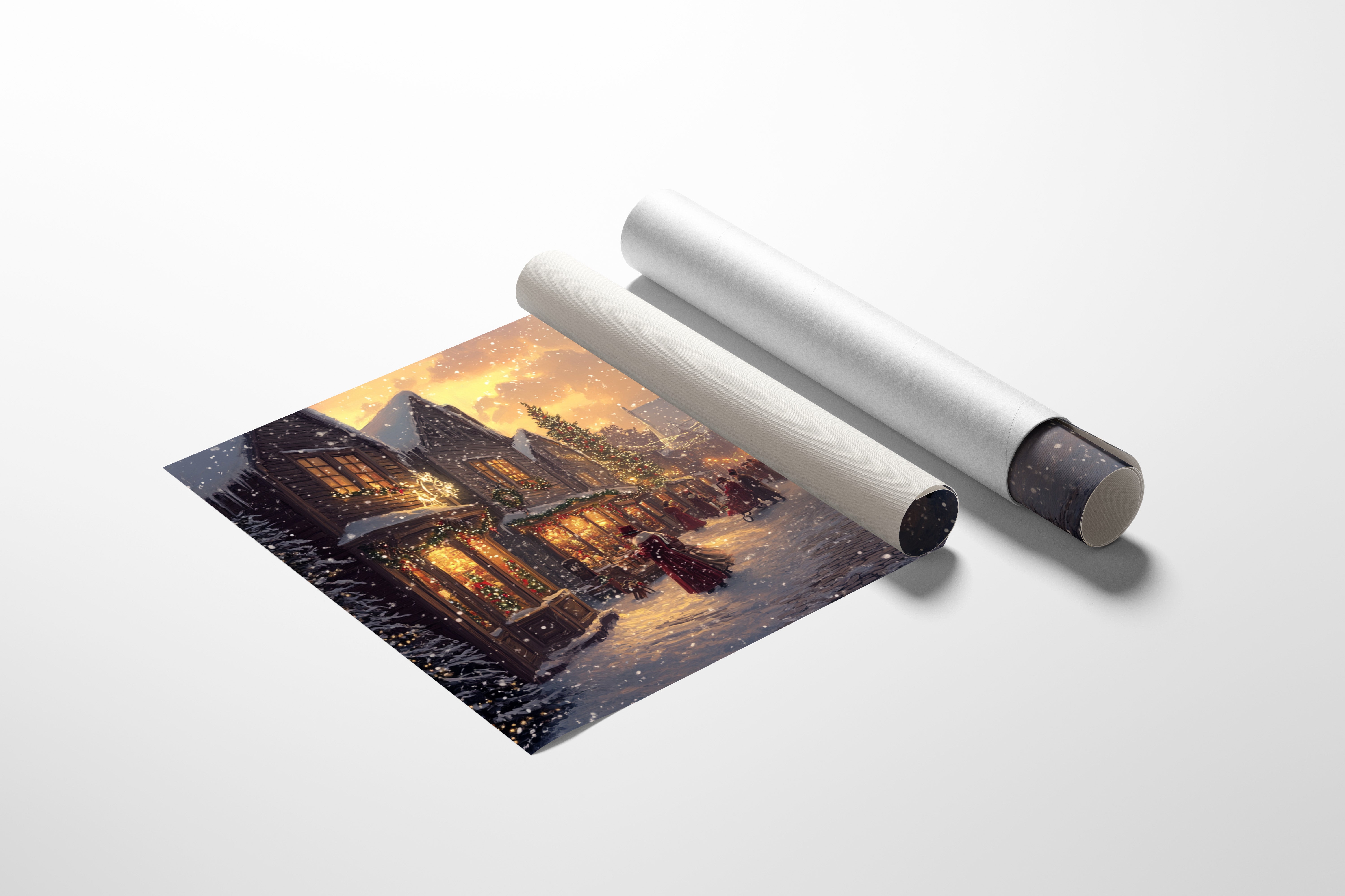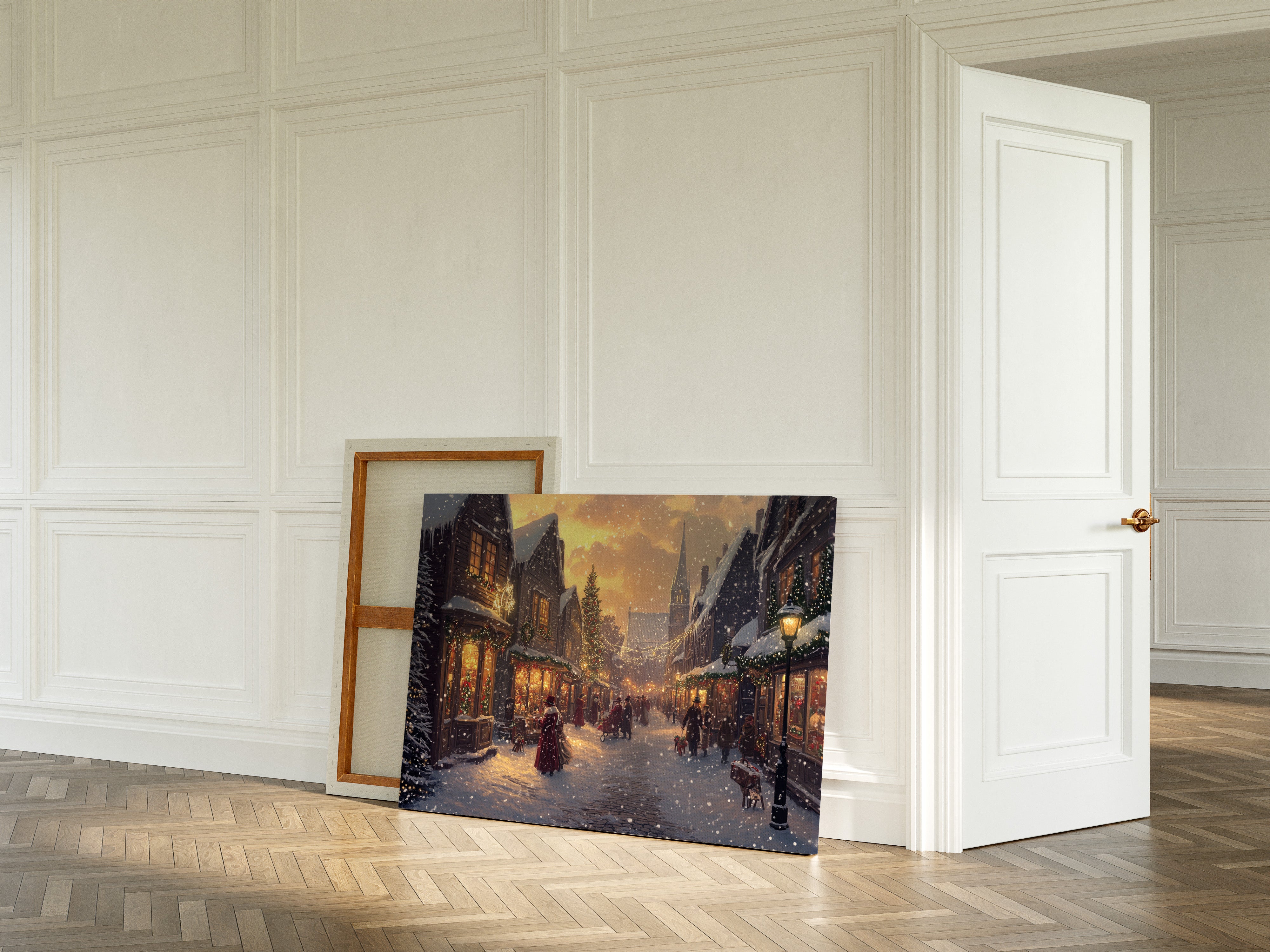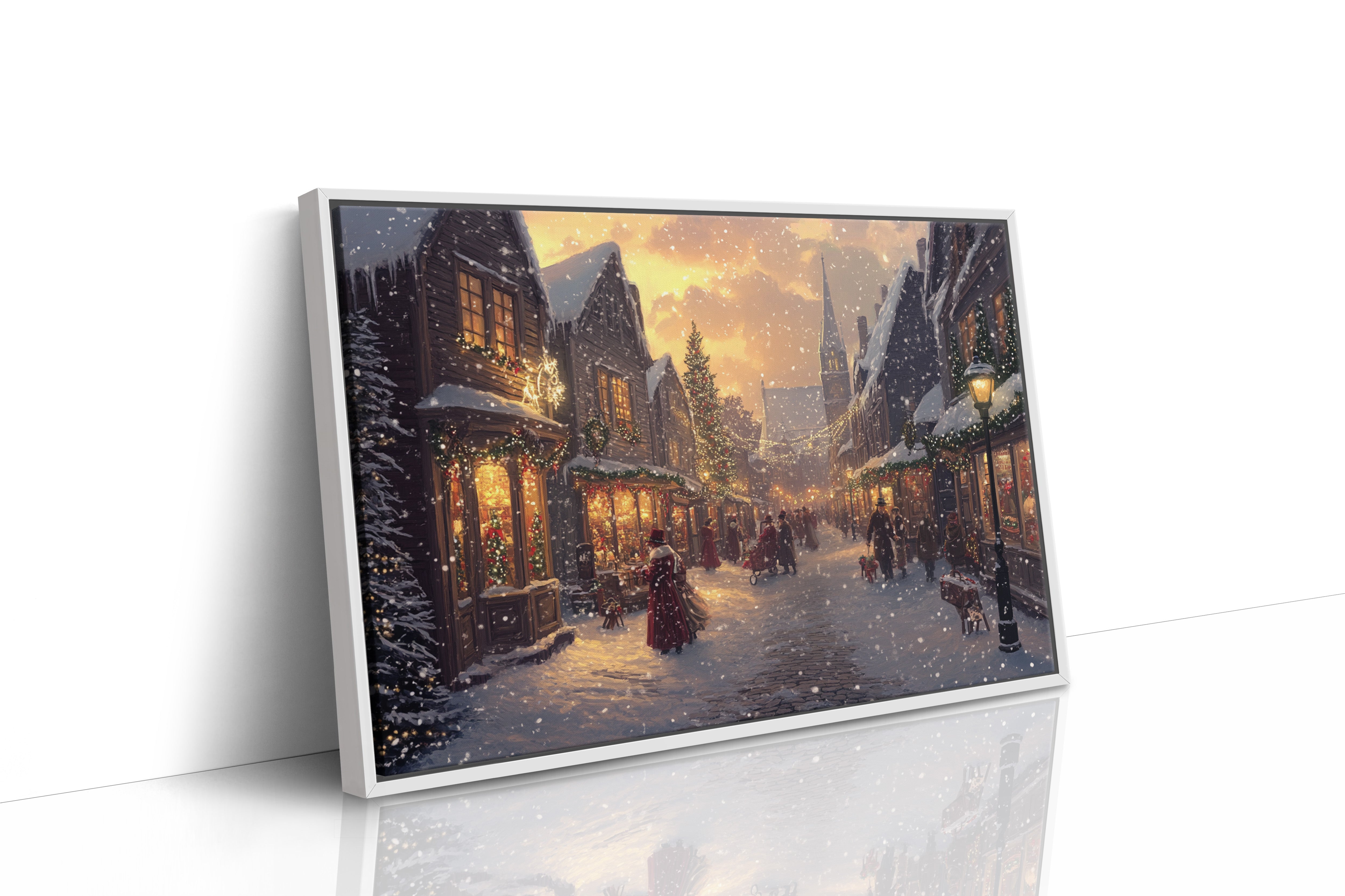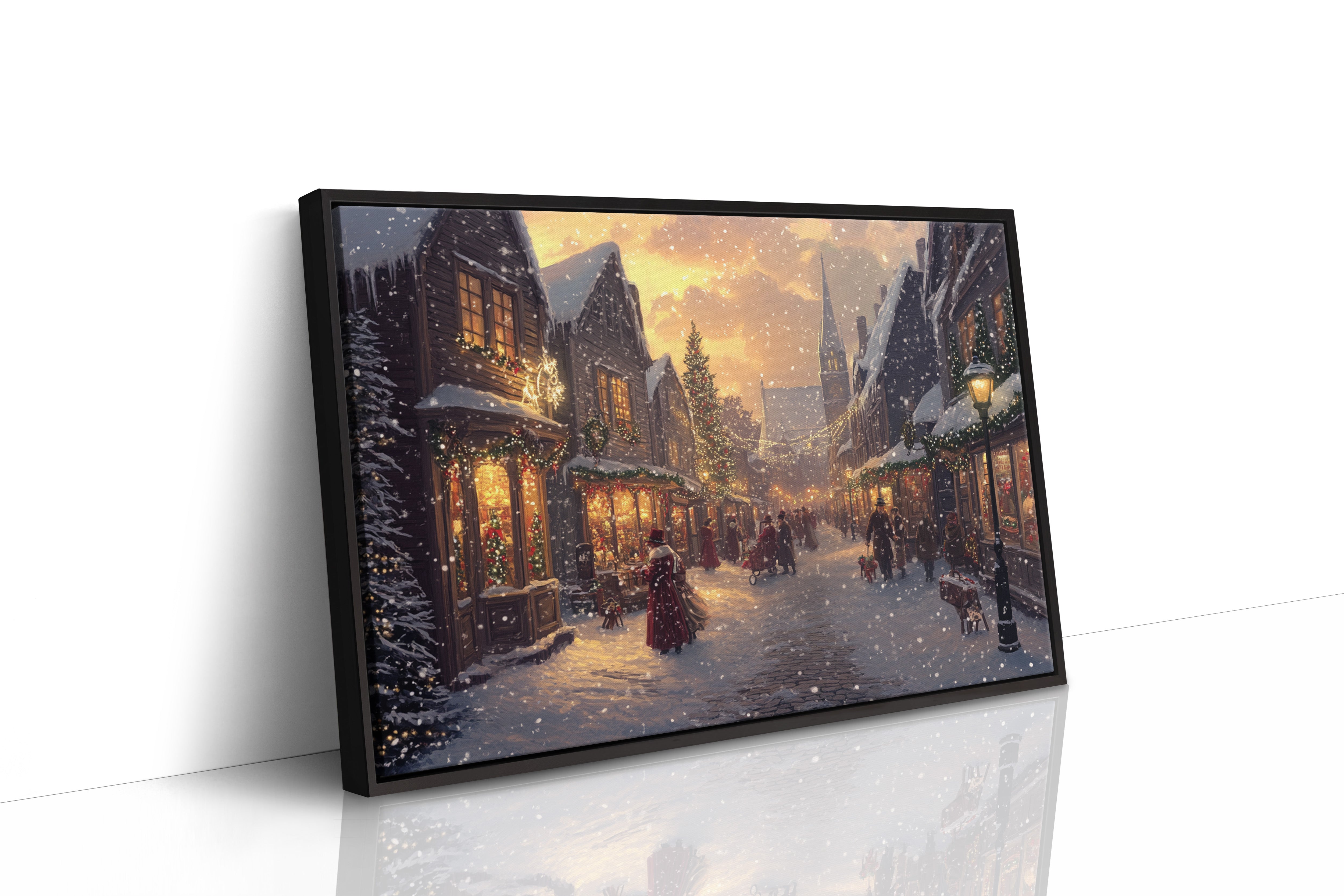 Gentle snowflakes drift through golden lamplight, casting a spell over the bustling Victorian thoroughfare. Shop windows glow with warmth, their festive displays drawing evening shoppers into pools of amber radiance. Garlands and twinkling lights trace the architecture of snow-laden buildings, while the distant church spire pierces a luminous sunset sky. This enchanted scene captures the timeless magic of winter festivities, where cobblestone streets echo with footsteps and laughter beneath strings of glowing lights. Perfect for creating a cozy focal point in living rooms or bringing seasonal charm to entryways and dining spaces.