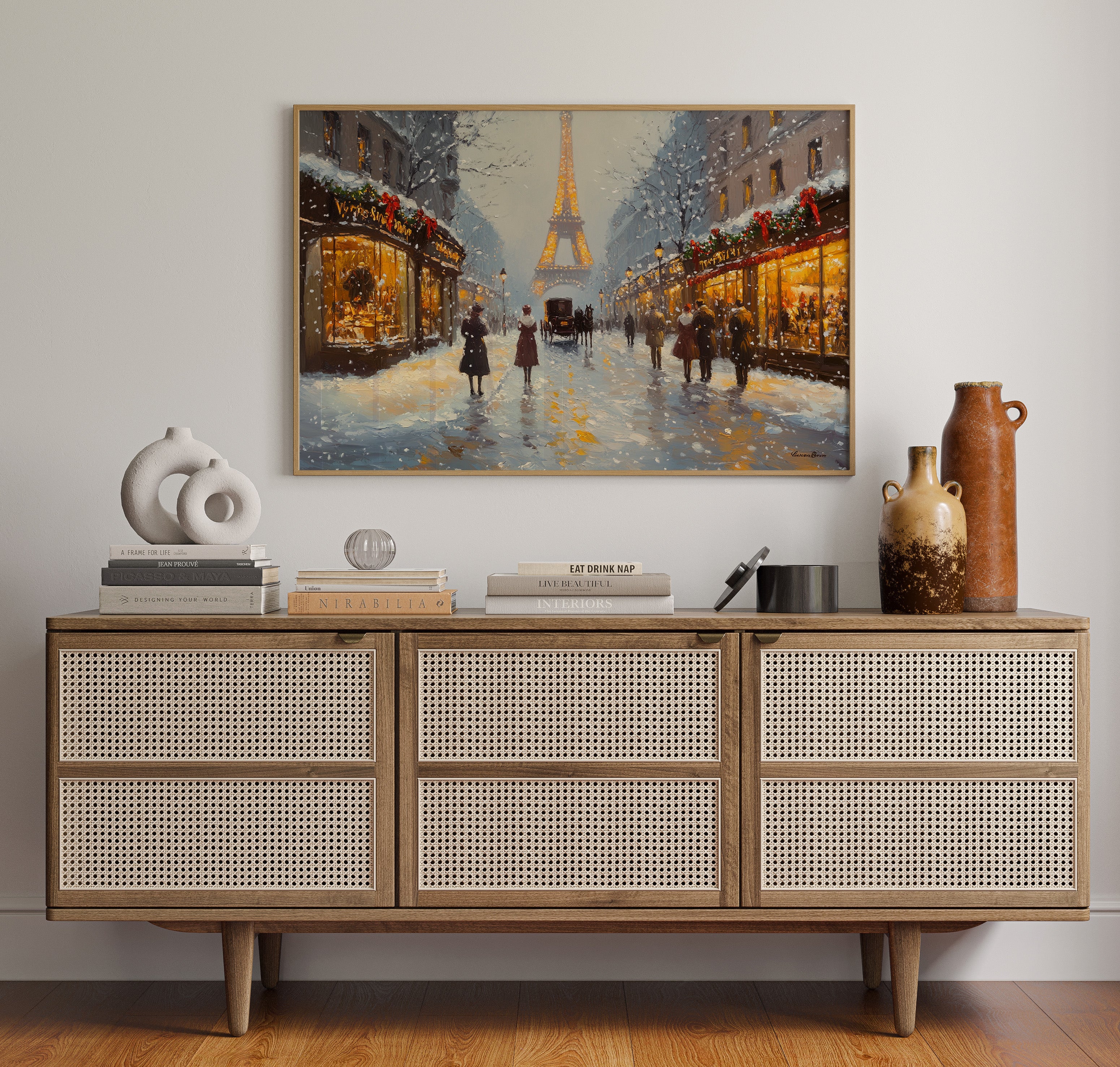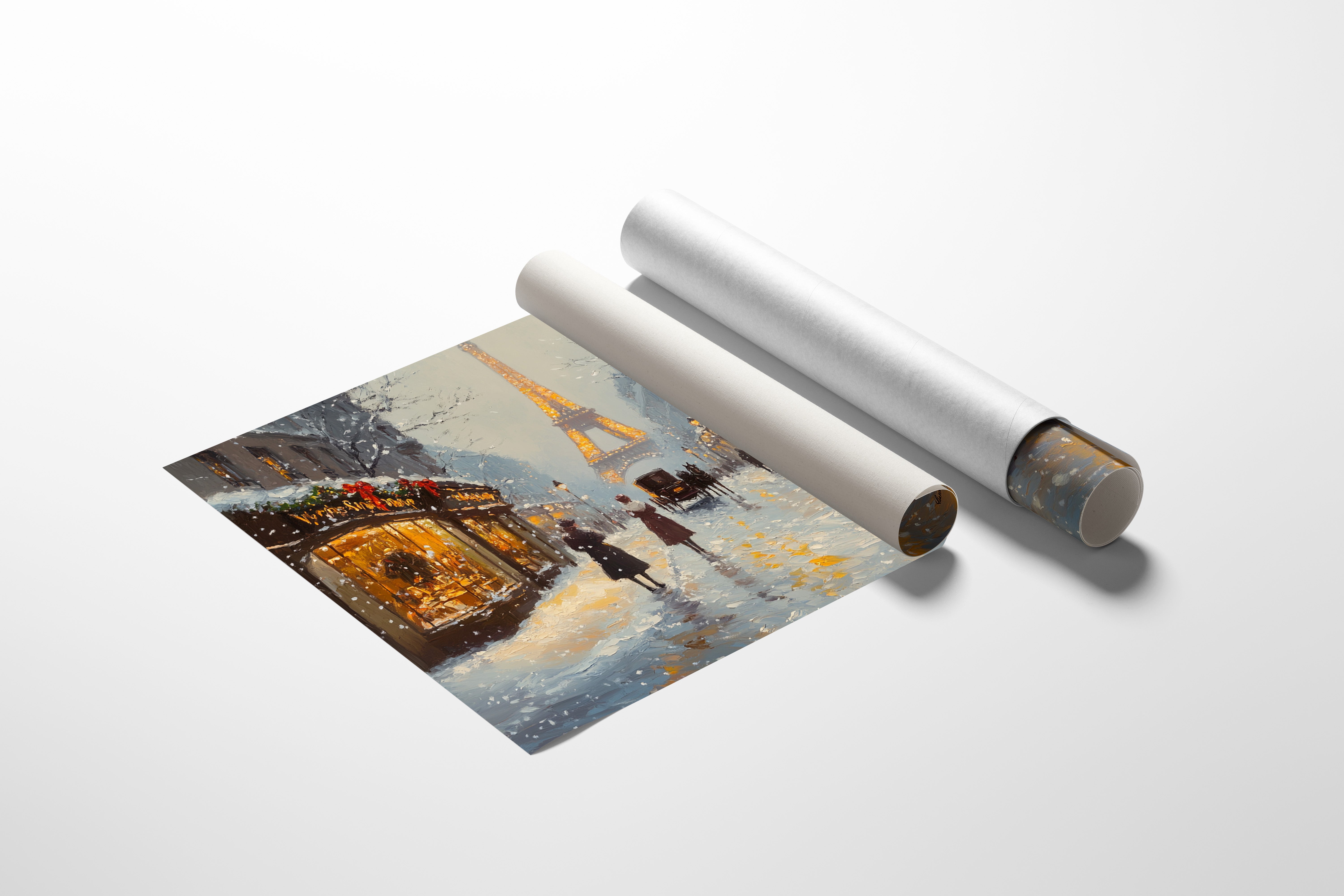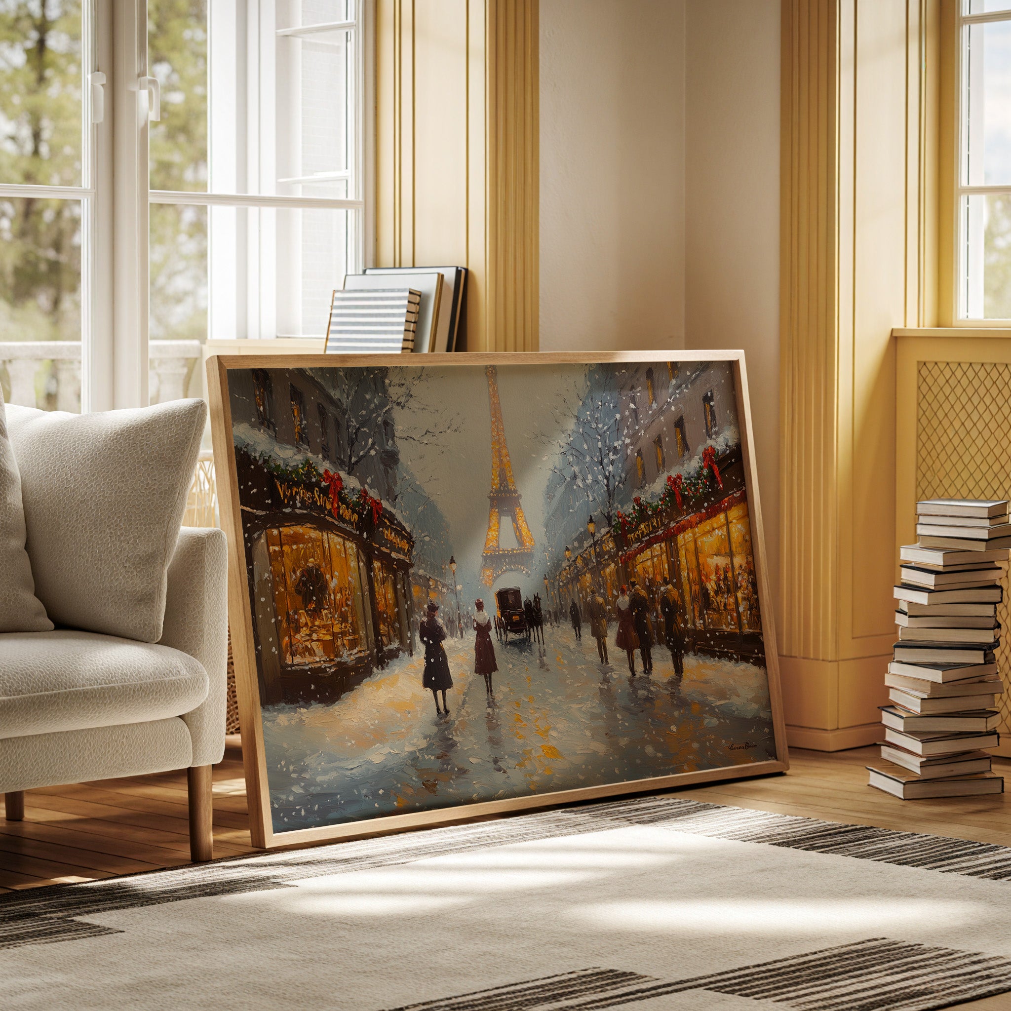 Soft snowflakes dance through the golden glow of storefront windows, creating a magical evening atmosphere in historic Paris. The iconic Eiffel Tower stands illuminated against the winter sky, while elegantly dressed figures stroll past shops adorned with festive holiday decorations and red ribbons. Horse-drawn carriages and warm lamplight cast long shadows across the snow-dusted boulevard, painting a scene that captures the romance and nostalgia of a bygone era.