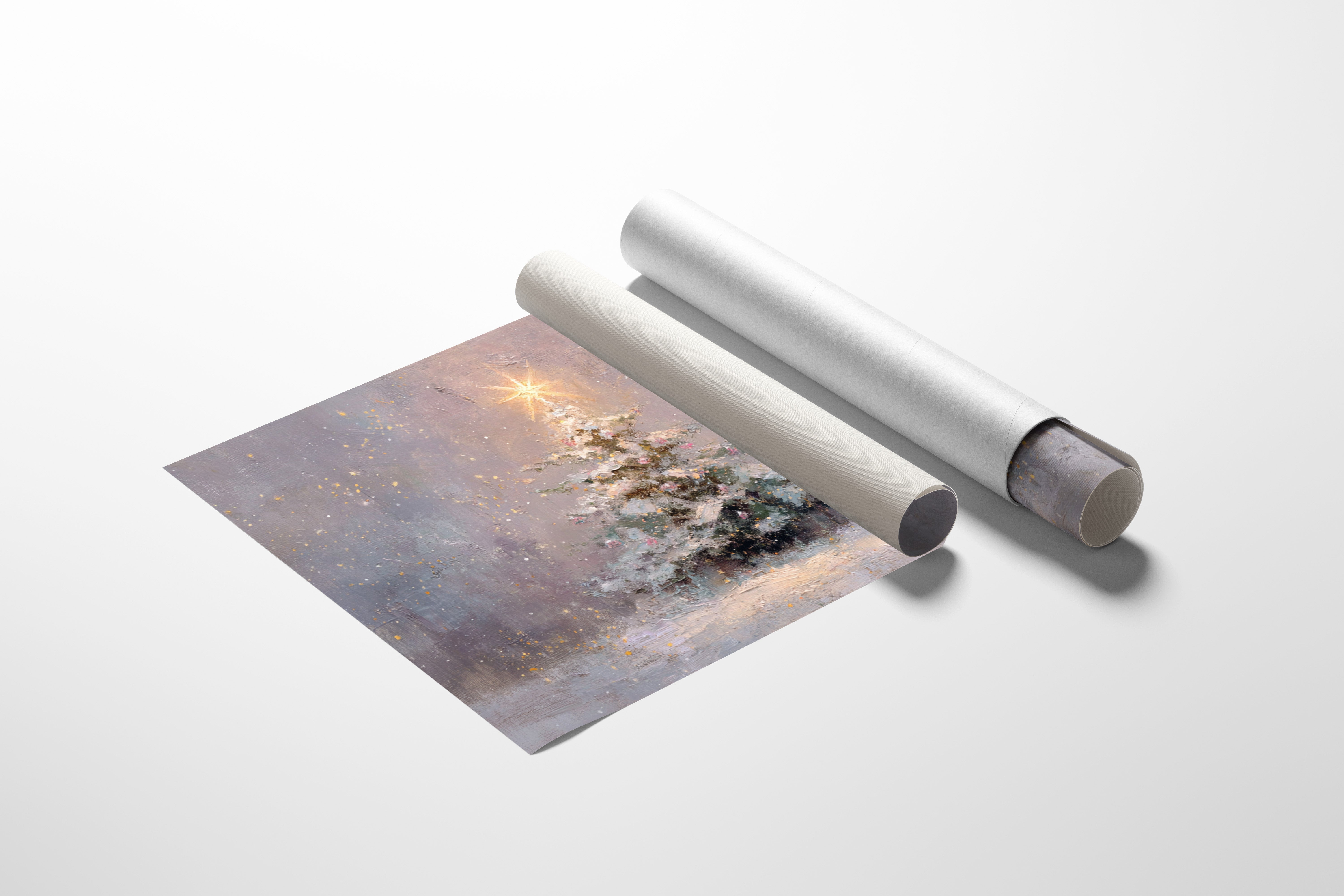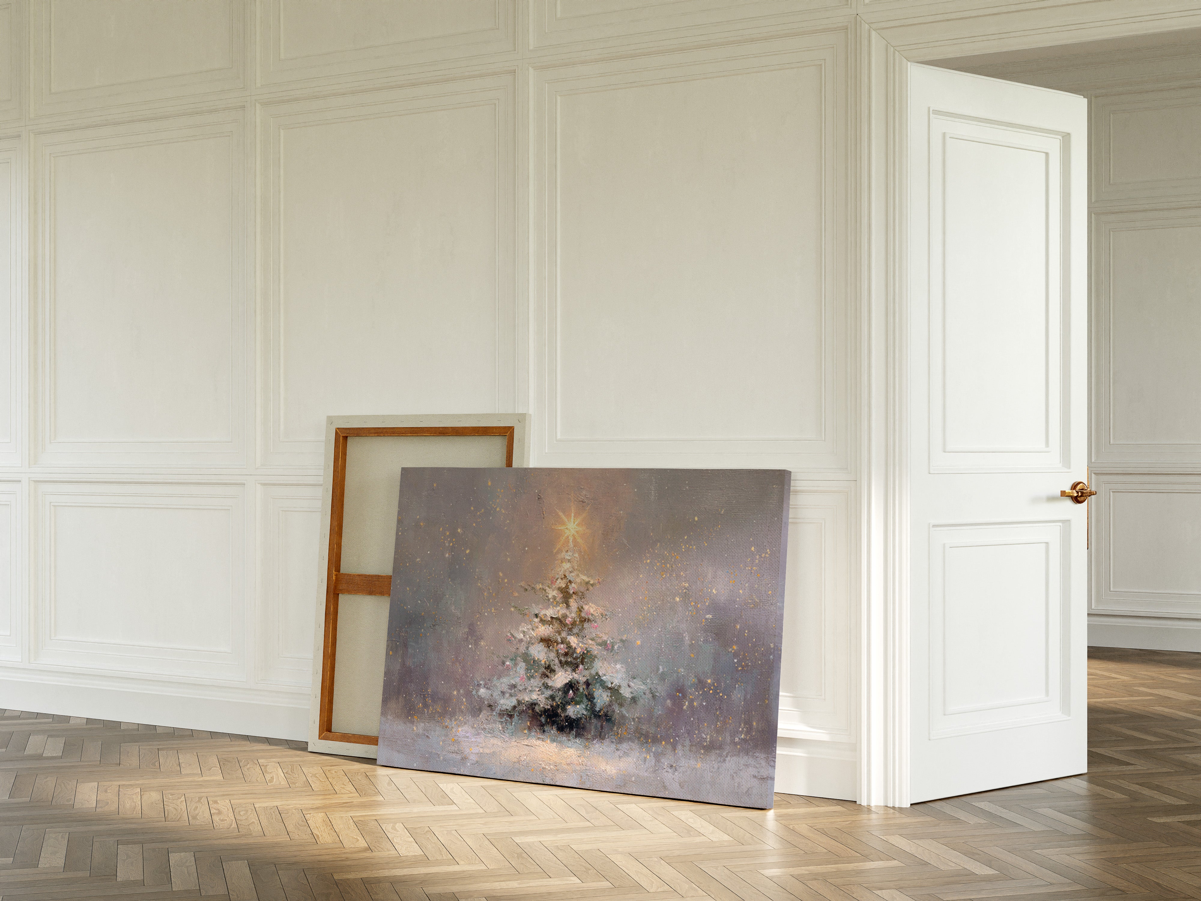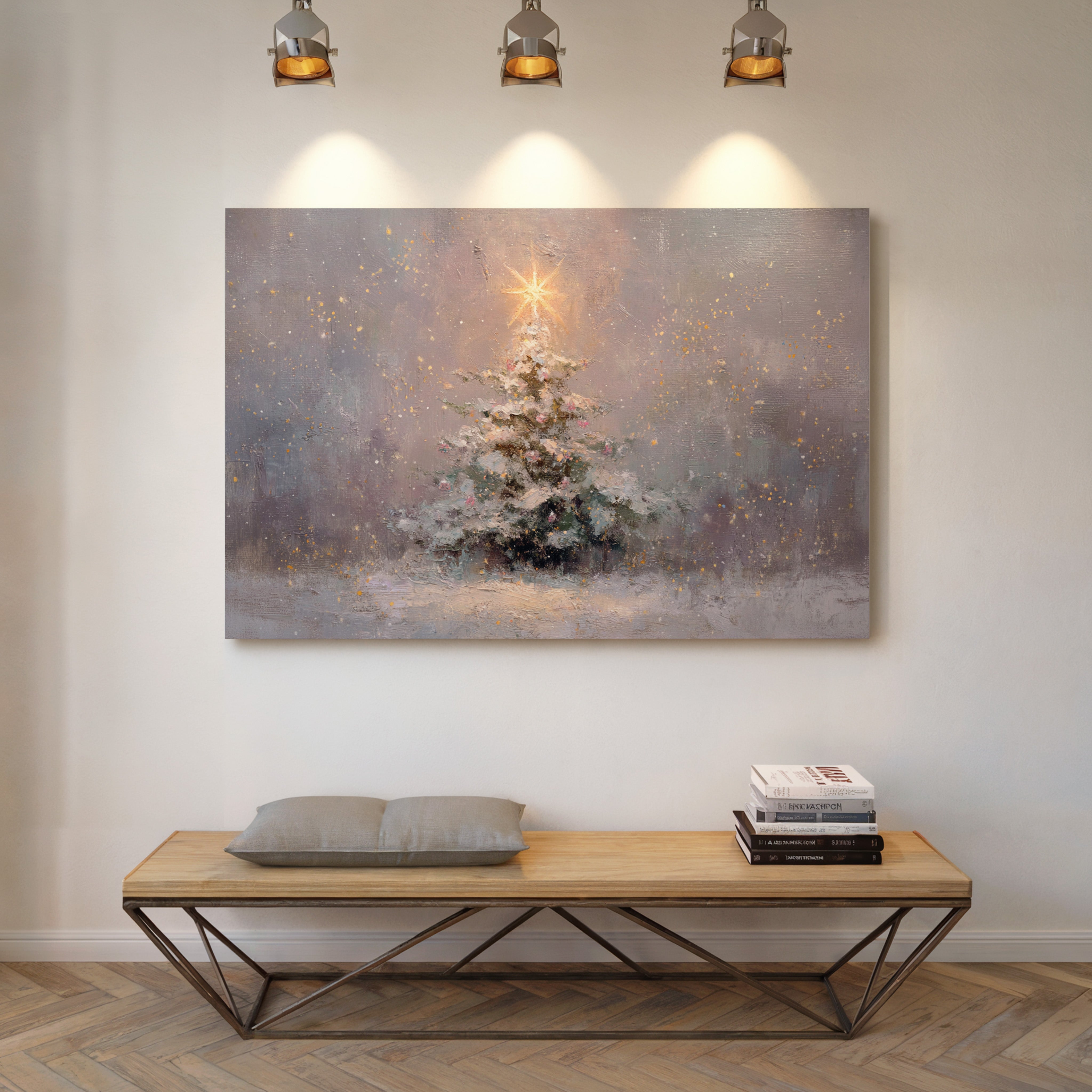 A gentle snowfall dances around a luminous Christmas tree, its star piercing through the winter twilight with golden warmth. Textured brushstrokes create a dreamy atmosphere where soft greys blend with touches of pink and golden sparkles, capturing the ethereal quality of a snow-kissed evening. The tree stands proud against a misty background, its form suggested through impressionistic strokes that blend deep evergreen with frosty white highlights. Perfect for creating a cozy seasonal ambiance in living rooms or bedrooms, this piece brings the enchanting spirit of winter holidays into any space.