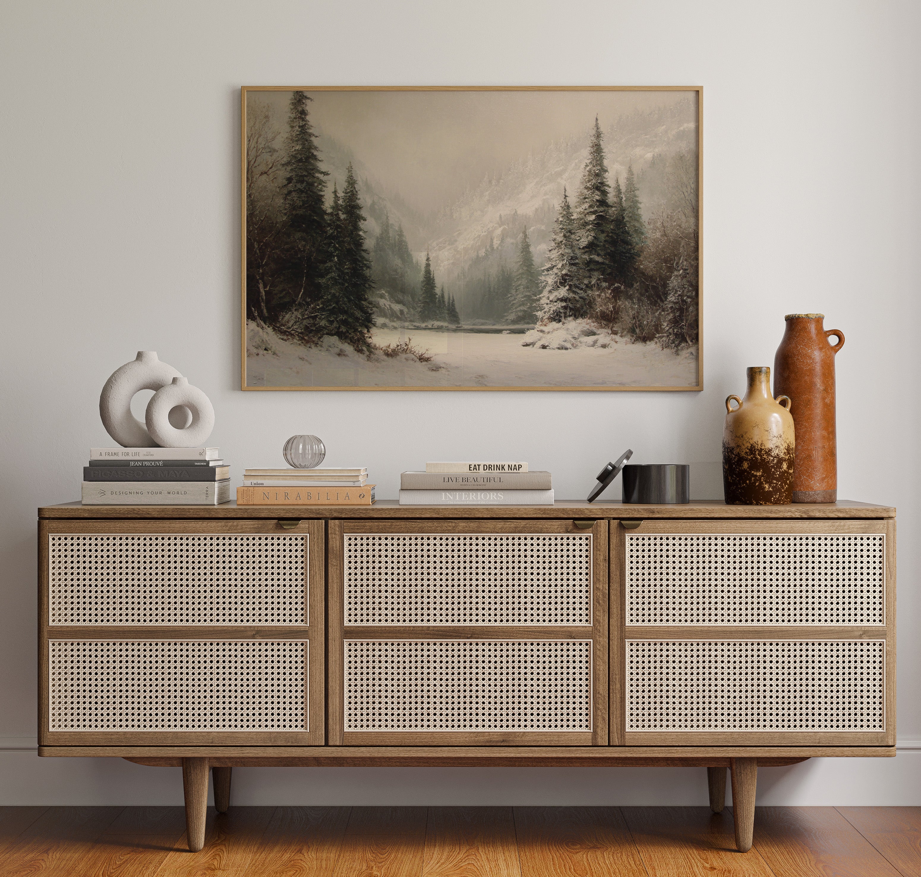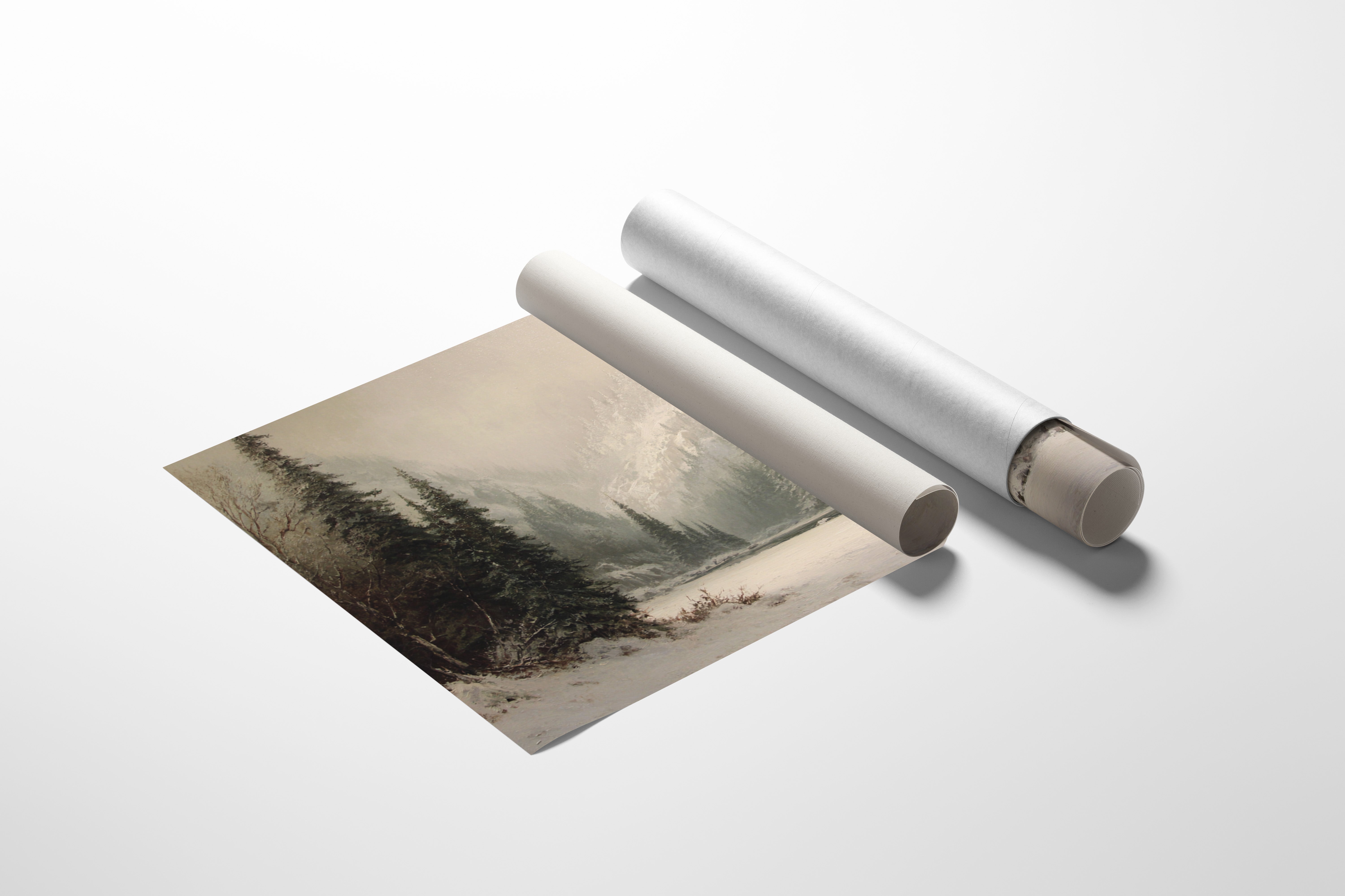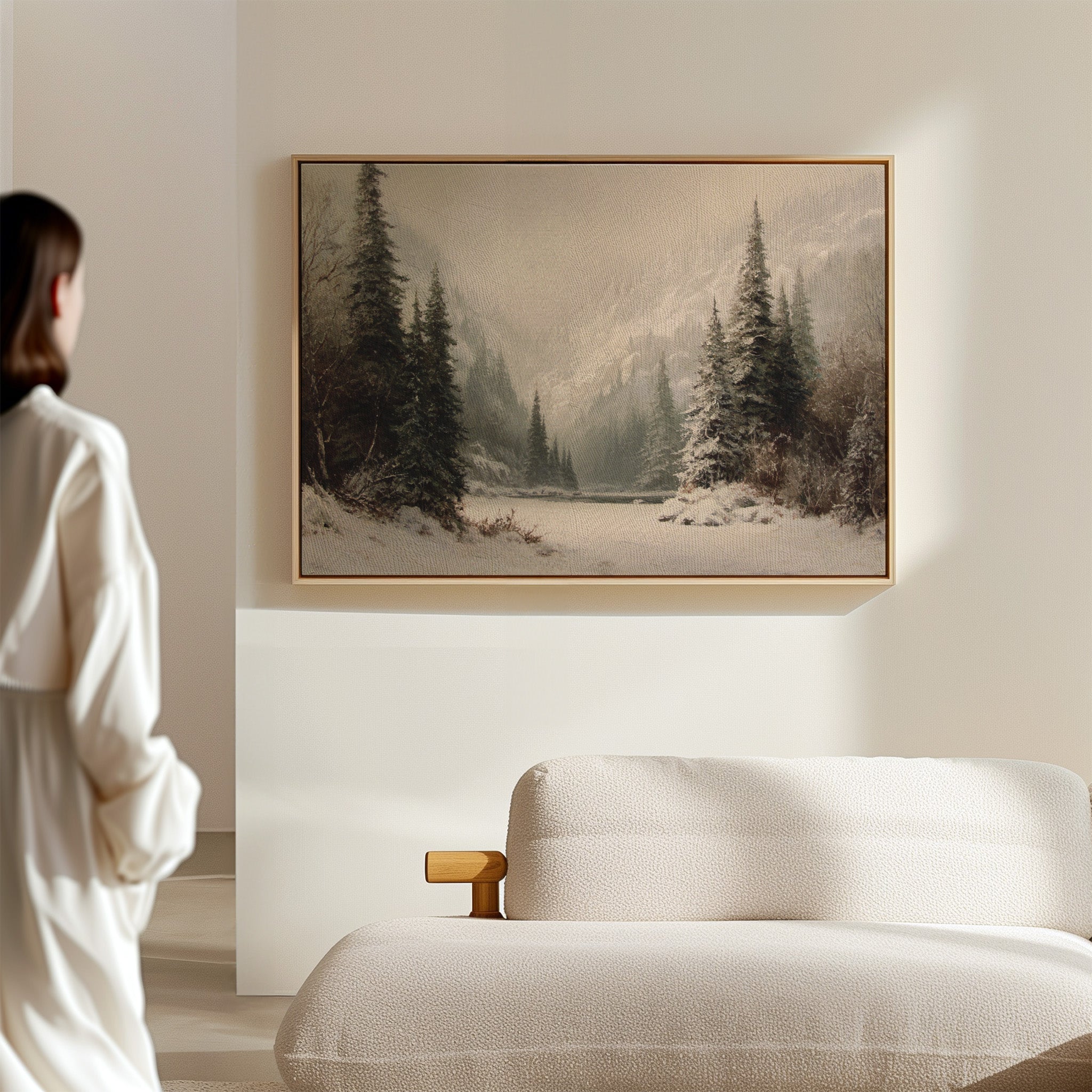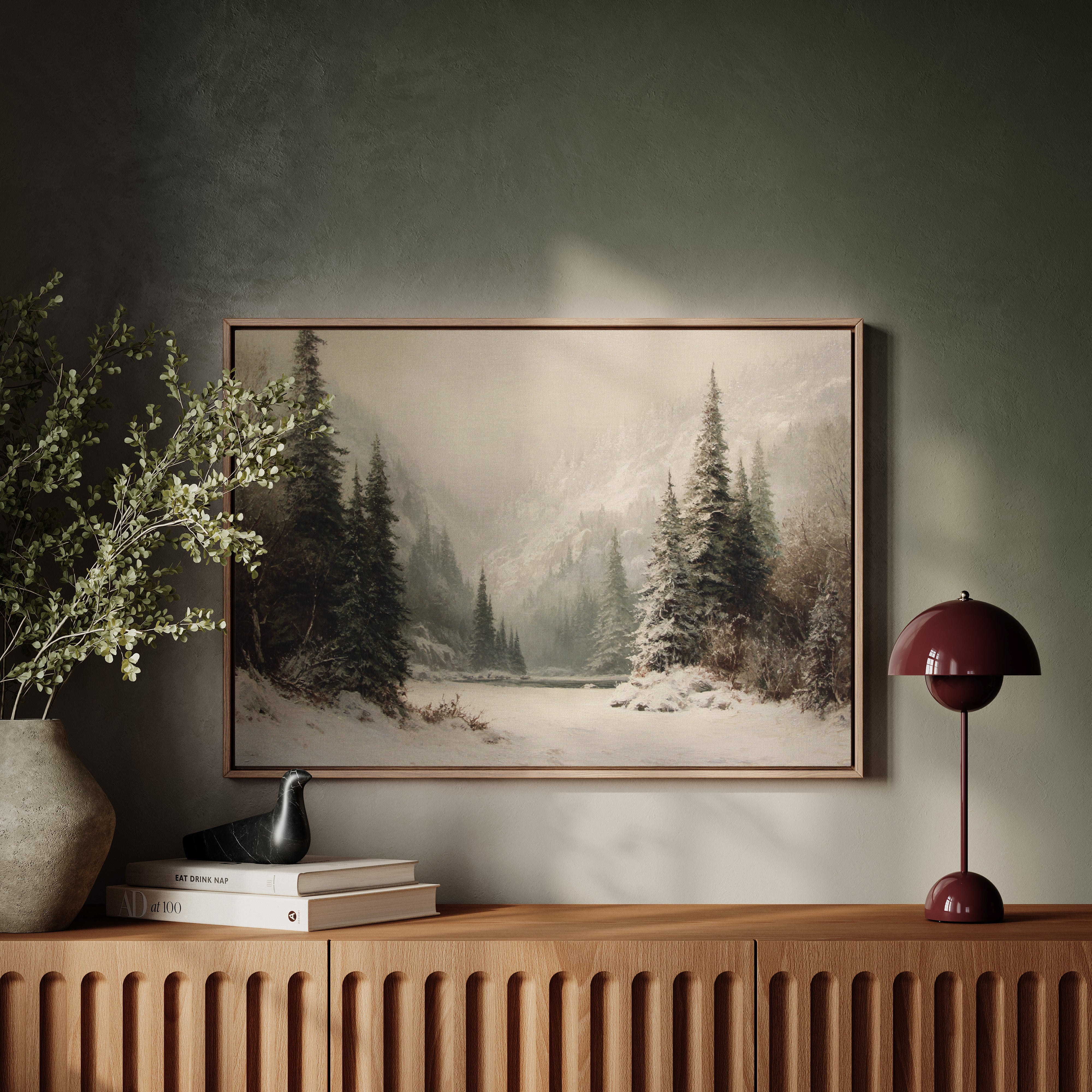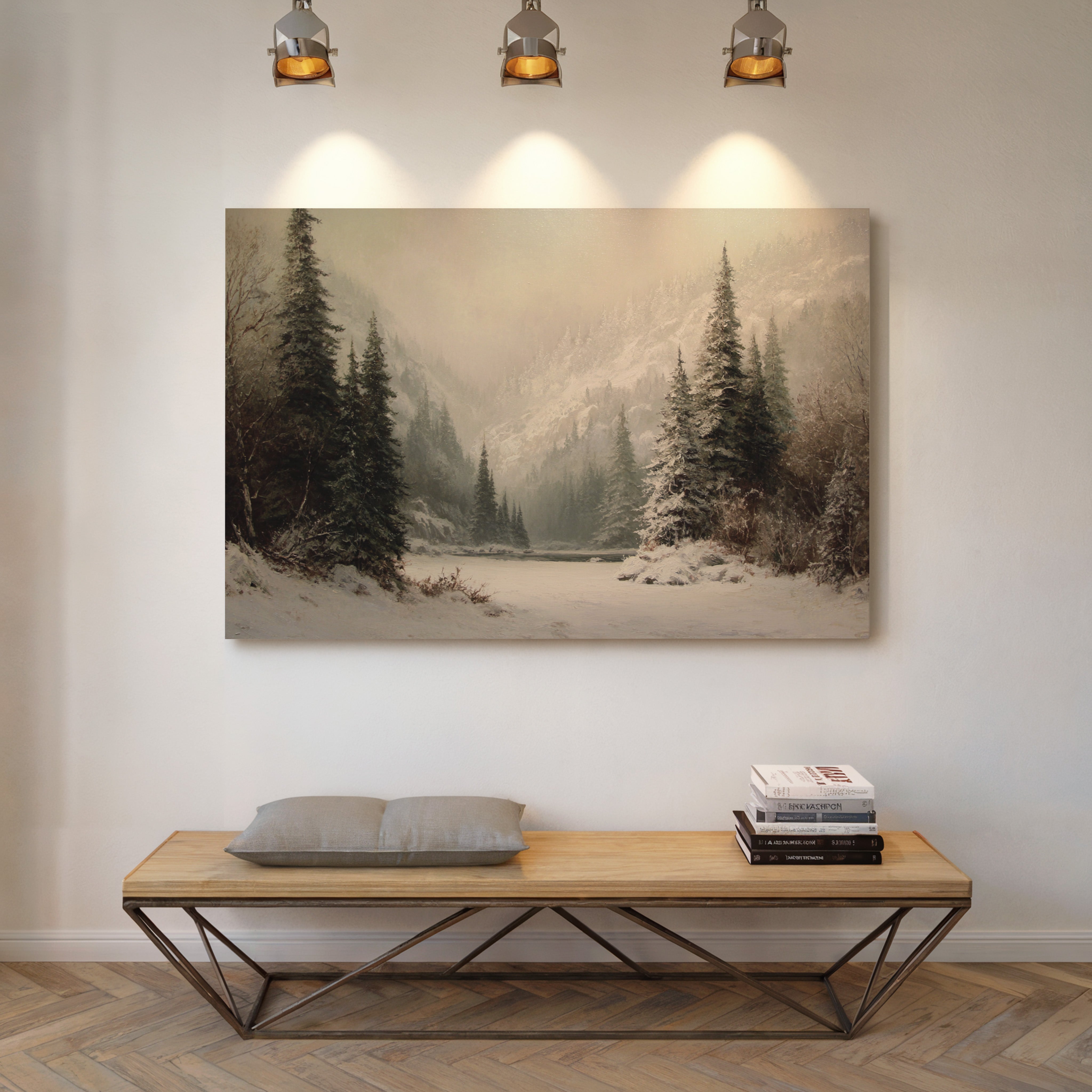 Silence settles like fresh powder across a secluded mountain lake, where evergreens stand sentinel in the crystalline air. Layers of mist weave between snow-laden pines, creating an ethereal dialogue between water and wilderness. The composition unfolds in subtle tones of ivory and sage, while distant peaks dissolve into a gentle haze that softens their rugged contours. This tranquil winter scene would bring serene sophistication to a mountain lodge great room or add natural grandeur to a formal living space seeking connection with untamed landscapes.