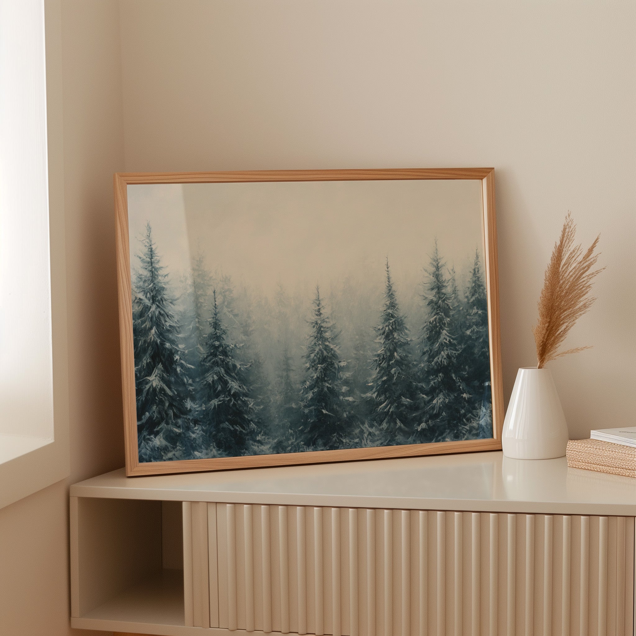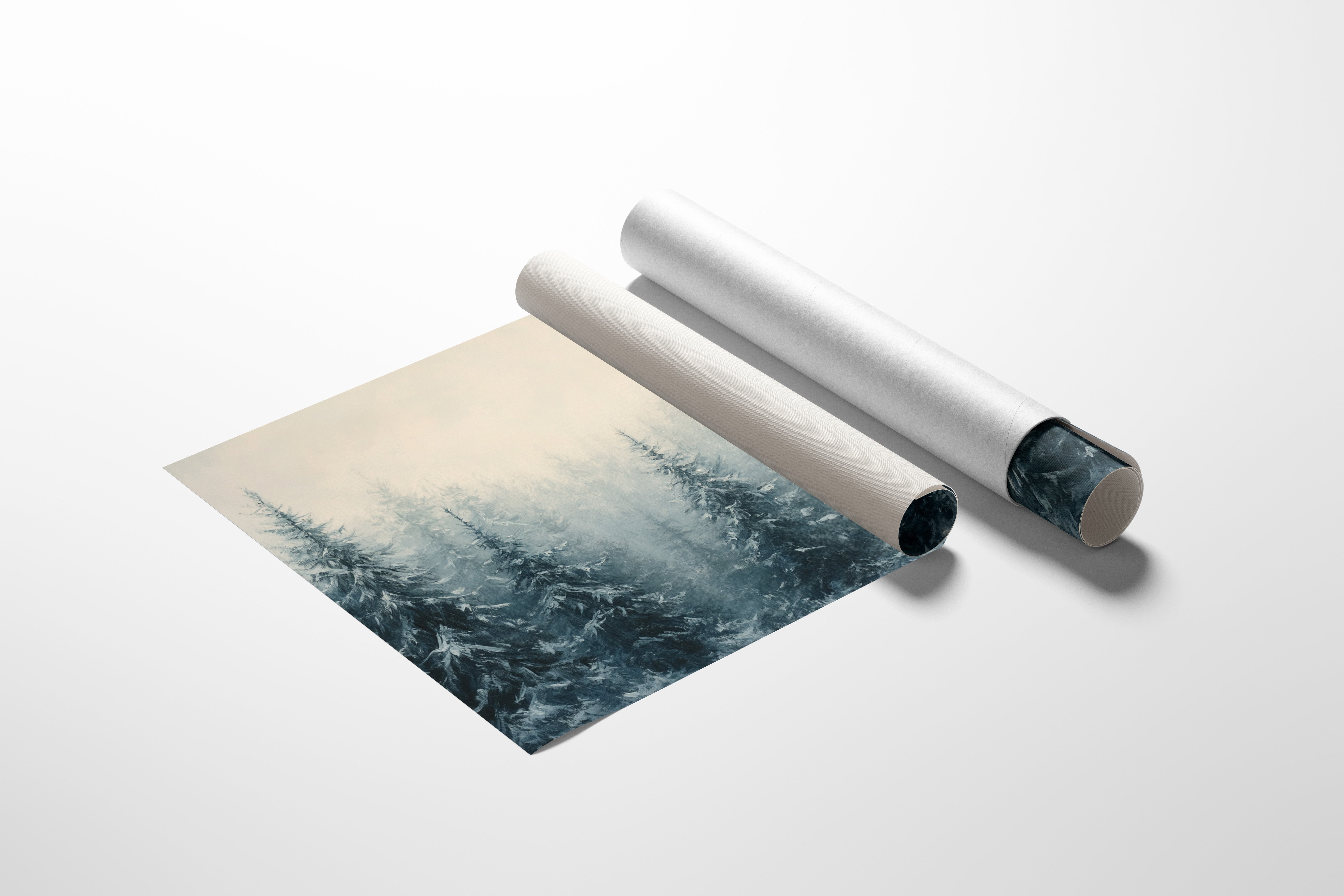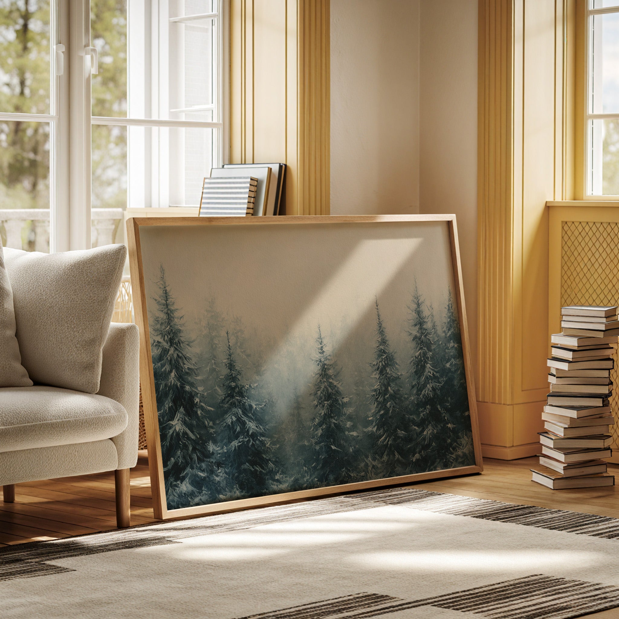 Frost-kissed evergreens stand sentinel in the ethereal morning mist, their branches heavy with winter's gentle touch. The forest scene captures that liminal moment when dawn's first light filters through the fog, creating layers of deep teals and soft grays that fade into the distance. Each pine needle is delicately rendered, creating a tapestry of texture that speaks to nature's intricate artistry. This peaceful winter landscape brings a sense of tranquility and contemplative stillness to any space, perfect for creating a serene atmosphere in a bedroom or meditation room.