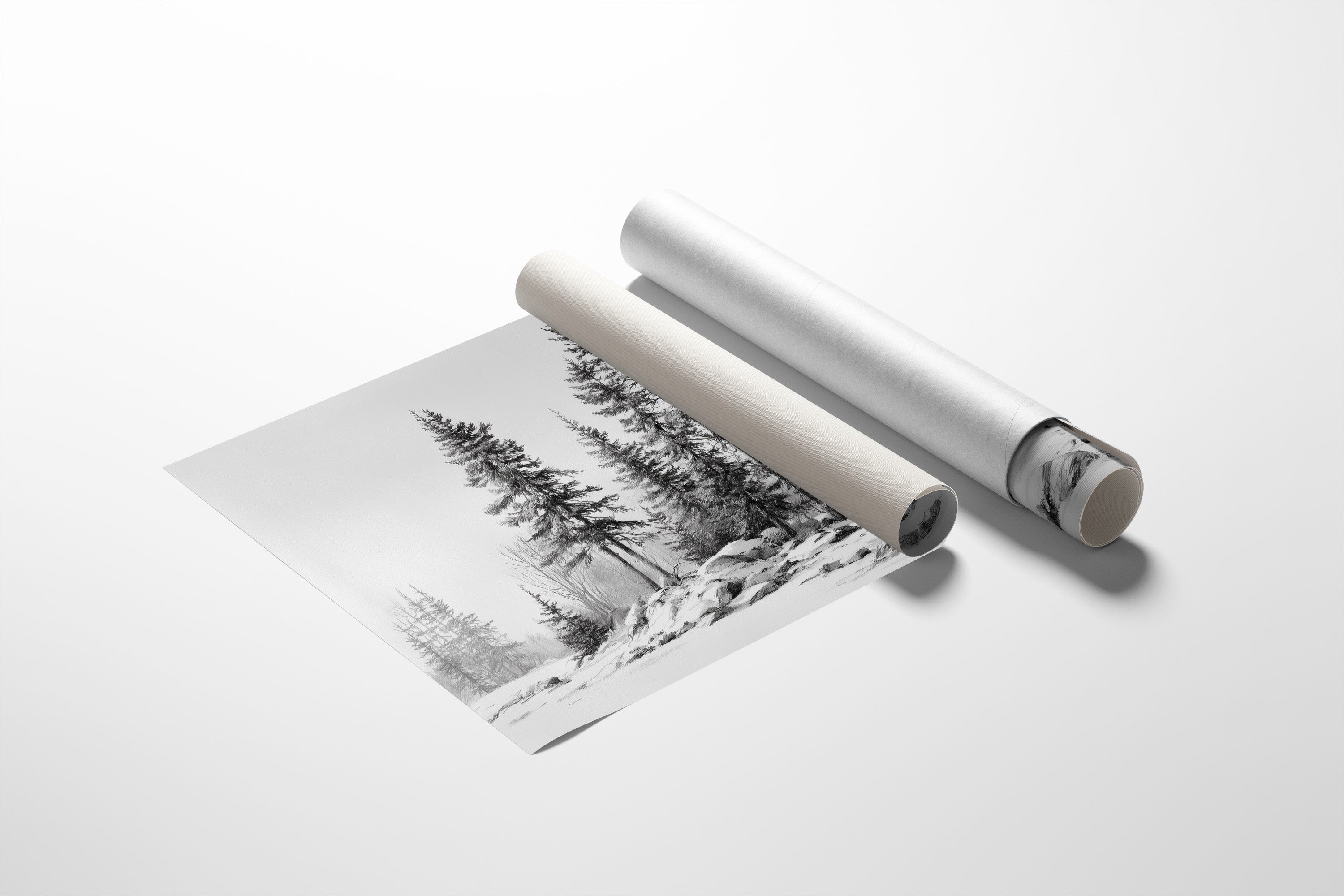 Ethereal morning light filters through towering evergreens, their silhouettes stark against the misty winter sky. The black and white composition captures nature's quiet strength, where snow-laden rocks and bare branches create a symphony of textures in grayscale. The scene speaks of solitude and endurance, with each tree standing sentinel over the frozen landscape. Perfect for creating a sense of peaceful contemplation in a modern living room or adding natural elegance to a minimalist office space.
