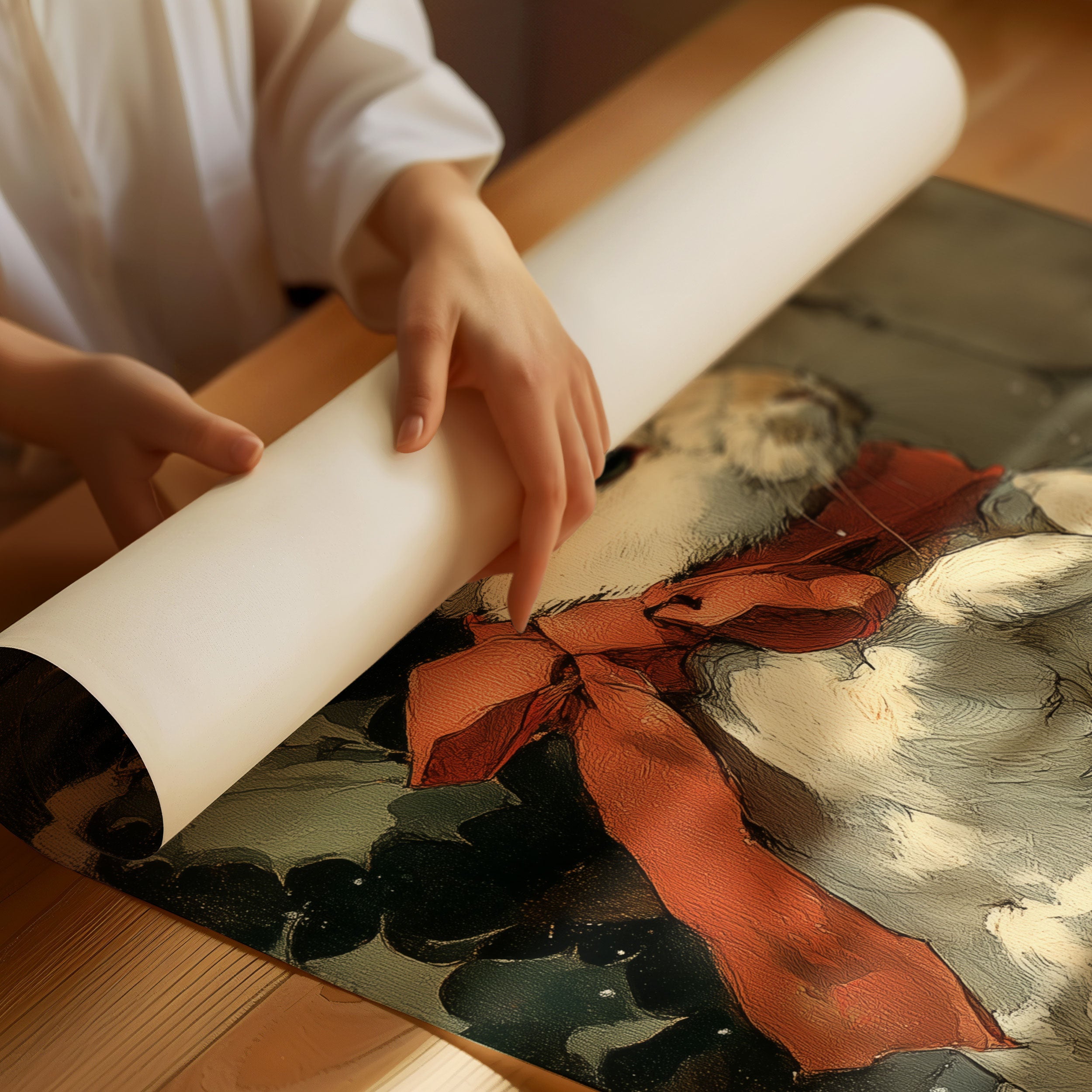 A charming vintage-style illustration captures a white rabbit adorned with a festive red bow, standing proudly amidst holly leaves and snow. The watercolor technique creates a soft, nostalgic mood while deep forest greens and crisp whites evoke the essence of winter wonderland. The scene tells a story of holiday enchantment, with the rabbit appearing as a whimsical messenger of seasonal joy beside a wrapped present dusted with snow. This piece brings timeless charm to any holiday decor, perfect for creating a cozy corner in a living room or adding warmth to a child's bedroom during the winter season.