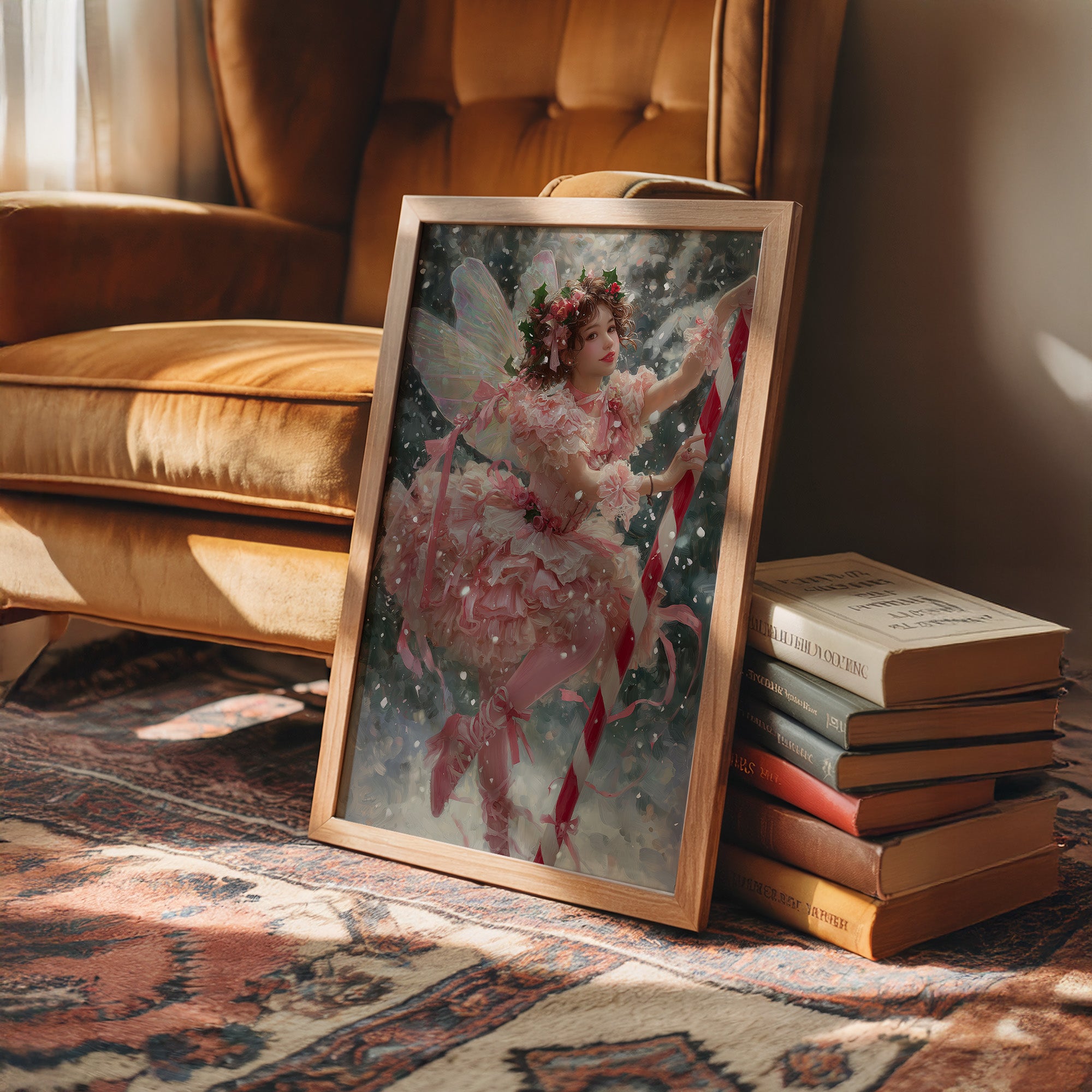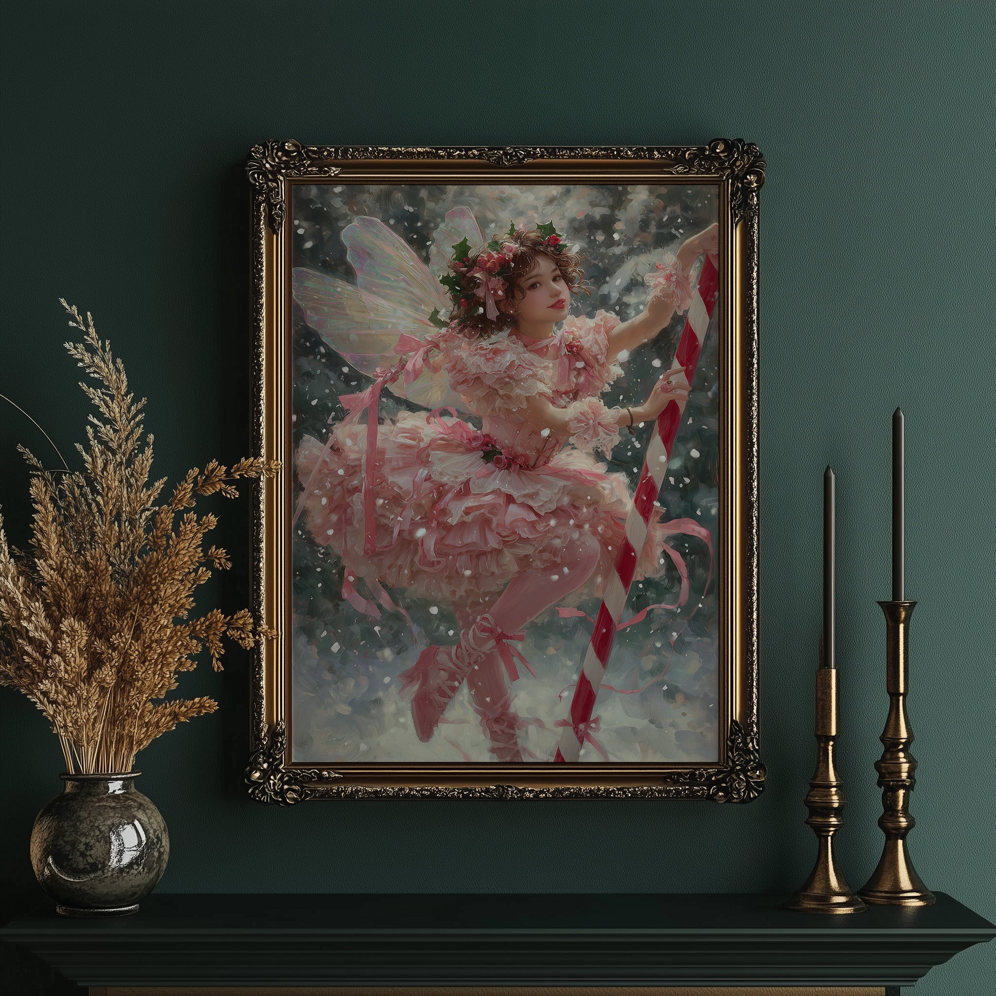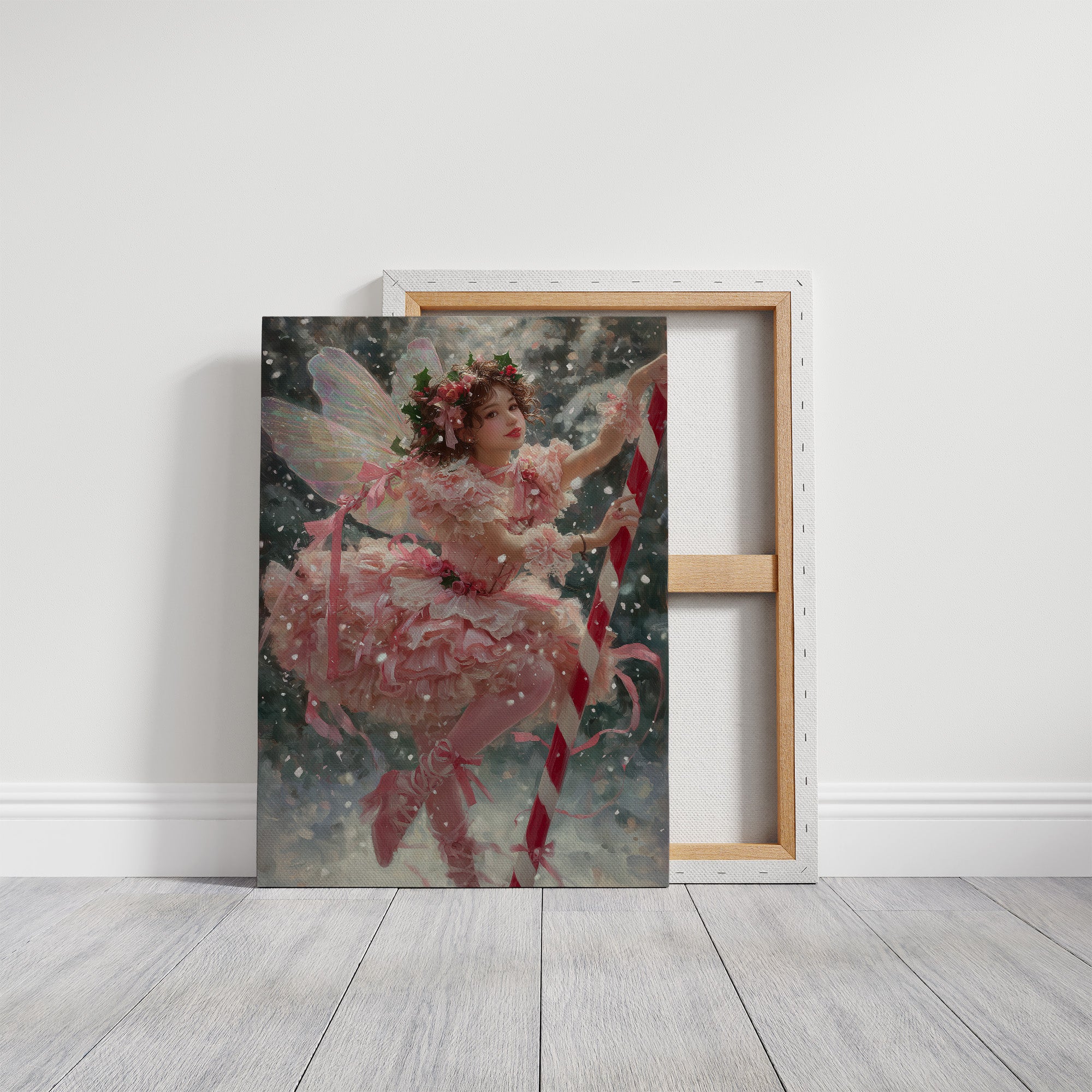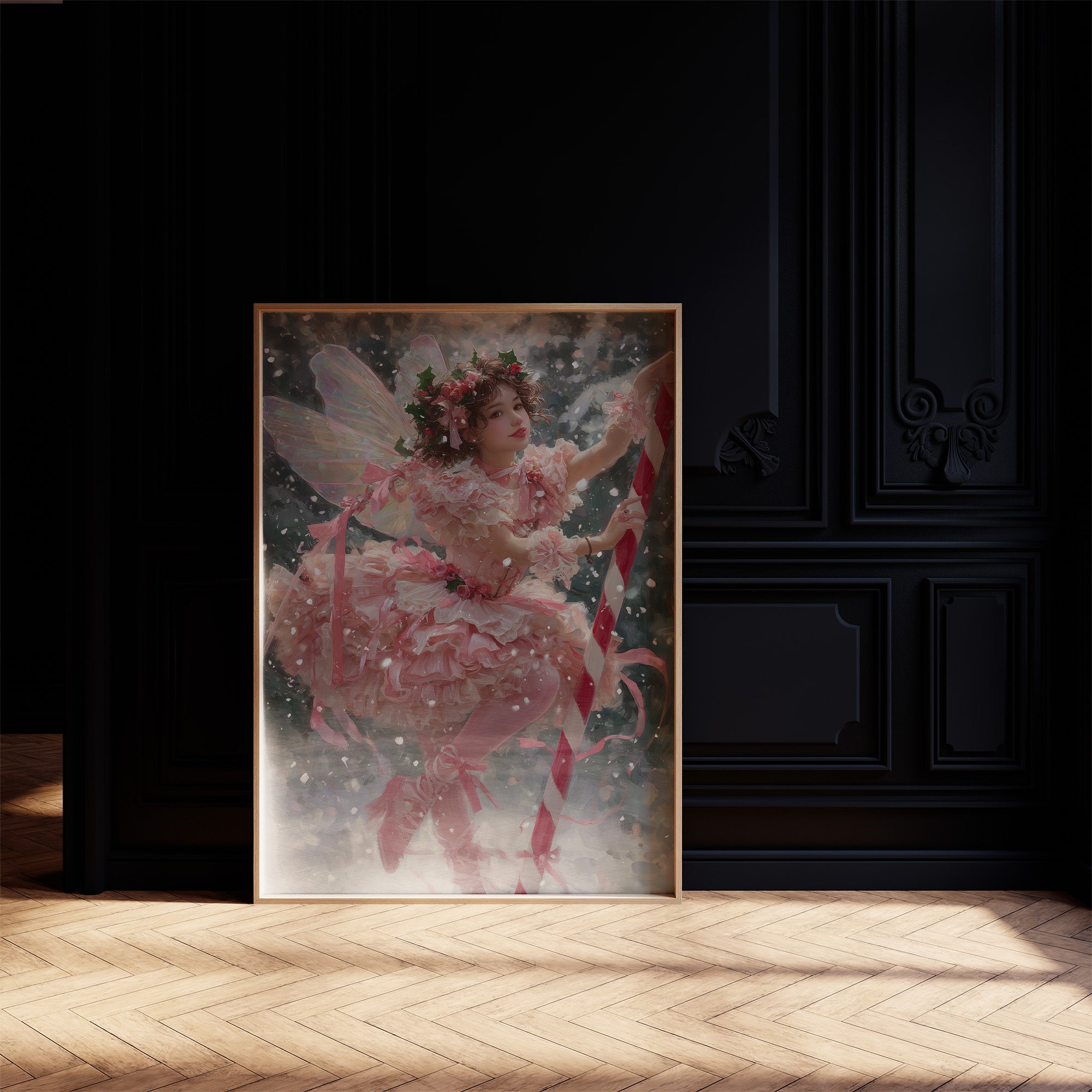 Soft pink layers flutter against a backdrop of gentle snowfall, creating a moment suspended between fantasy and winter's quiet magic. Delicate wings catch the light as ribbons spiral through the air, their movement captured in a dance of celebration and wonder. This ethereal scene blends the innocence of childhood imagination with the enchantment of holiday traditions in a palette of blush, crimson, and frost.