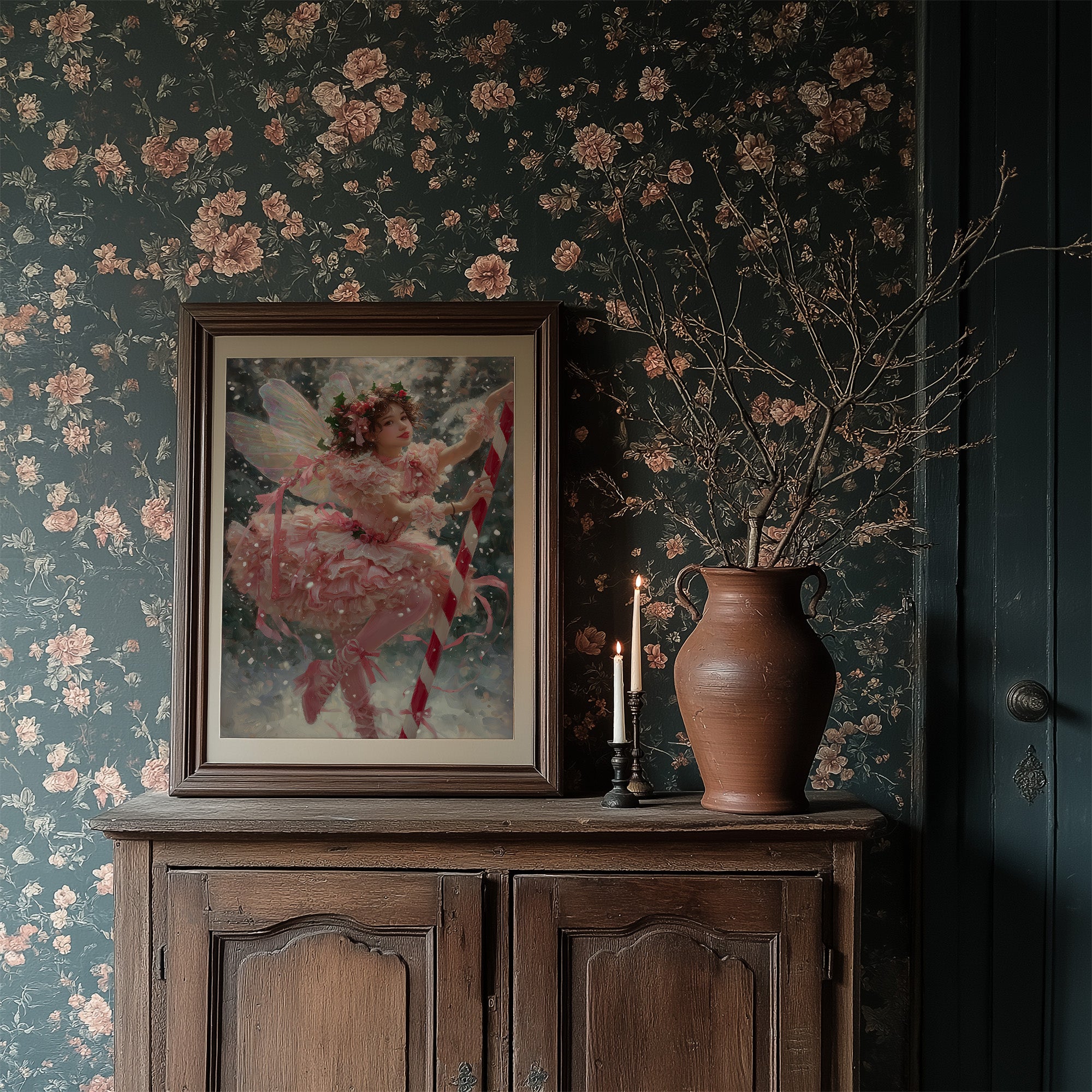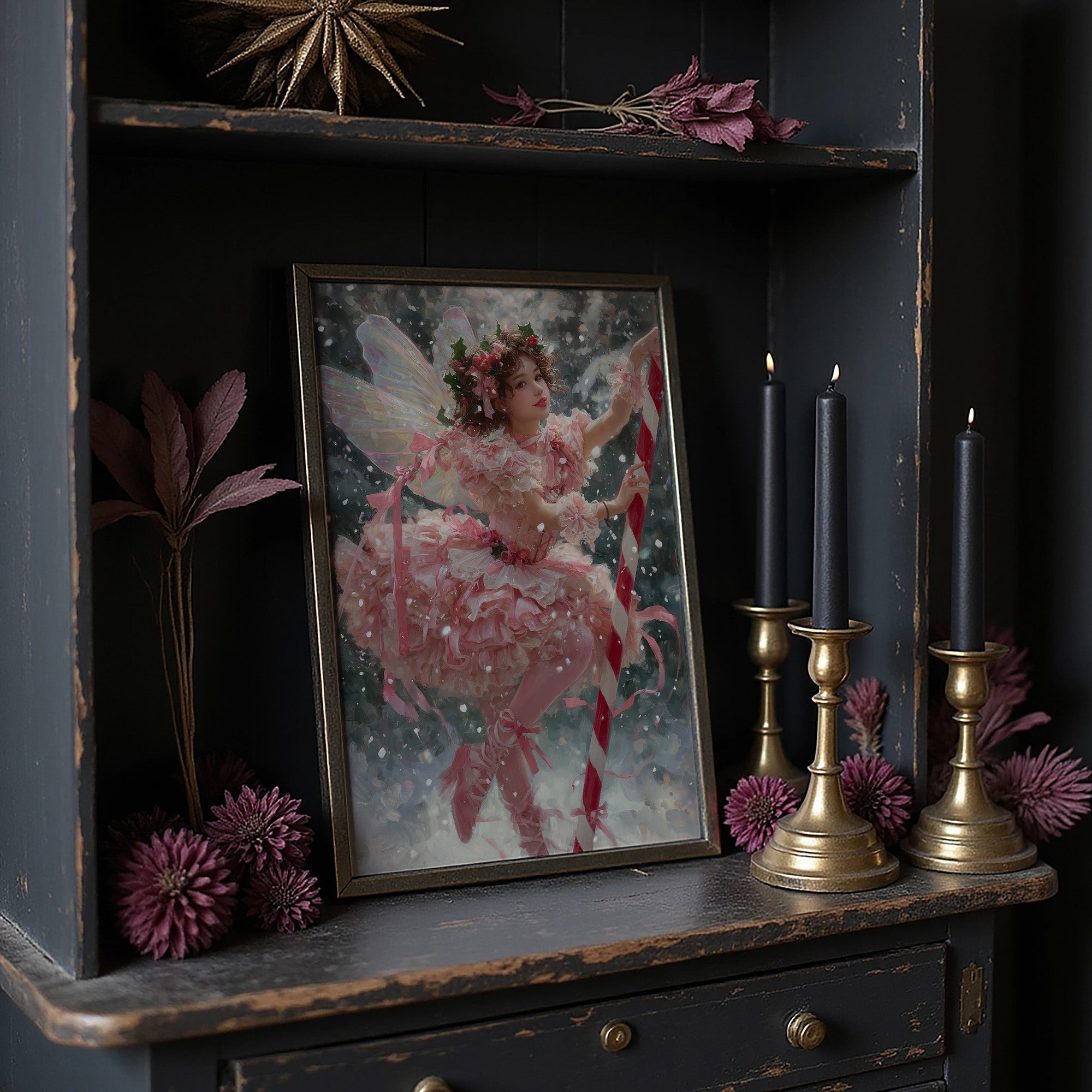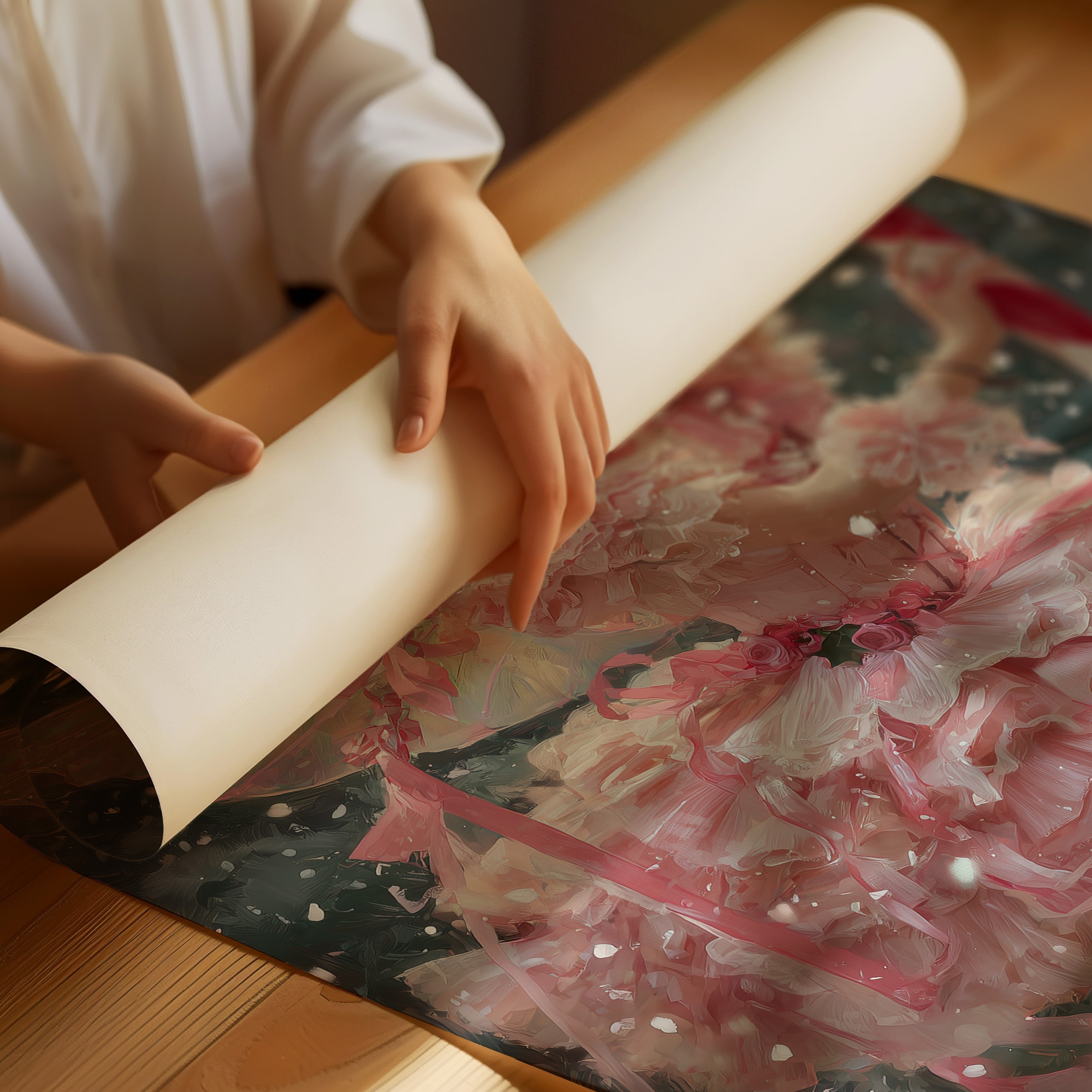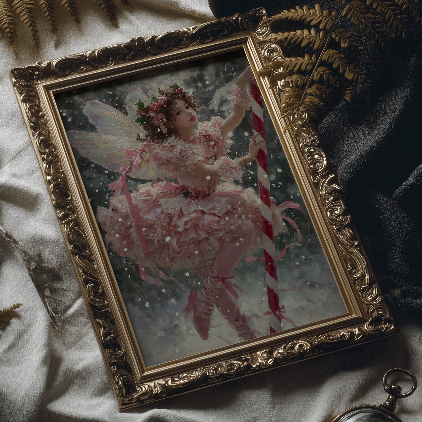 Soft pink layers flutter against a backdrop of gentle snowfall, creating a moment suspended between fantasy and winter's quiet magic. Delicate wings catch the light as ribbons spiral through the air, their movement captured in a dance of celebration and wonder. This ethereal scene blends the innocence of childhood imagination with the enchantment of holiday traditions in a palette of blush, crimson, and frost.