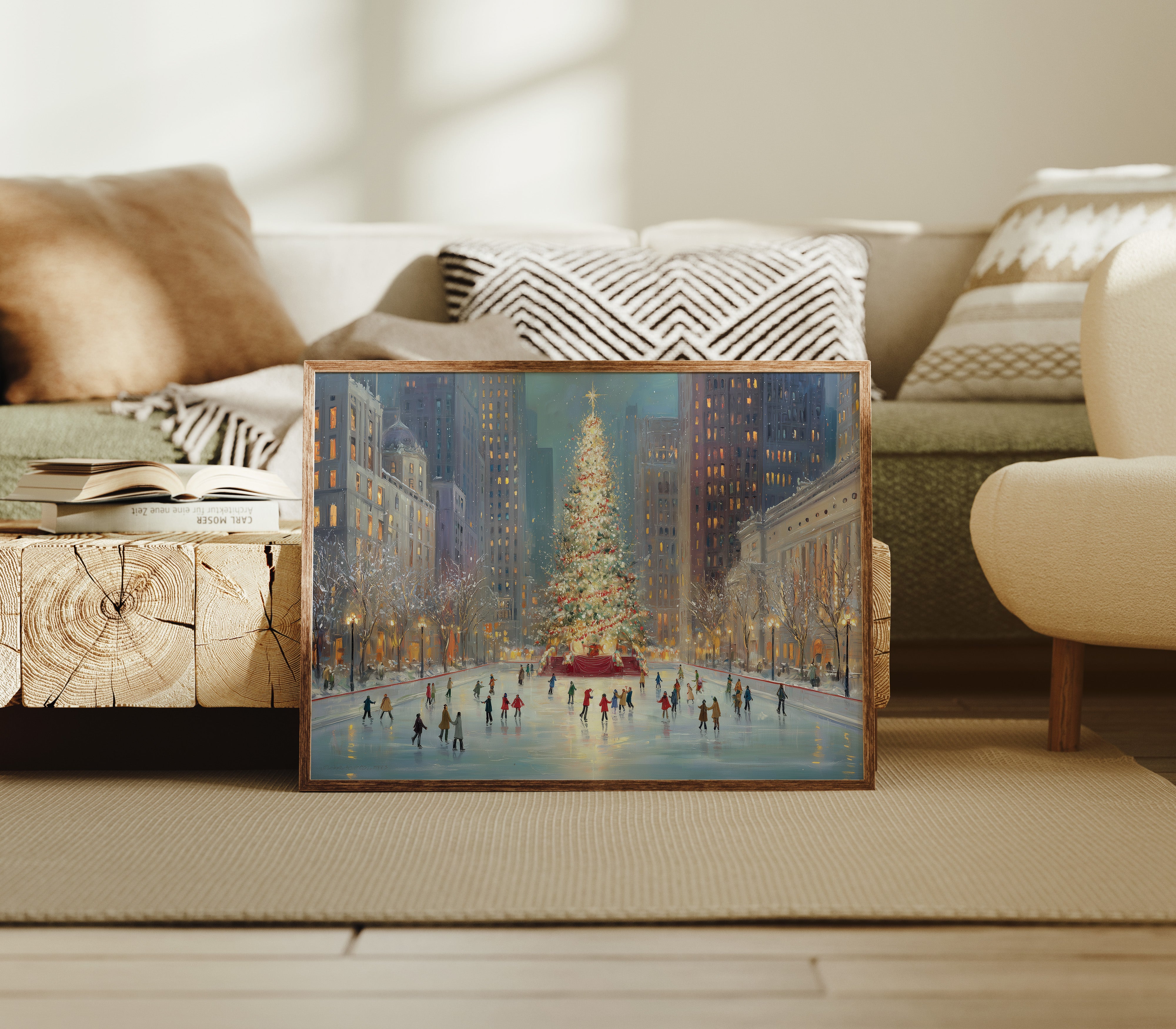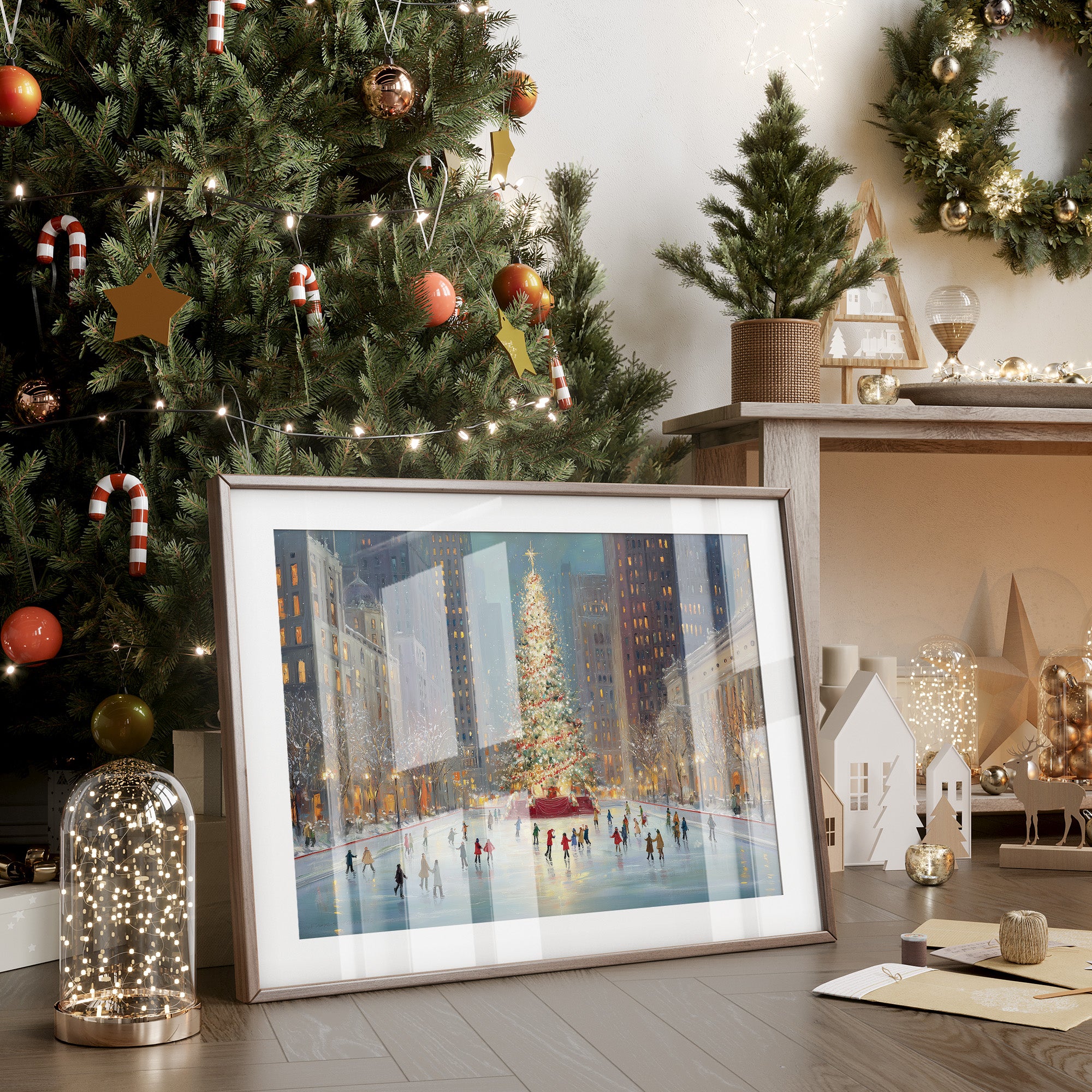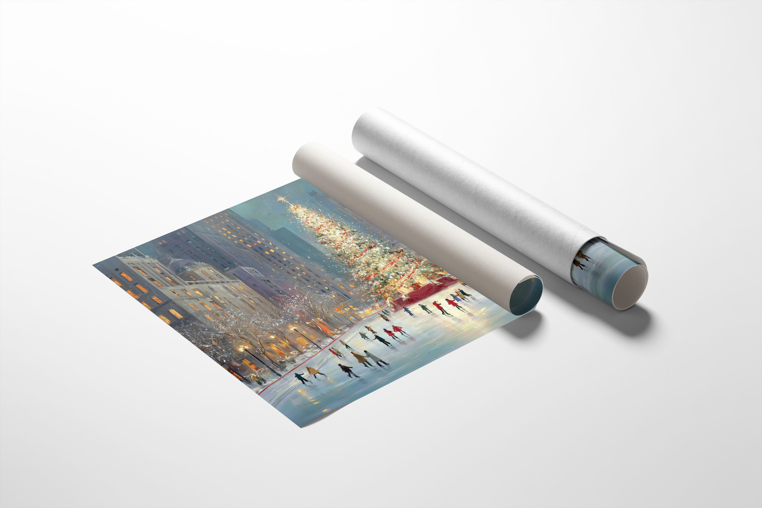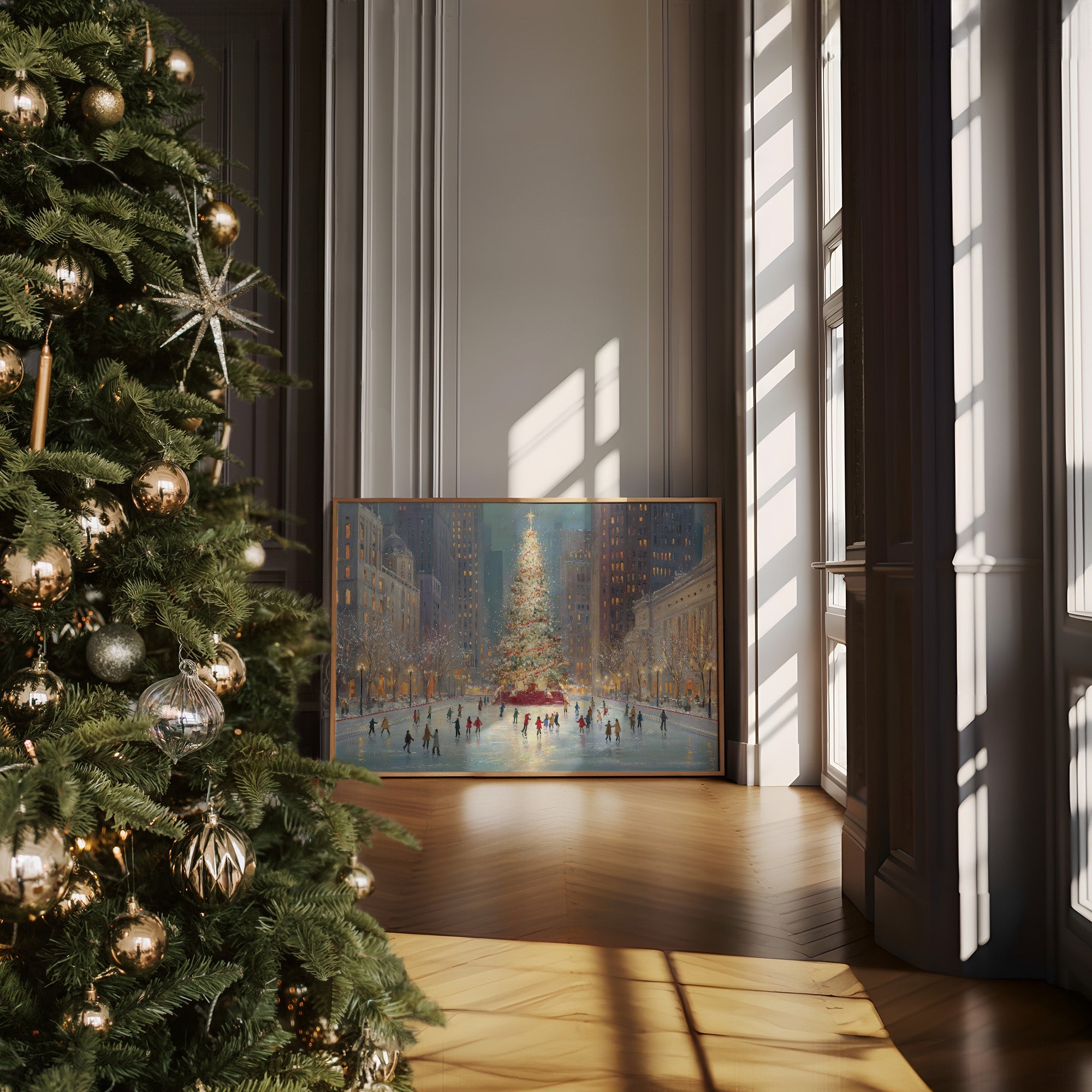 Twinkling city lights pierce the dusky blue evening, casting a magical glow across the ice where skaters glide in graceful patterns. The majestic Christmas tree stands as a beacon of warmth and celebration, its golden star reaching toward the towering skyscrapers that frame this quintessential urban winter scene. The artist captures the romance of the season through soft brushstrokes that blend the warm yellows of building windows with cool winter blues, while tiny figures trace their stories across the frozen surface. This nostalgic piece brings the enchantment of a New York City Christmas to any room, perfect for creating a sophisticated seasonal ambiance in living rooms or entryways.