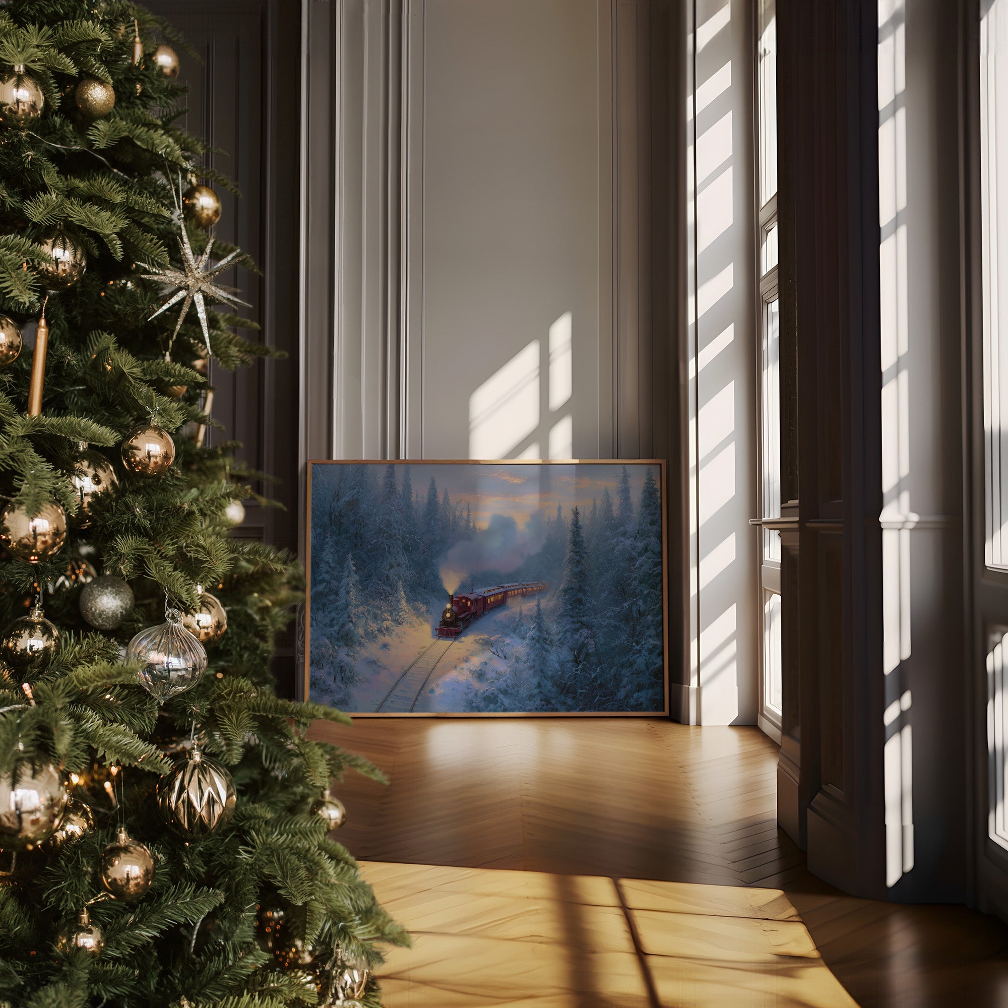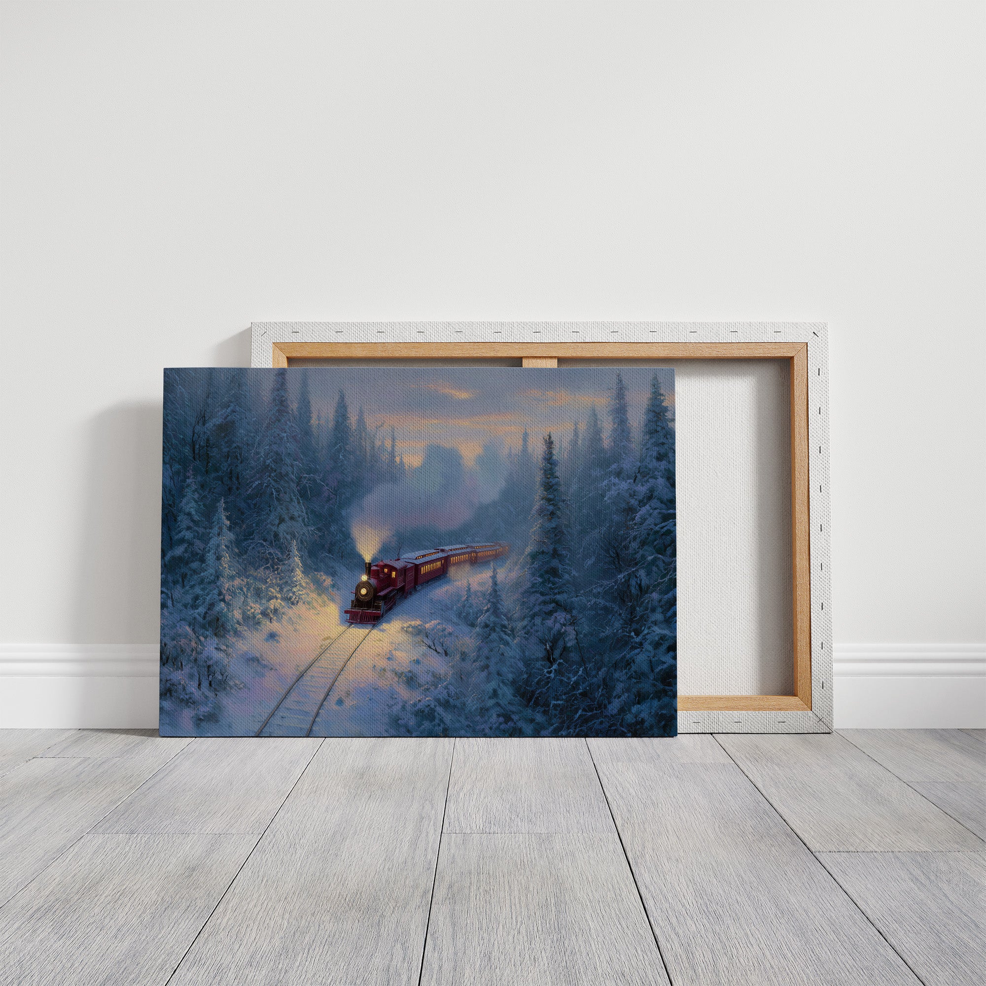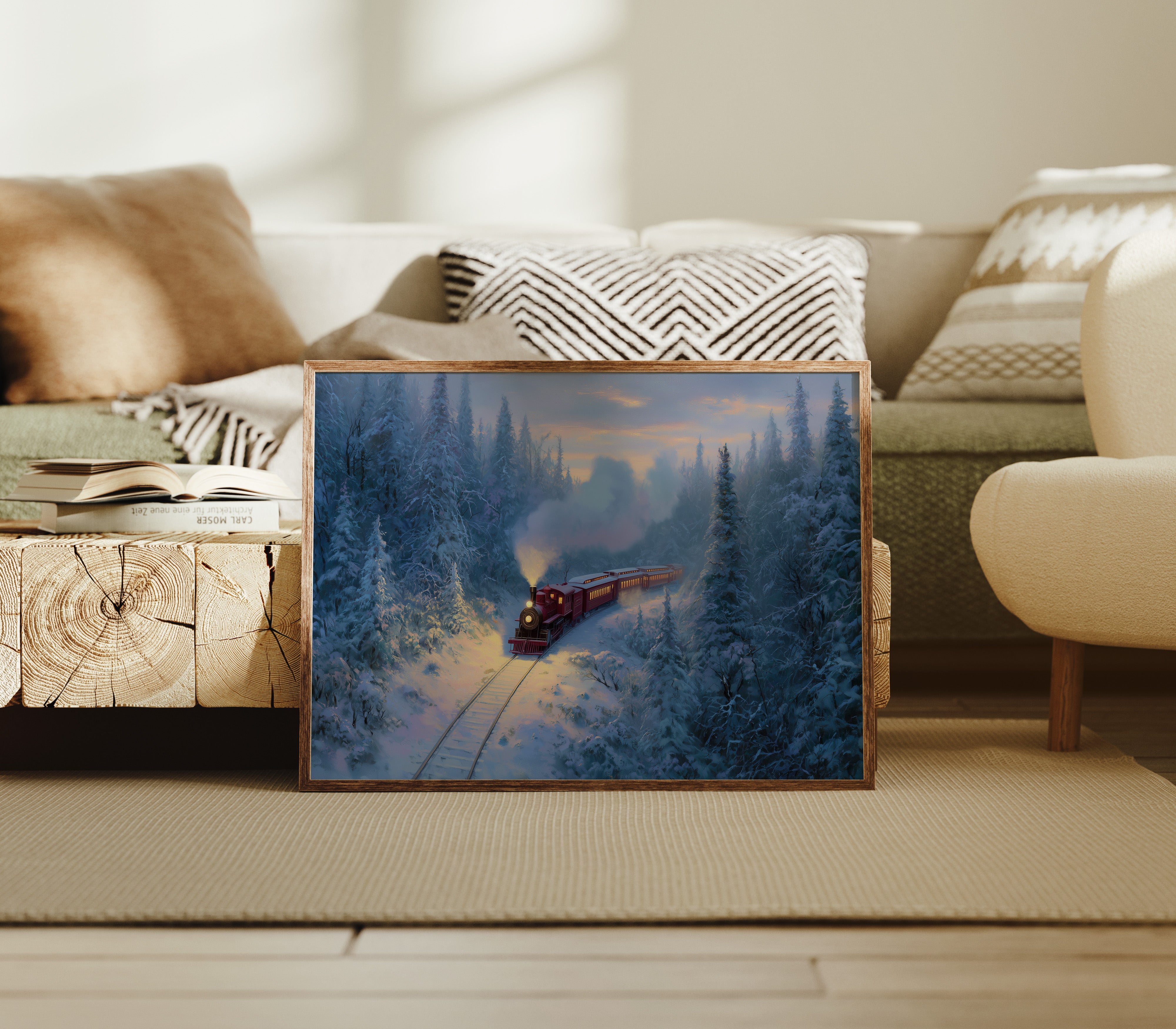 A crimson train pierces through the hushed winter wilderness, its warm glow a beacon against the snow-laden forest. Steam billows skyward, dancing with the dusky clouds that paint the horizon in gentle pinks and purples. The evergreen sentinels stand frozen in their winter coats, creating a natural cathedral through which this iron horse gracefully winds. This piece captures the magical convergence of mechanical wonder and natural splendor, where each snow-covered branch seems to lean in to witness the train's passage. Perfect for a reading nook or living room where it can inspire adventure while offering a cozy reminder of winter's enchanting beauty.