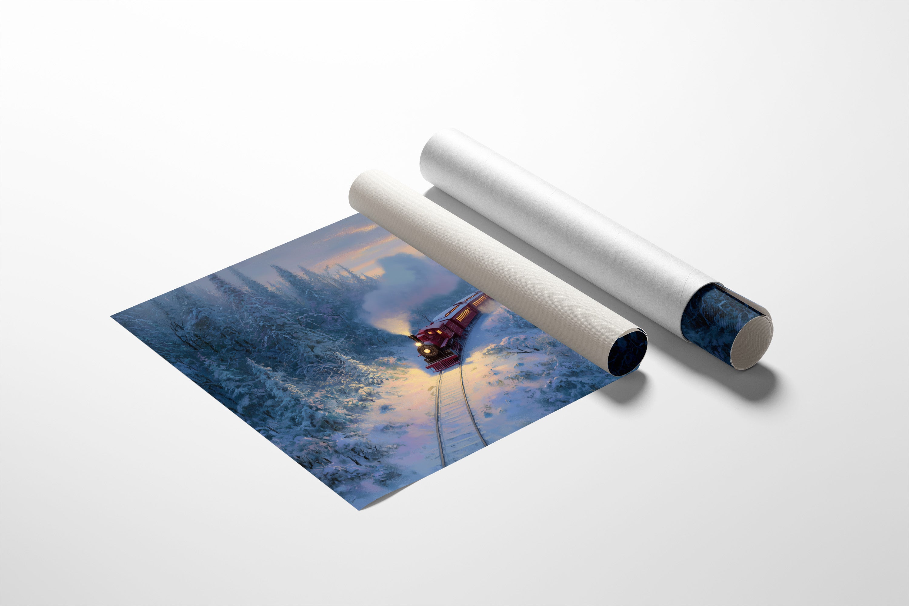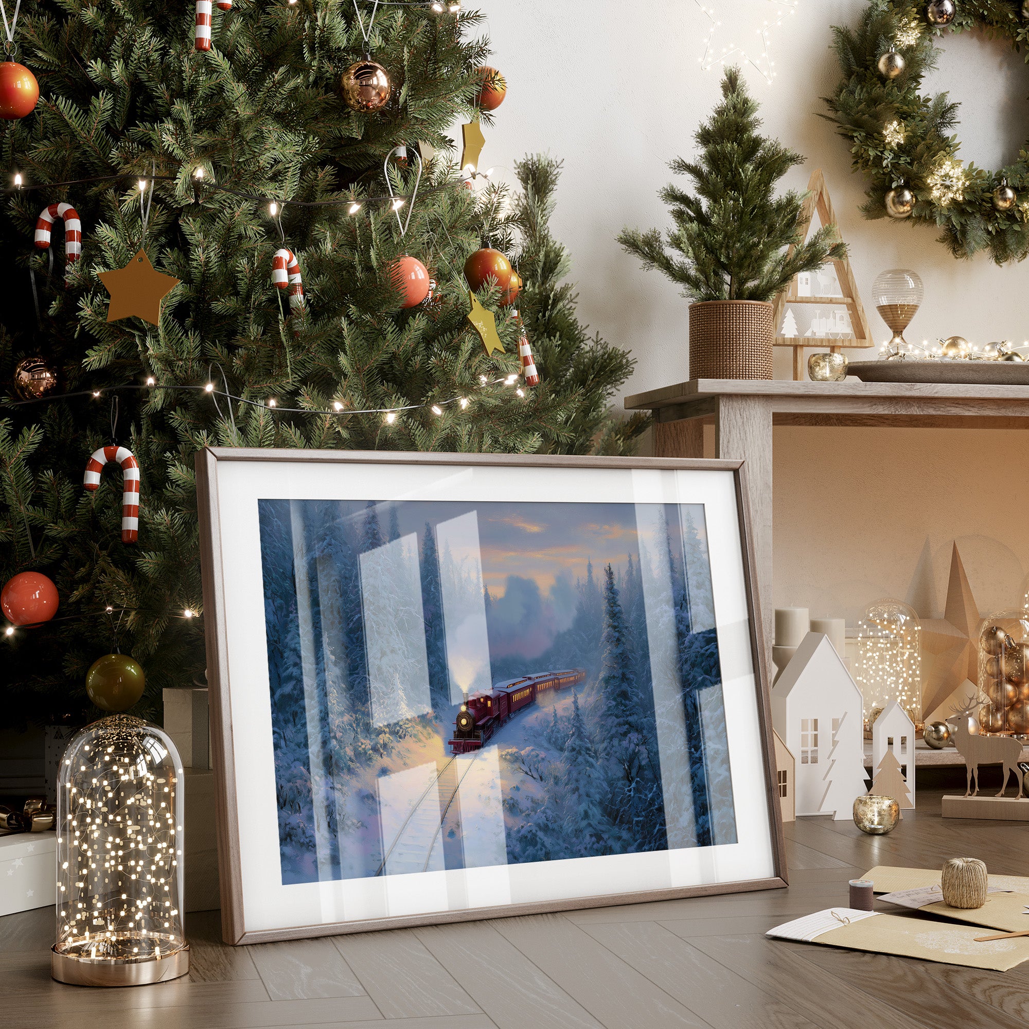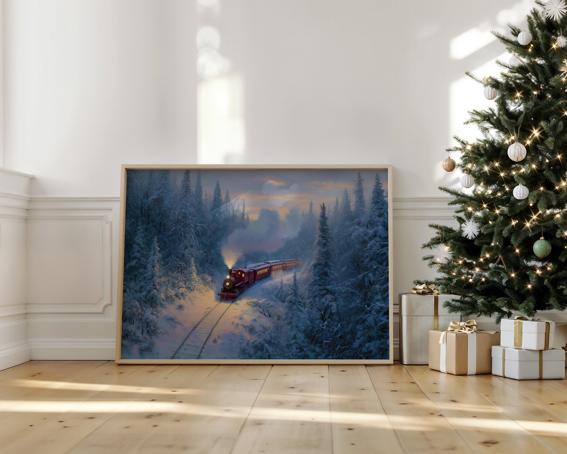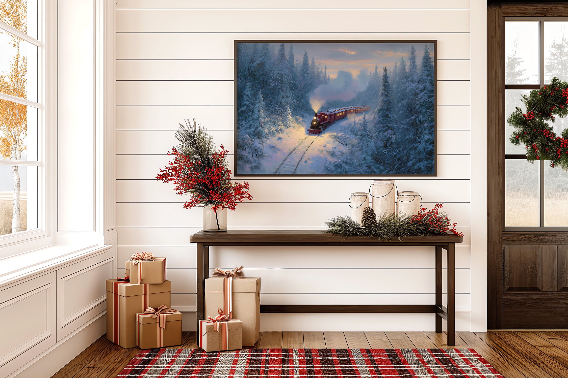 A crimson train pierces through the hushed winter wilderness, its warm glow a beacon against the snow-laden forest. Steam billows skyward, dancing with the dusky clouds that paint the horizon in gentle pinks and purples. The evergreen sentinels stand frozen in their winter coats, creating a natural cathedral through which this iron horse gracefully winds. This piece captures the magical convergence of mechanical wonder and natural splendor, where each snow-covered branch seems to lean in to witness the train's passage. Perfect for a reading nook or living room where it can inspire adventure while offering a cozy reminder of winter's enchanting beauty.