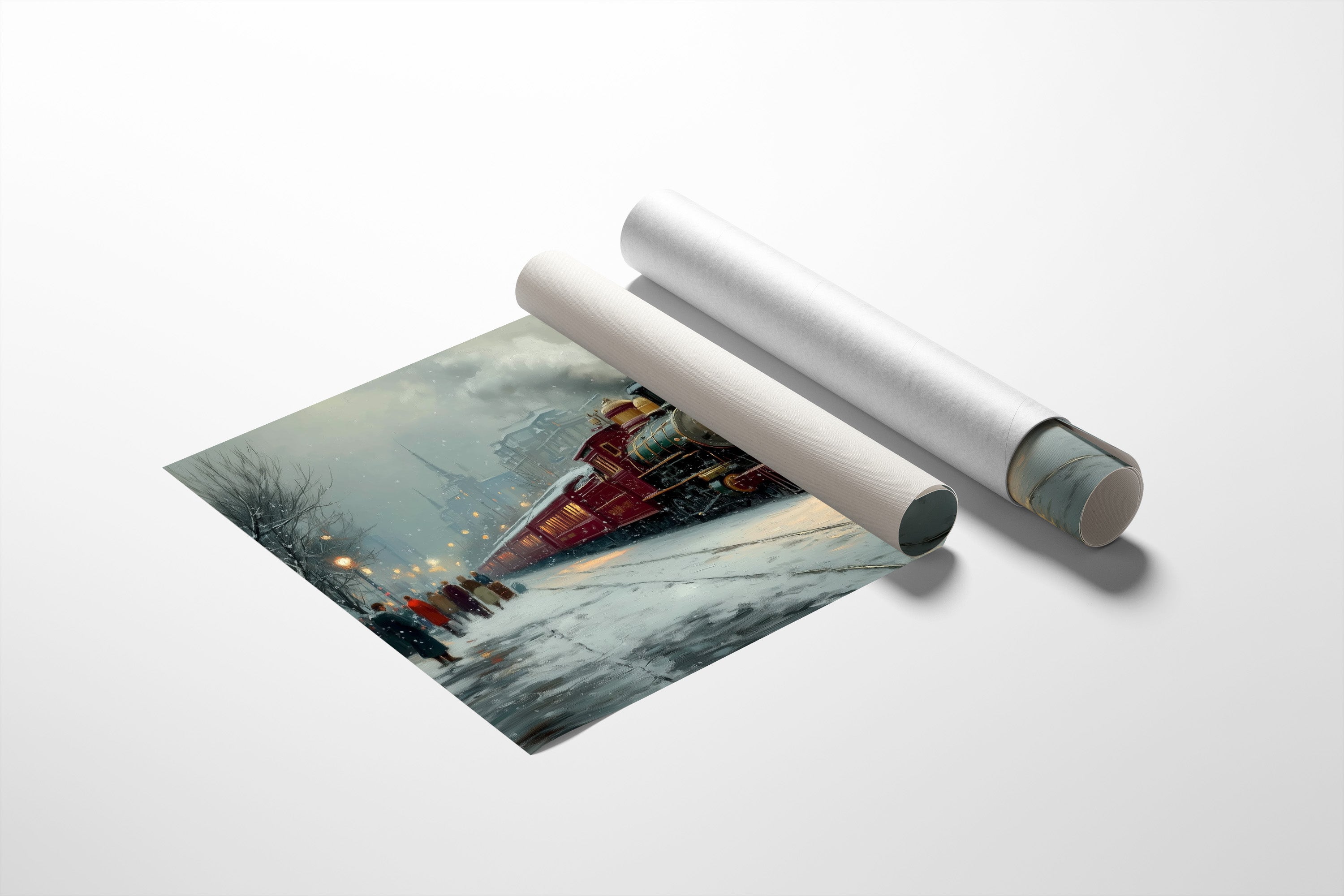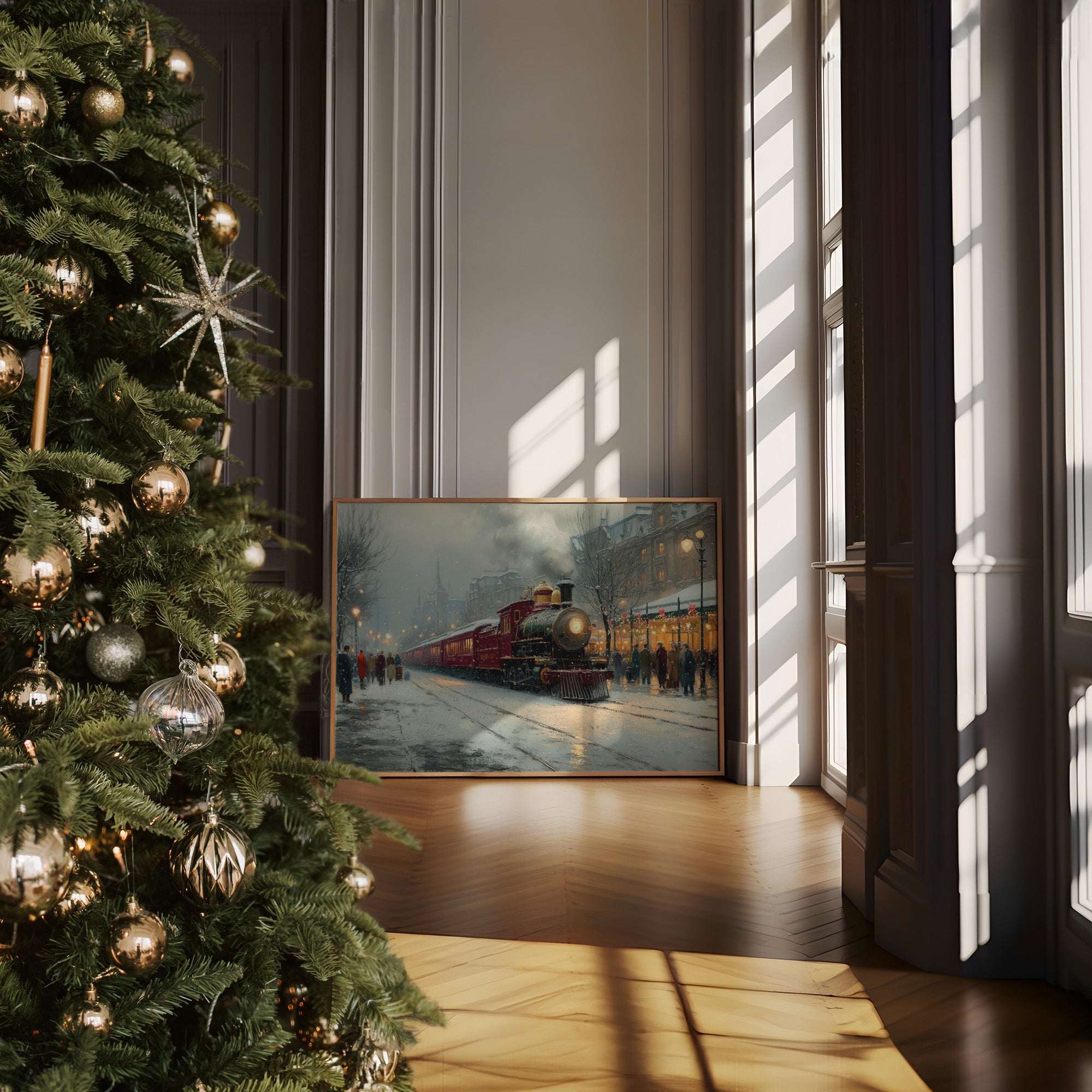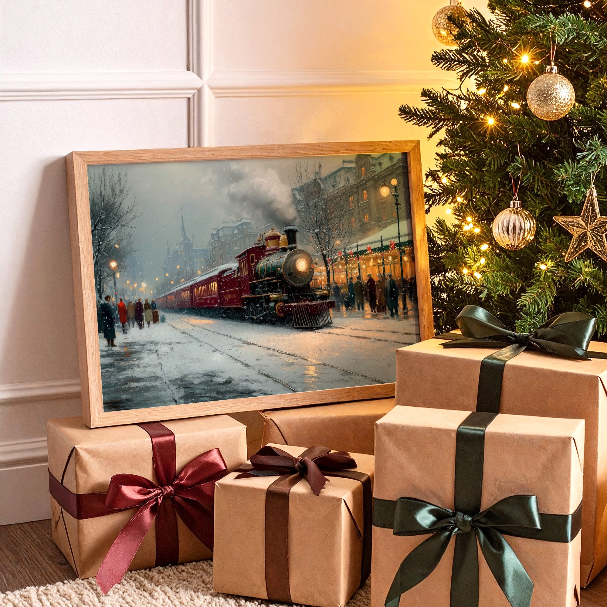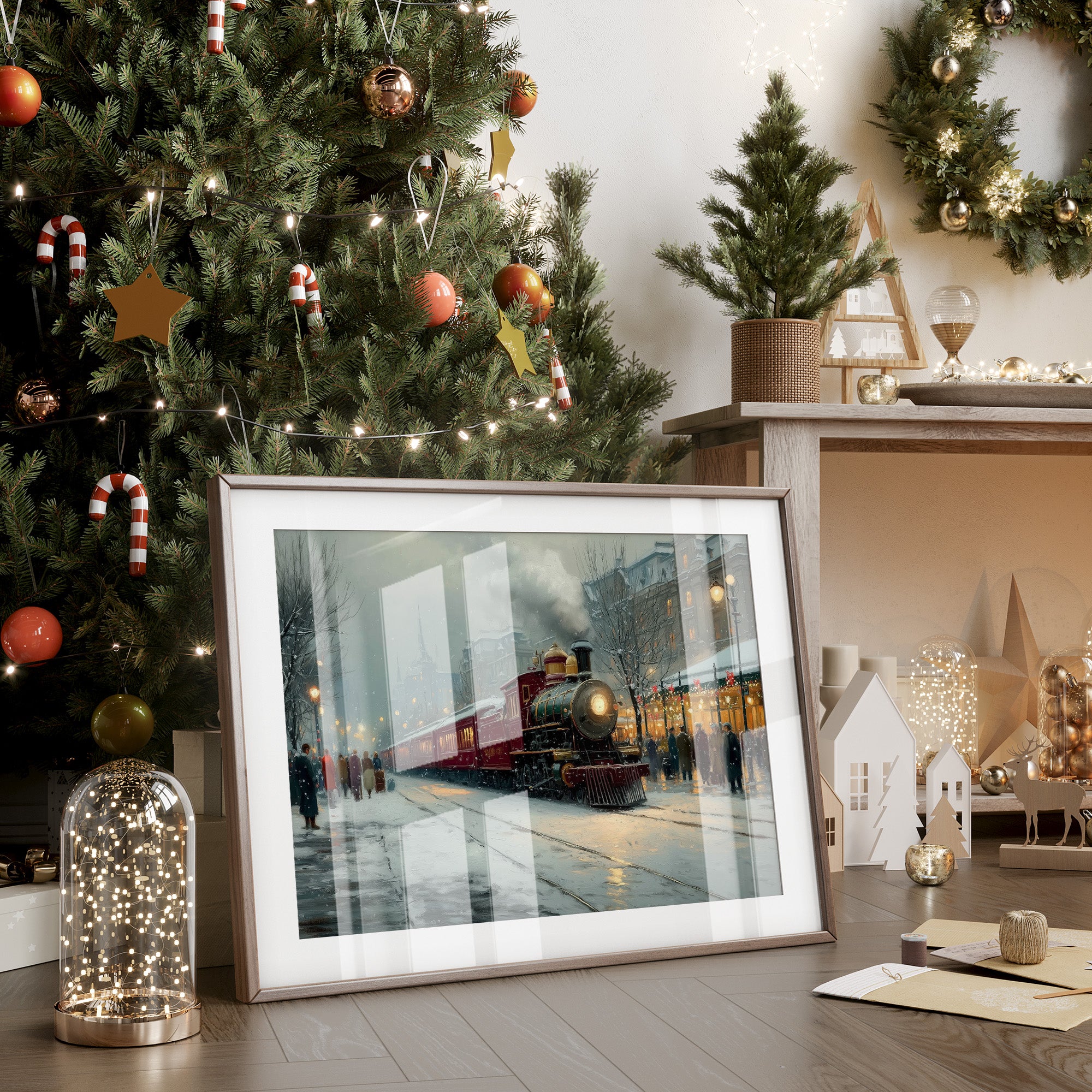 A crimson locomotive pierces through swirling snow, its golden headlight cutting through the winter twilight. The scene captures a moment where Victorian elegance meets industrial might, as warmly dressed figures gather along shop windows adorned with twinkling holiday lights. Steam billows into the grey sky, mixing with snowflakes and the warm glow of street lamps, while the architecture stands proud against the misty evening backdrop. This nostalgic piece would bring seasonal charm to a living room or study, especially paired with rich wood tones and classic furnishings.