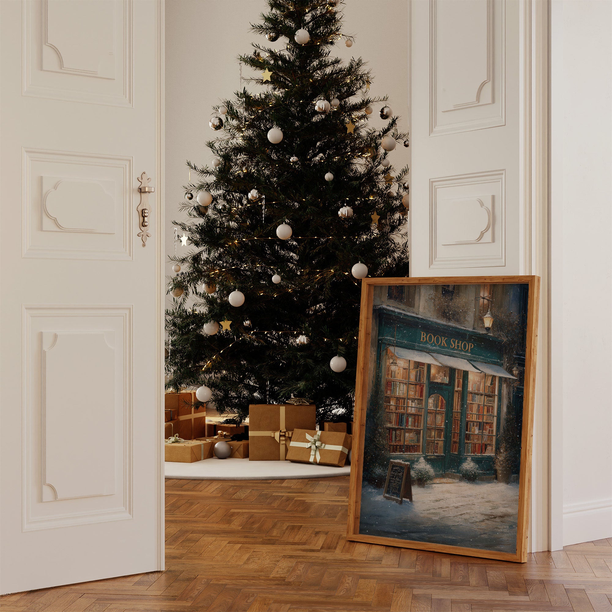 Snow drifts softly past a charming bookshop's teal-painted facade, its golden-lit windows promising warmth and endless stories within. Weathered stone and vintage woodwork frame floor-to-ceiling bookshelves, creating an inviting tableau that beckons bibliophiles through its welcoming doors. The scene captures that magical moment when winter's chill meets literary comfort, with books stacked lovingly behind frosted glass and a simple chalkboard sign hinting at treasures to be discovered. This nostalgic piece brings classic European charm and literary romance to any reading nook or cozy corner.