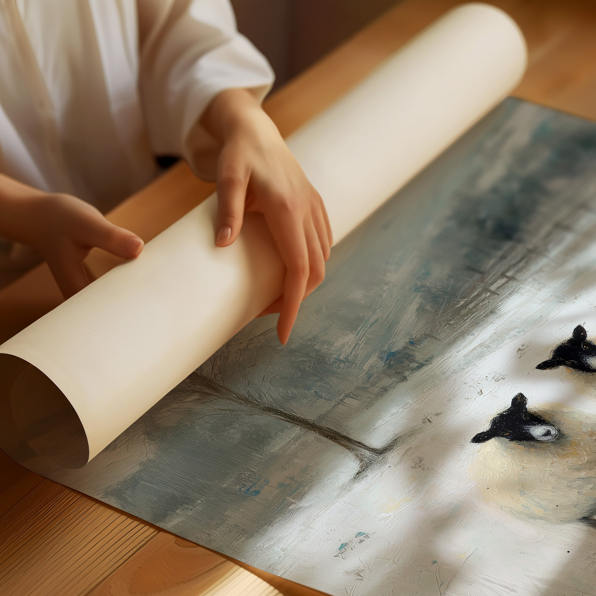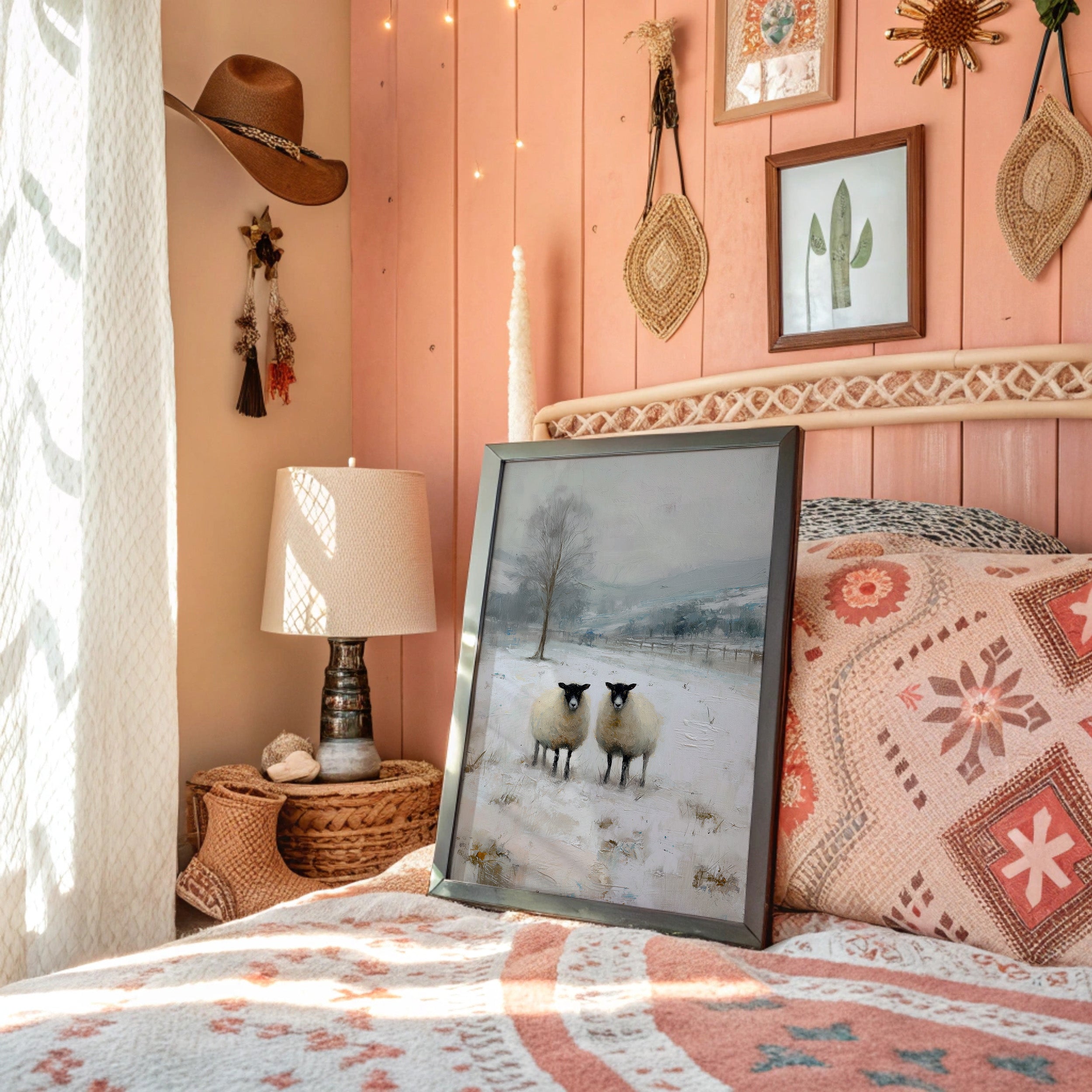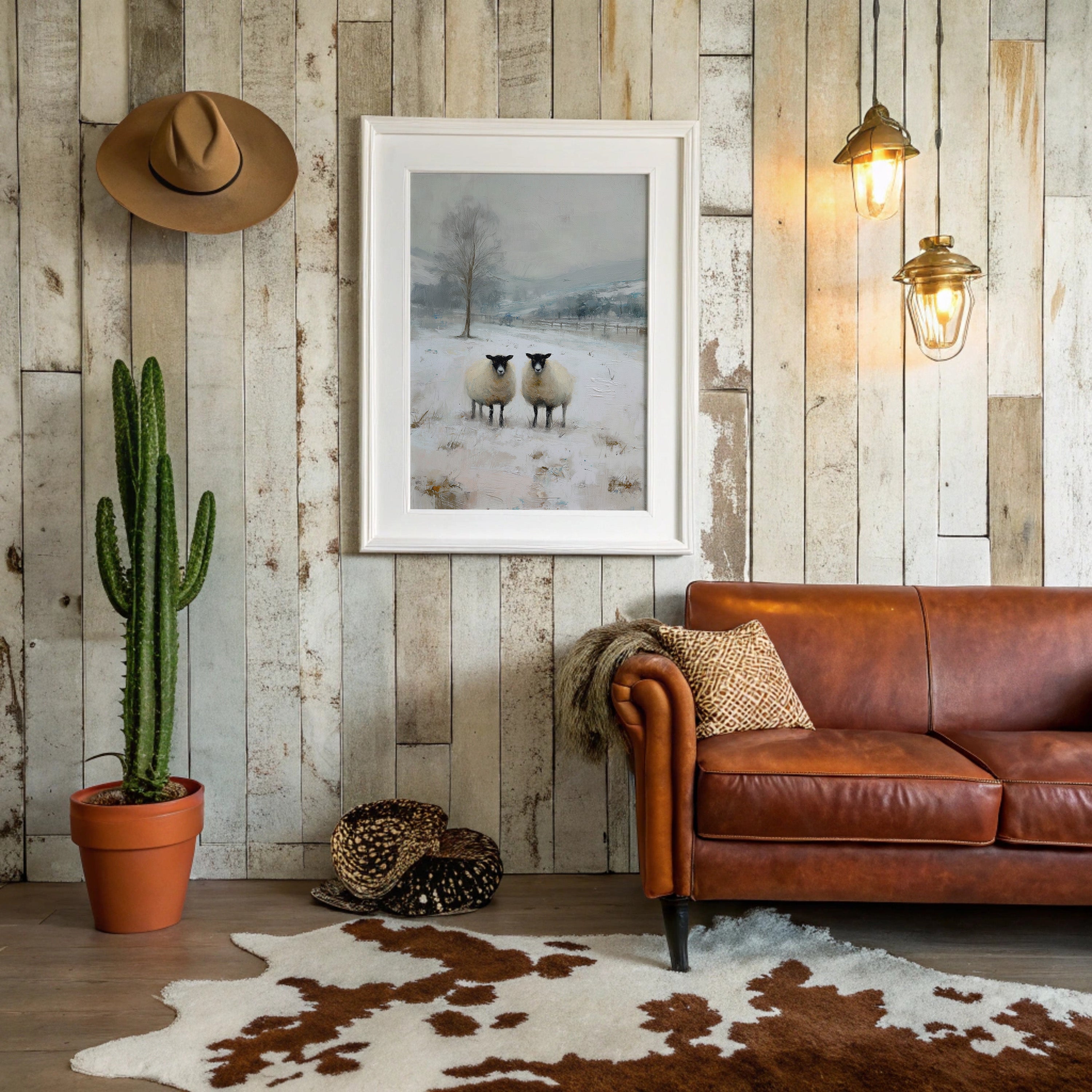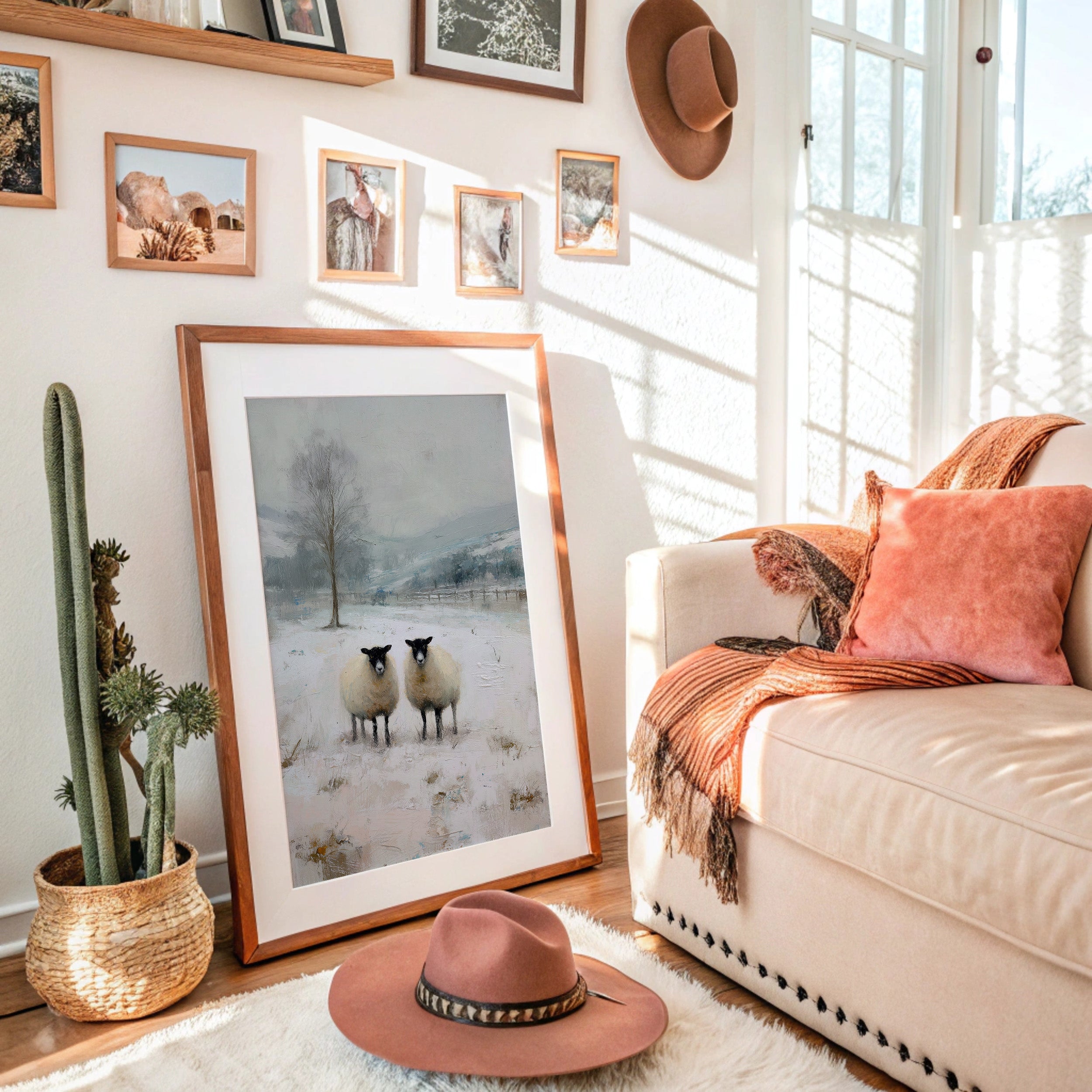 Two sheep stand sentinel in a snow-covered field, their wool thick against the winter chill. The misty landscape stretches behind them, where a lone tree reaches skyward through layers of gray and white. Their black faces peer out with quiet dignity against the ethereal winter scene, creating a moment of pastoral poetry. Perfect for adding a touch of rustic charm and seasonal serenity to a modern farmhouse living room or cozy reading nook.