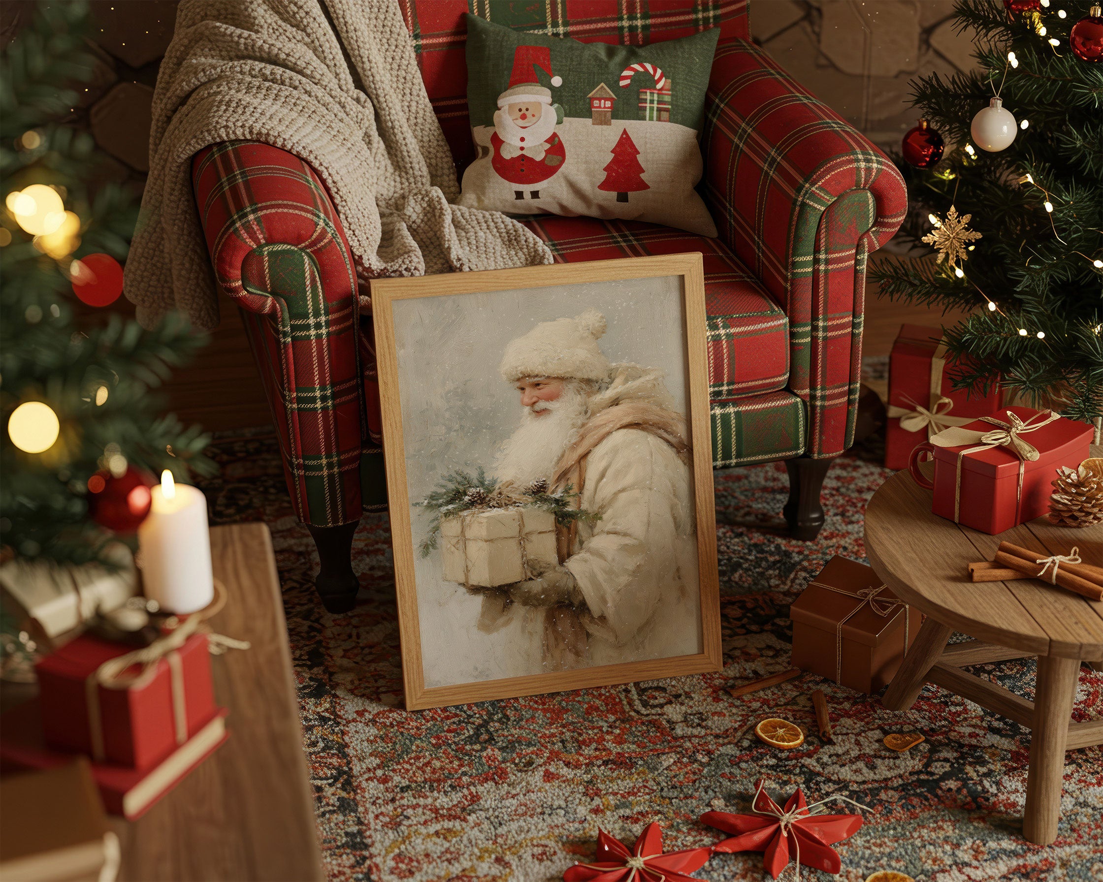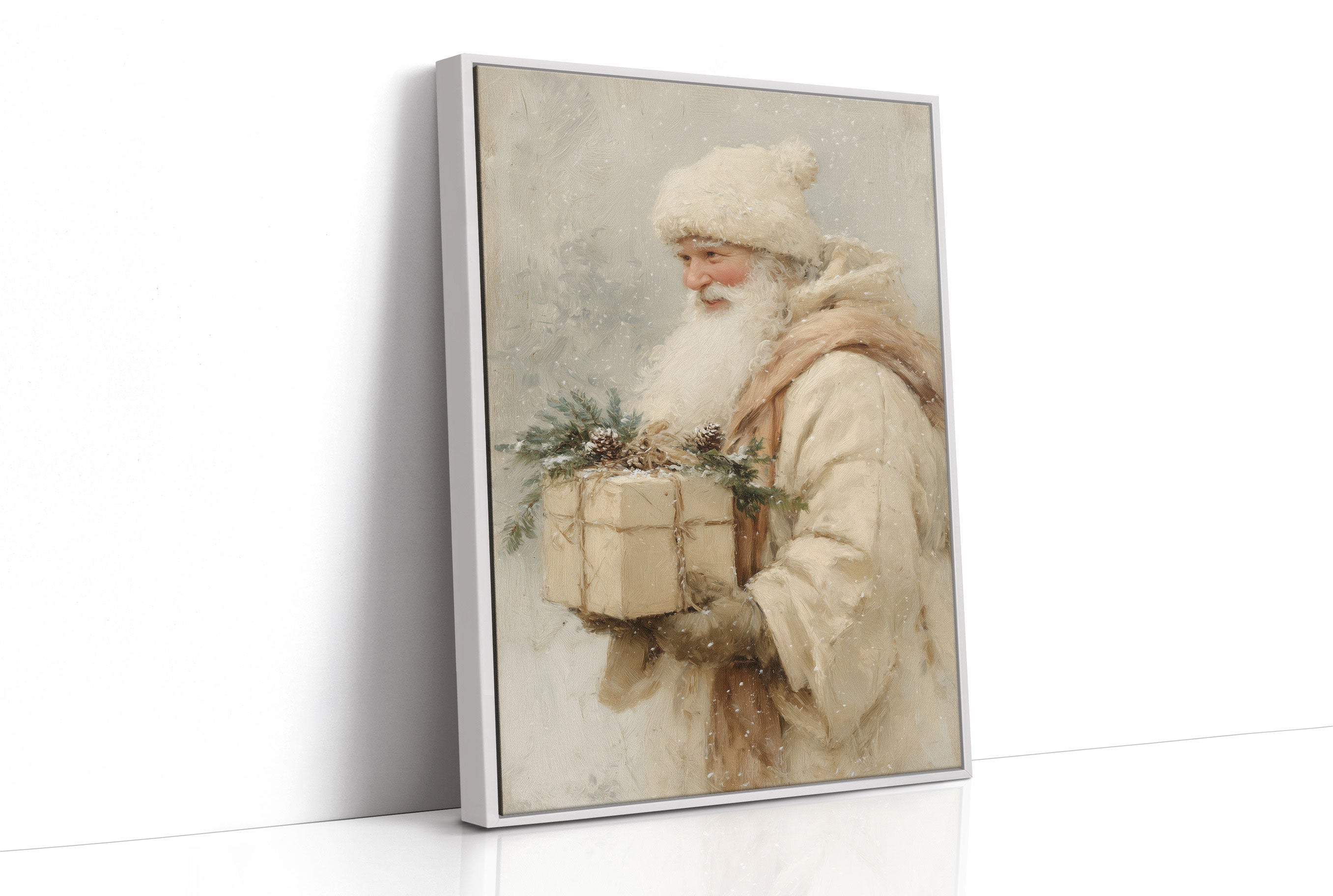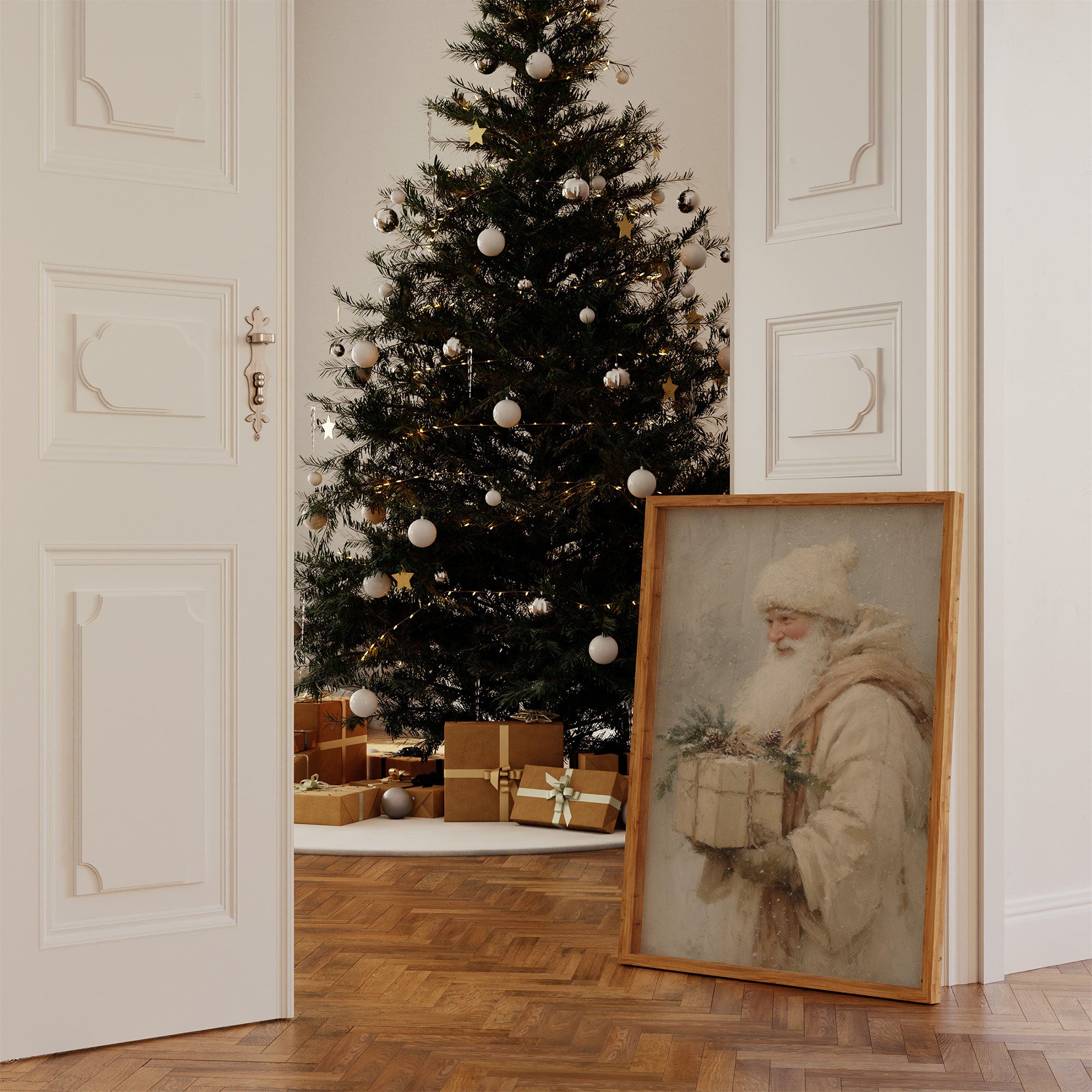 Soft golden light dances through a scene where vintage charm meets modern elegance. A classic portrait in muted cream tones rests against frosted windowpanes, while a snow-dusted evergreen sparkles with copper and pearl ornaments. The composition weaves together traditional holiday elements with contemporary styling, creating a harmonious blend of old and new. Wrapped presents in pristine white with copper ribbons echo the tree's ornate decorations, grounding the entire scene in sophisticated warmth. This piece would elevate a living room or entryway during the holiday season, bringing timeless grace to contemporary holiday decor.