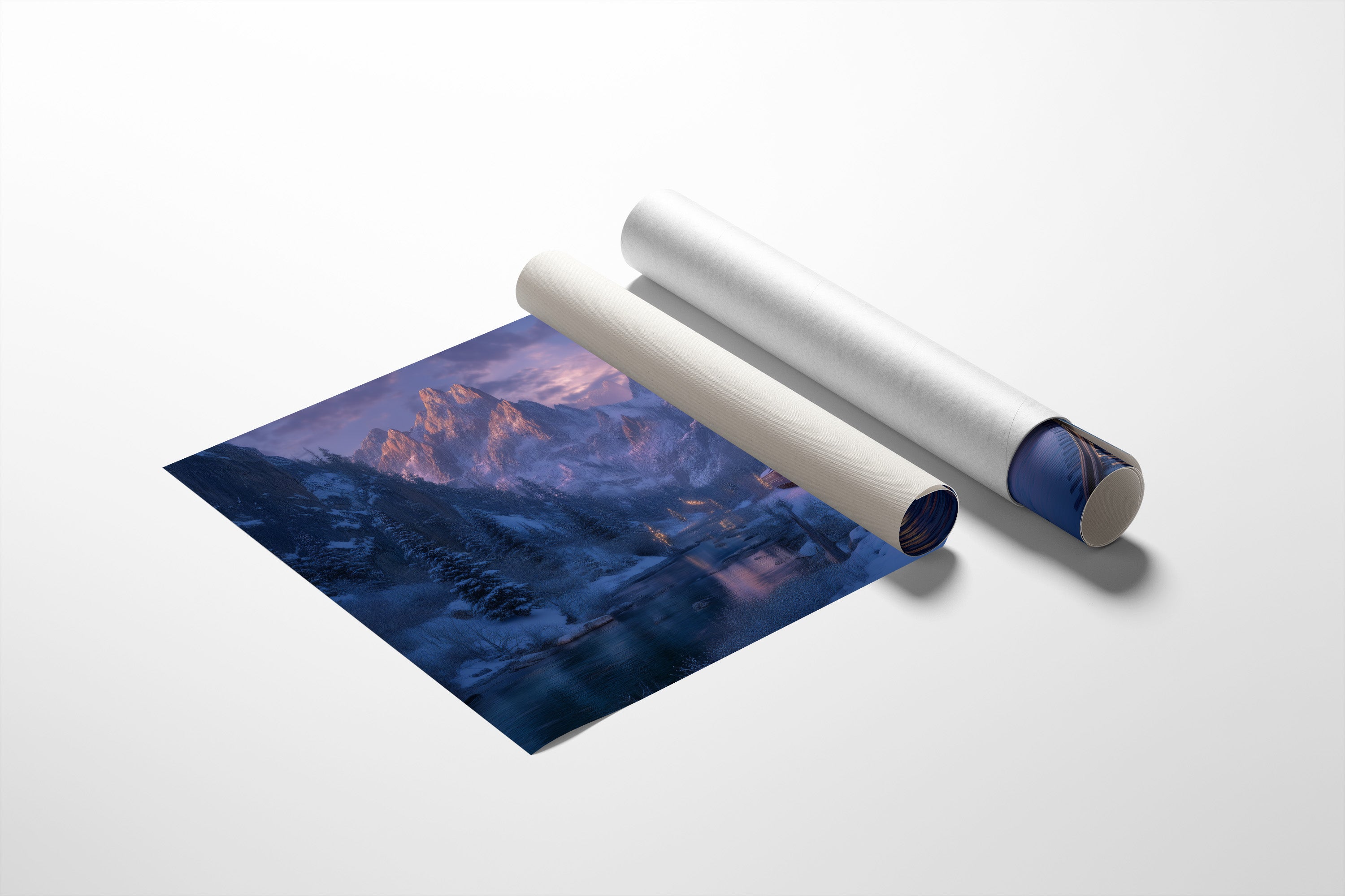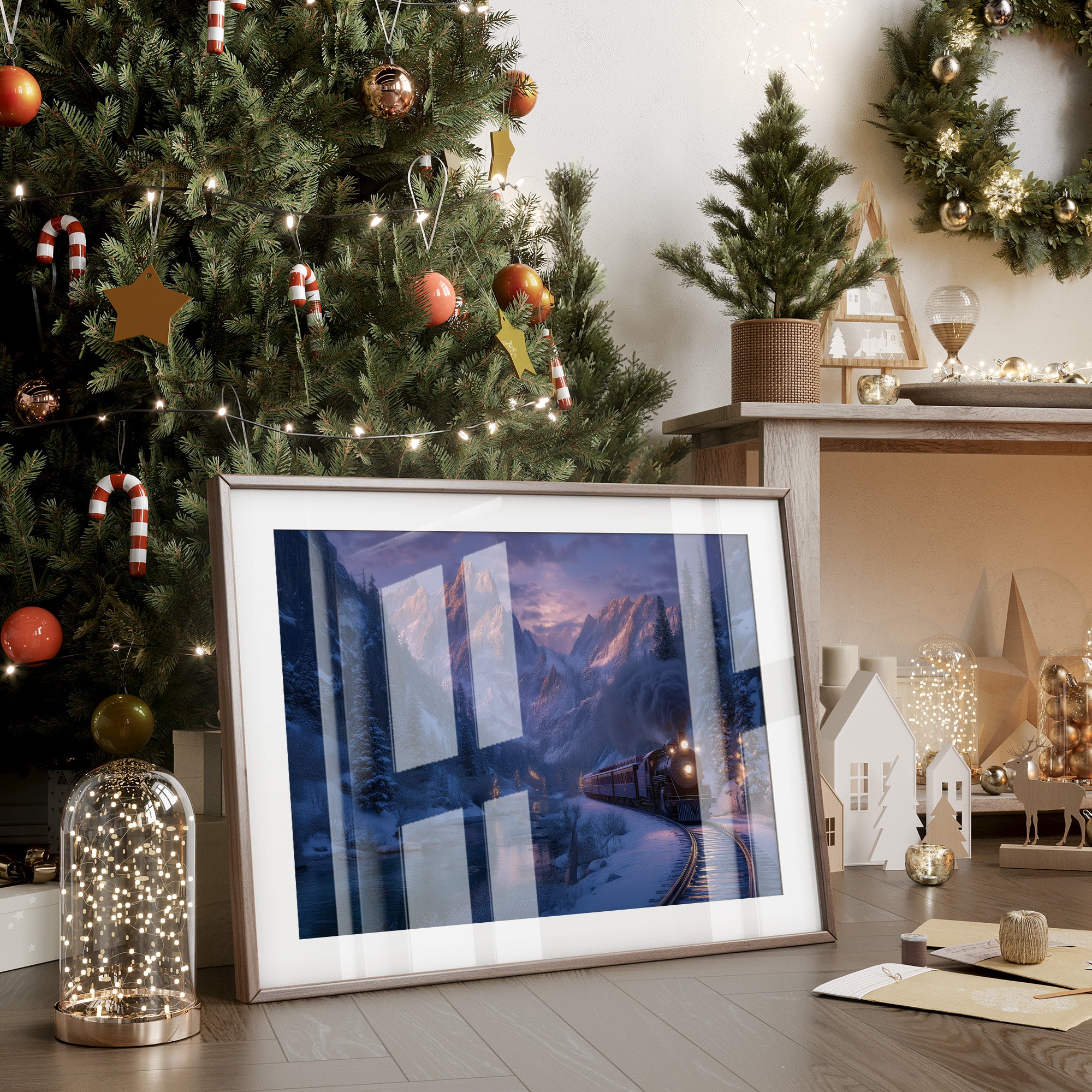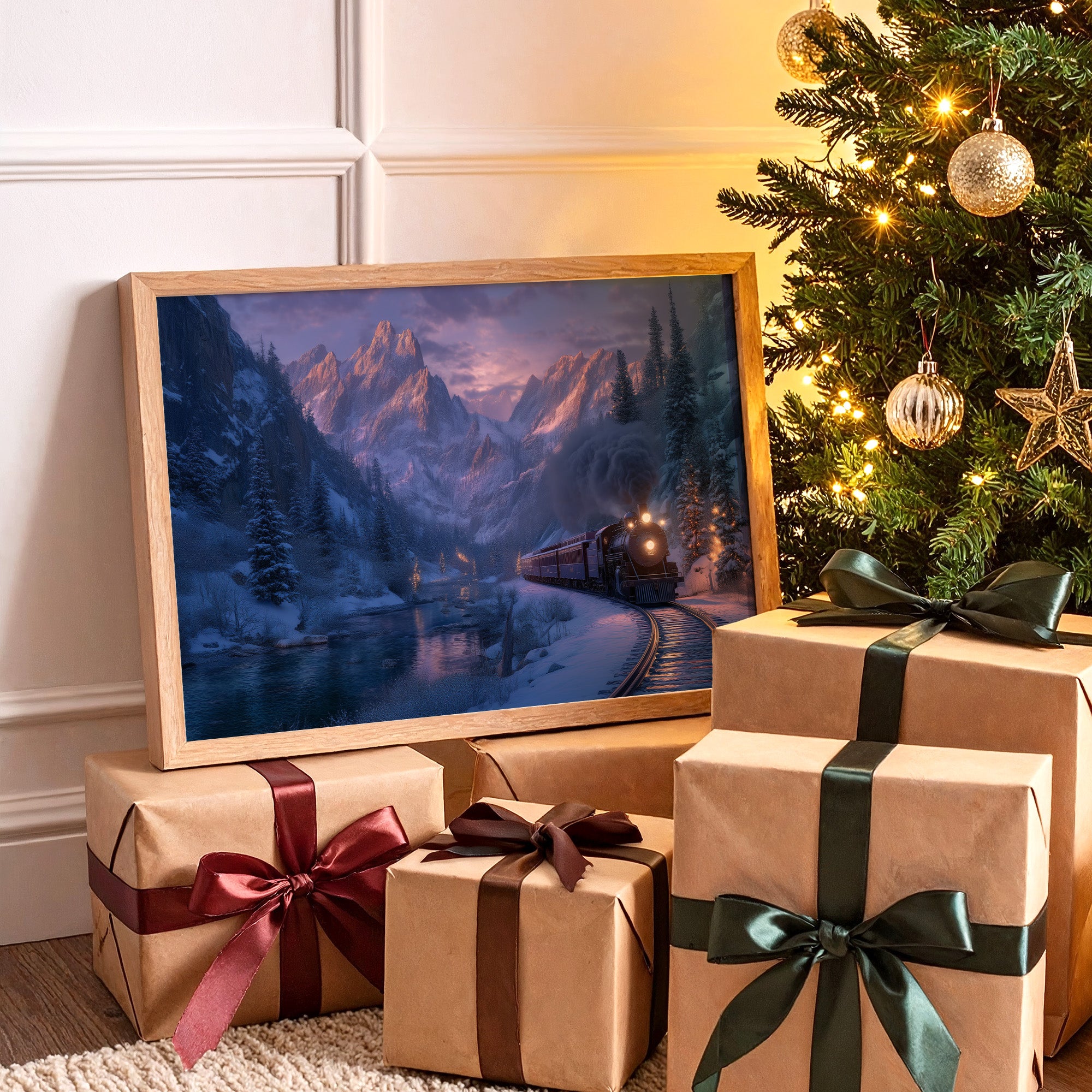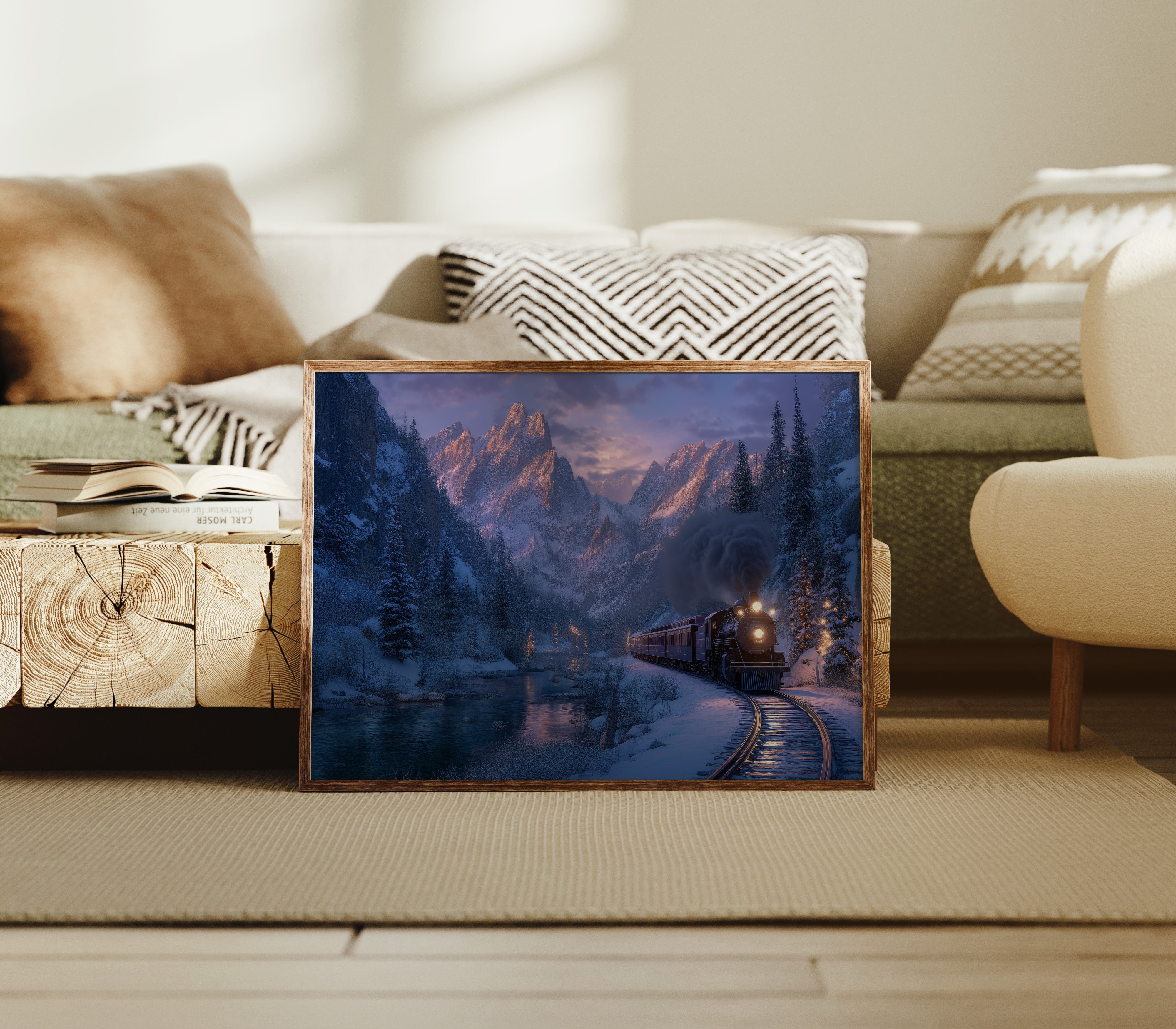 Steam rises against crystalline peaks as a locomotive winds through snow-draped wilderness. The scene captures that magical moment when dusk paints the mountainsides in rose-gold, while evergreens stand sentinel along the curved tracks. Through the misty valley, the train's warm lights pierce the blue hour, creating a symphony of cold and warmth, movement and stillness. This enchanted winter journey speaks to both adventure and homecoming, where mountain majesty meets human perseverance. Perfect for creating a dramatic focal point in a great room or adding a touch of wanderlust to a cozy den.