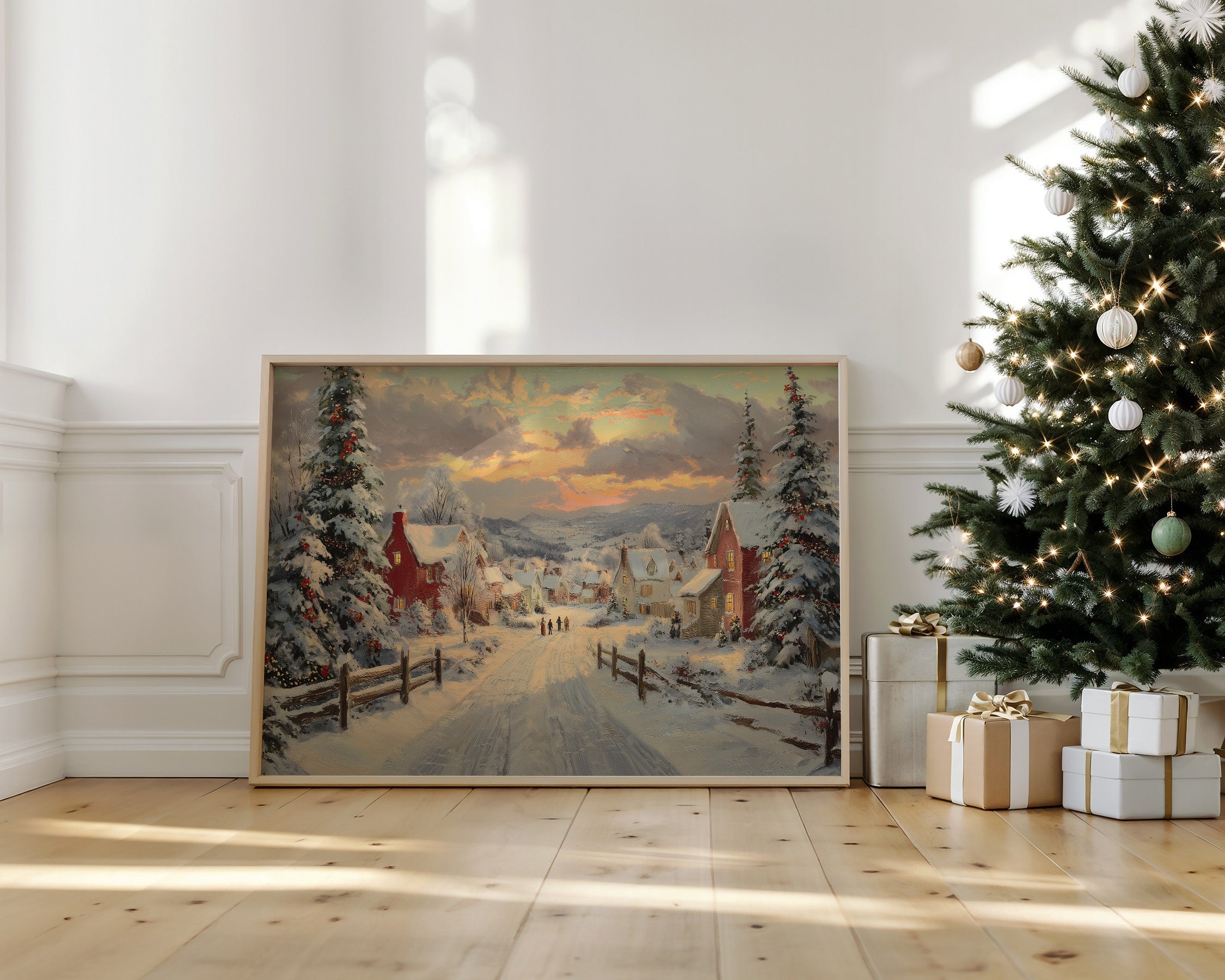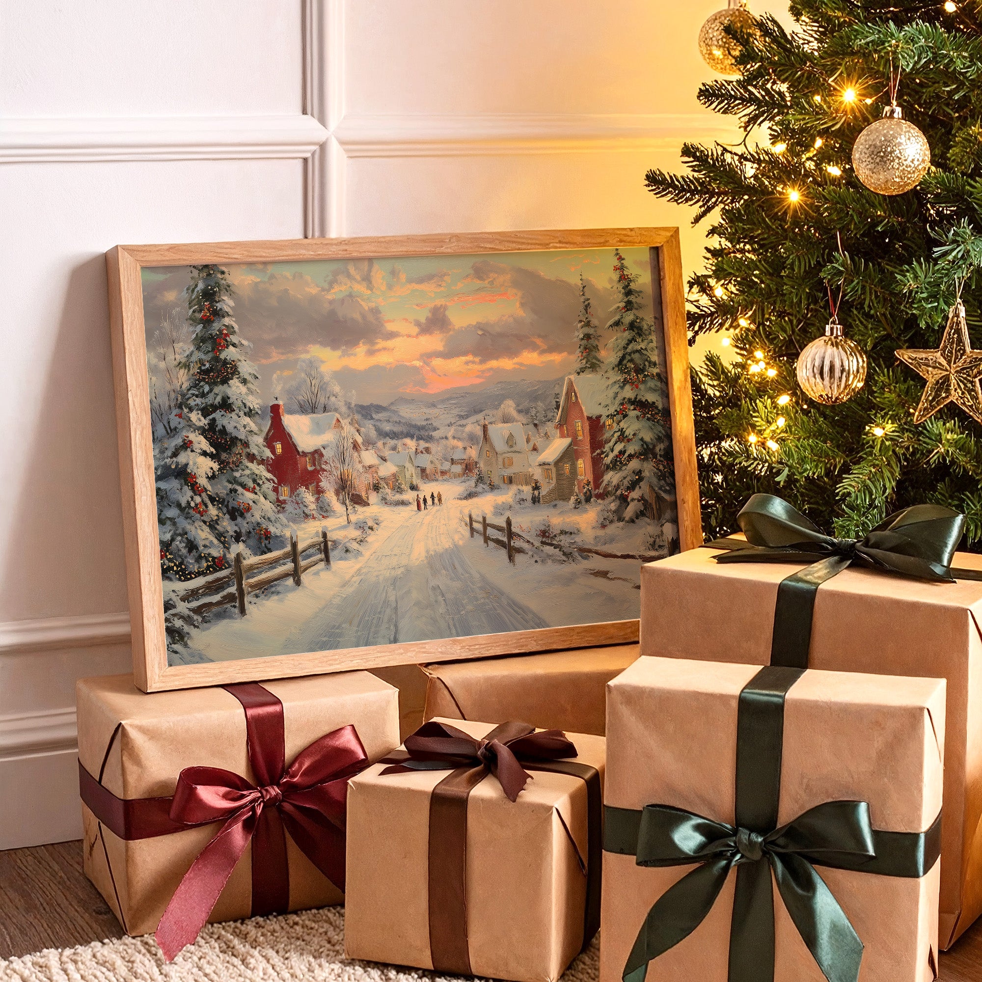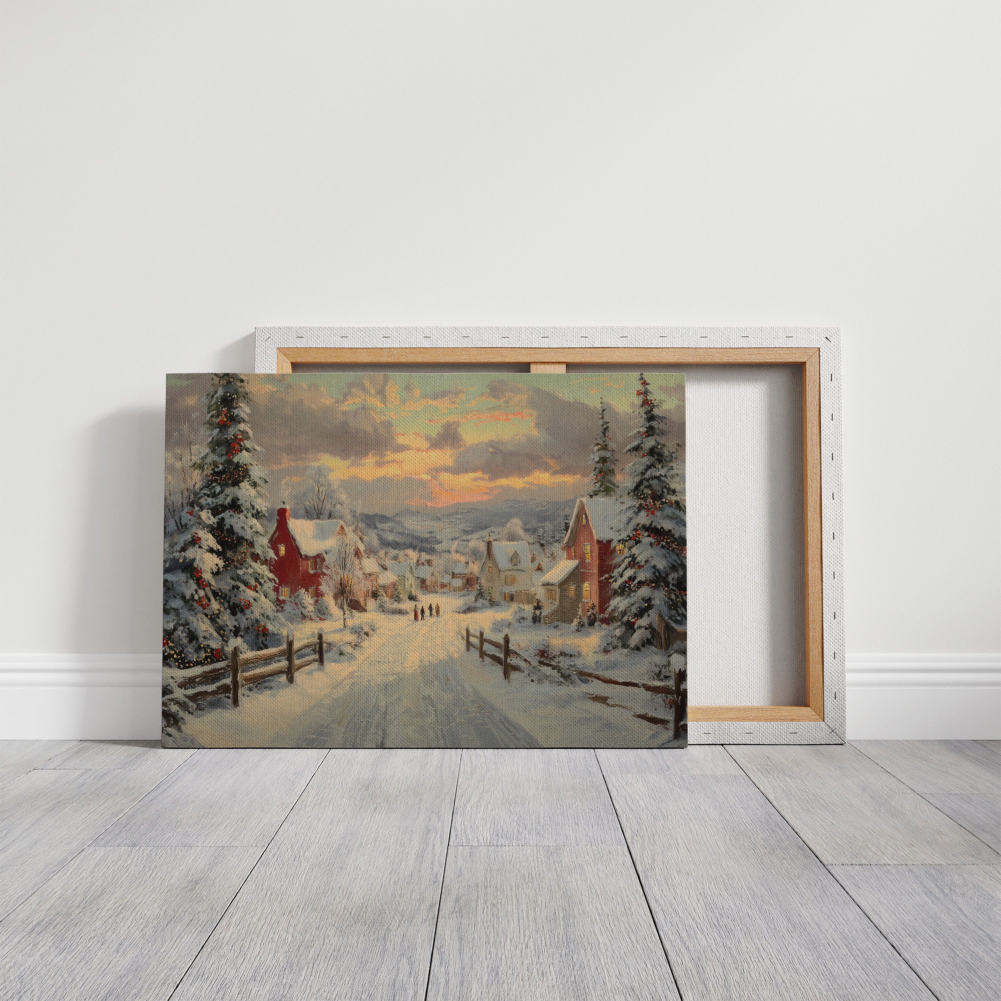 Snow-laden pines stand sentinel along a winding path through a quaint village, their branches heavy with fresh powder and twinkling lights. The scene captures that magical moment when day surrenders to evening, painting the sky in gentle brushstrokes of amber and rose above snow-covered rooftops. Red-brick houses dot the landscape, their windows warm with golden light, while distant figures make their way home through the peaceful winter scene. This nostalgic winter landscape brings the cozy charm of a traditional holiday evening to any space. Perfect for creating a focal point in living rooms or adding seasonal warmth to entryways, this piece invites viewers to step into a world where time moves a little slower and winter evenings feel like magic.