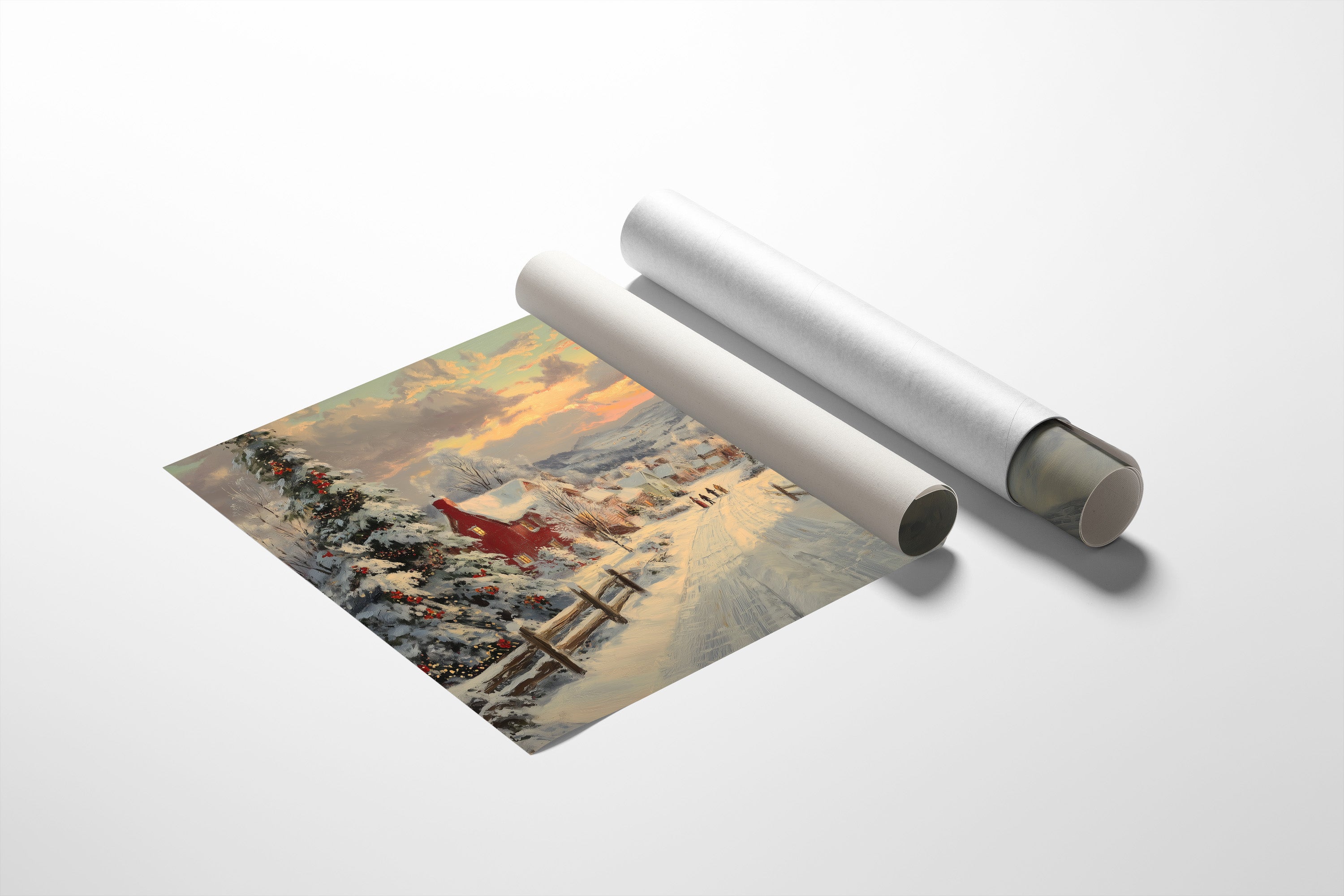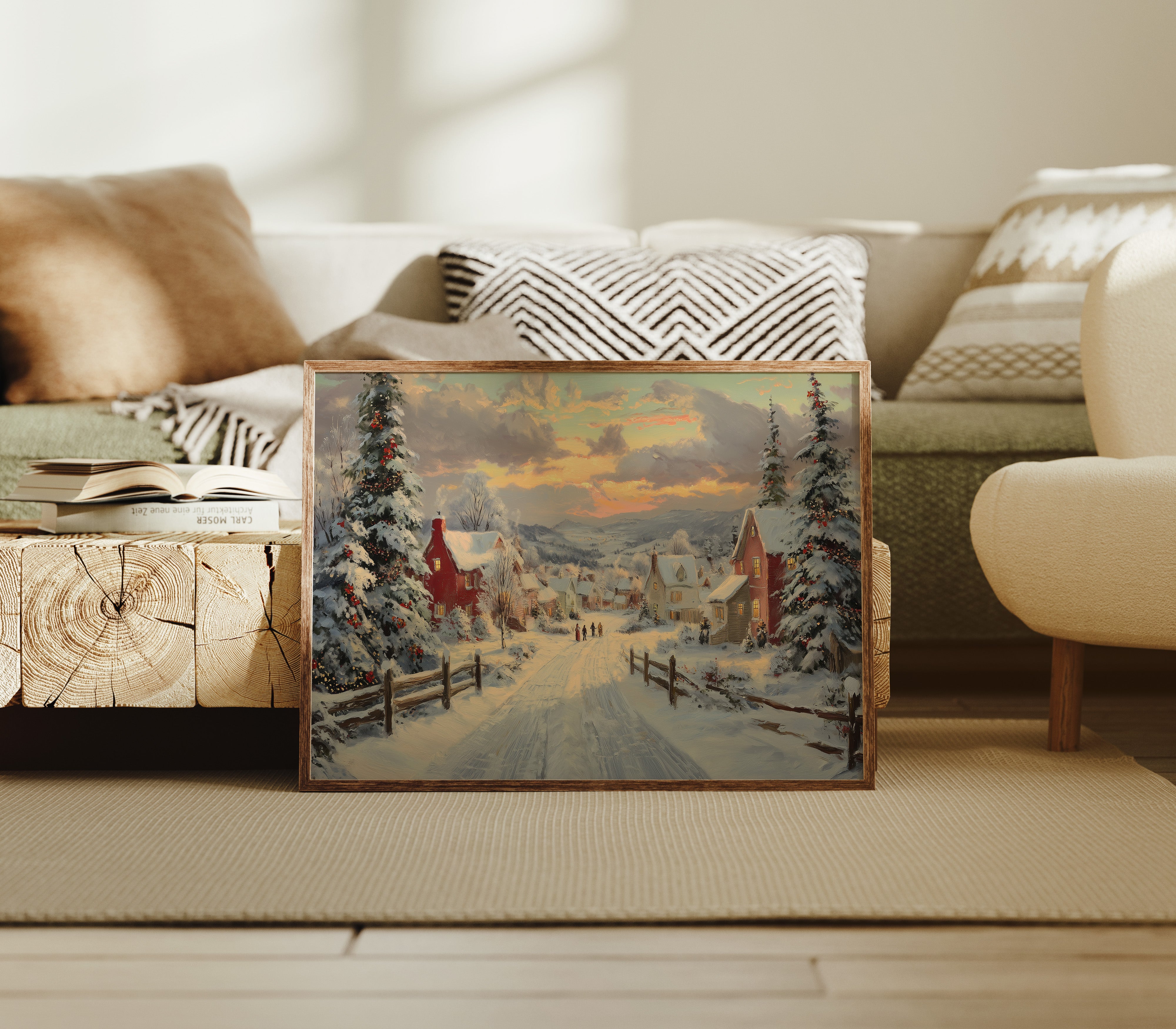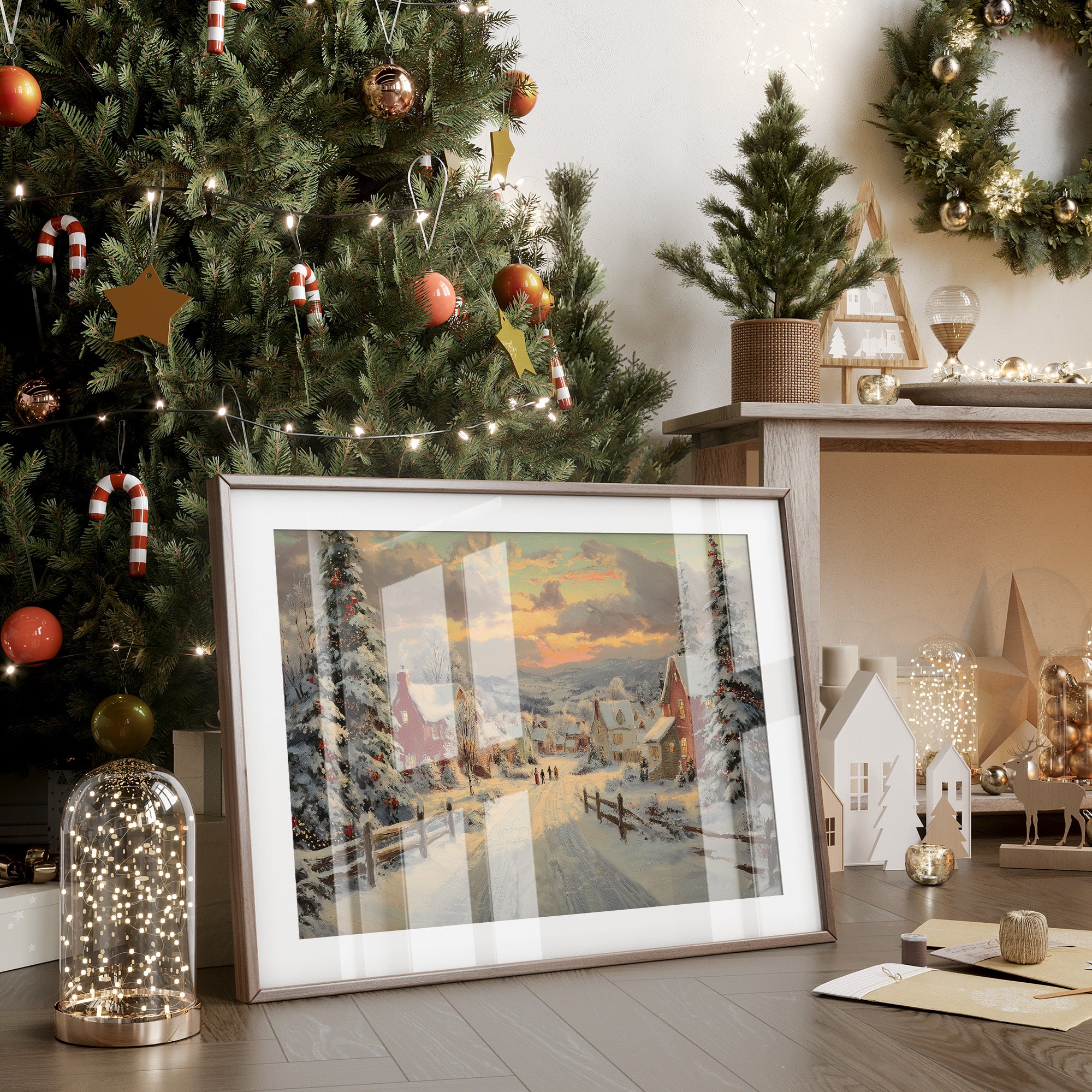 Snow-laden pines stand sentinel along a winding path through a quaint village, their branches heavy with fresh powder and twinkling lights. The scene captures that magical moment when day surrenders to evening, painting the sky in gentle brushstrokes of amber and rose above snow-covered rooftops. Red-brick houses dot the landscape, their windows warm with golden light, while distant figures make their way home through the peaceful winter scene. This nostalgic winter landscape brings the cozy charm of a traditional holiday evening to any space. Perfect for creating a focal point in living rooms or adding seasonal warmth to entryways, this piece invites viewers to step into a world where time moves a little slower and winter evenings feel like magic.