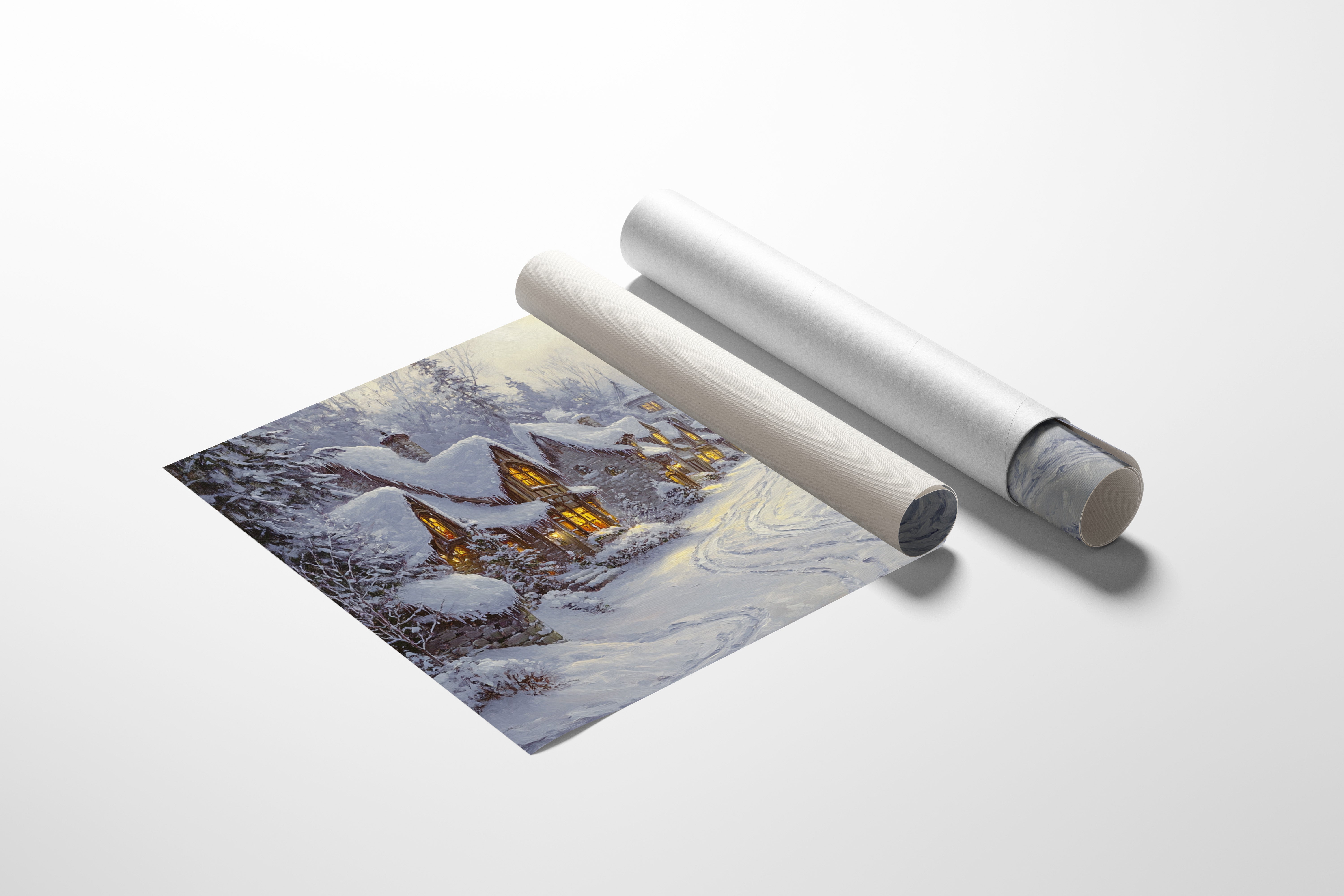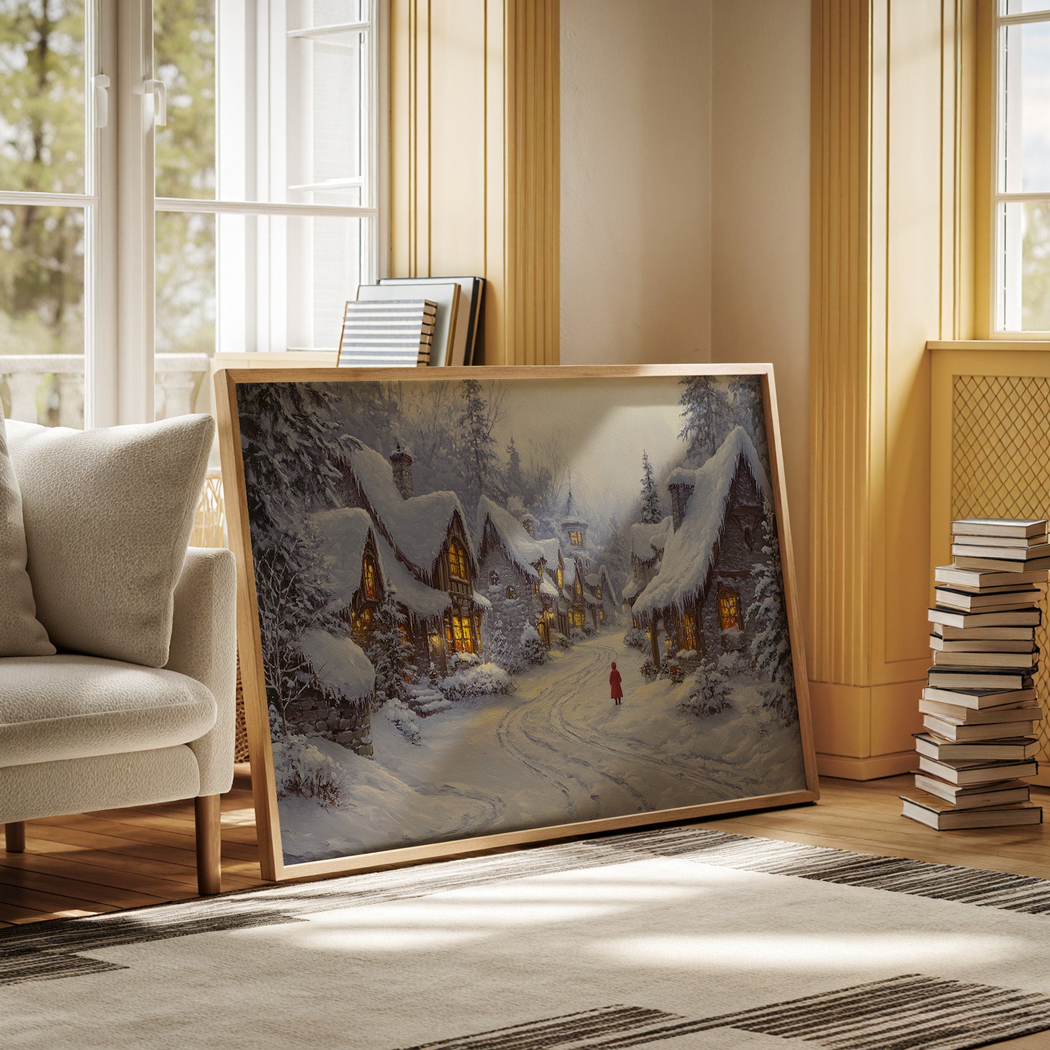 A lone figure in crimson pauses along a snow-laden path, surrounded by the warm glow of cottage windows piercing through the winter twilight. Stone cottages line the winding road, their steep roofs heavy with fresh snow and gleaming icicles. The scene captures a moment of pure winter magic, where golden light spills across untouched snow and evergreen boughs bend under their white burden. Each window tells its own tale of warmth and comfort, while the village church spire rises gracefully above the rooftops like a silent guardian of this peaceful hamlet. Perfect for creating a cozy focal point in living spaces or adding a touch of winter wonder to bedroom retreats.