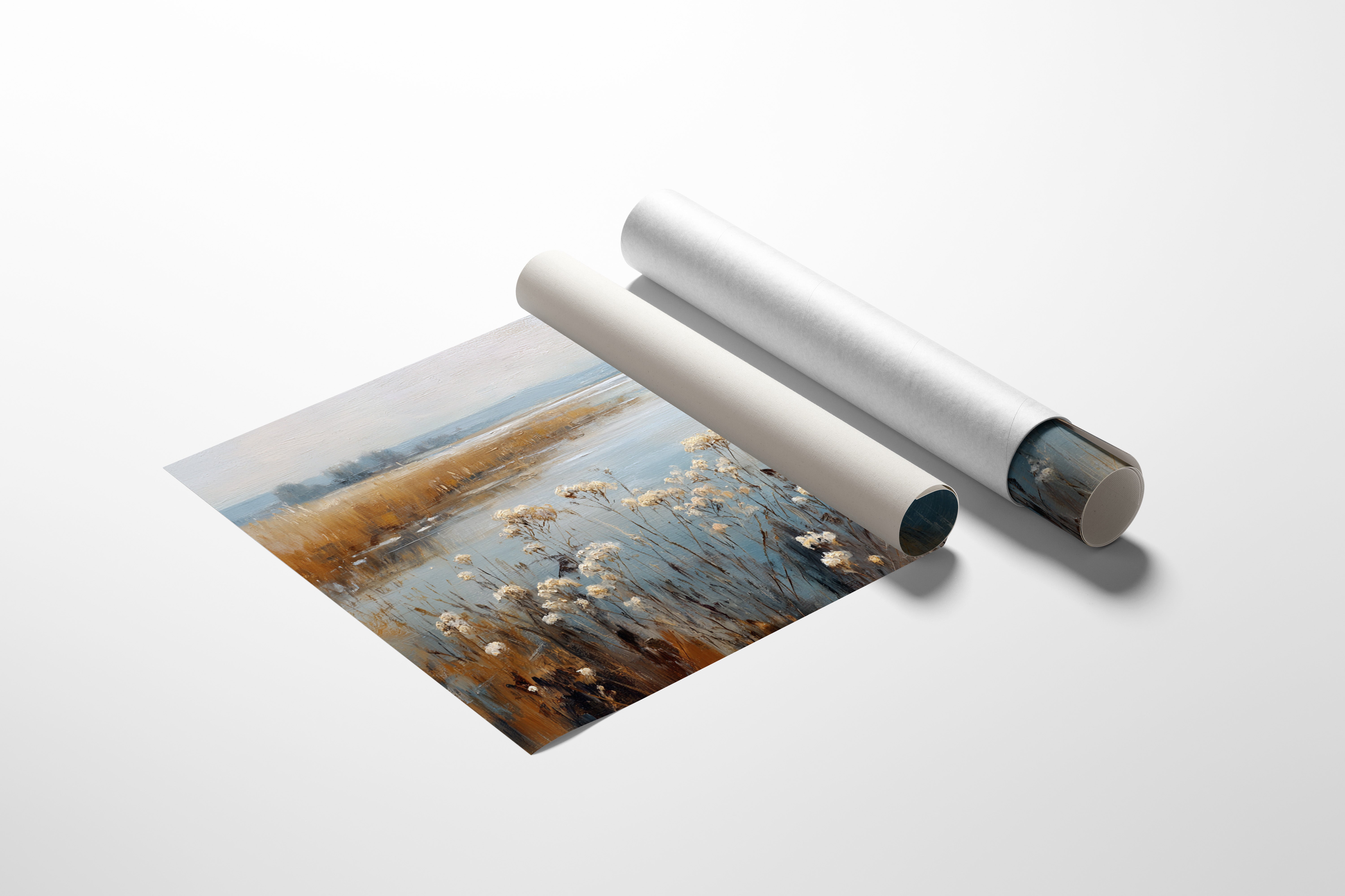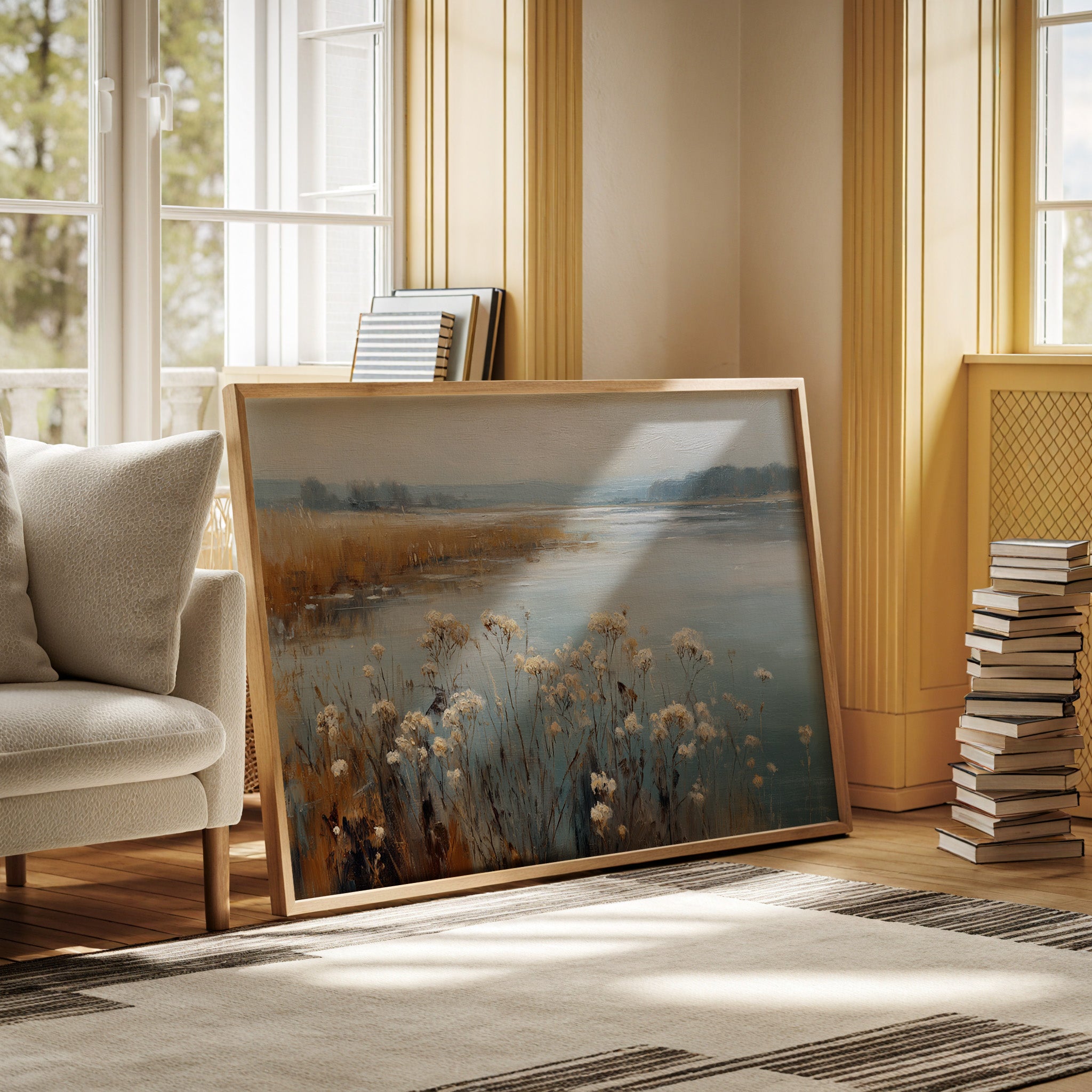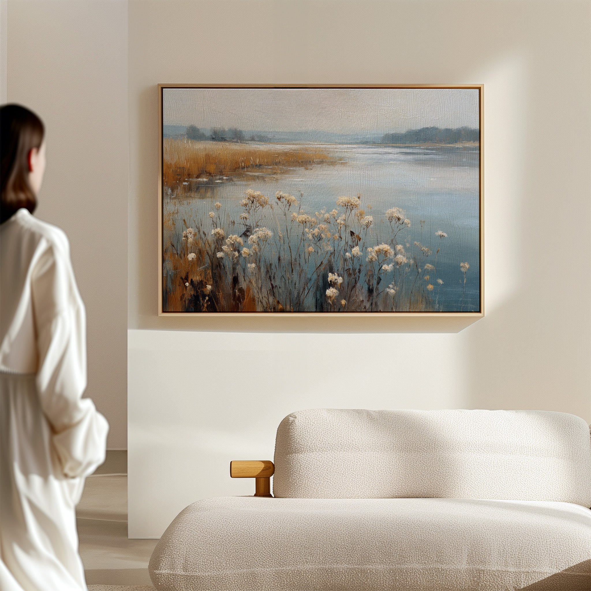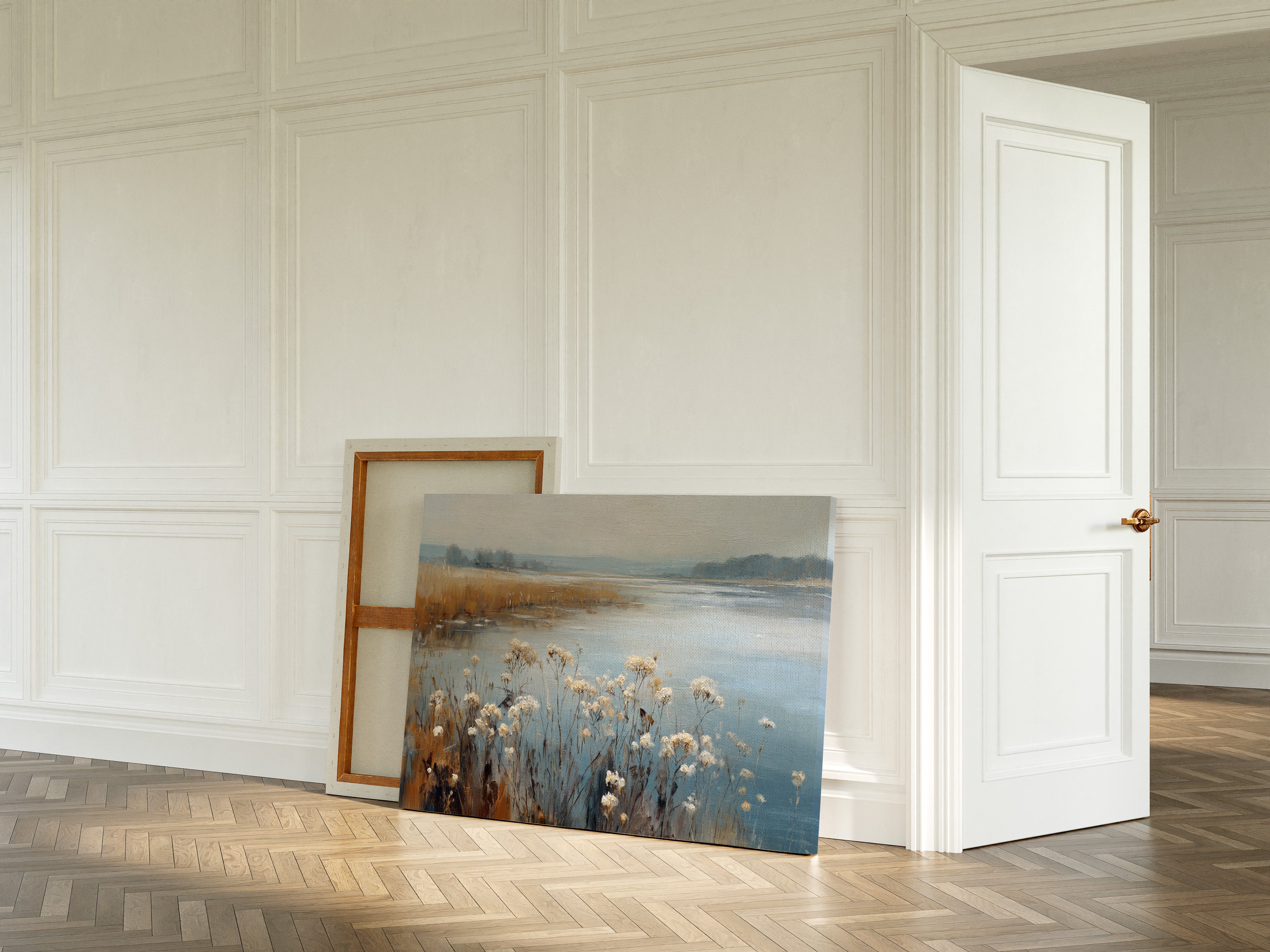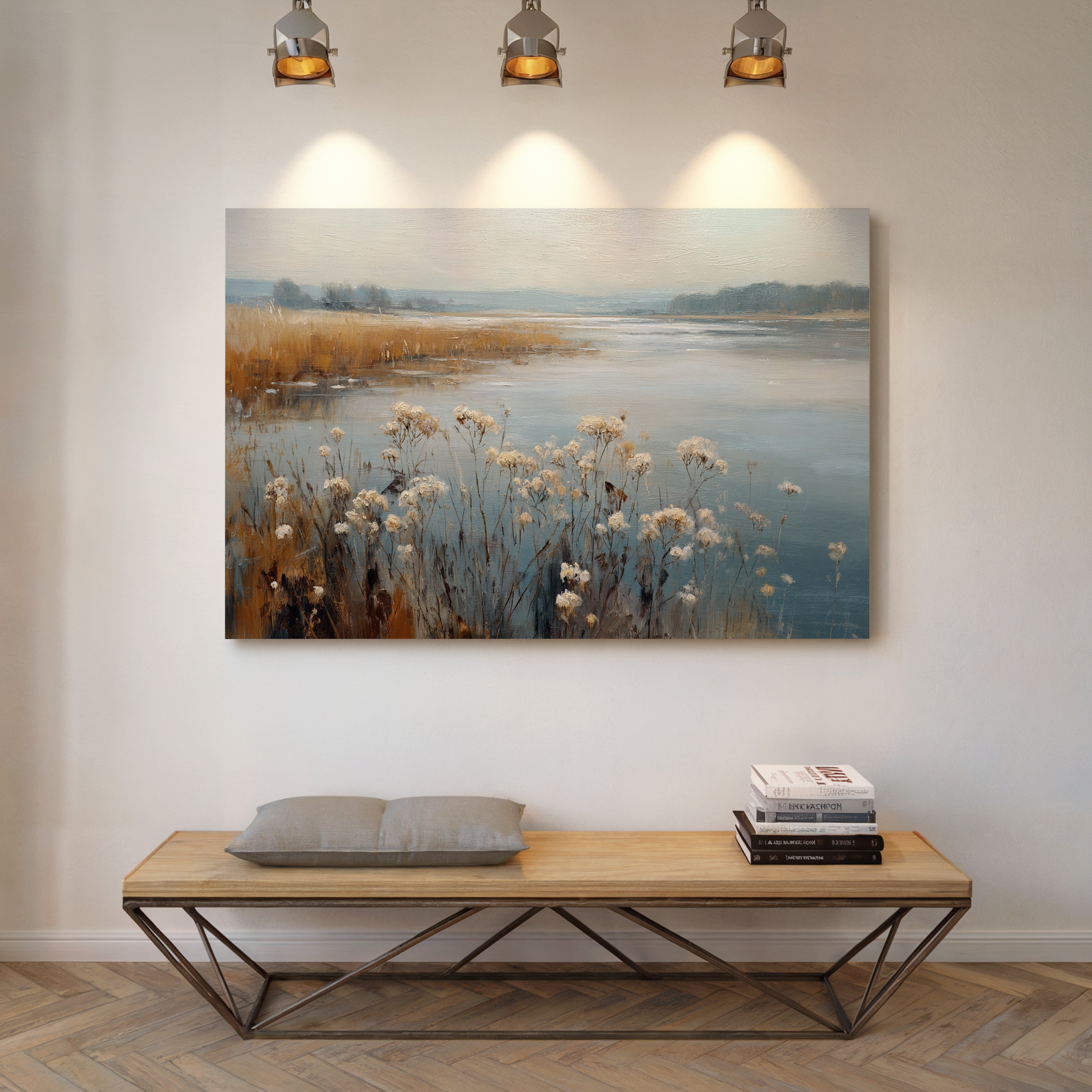 Delicate dried flowers stand sentinel along the shoreline, their ivory heads nodding in the winter stillness. The scene captures nature's quiet persistence, where golden grasses meet steel-blue waters under a pearl-grey sky. Weathered seedheads catch what little light filters through, creating a beautiful contrast against the lake's cool expanse and distant misty shores. This peaceful landscape would bring a sense of contemplative calm to a reading nook or create a serene focal point in a bedroom where natural elements are celebrated.