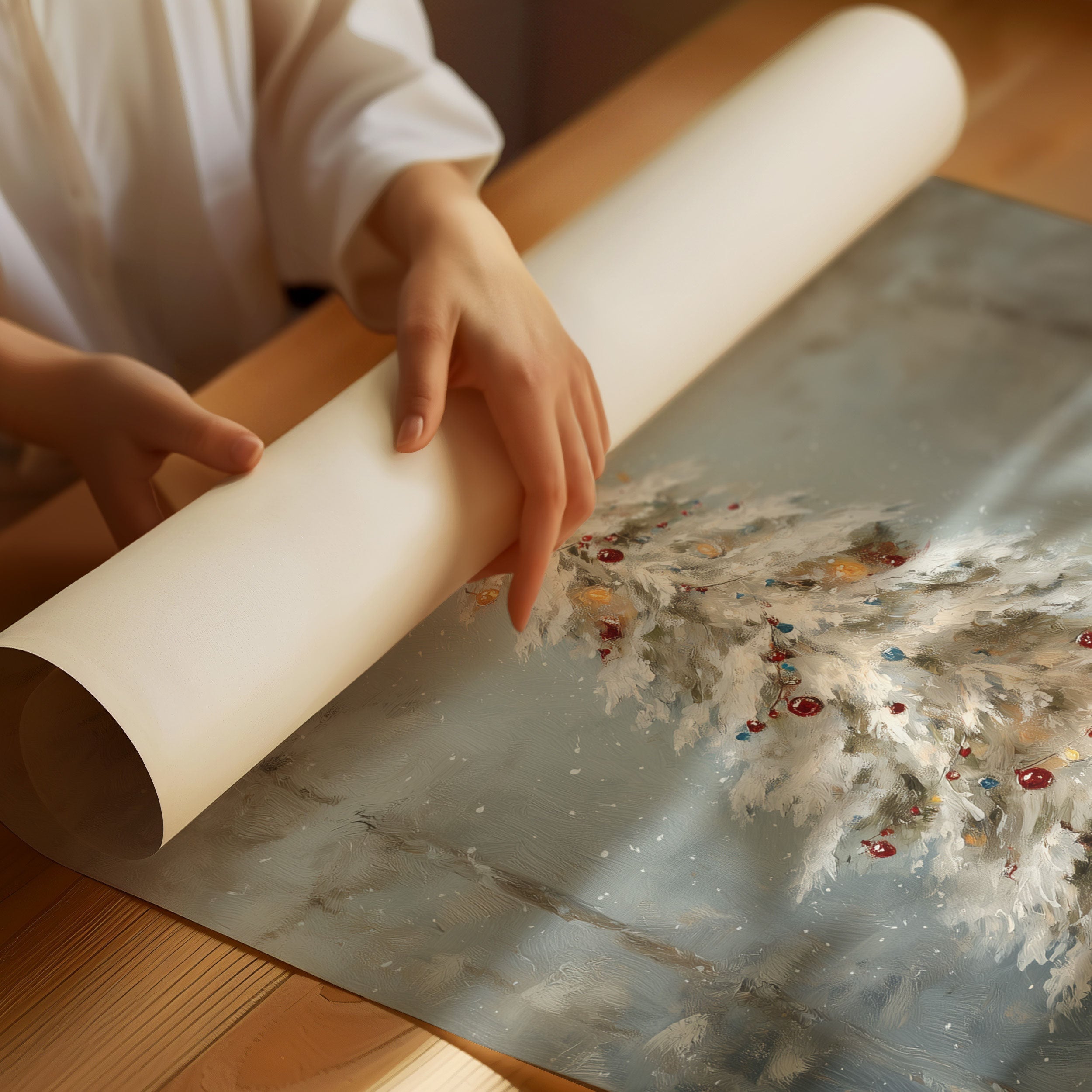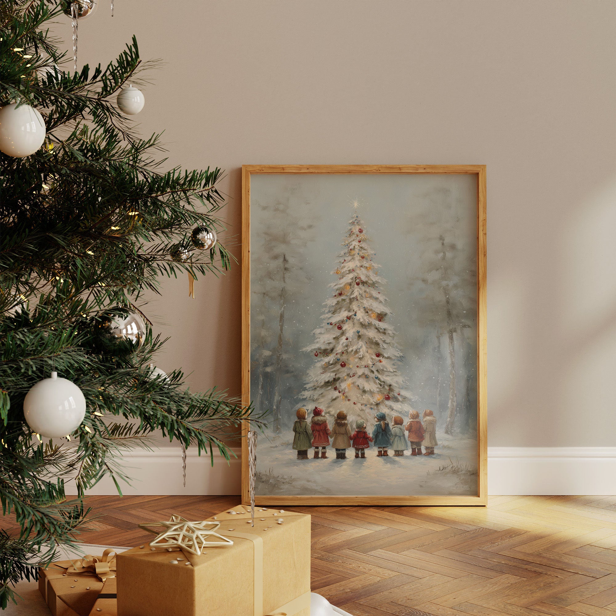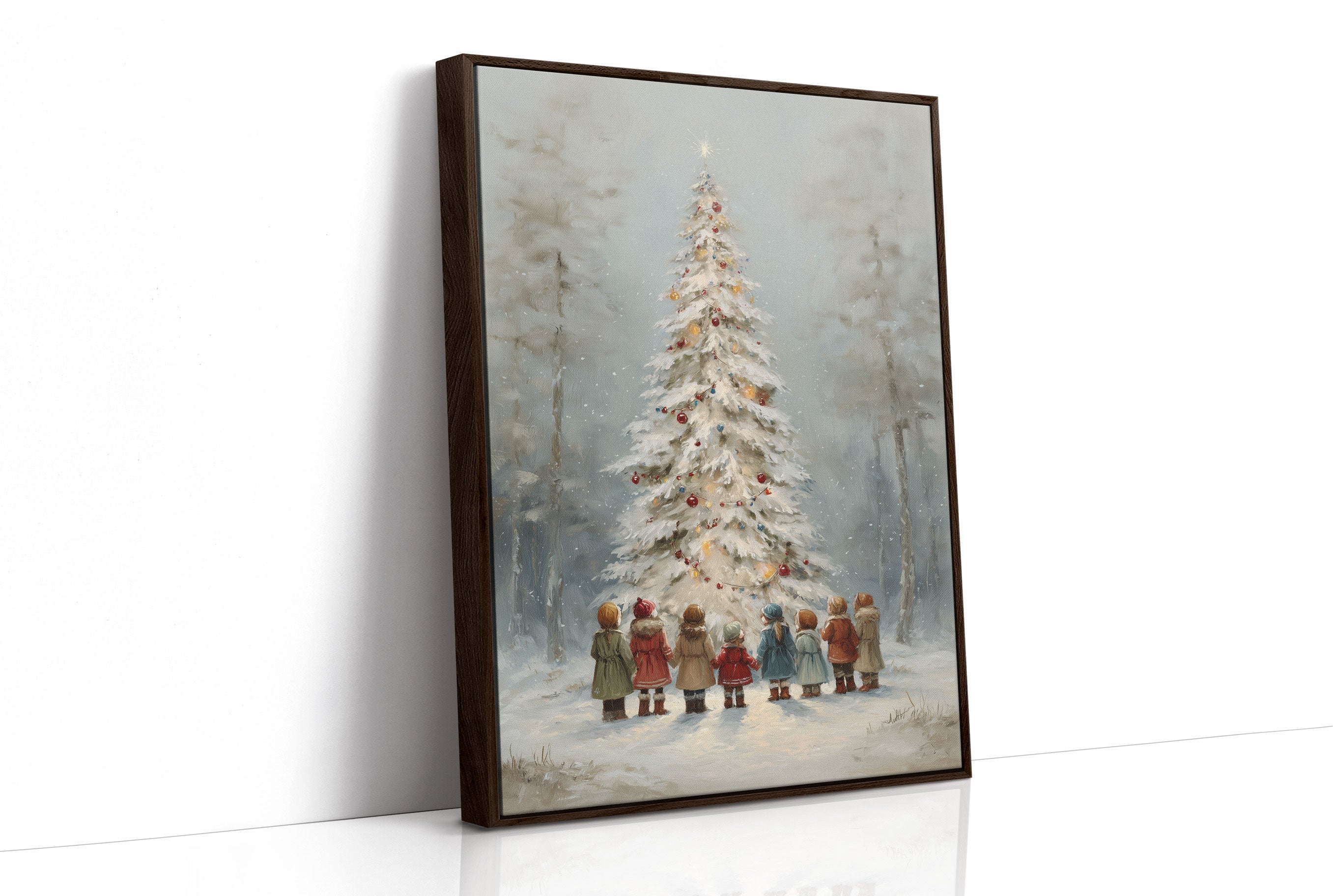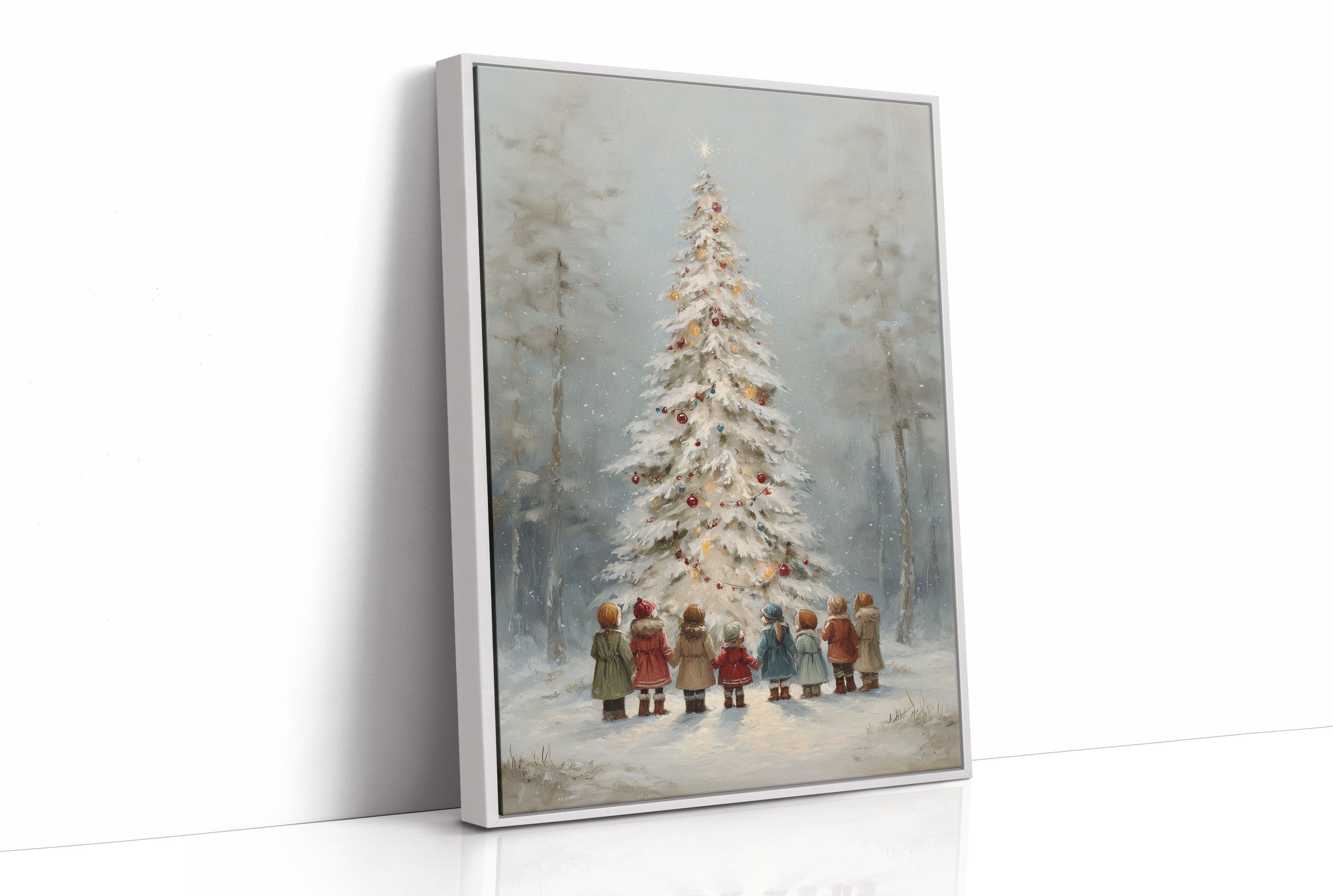 Soft snowflakes dance around eight little figures standing in awe before a towering white Christmas tree, their colorful coats dotting the misty winter scene like ornaments themselves. The painting captures a moment of pure childhood magic, where the forest transforms into an enchanted realm of possibility and wonder. Muted blues and grays create a dreamy backdrop while touches of red, brown, and gold add warmth to the nostalgic scene. This heartwarming piece brings classic holiday charm to living rooms, entryways, or children's spaces, inviting viewers to reconnect with their own cherished Christmas memories.