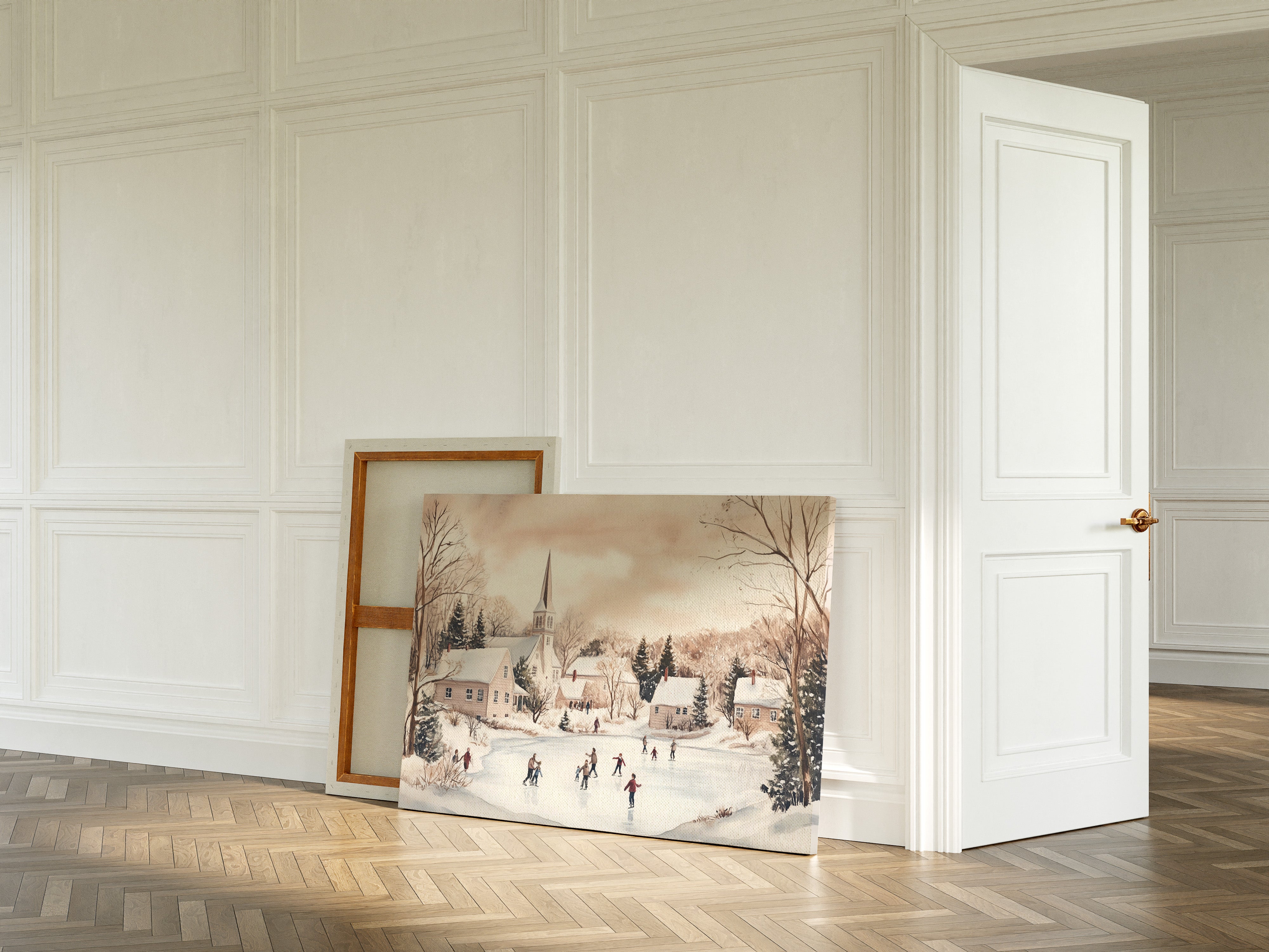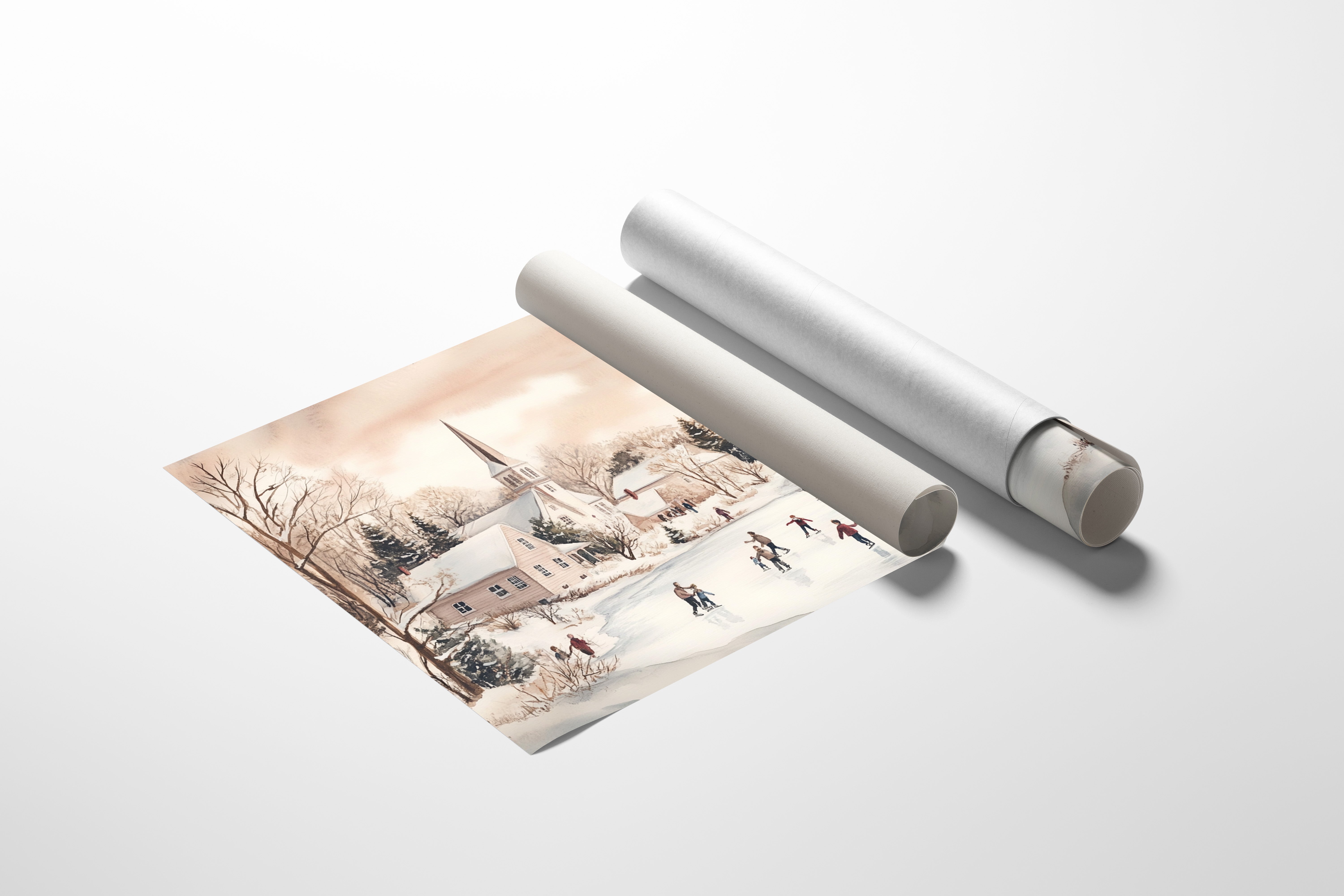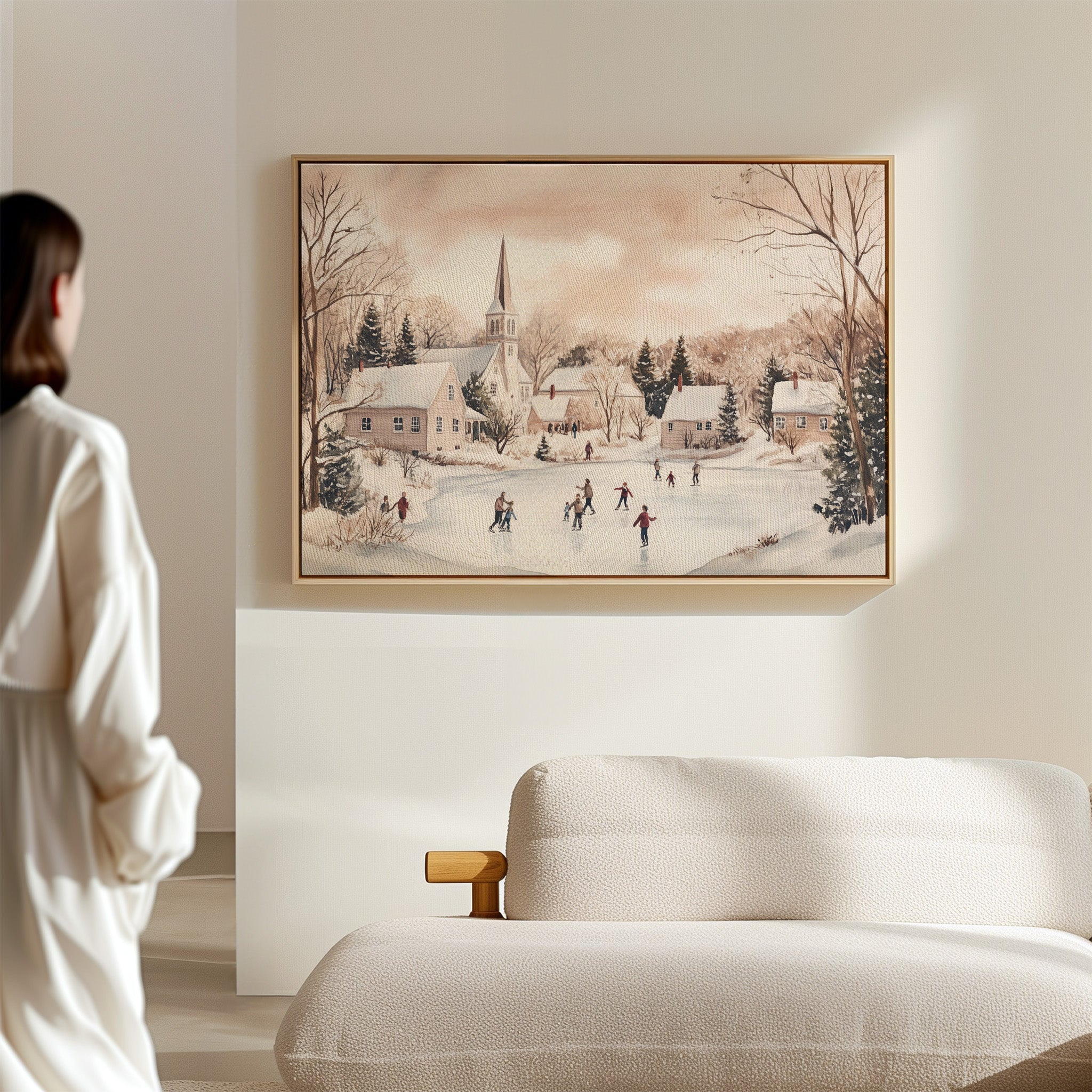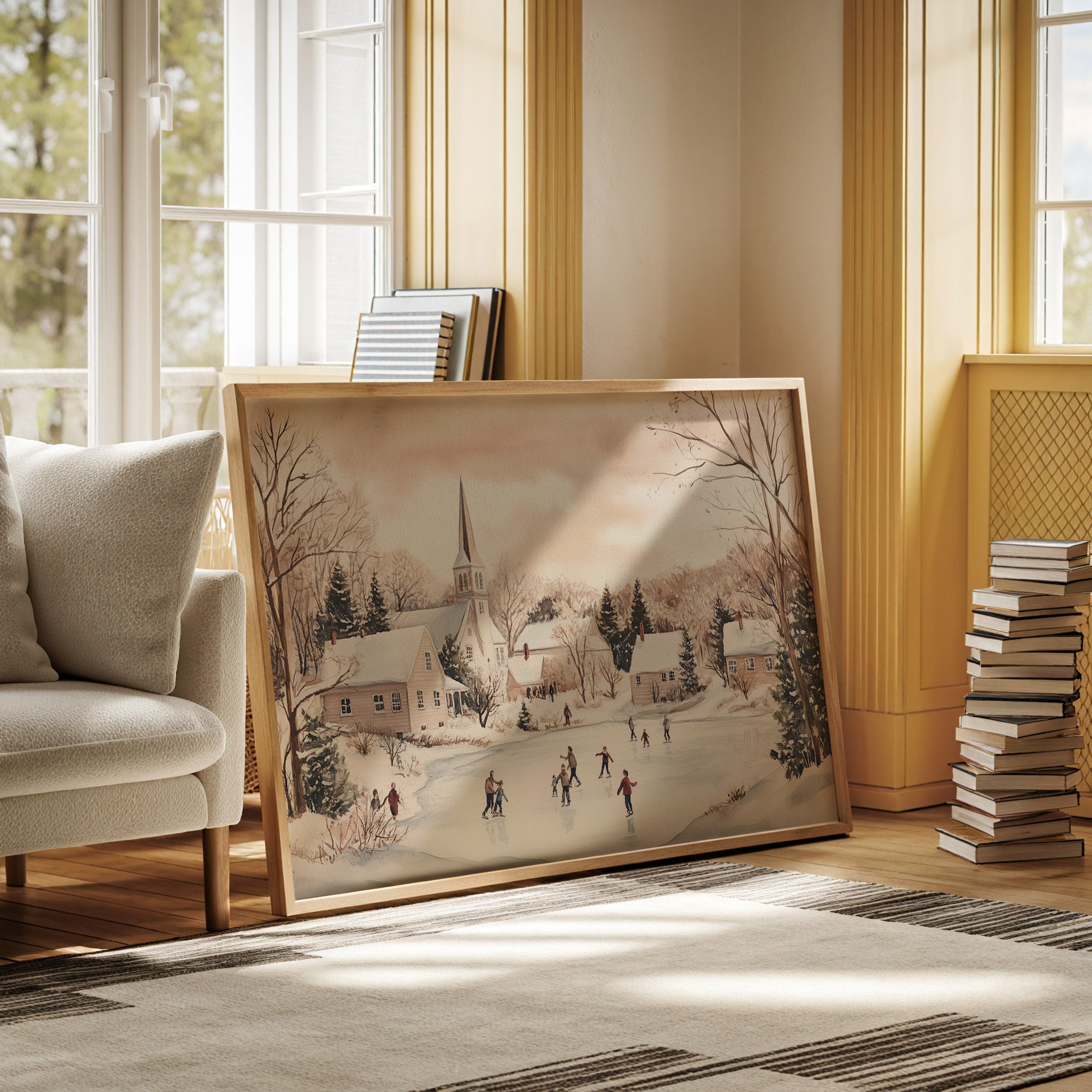 Crystalline afternoon light bathes a scene where joy takes physical form on a frozen pond. The white church spire pierces a rose-tinted winter sky, standing sentinel over a gathering of skaters gliding across nature's mirror. Snow-draped cottages nestle among bare trees and evergreens, their windows warm with welcome against the crisp air. The scene captures that magical moment when a community comes together in winter's embrace, creating memories on ice that will warm hearts long after the thaw. This nostalgic piece would bring timeless charm to a living room or family gathering space, inviting conversations about winters past and simple pleasures.