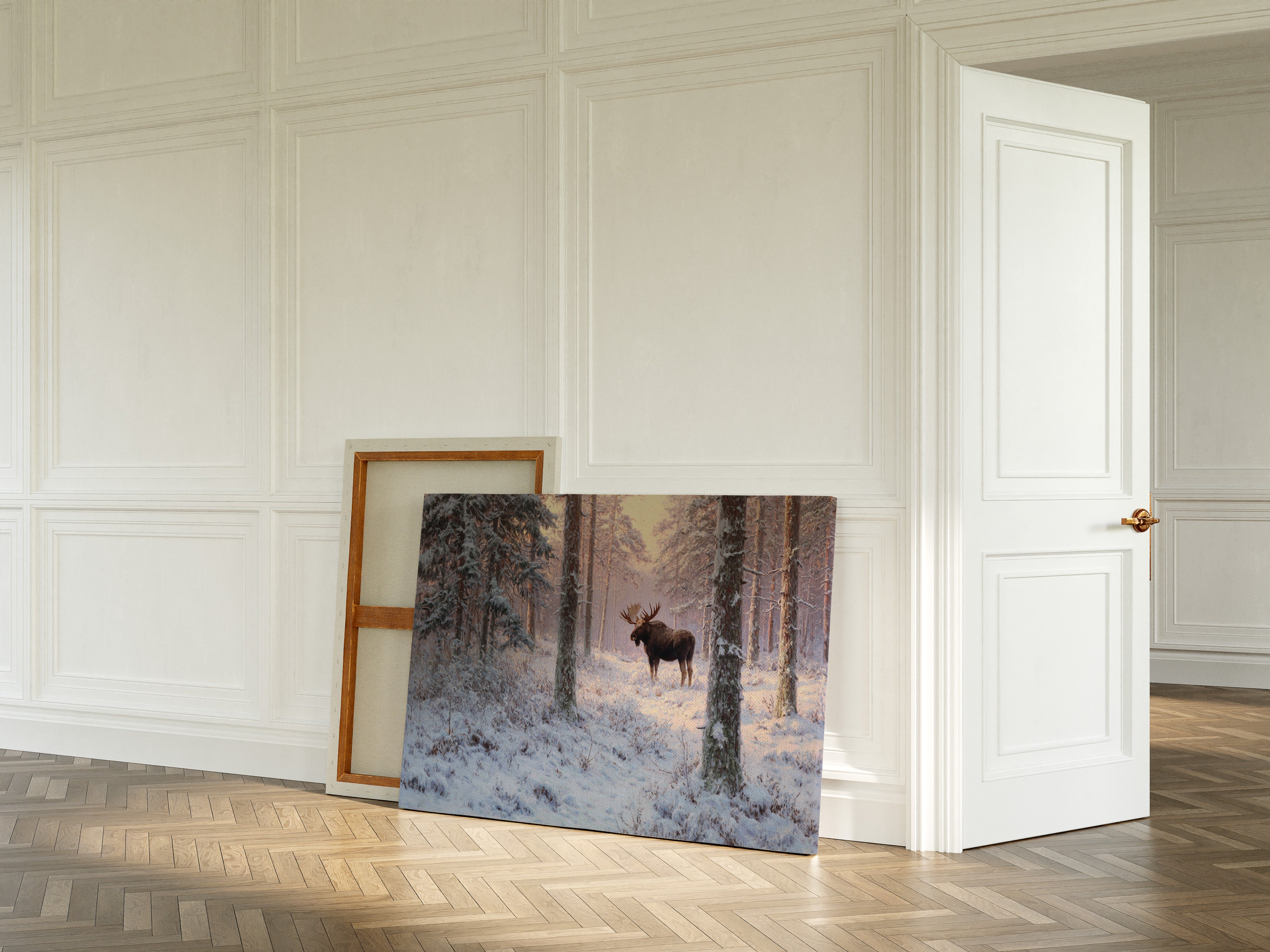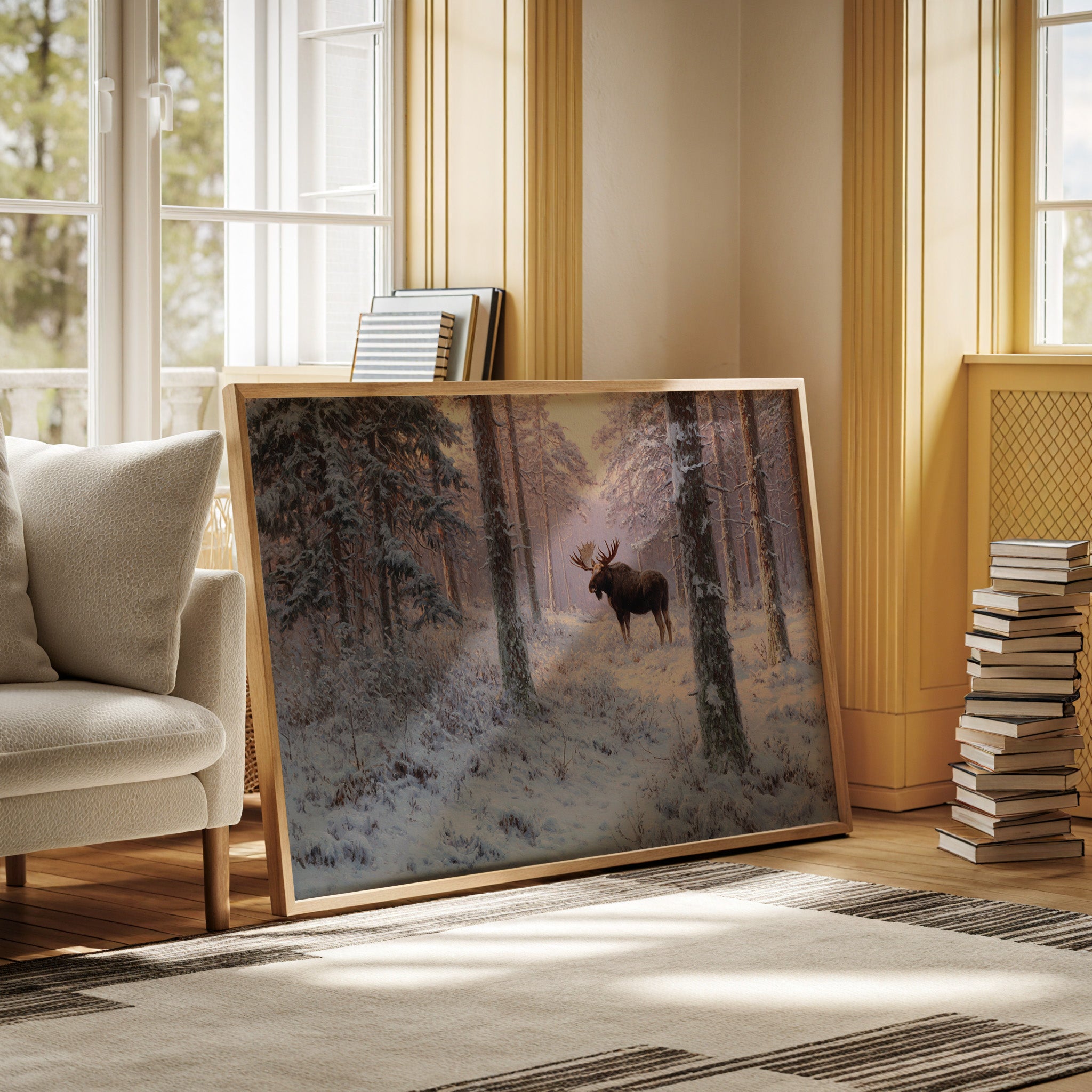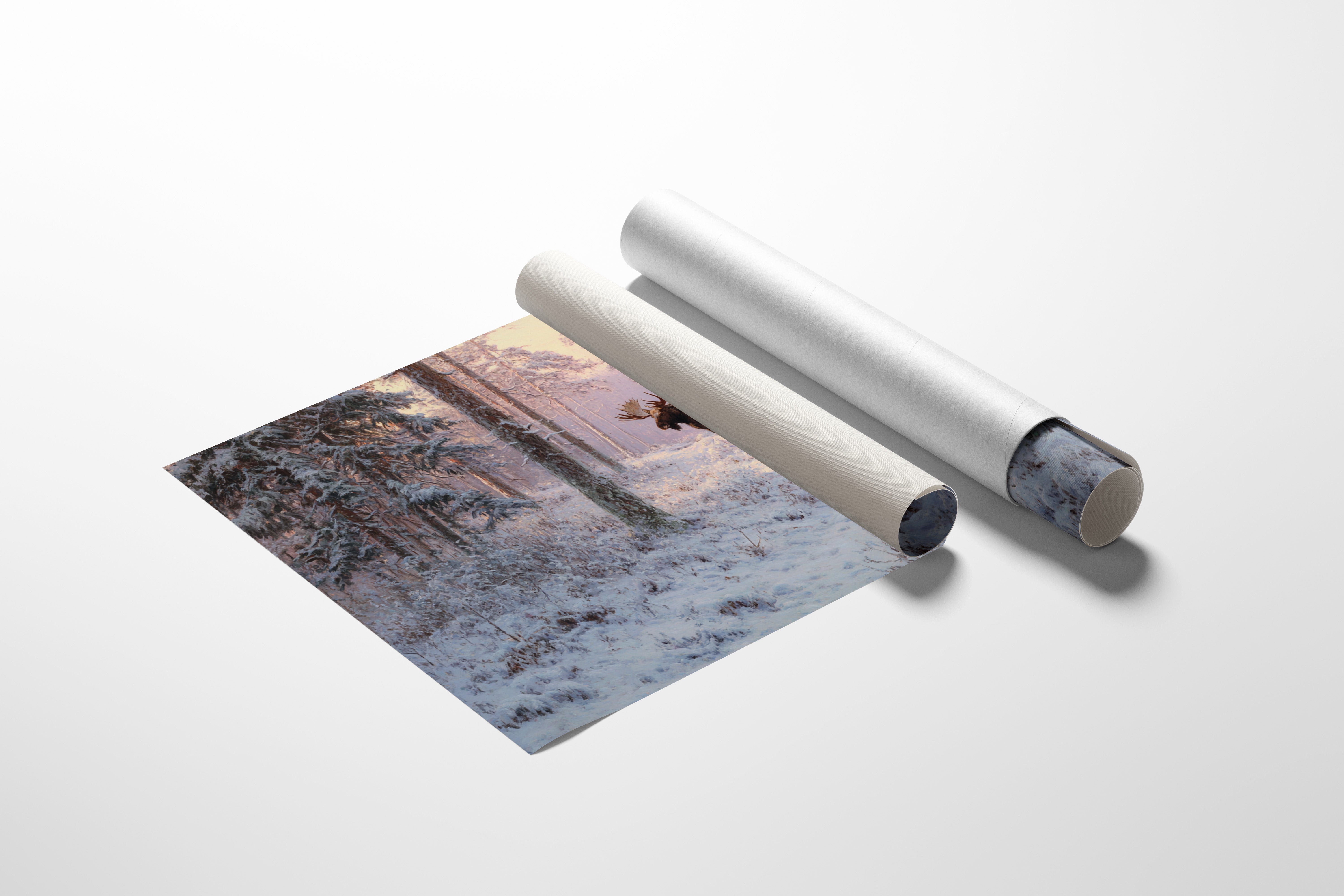 Dawn breaks through the snow-laden forest, casting a rose-gold glow across a pristine winter landscape. A majestic moose stands sentinel among towering pines, his breath visible in the crisp morning air. The scene captures nature's quiet grandeur - snow-covered branches reaching skyward while delicate frost crystals blanket the forest floor in endless white. Rich amber light filters through the trees, creating long shadows that dance across untouched snow. This piece brings the serene power of winter wilderness into your space, perfect for a grand living room or mountain retreat where it can serve as a window into nature's most peaceful moments.