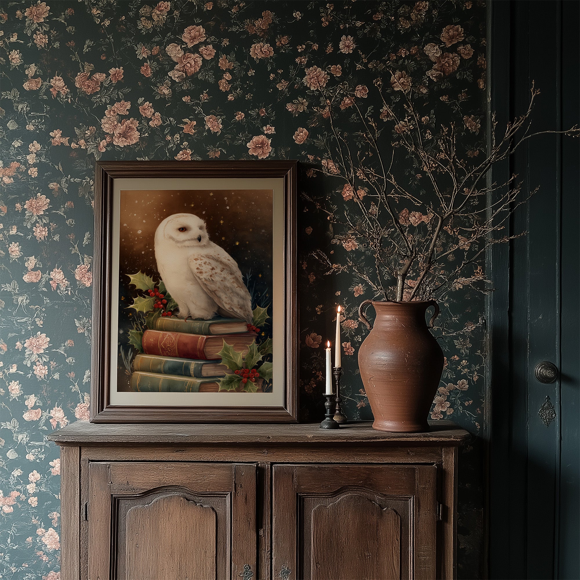 A snowy owl perches regally atop a stack of vintage books, its amber eyes holding secrets of midnight wisdom. Holly berries and glossy leaves encircle this feathered philosopher, while golden dust motes dance in the warm atmosphere behind. The rich leather-bound volumes create a throne of knowledge beneath the owl's delicate feathers, suggesting a guardian of forgotten stories and winter tales.