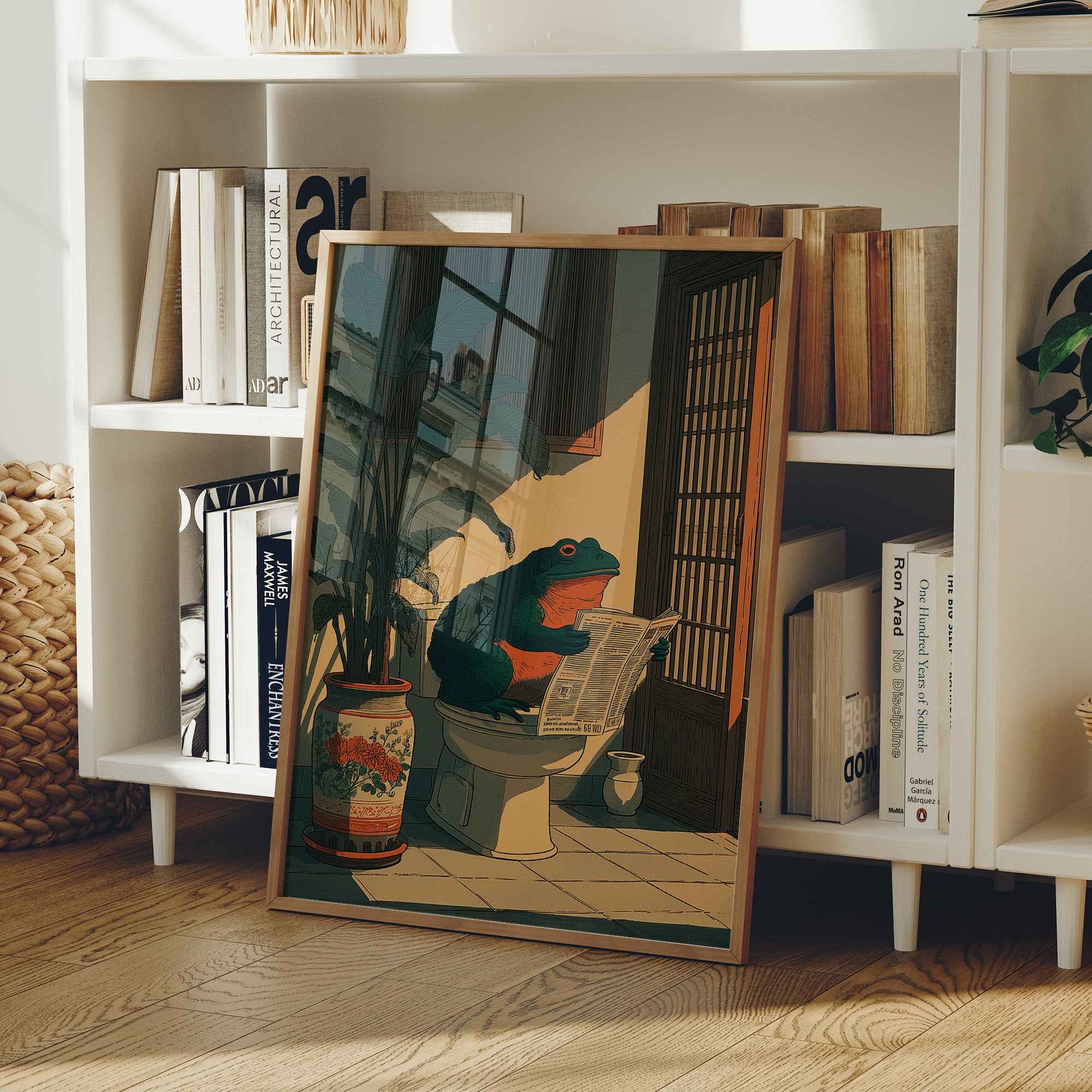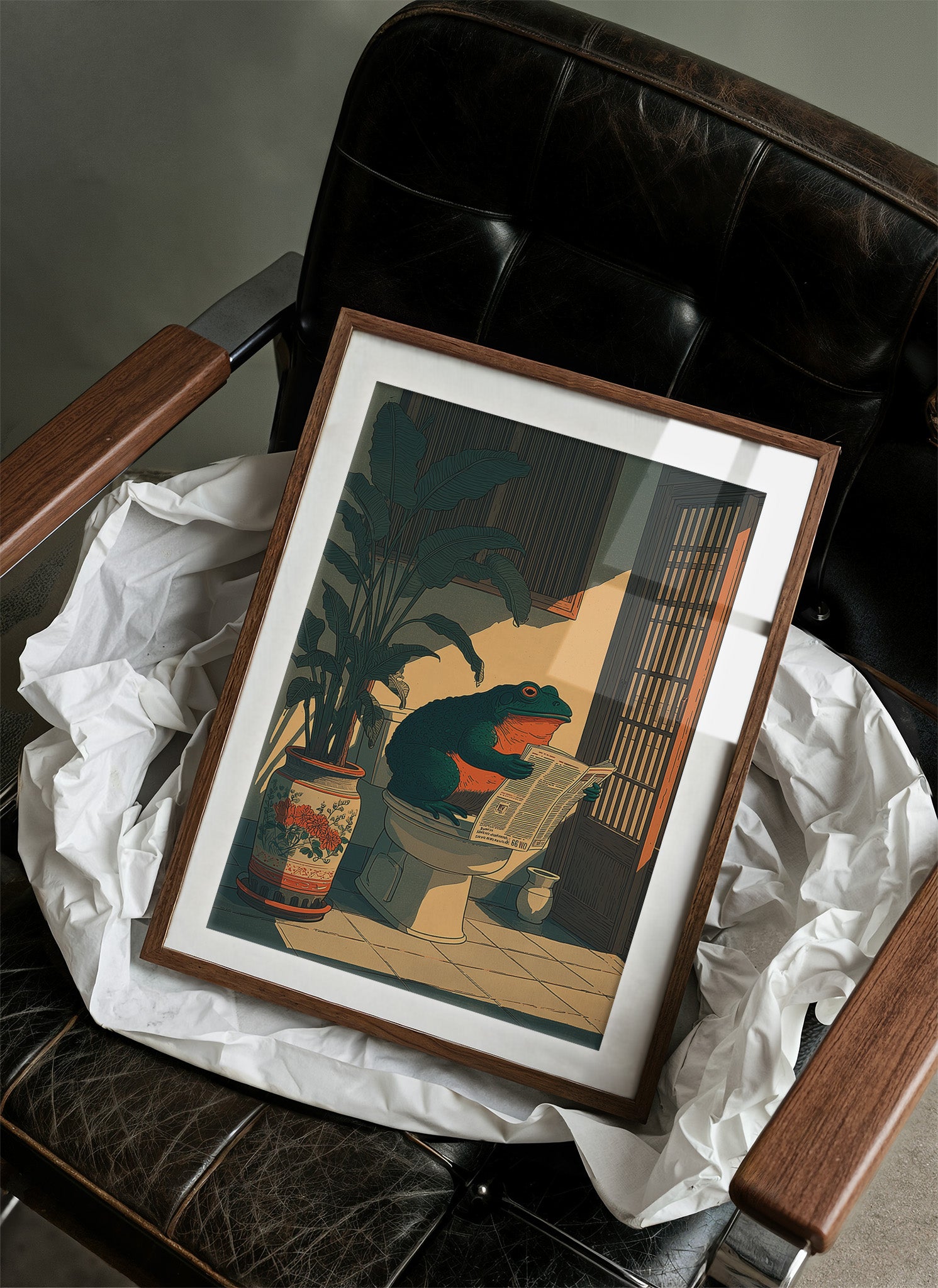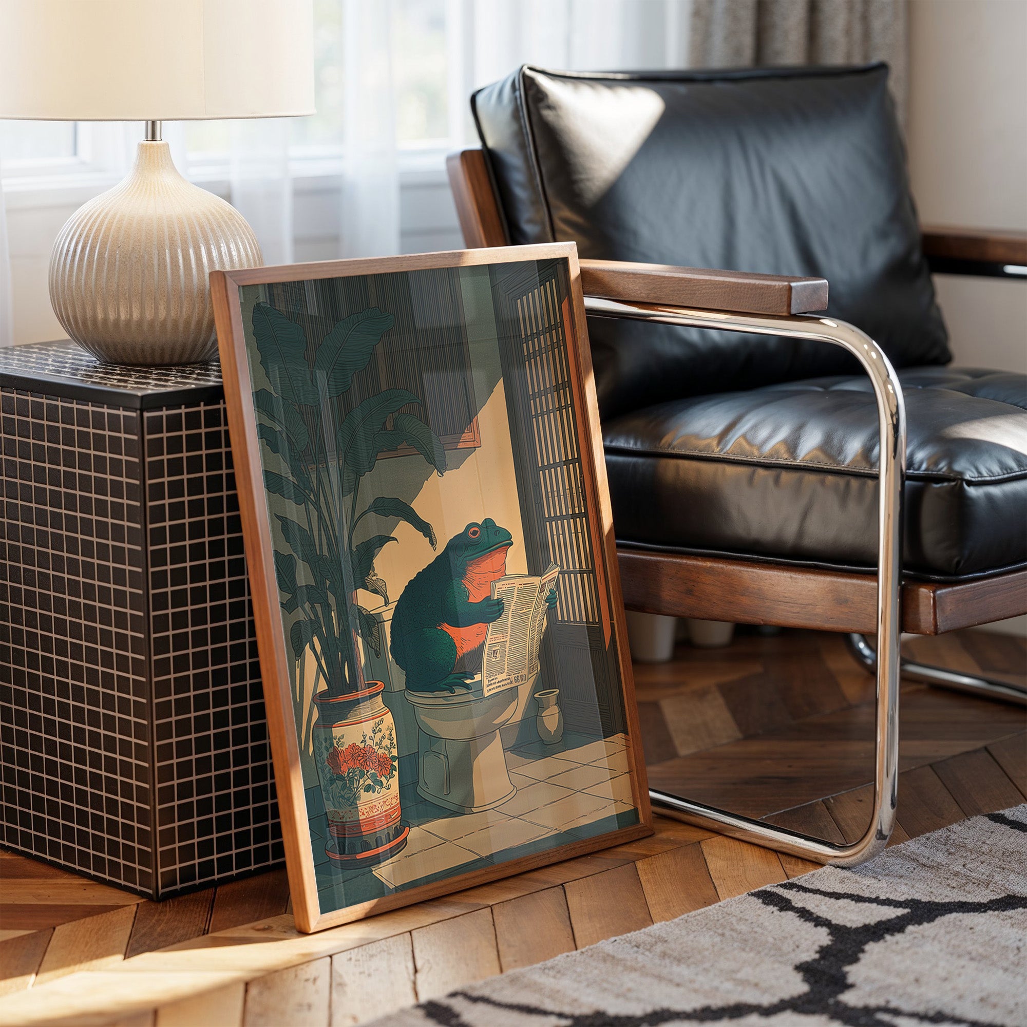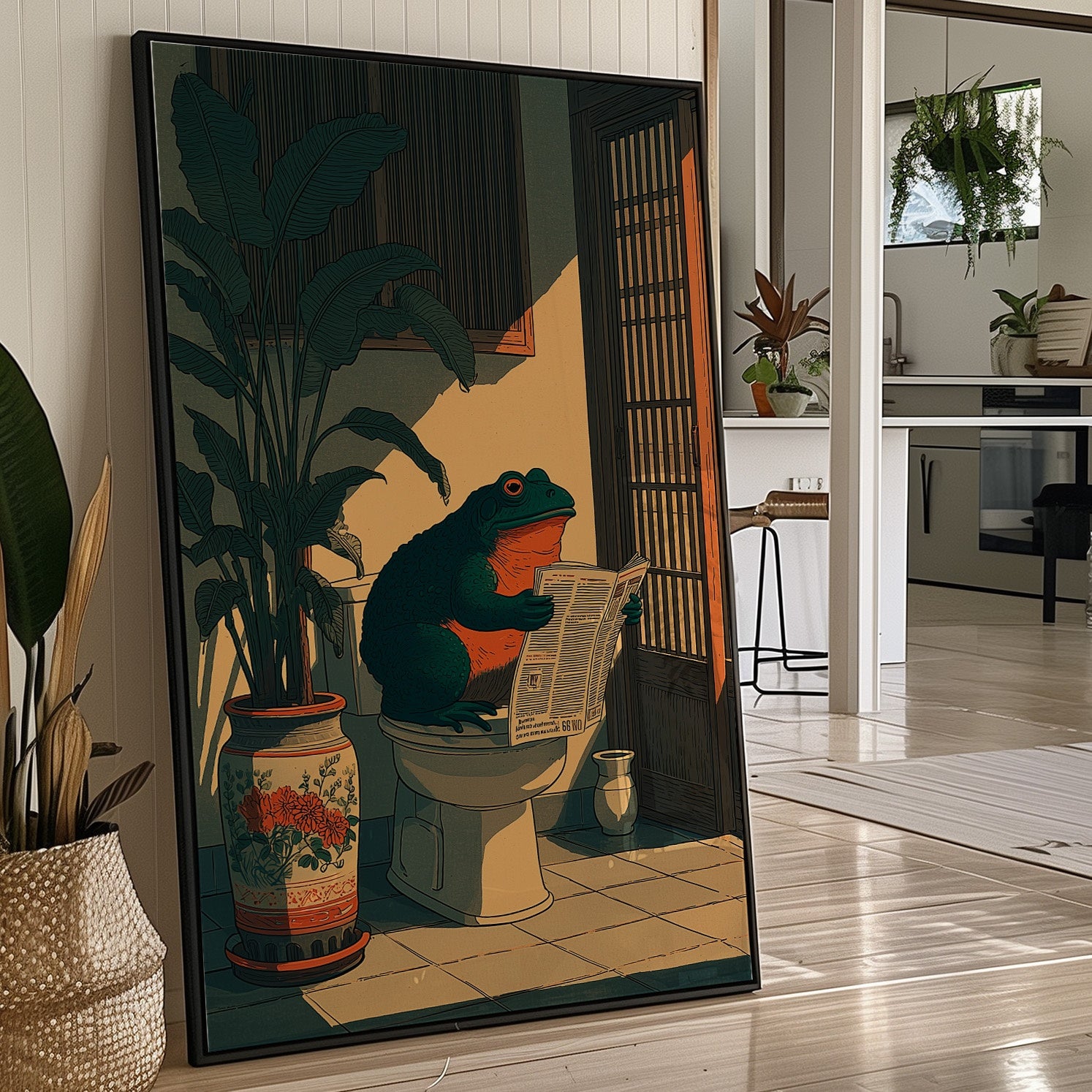 In the soft glow of morning light, a whimsical scene unfolds where a distinguished toad sits contentedly with his daily newspaper. The composition balances urban sophistication with playful storytelling, rendered in rich teals and warm terracotta tones. Traditional Japanese architectural elements frame this contemplative moment, while potted flowers and geometric shadows create a serene domestic atmosphere. This piece would bring a touch of literary charm and sophisticated whimsy to a reading nook, home office, or creative workspace.