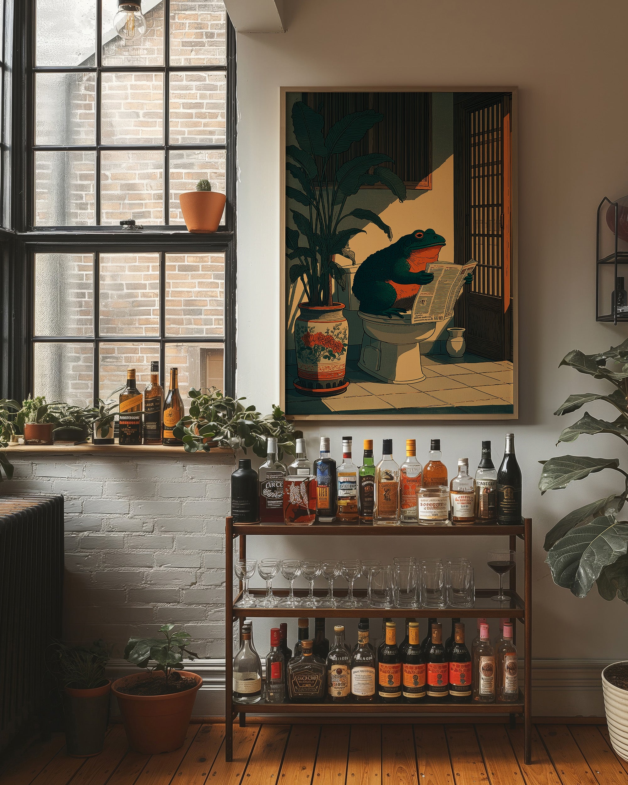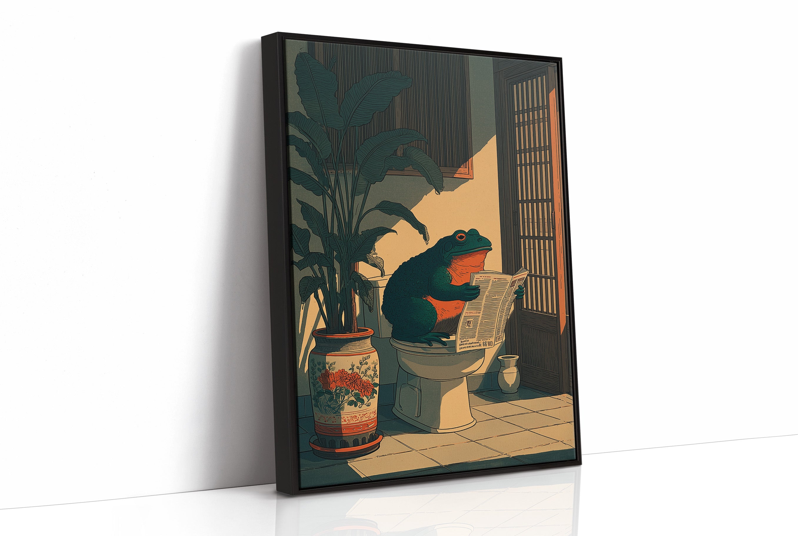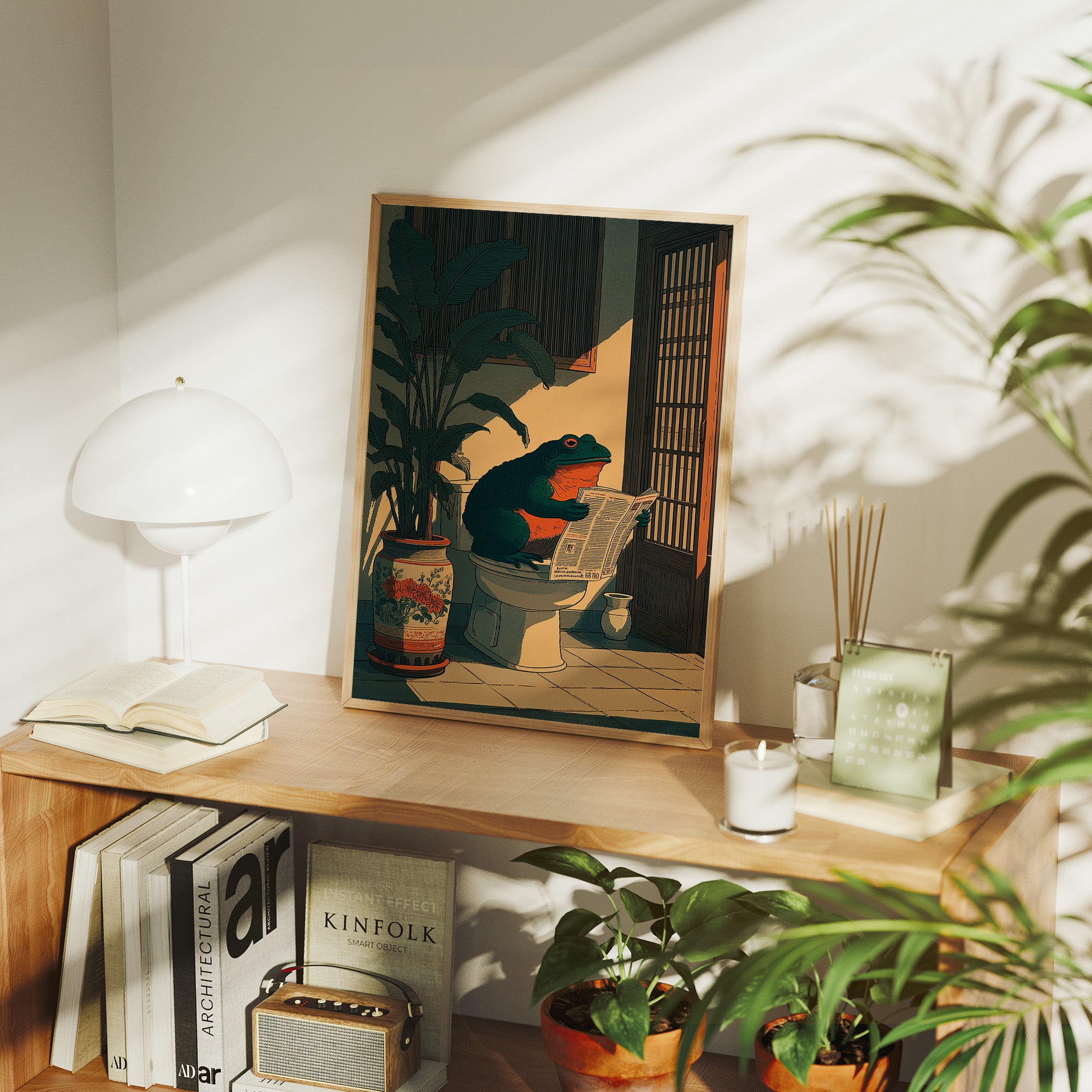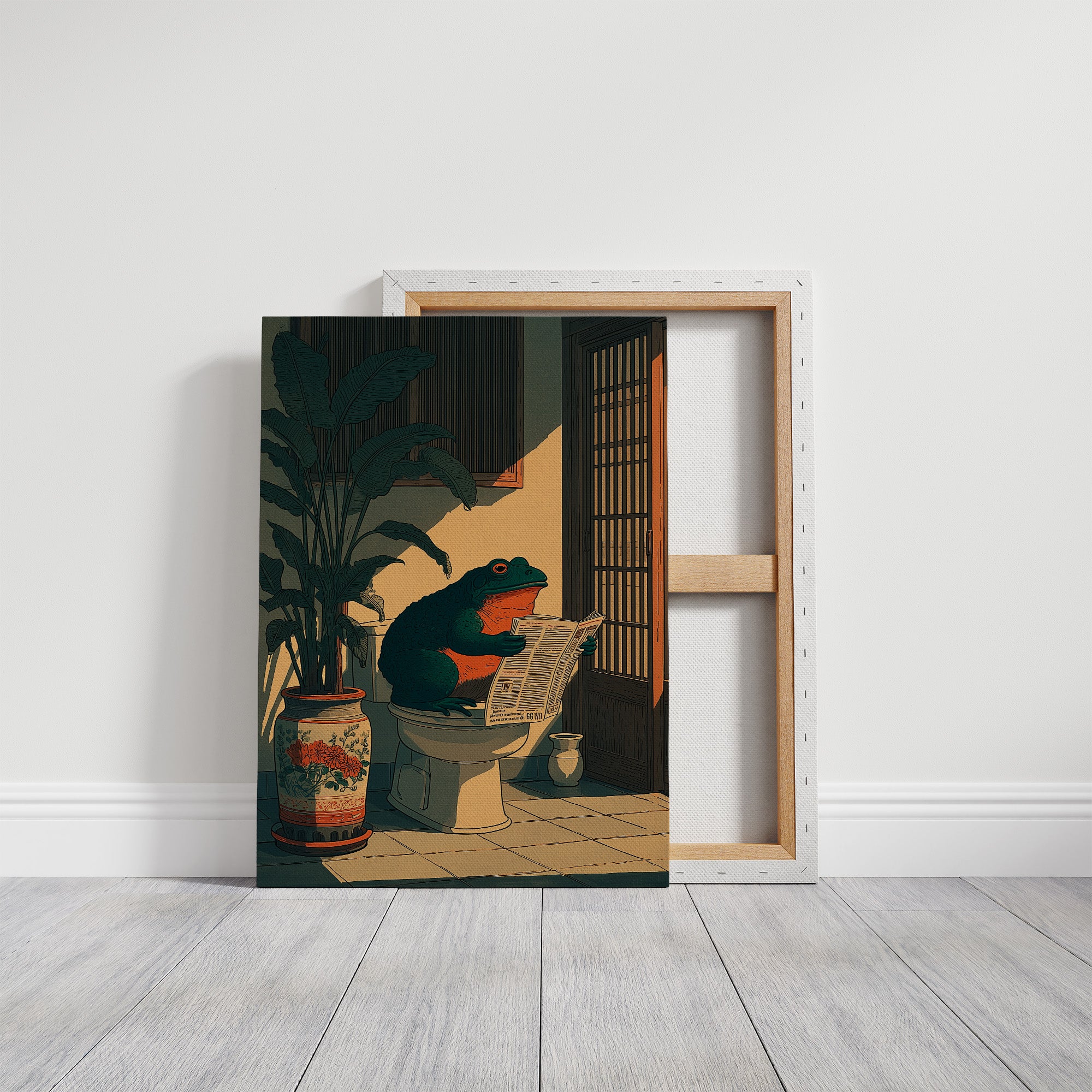 In the soft glow of morning light, a whimsical scene unfolds where a distinguished toad sits contentedly with his daily newspaper. The composition balances urban sophistication with playful storytelling, rendered in rich teals and warm terracotta tones. Traditional Japanese architectural elements frame this contemplative moment, while potted flowers and geometric shadows create a serene domestic atmosphere. This piece would bring a touch of literary charm and sophisticated whimsy to a reading nook, home office, or creative workspace.
