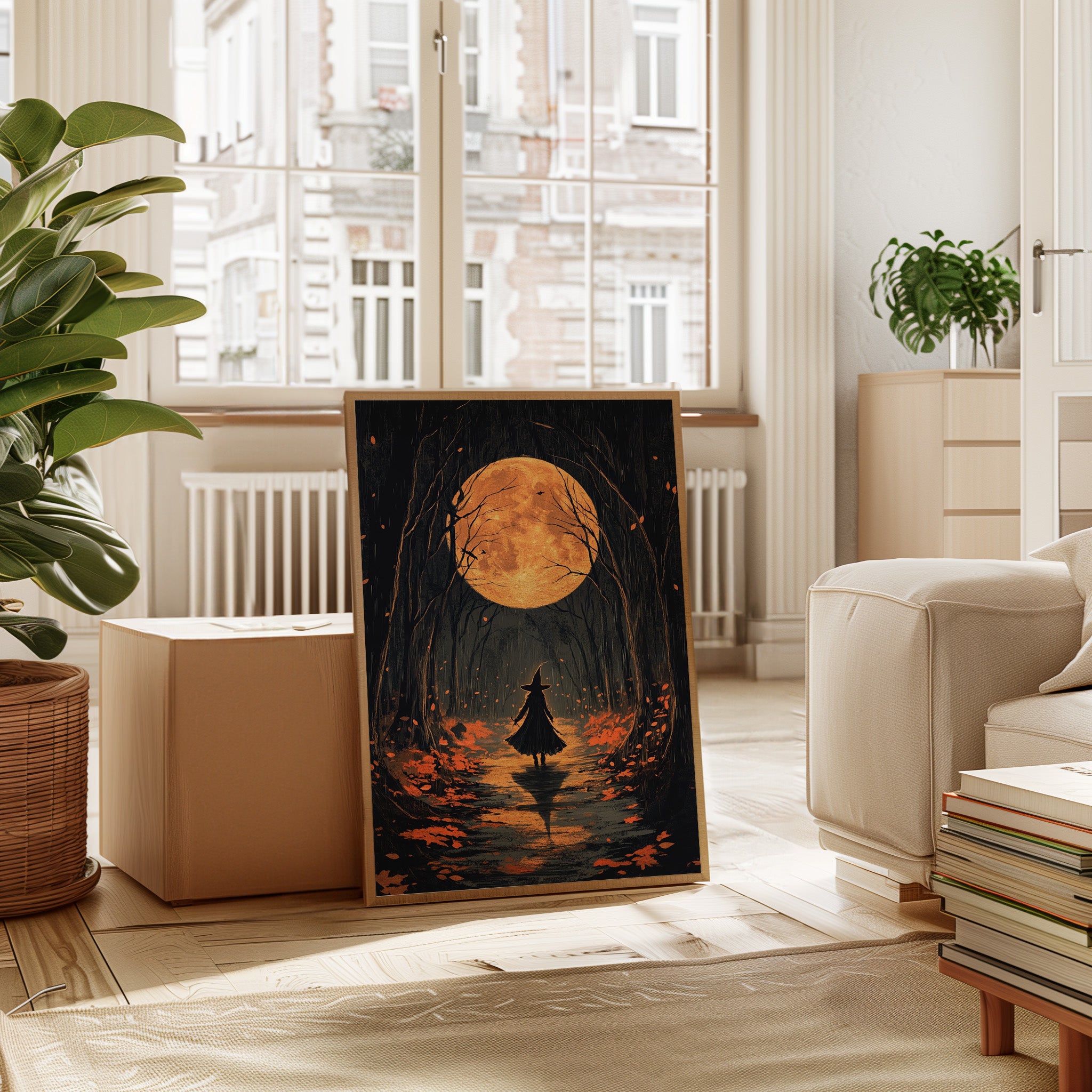 In the hush of an autumn night, a lone witch walks beneath the luminous glow of a full moon, her silhouette a captivating enigma against the vibrant fall foliage. This artwork invites you to step into a world where magic and mystery intertwine in the embrace of nature's twilight.