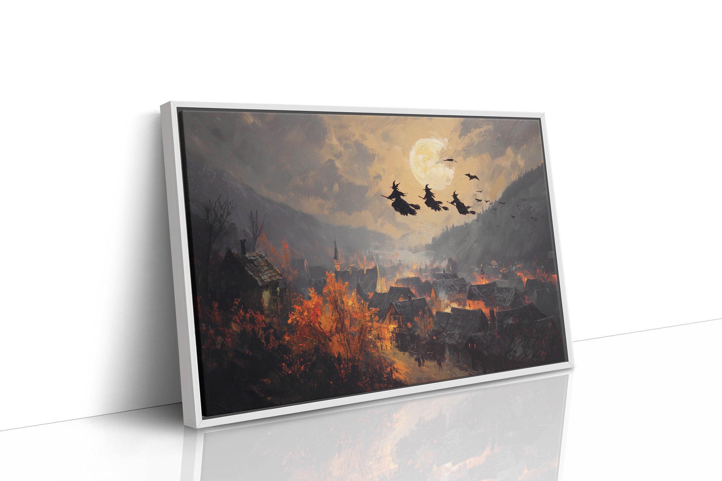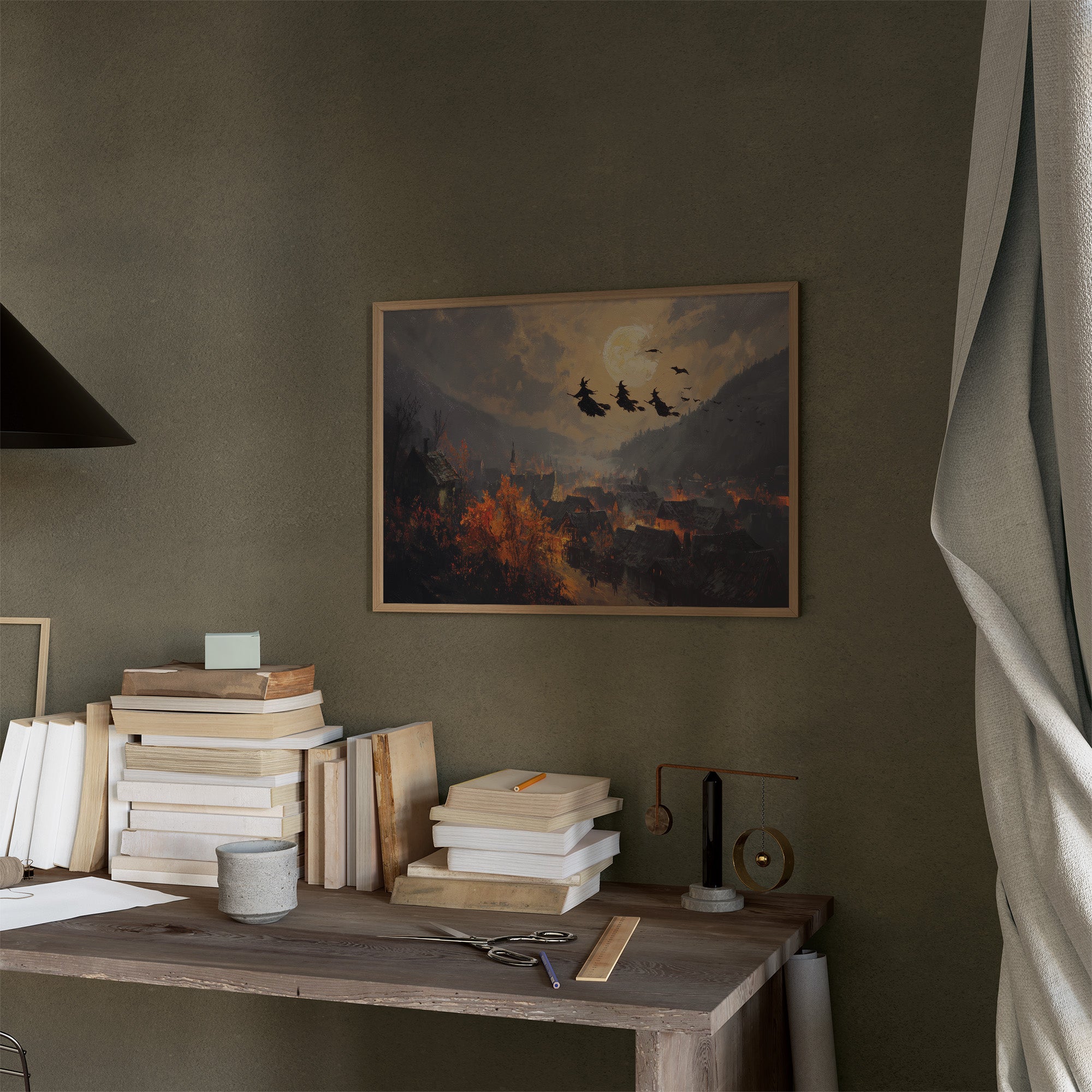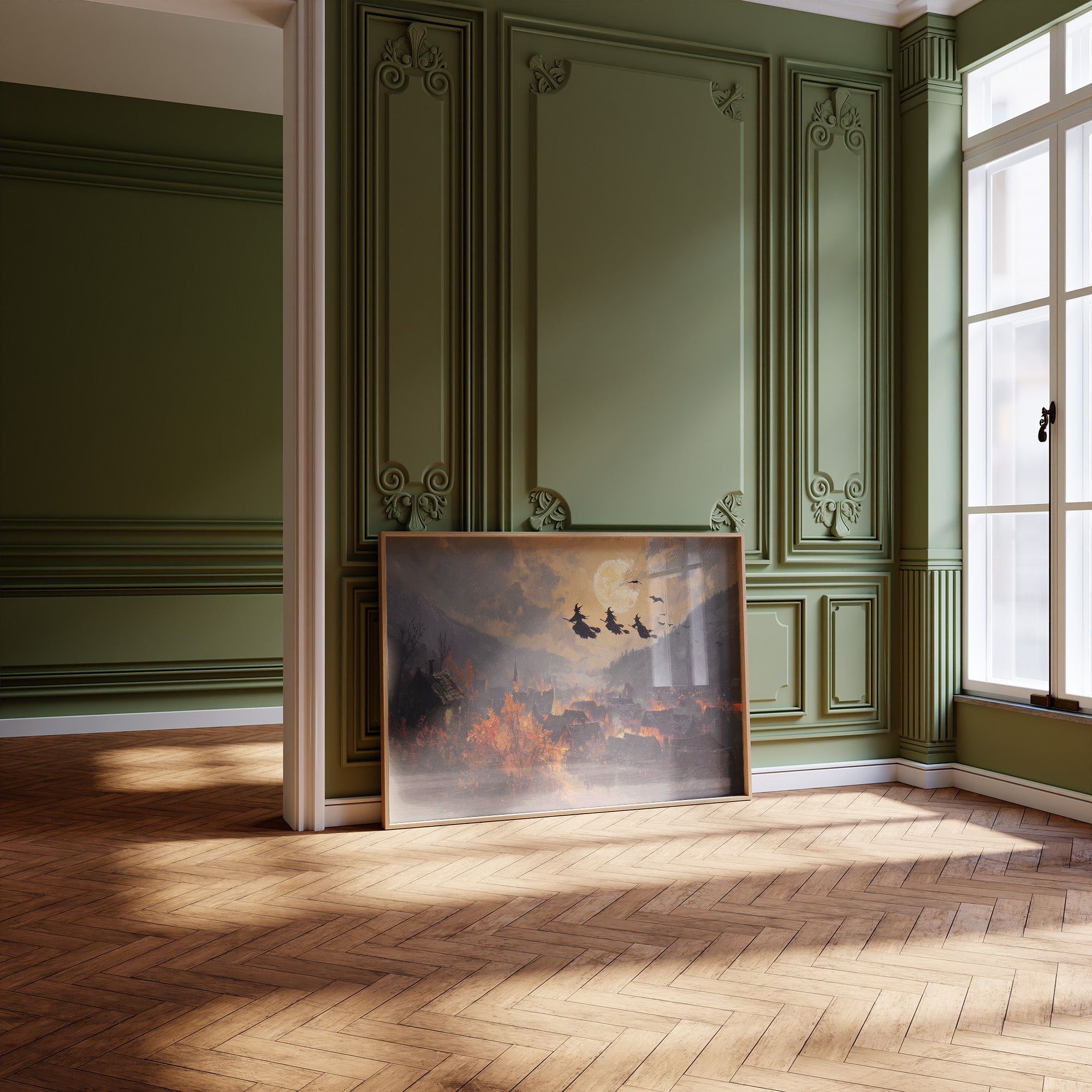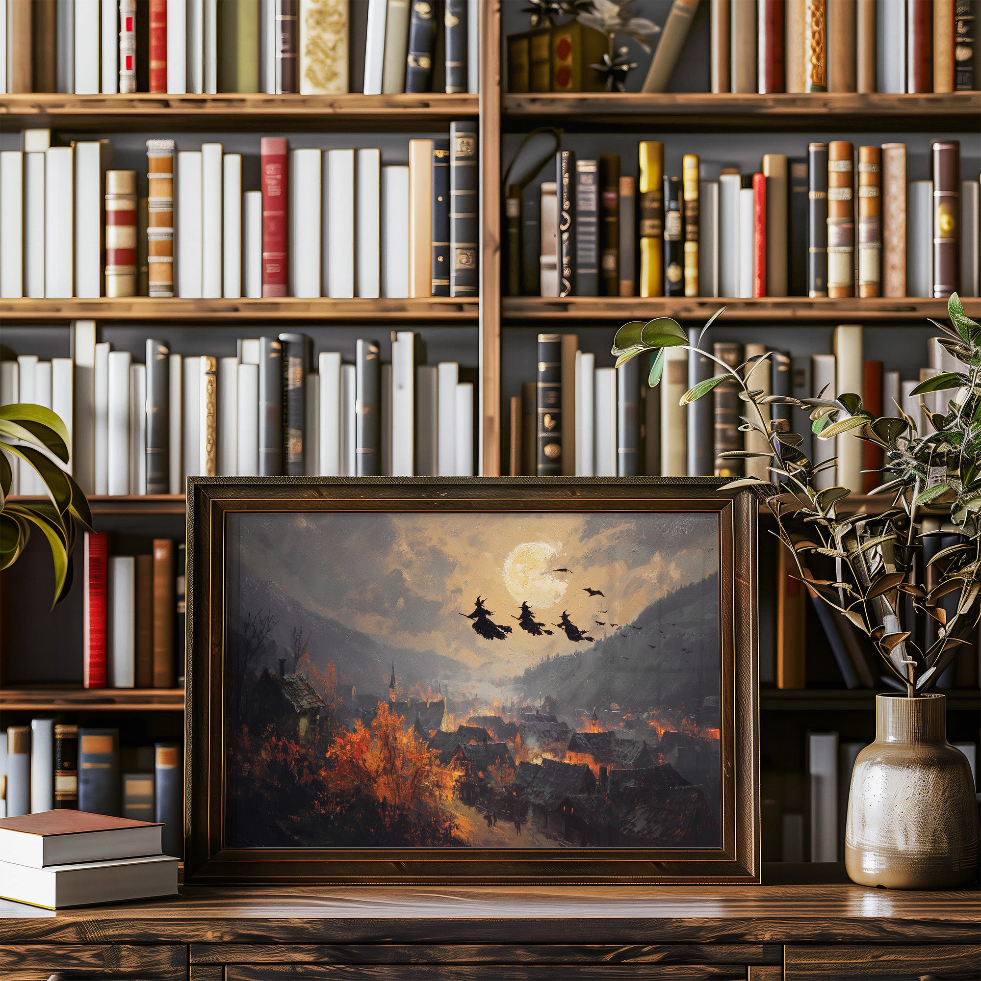 Moonlight cuts through gathering dusk as silhouettes of witches sweep across the night sky. Below, a medieval village glows with fiery hues, rooftops and windows illuminated in amber against the darkening valley. The painting captures that haunting moment between folklore and nightmare, where deep oranges and shadowy blues create a dramatic interplay between celestial magic and earthly destruction. This captivating scene rests against a backdrop of literary knowledge, perfectly positioned to spark conversation in a study, reading nook, or anywhere personal mythologies are cherished.