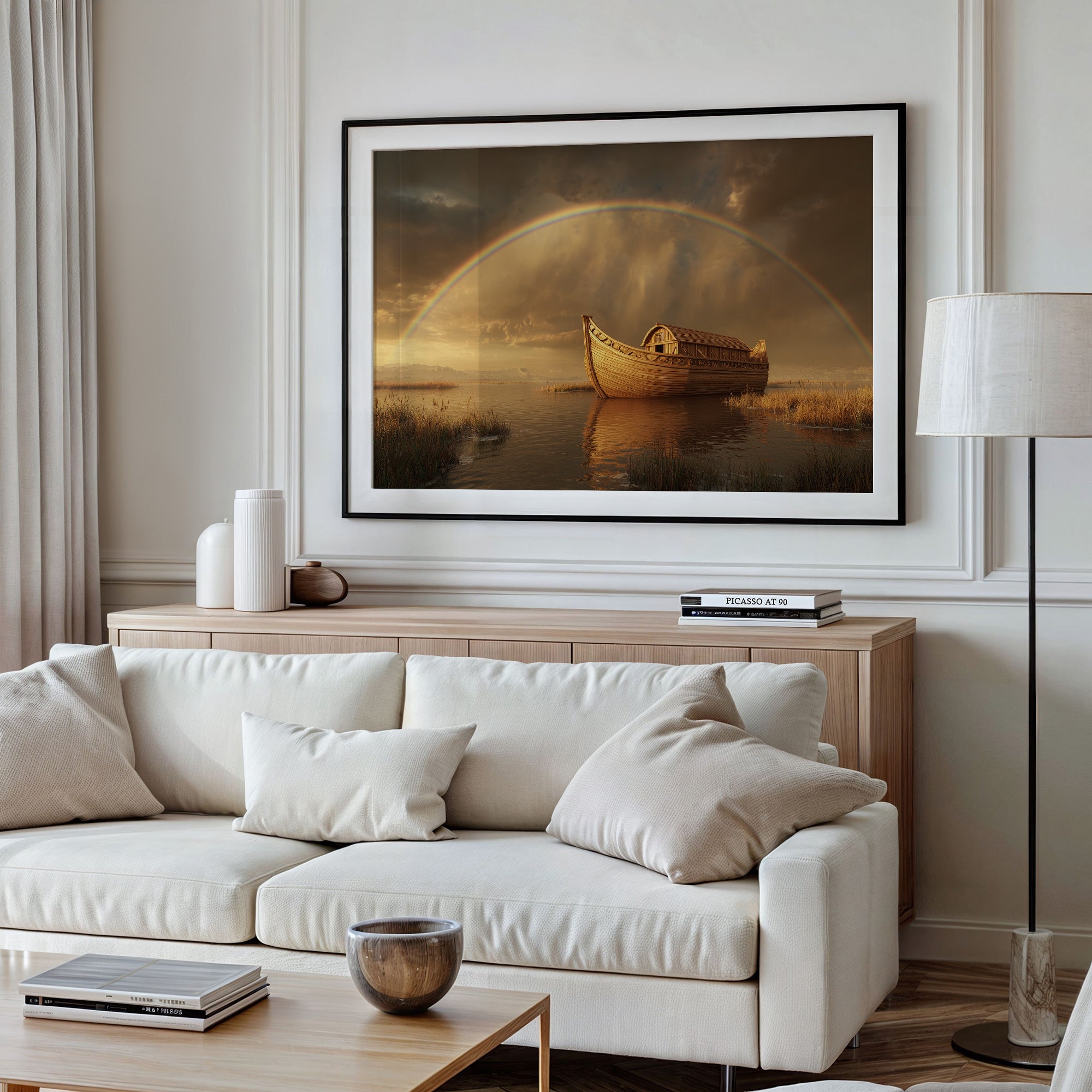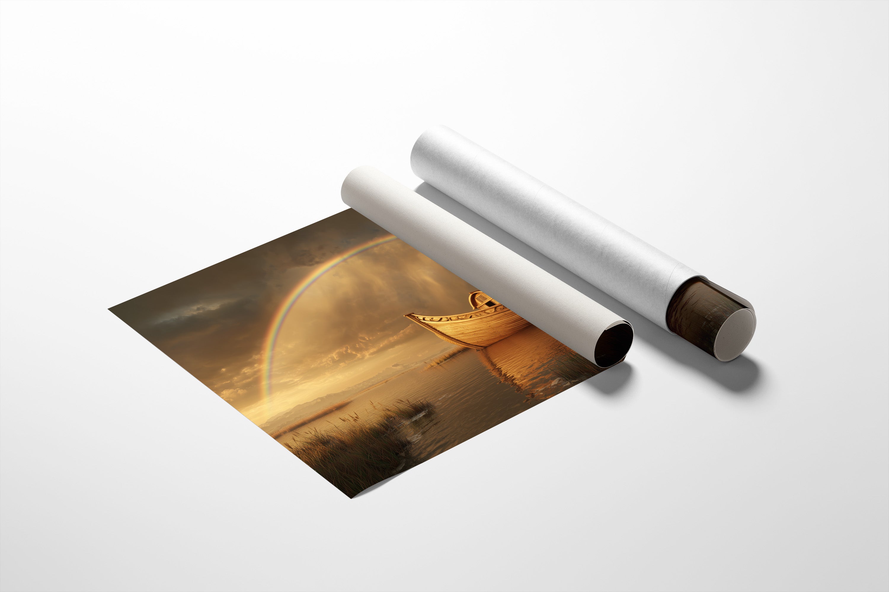 Hope arcs across stormy skies, casting golden light upon a solitary wooden vessel. The rich amber tones of the boat contrast dramatically with the moody clouds above, while delicate reeds stand witness at the water's edge. This contemplative scene evokes ancient tales of survival and renewal, perfectly framed among literary companions and dried pampas grass in a thoughtfully curated home.