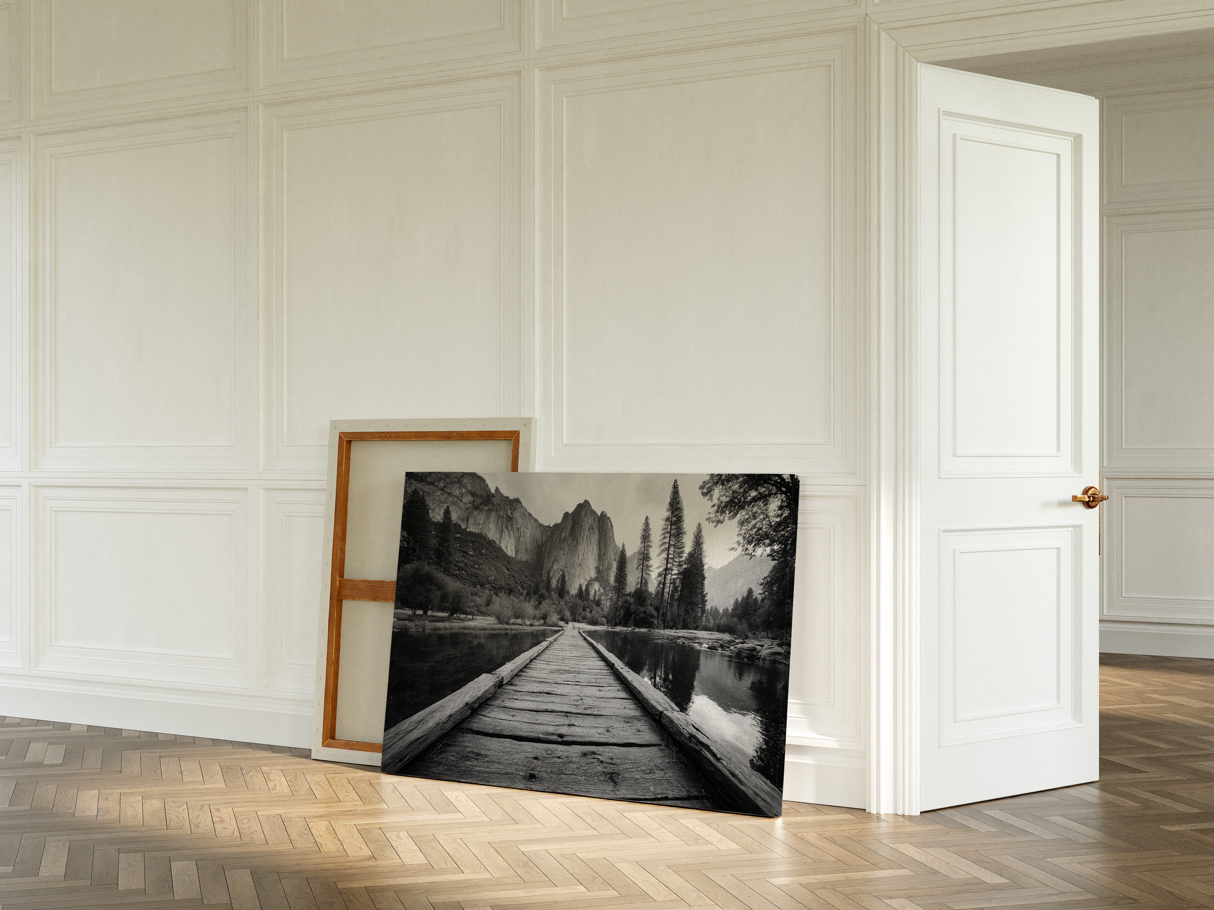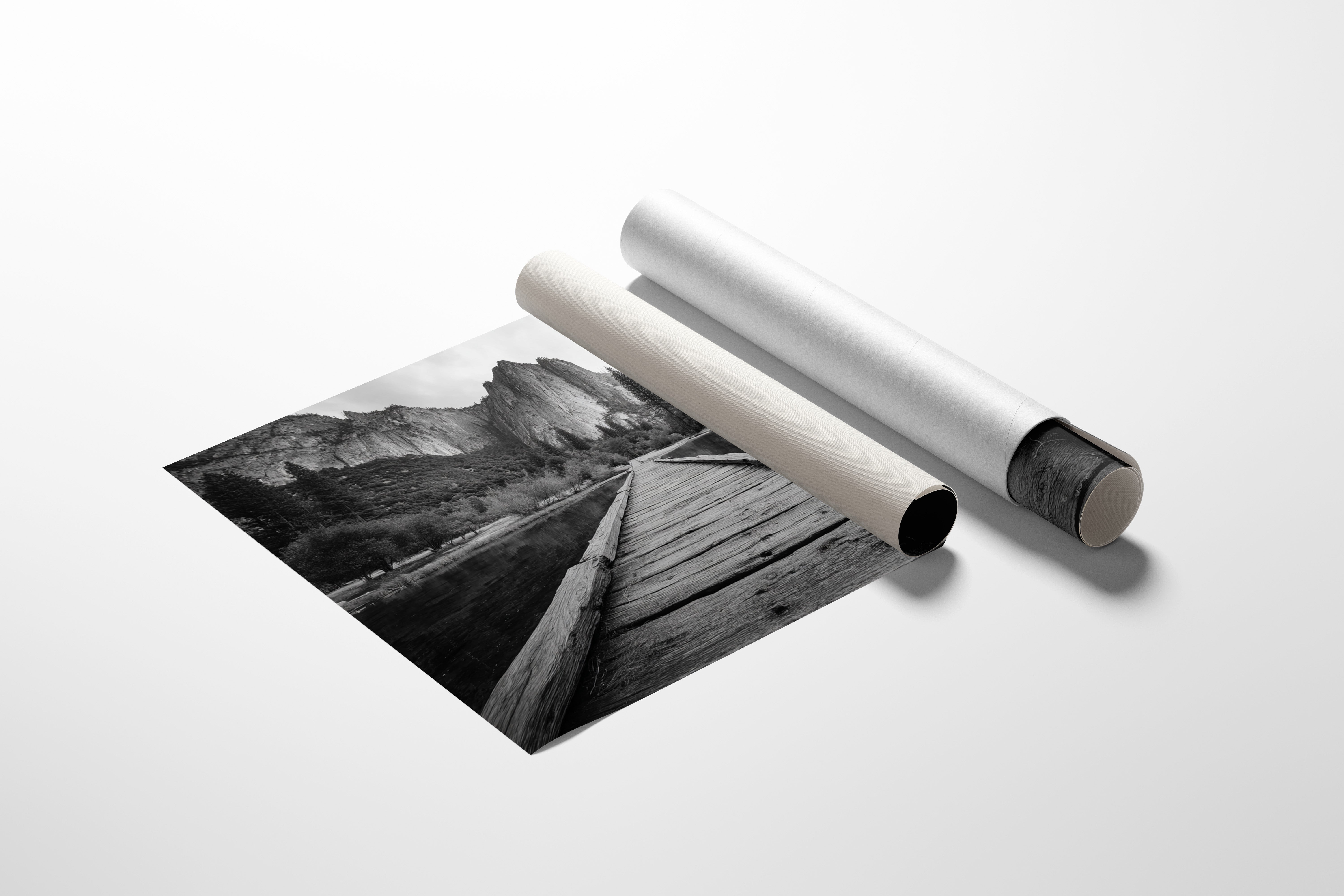 A weathered wooden boardwalk stretches across still waters, leading the eye toward towering granite cliffs that command the horizon. The black and white composition amplifies the raw textures of aged planks against the mirror-like surface of the river, creating a study in natural contrasts. Evergreen sentinels stand guard along the shoreline, their dark silhouettes drawing elegant lines against the massive rock face of Yosemite's iconic landscape. This piece brings the quiet grandeur of America's wilderness into interior spaces, offering a moment of contemplative escape. Perfect for creating a dramatic focal point in modern mountain homes or adding natural sophistication to urban living spaces.
