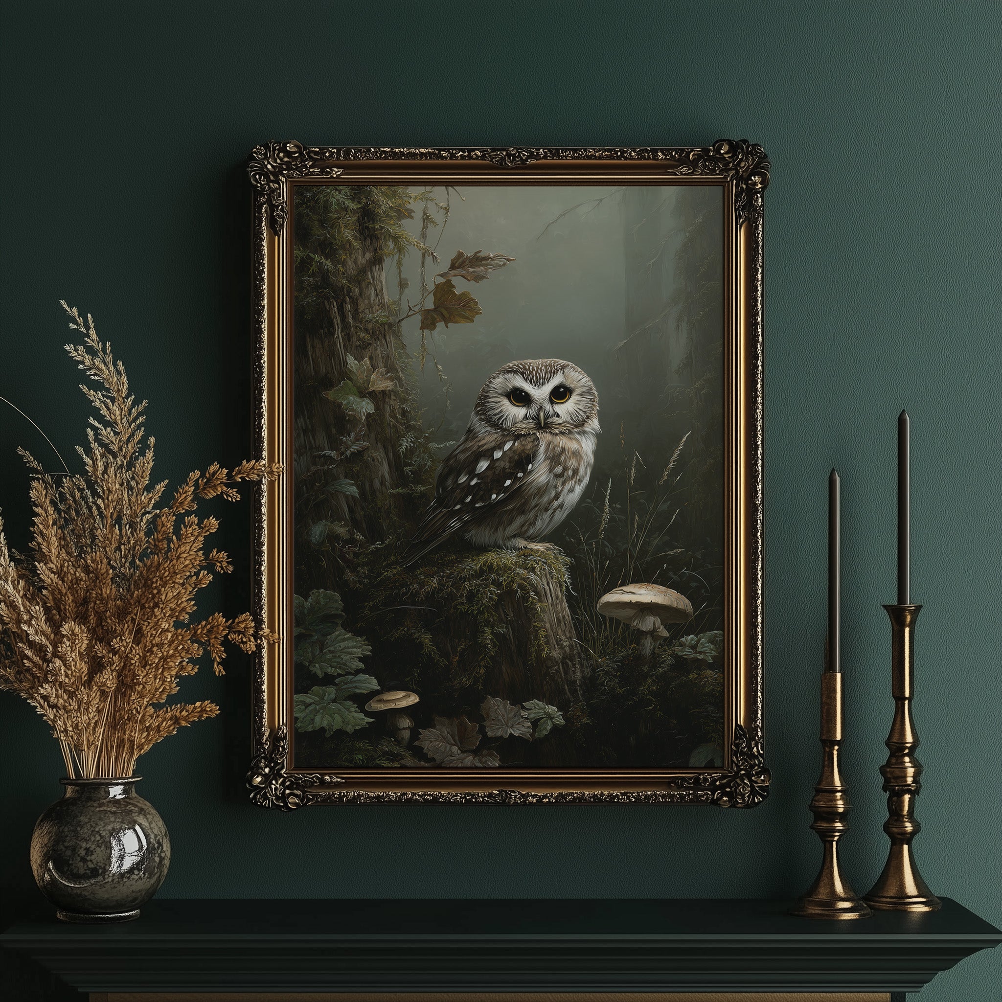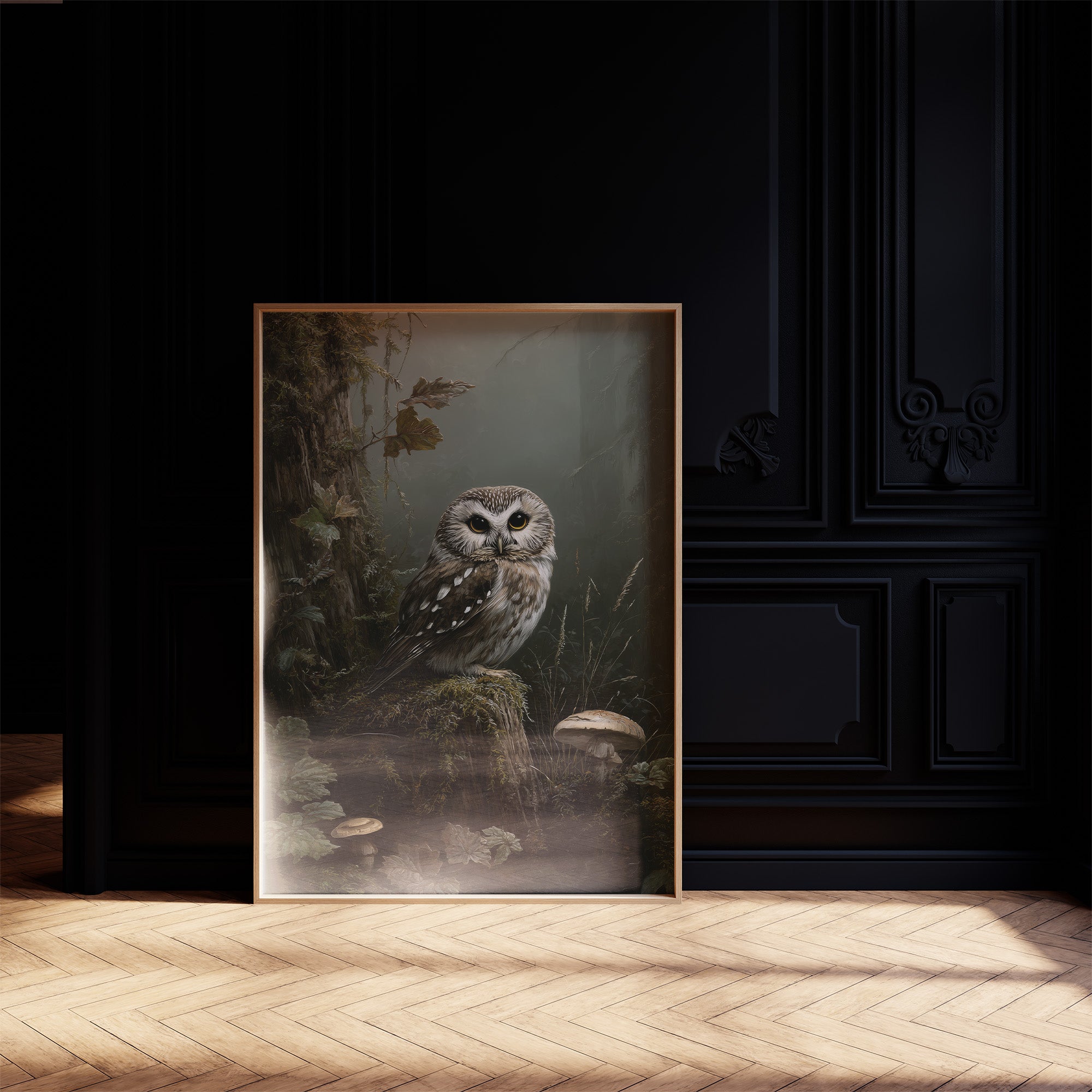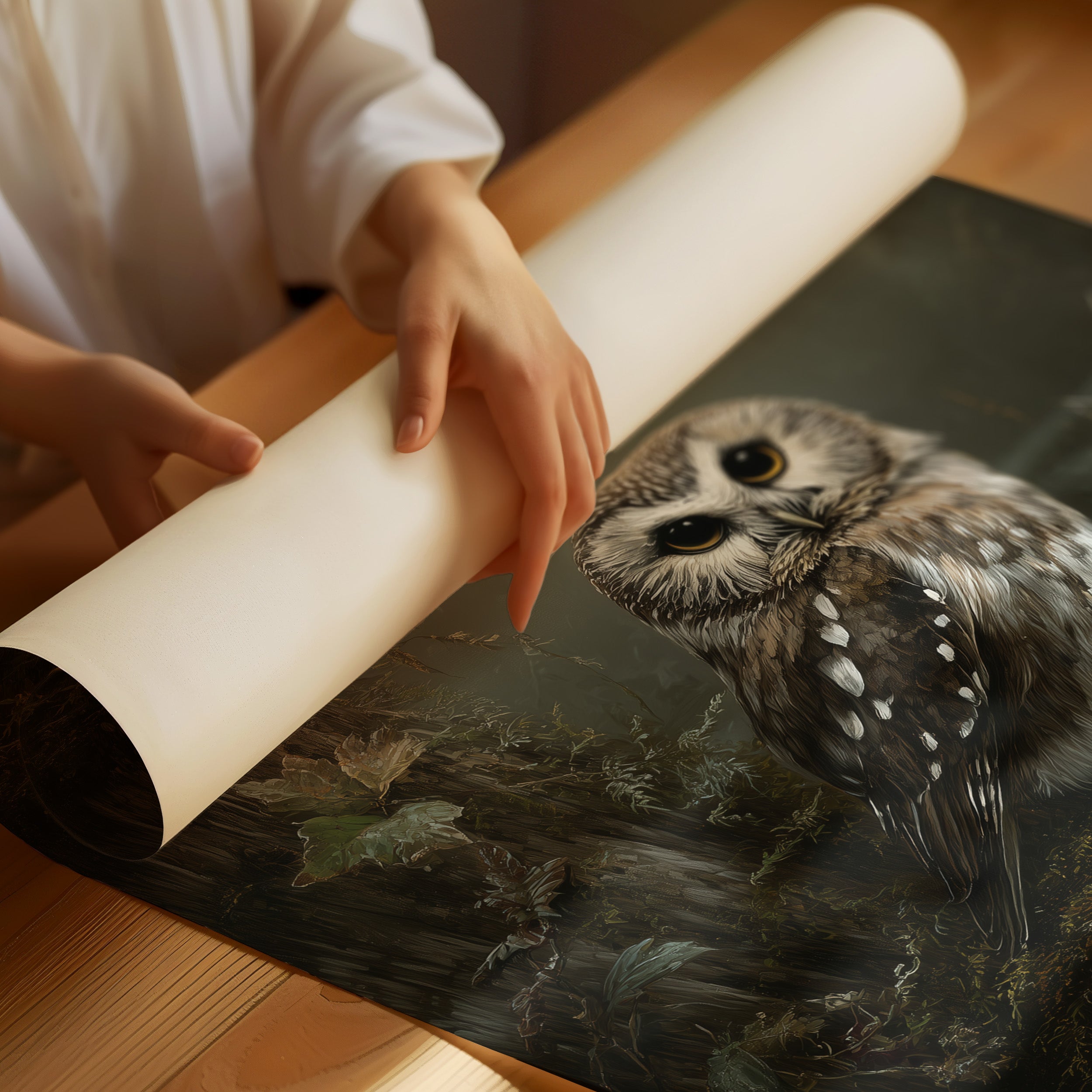 Mist hovers over damp earth as a watchful owl surveys its domain with knowing eyes. The small hunter rests atop moss-covered stone, its speckled feathers catching what little light filters through the forest canopy. Earthy tones of olive, amber, and slate create a mysterious woodland tableau where mushrooms emerge from the shadowy forest floor. This captivating portrait brings natural elegance to a study, library, or any space where contemplative beauty is cherished.