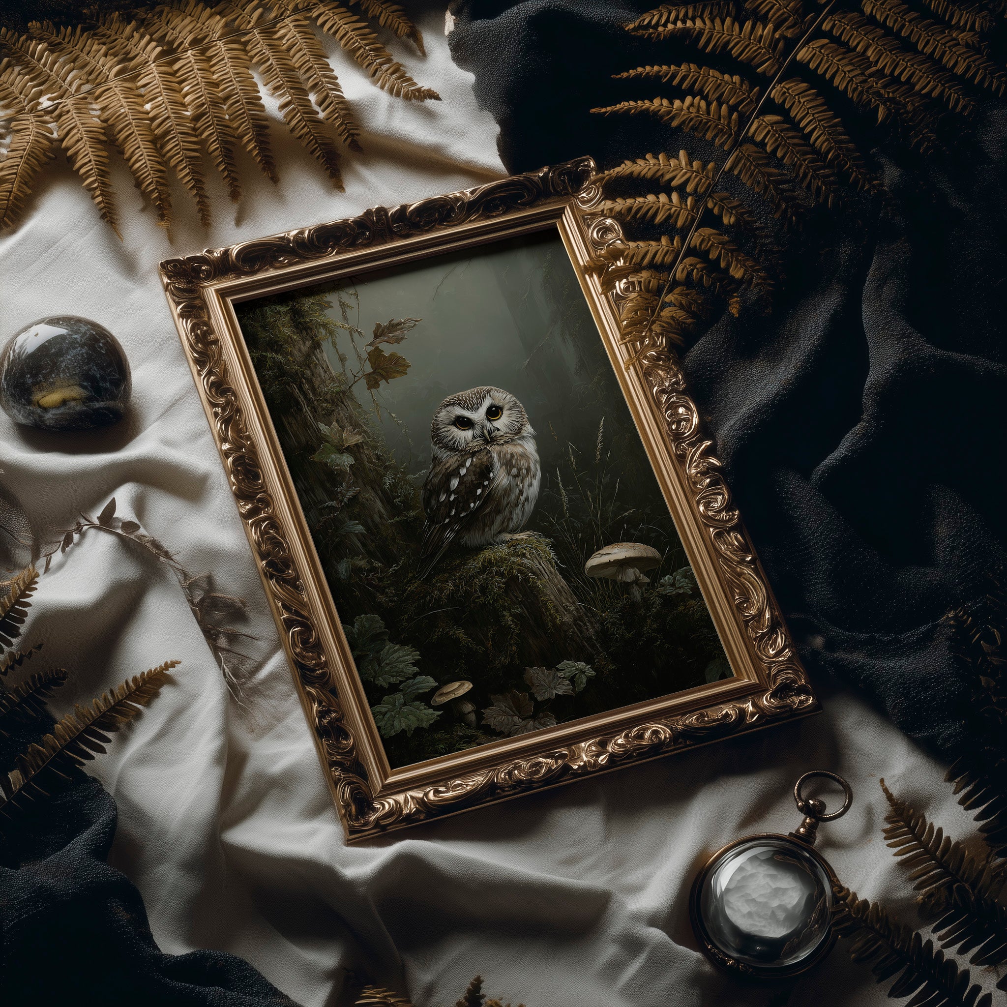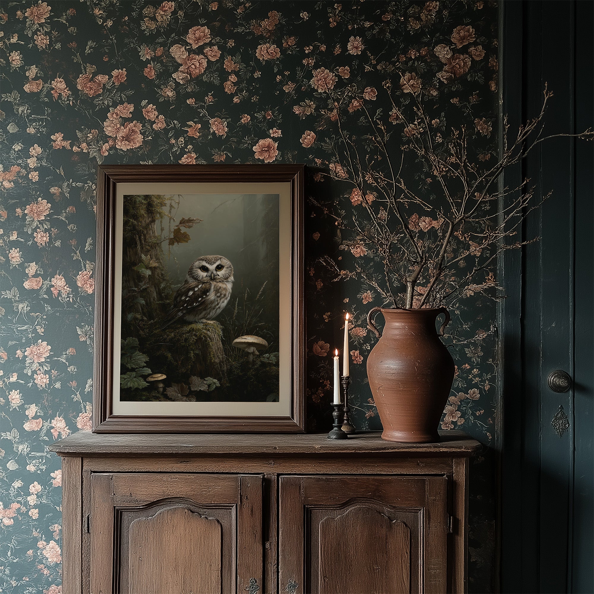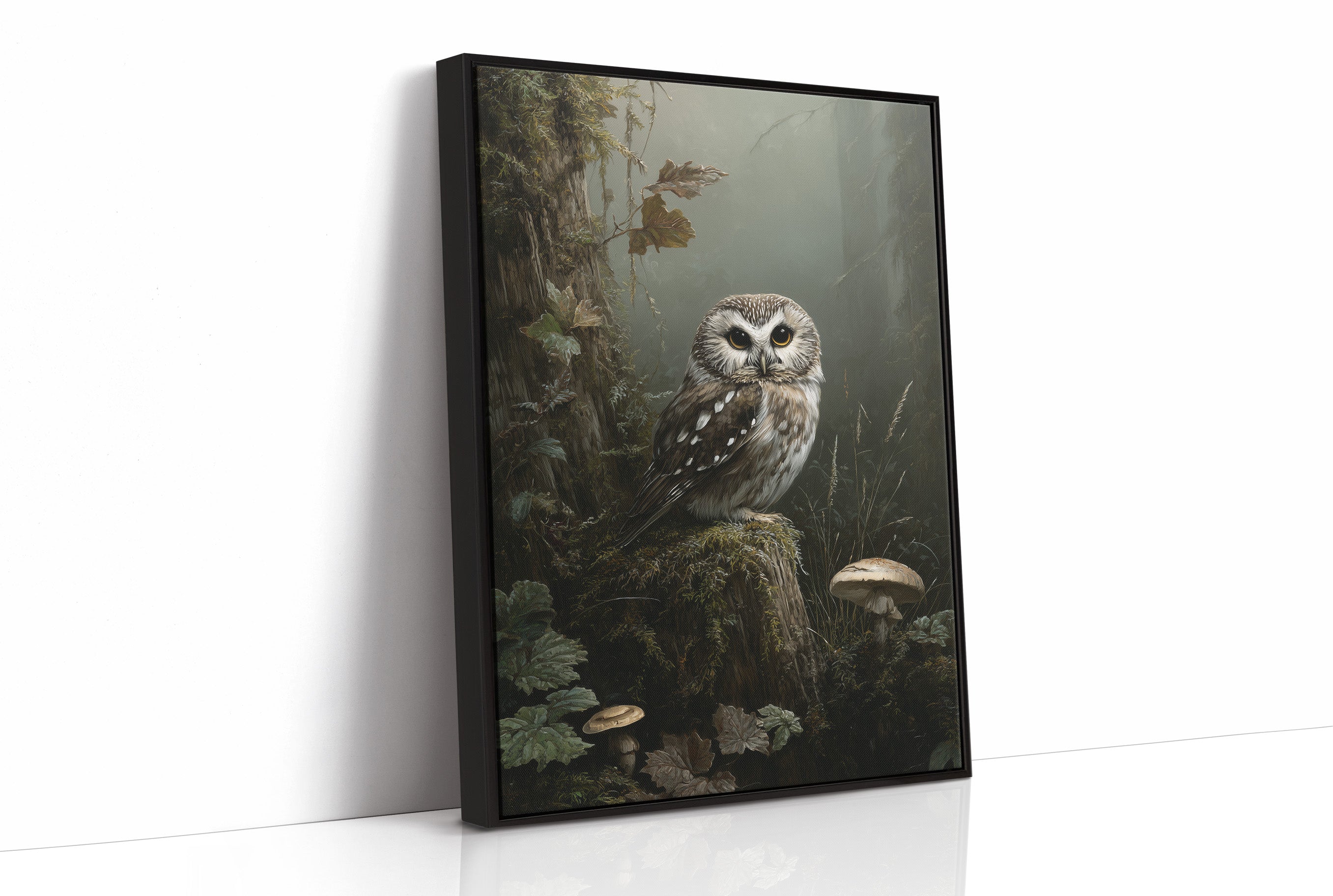 Mist hovers over damp earth as a watchful owl surveys its domain with knowing eyes. The small hunter rests atop moss-covered stone, its speckled feathers catching what little light filters through the forest canopy. Earthy tones of olive, amber, and slate create a mysterious woodland tableau where mushrooms emerge from the shadowy forest floor. This captivating portrait brings natural elegance to a study, library, or any space where contemplative beauty is cherished.
