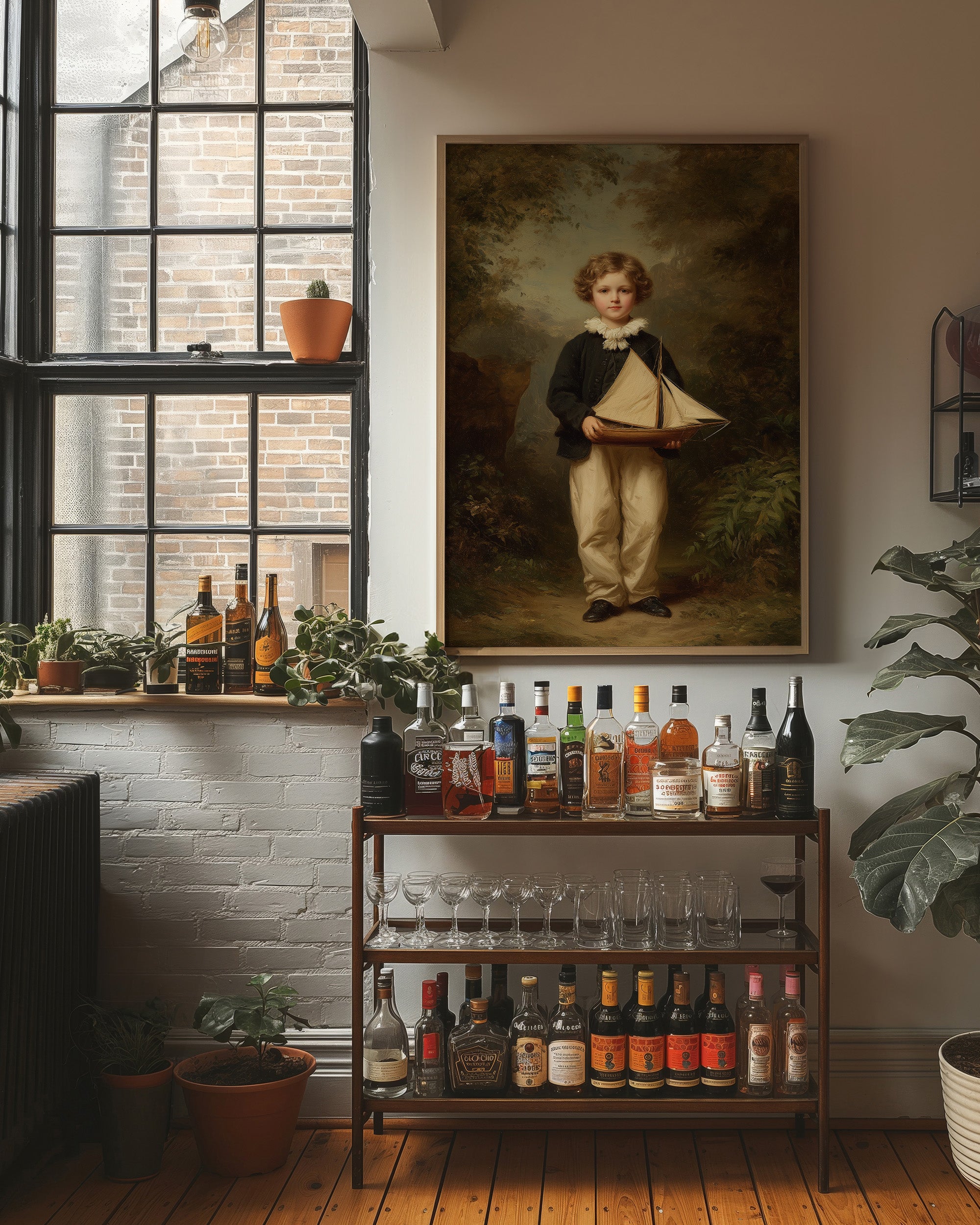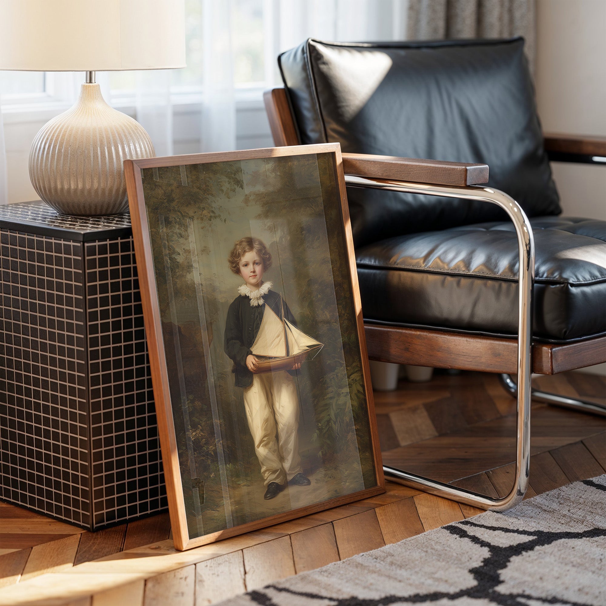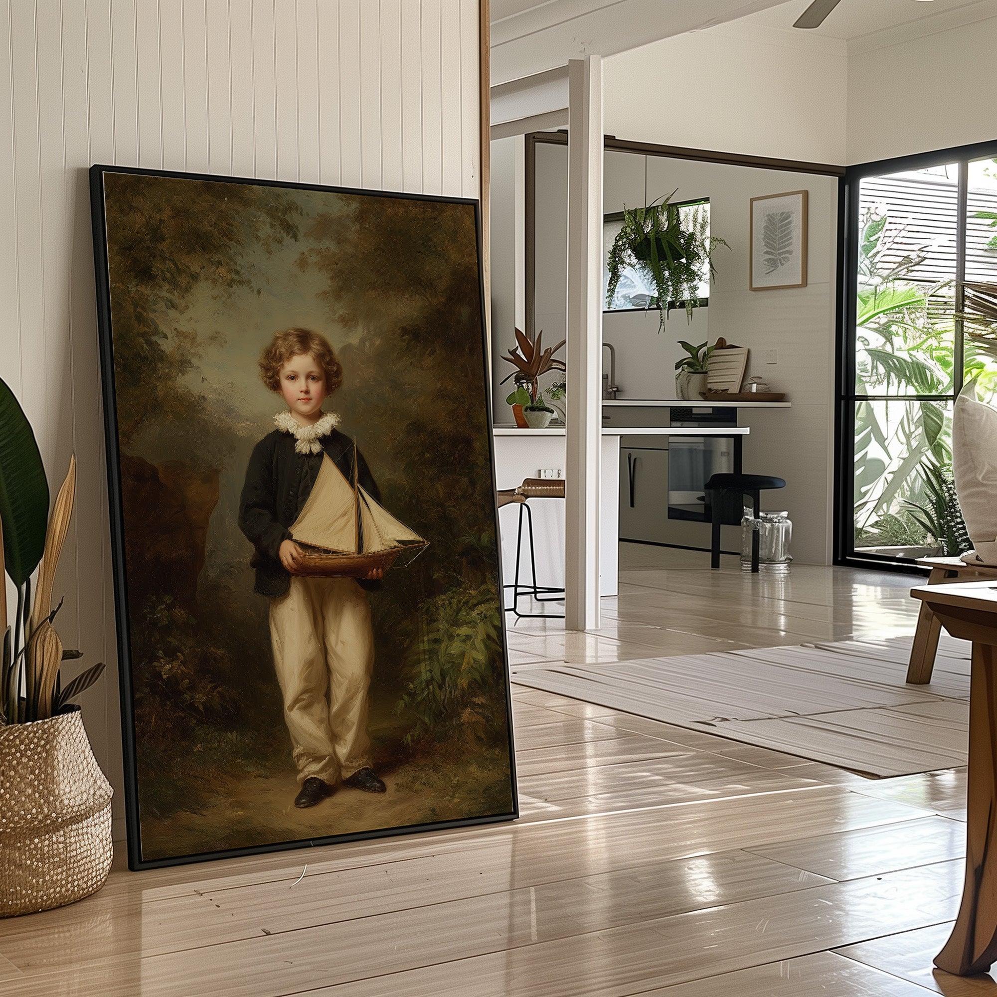 The muted earthy tones of the background contrast with the figure's light-colored trousers and the delicate craftsmanship of the toy vessel. The painting's traditional style evokes 19th century portraiture, while its presentation as a canvas being prepared or restored adds a contemporary, meta-artistic dimension.