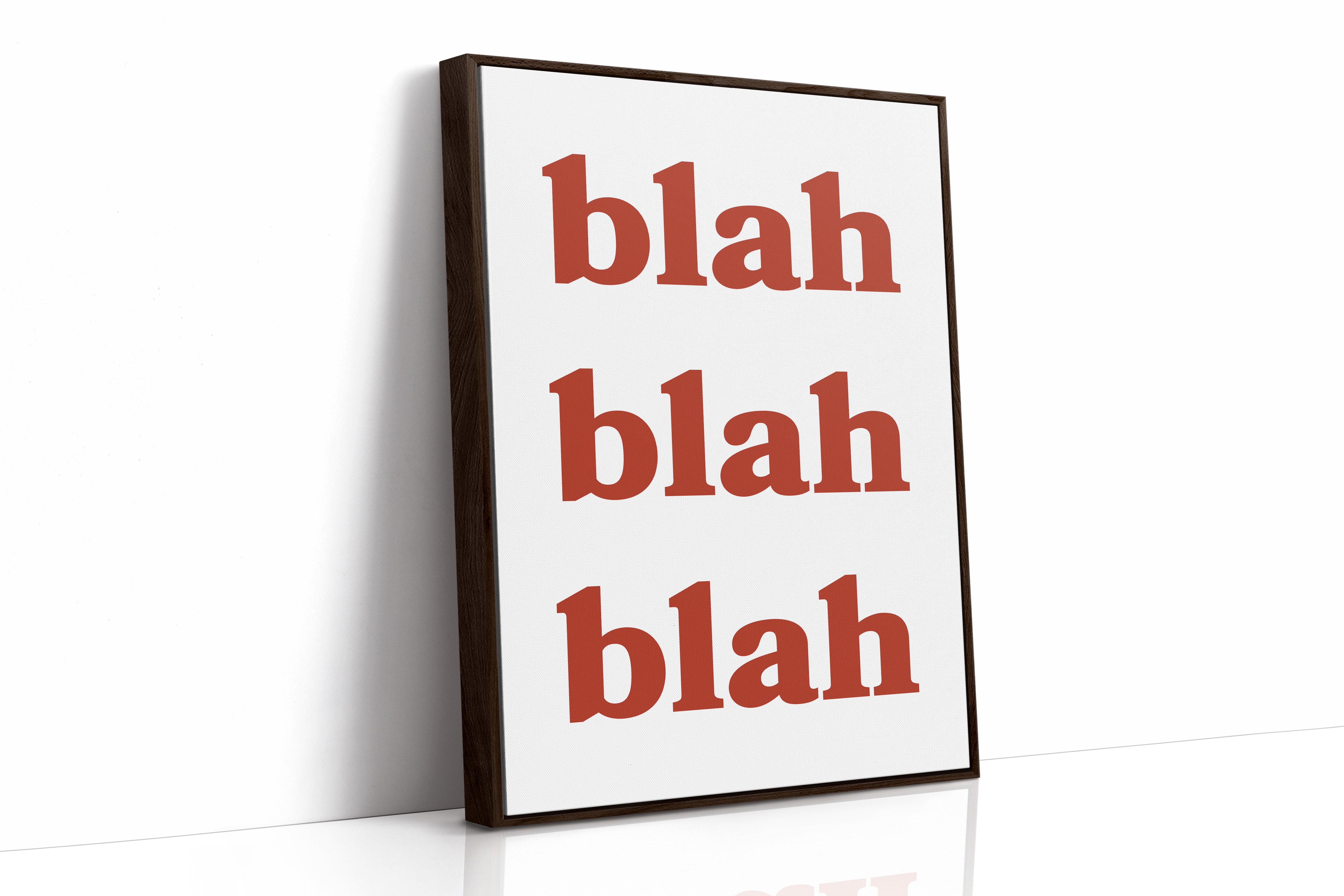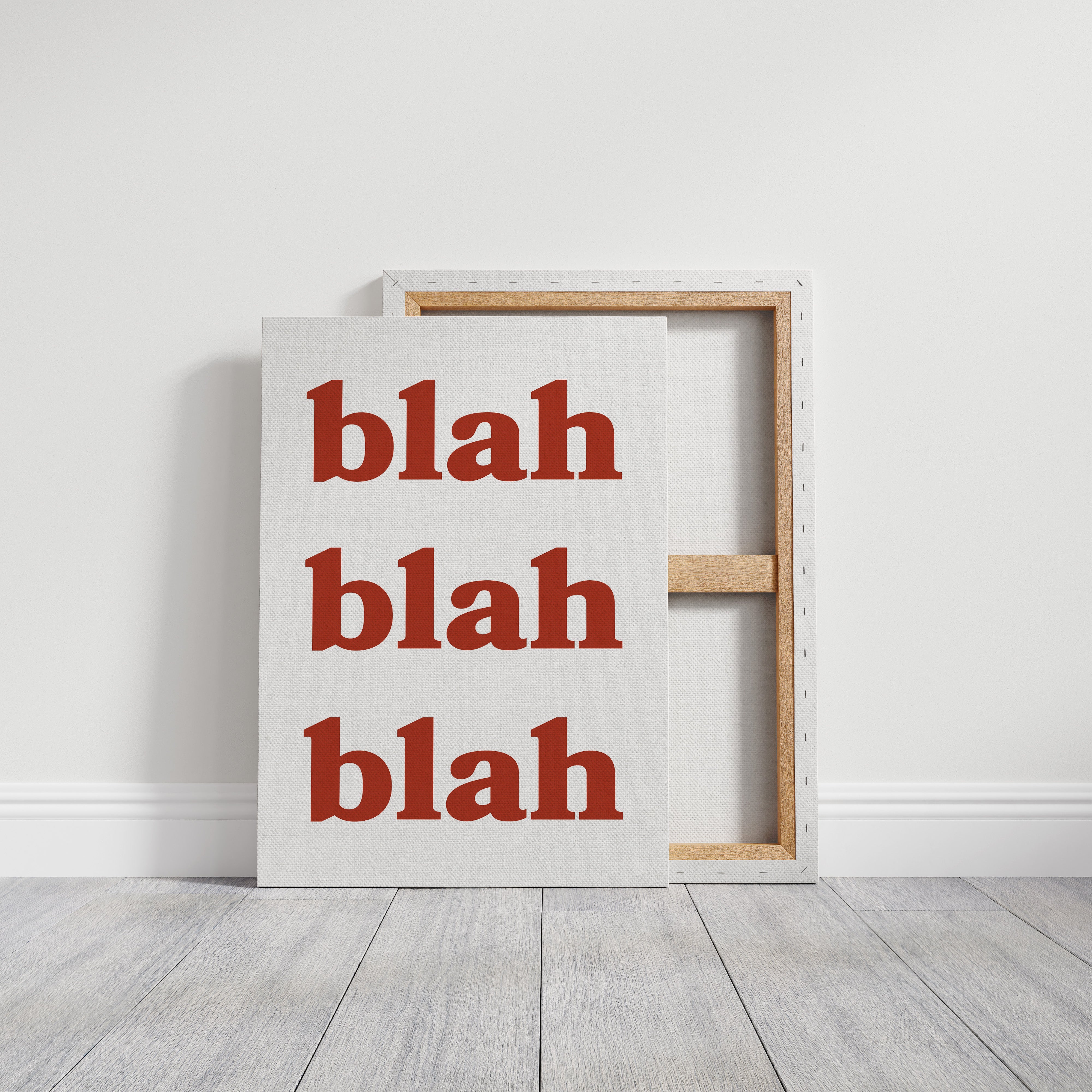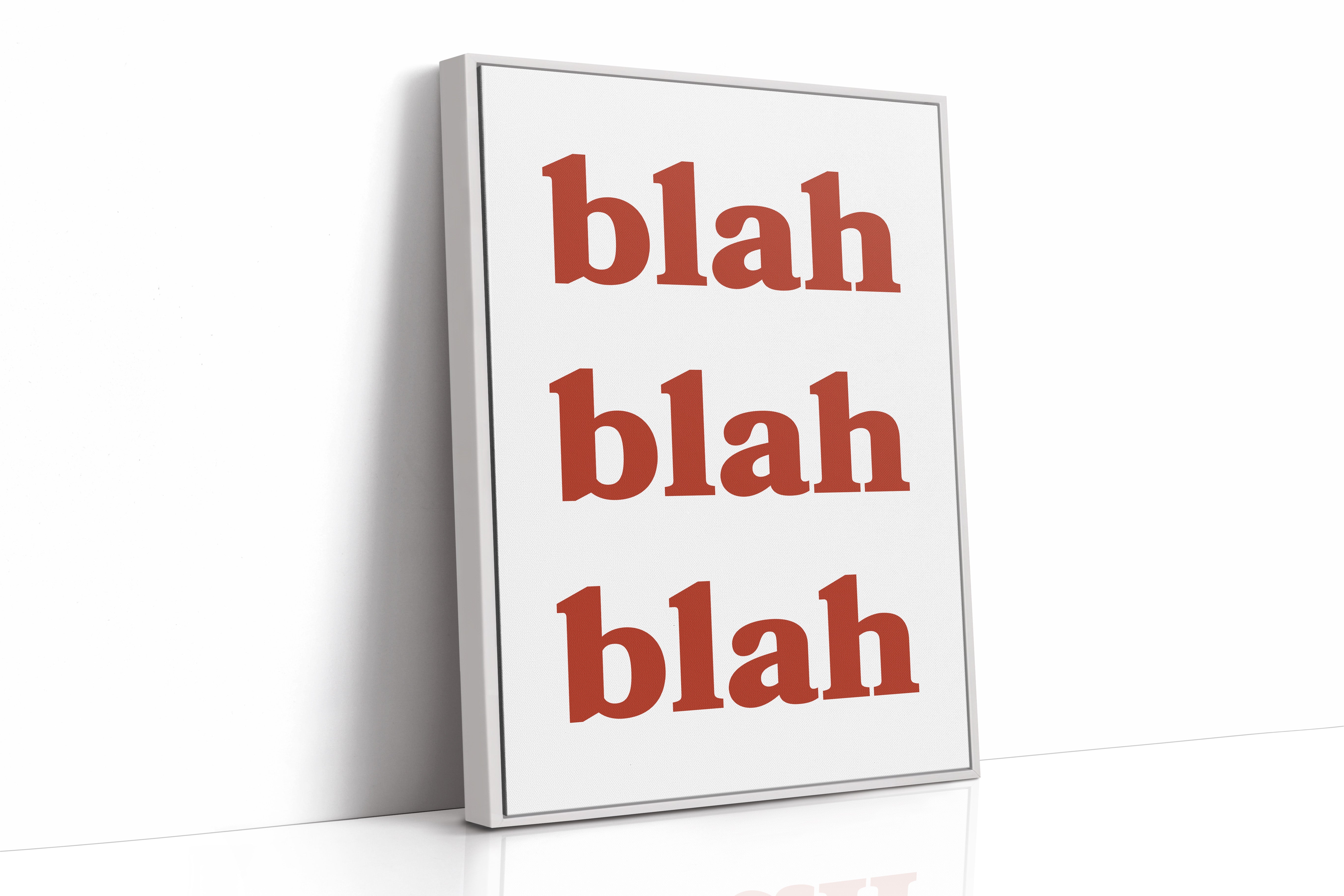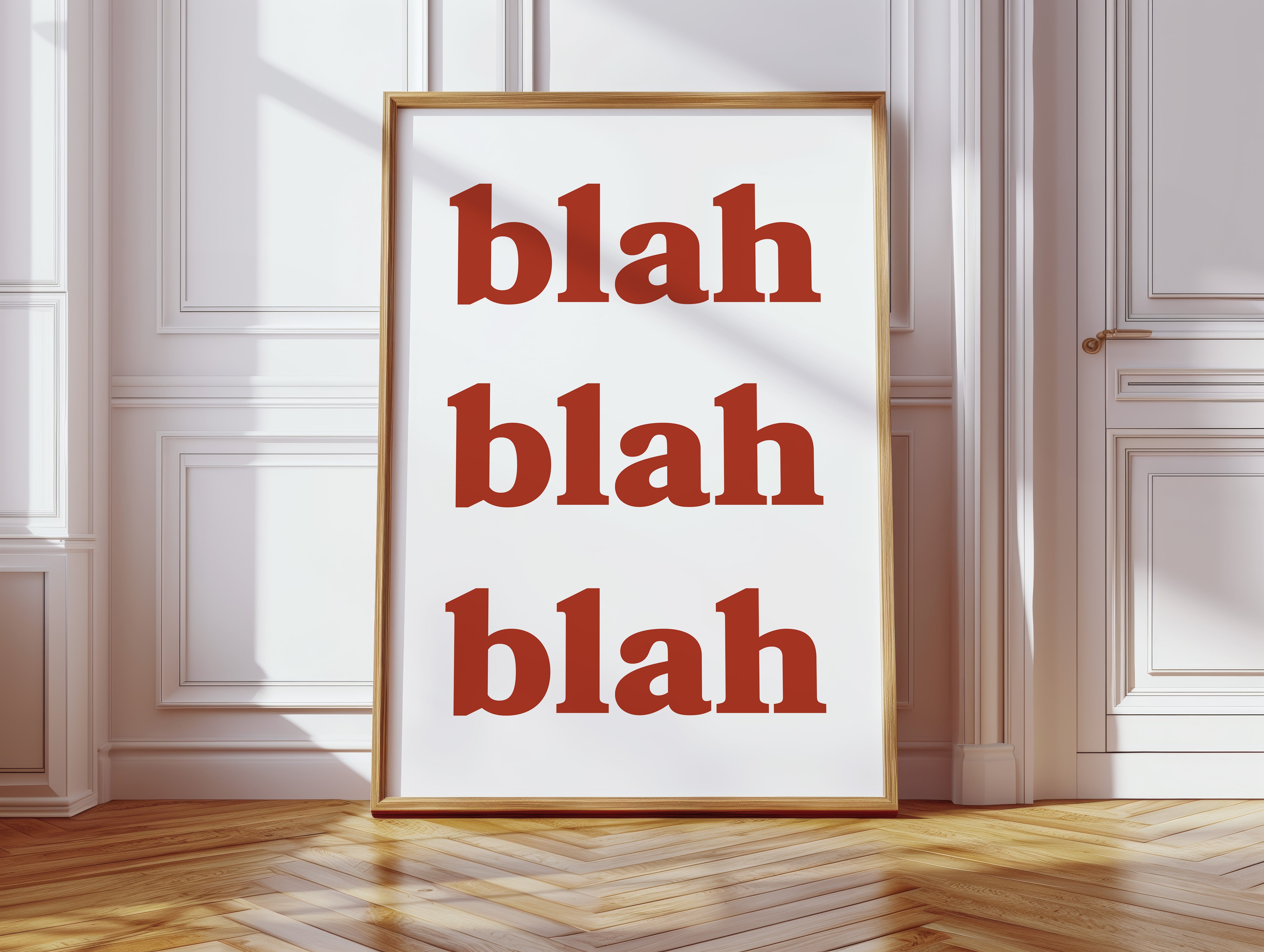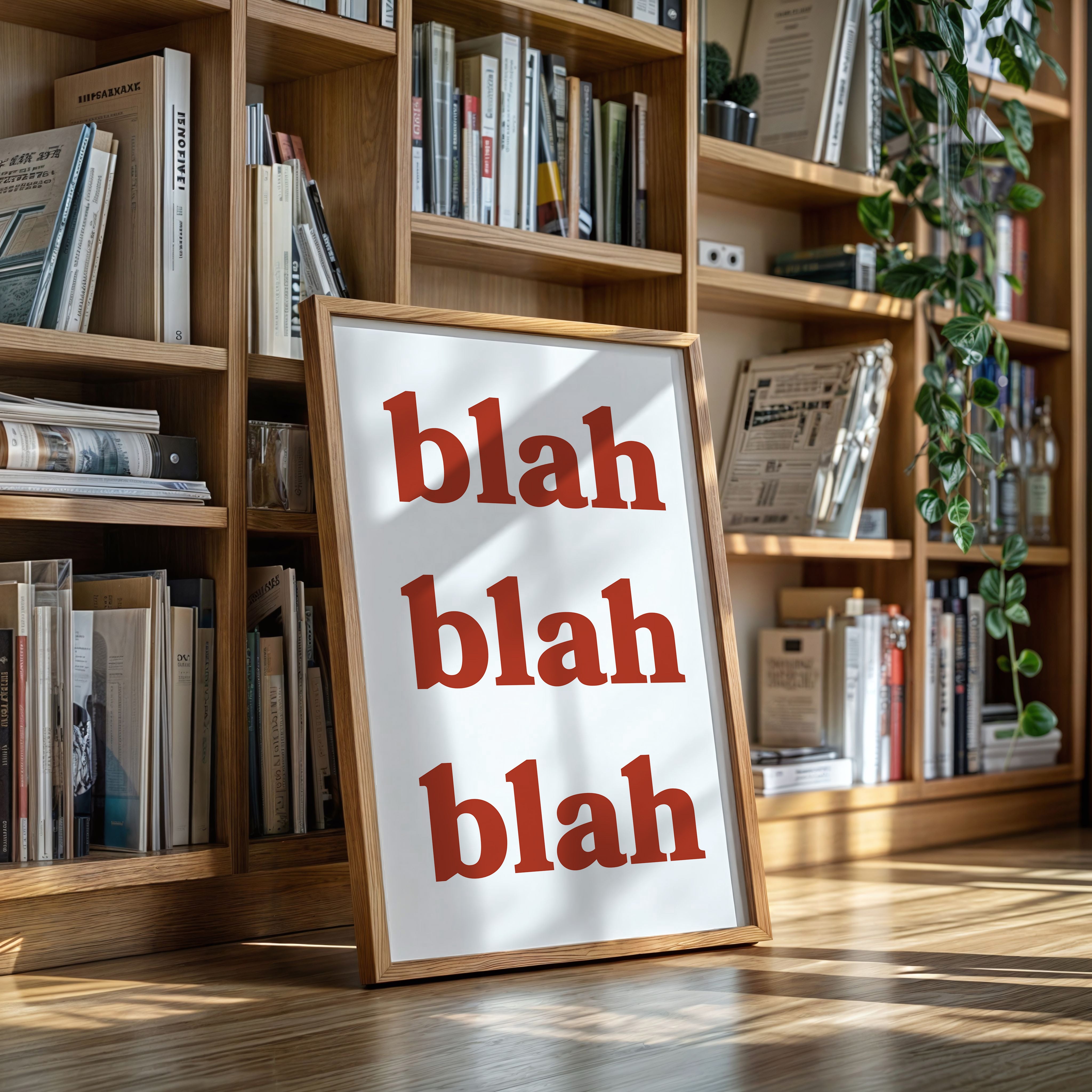 A striking repetition emerges in warm terracotta tones, each ""blah"" echoing the mundane yet mesmerizing nature of everyday thoughts. The serif typography creates a rhythmic pattern against pristine white space, suggesting both monotony and meditation. The bold letterforms speak to contemporary design while maintaining a timeless quality through their classic proportions and warm earth-tone palette. Perfect for a modern office space or creative studio where minimalist design meets thoughtful expression.