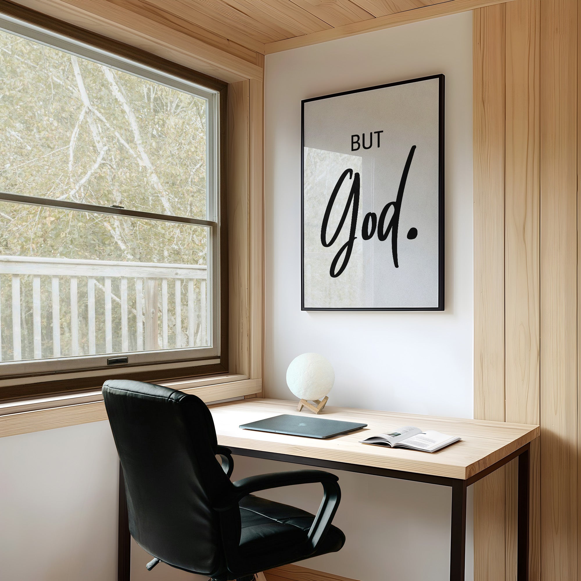 Morning light spills across a wooden table where a simple white page declares its powerful message: "BUT God." The stark contrast between the clean paper and warm wood creates a moment of contemplation and hope. The bold typography speaks to life's unexpected turnshow two small words can pivot a narrative from despair to possibility. A glimpse of greenery and the corner of a coffee cup suggest this is a sacred pause in someone's day, a reminder that sits among the ordinary yet transforms it.