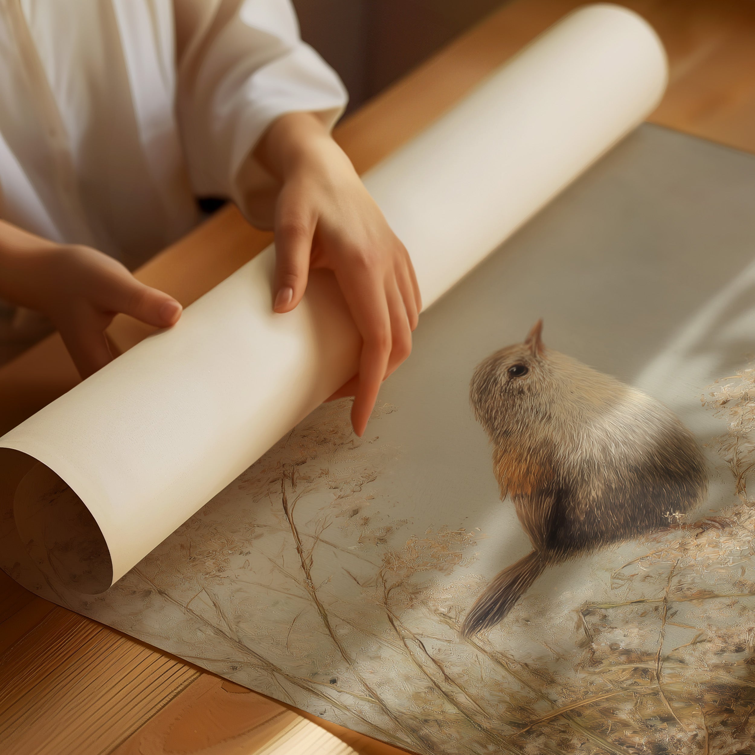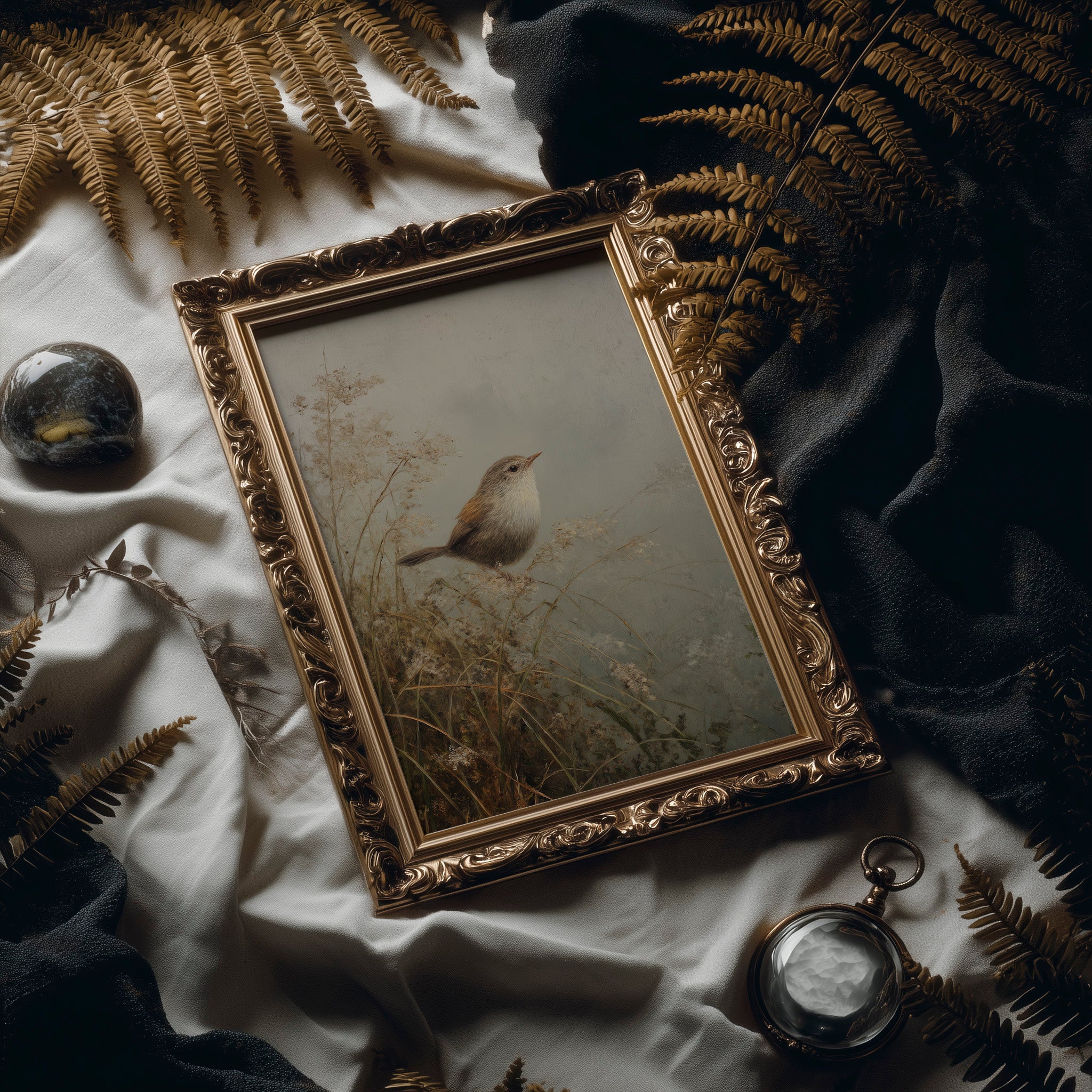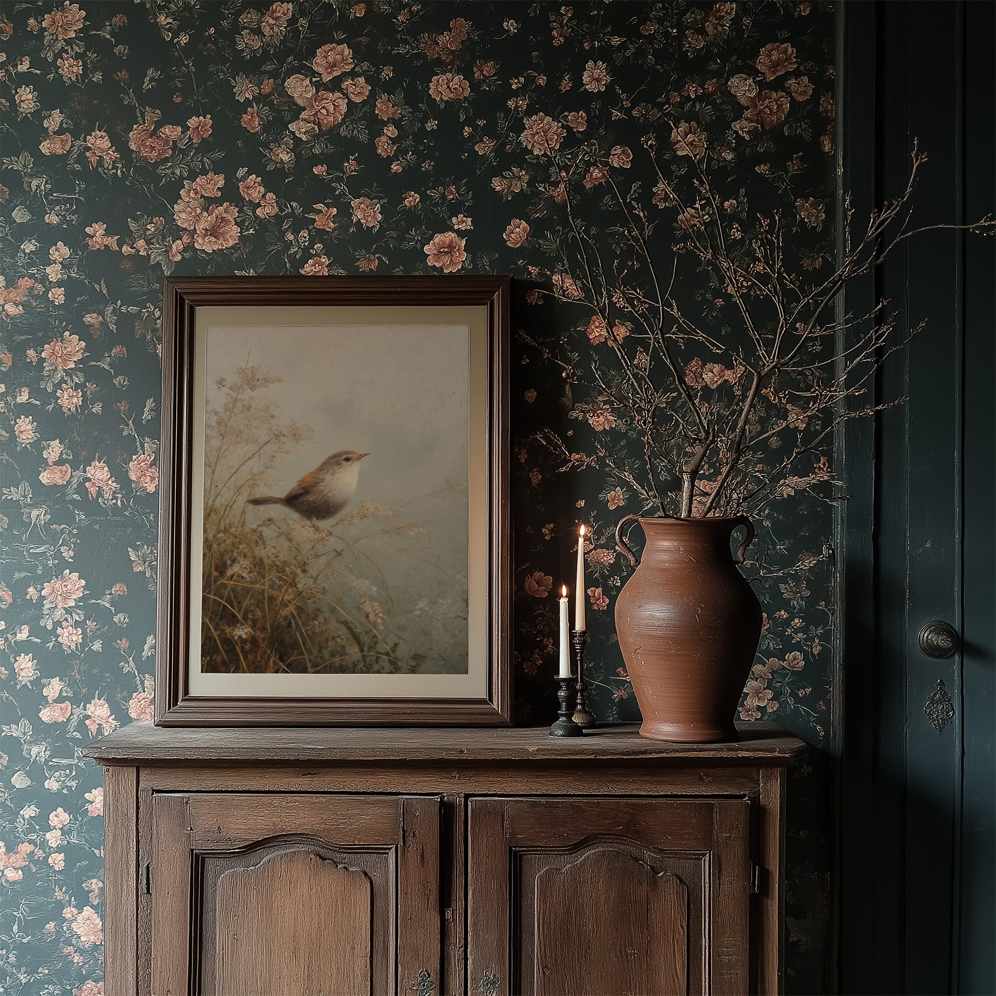 A solitary moment captured in muted tones, where time seems to pause for this delicate songbird. The small wren rests among dried grasses and wispy seed heads, its soft browns and creams harmonizing with the gentle palette of faded autumn vegetation. The artwork's ethereal quality is enhanced by its placement against a dramatic black wall, where afternoon light casts geometric patterns across the herringbone floor. This elegant ornithological study brings a touch of refined nature into sophisticated spaces like dining rooms or libraries.