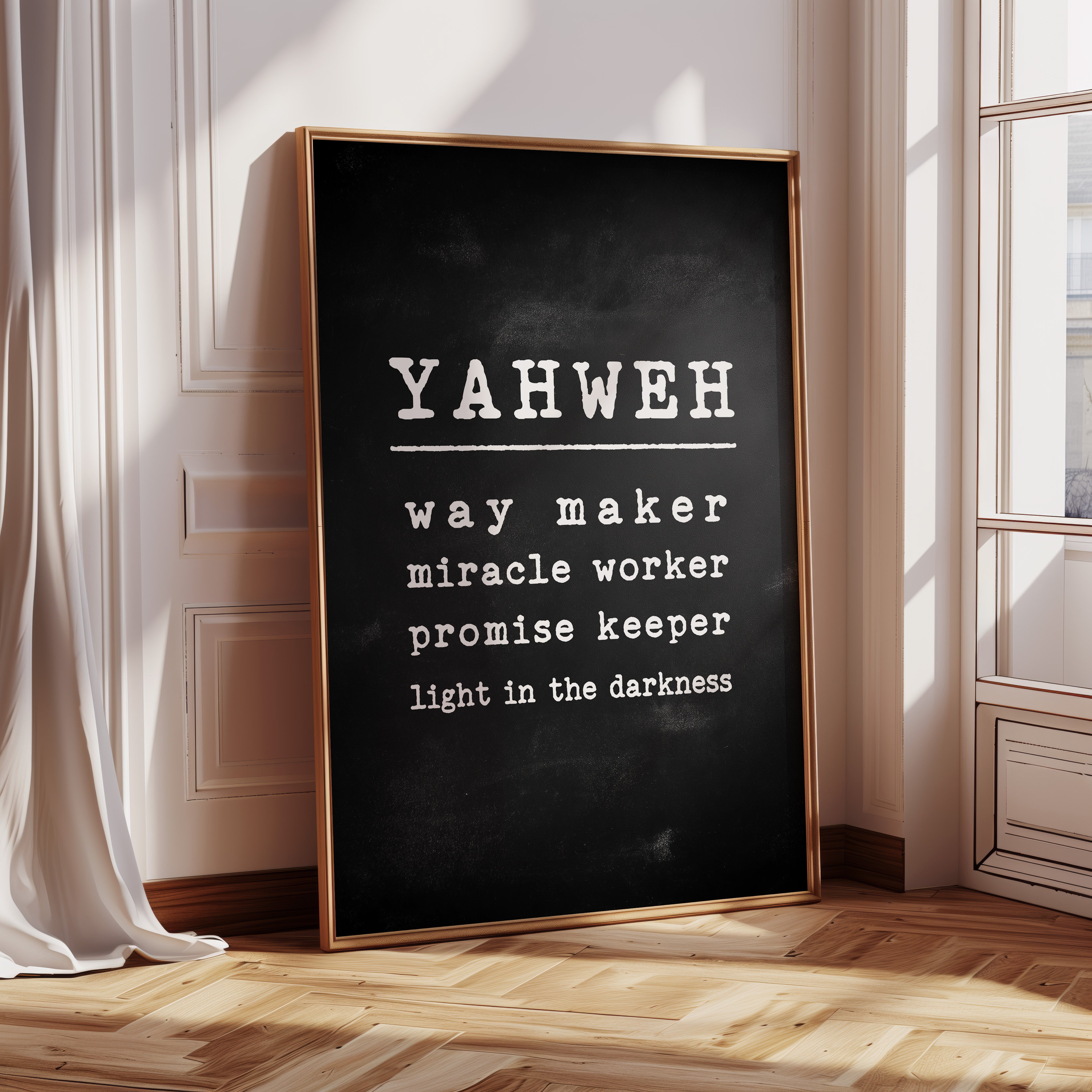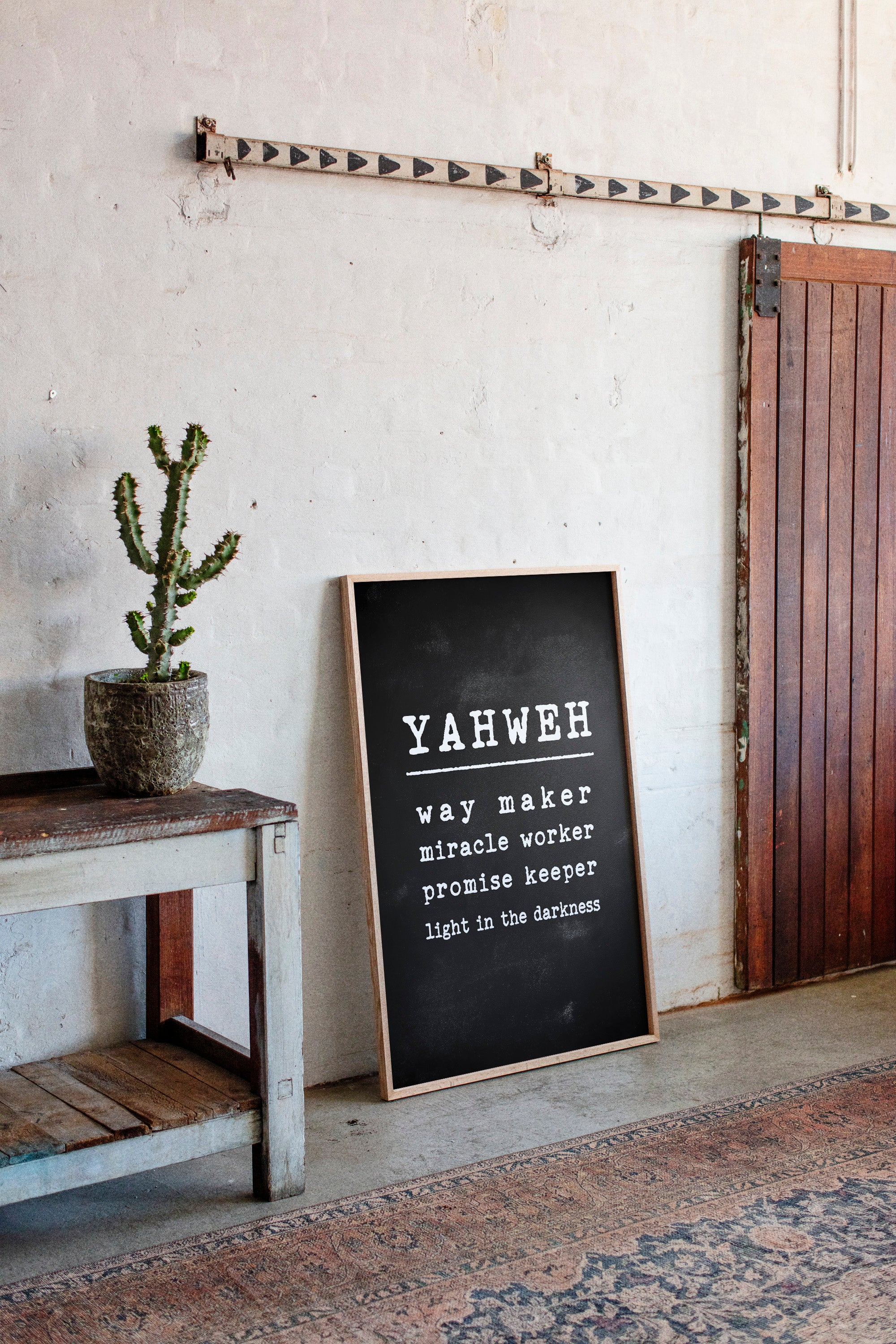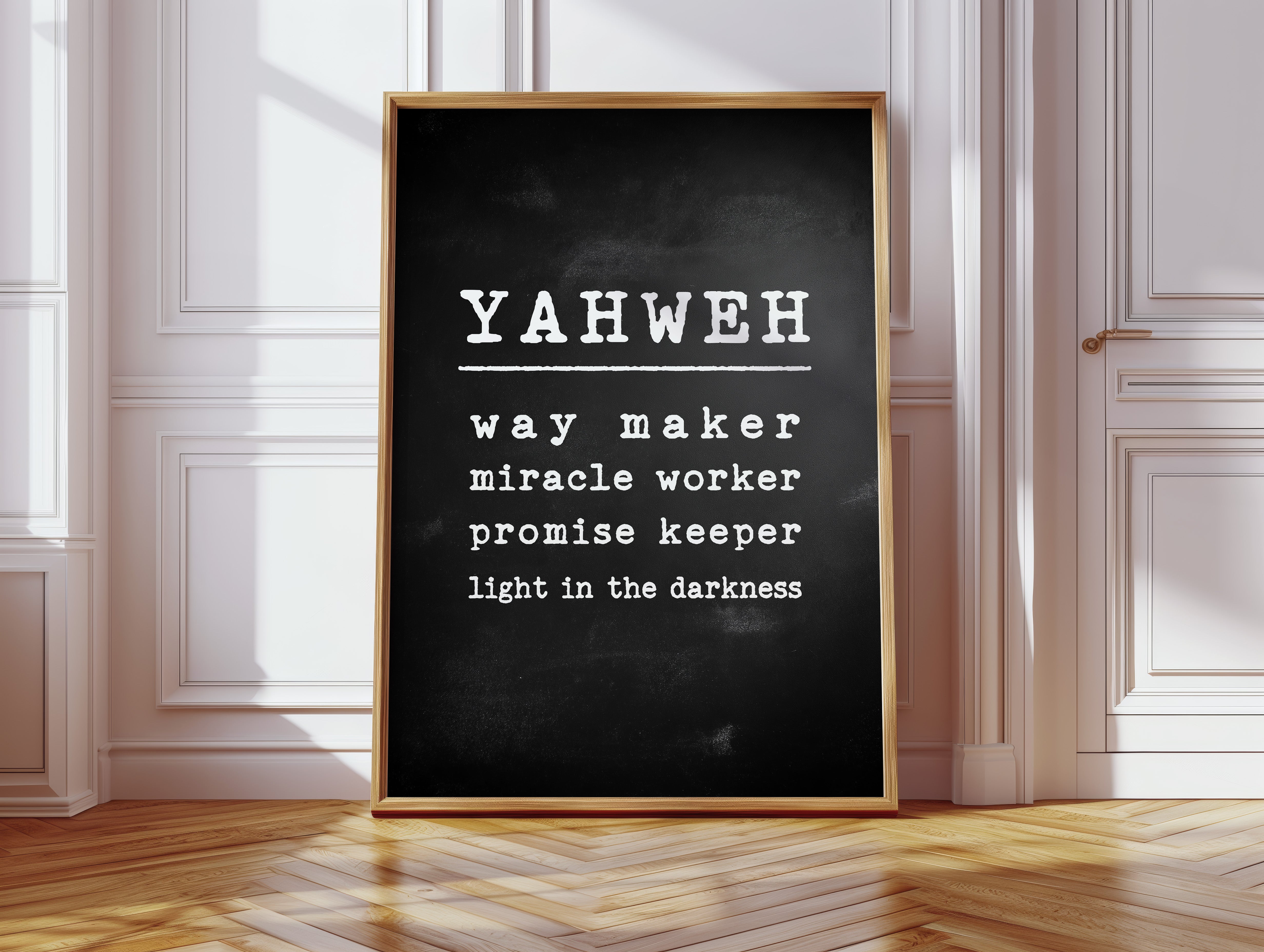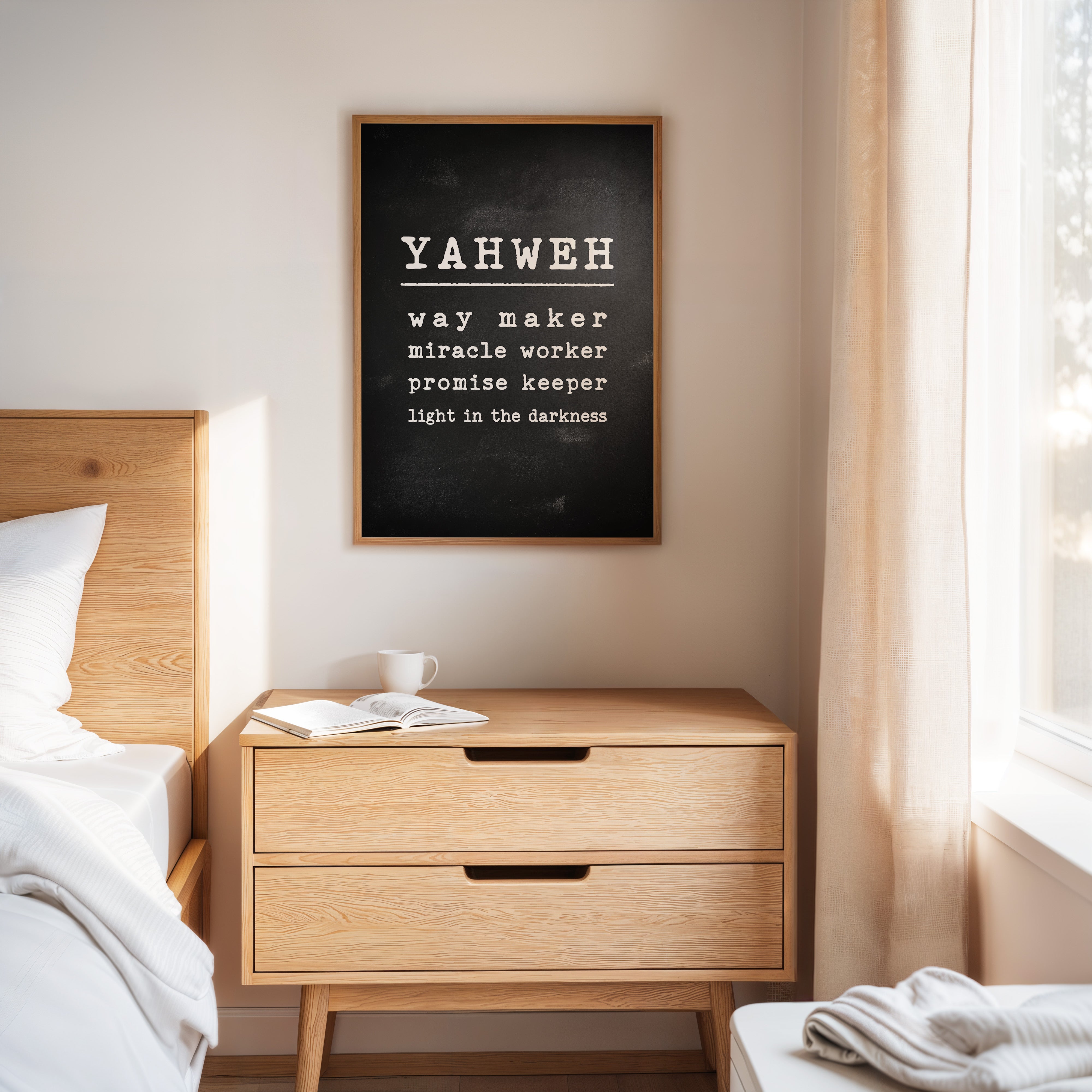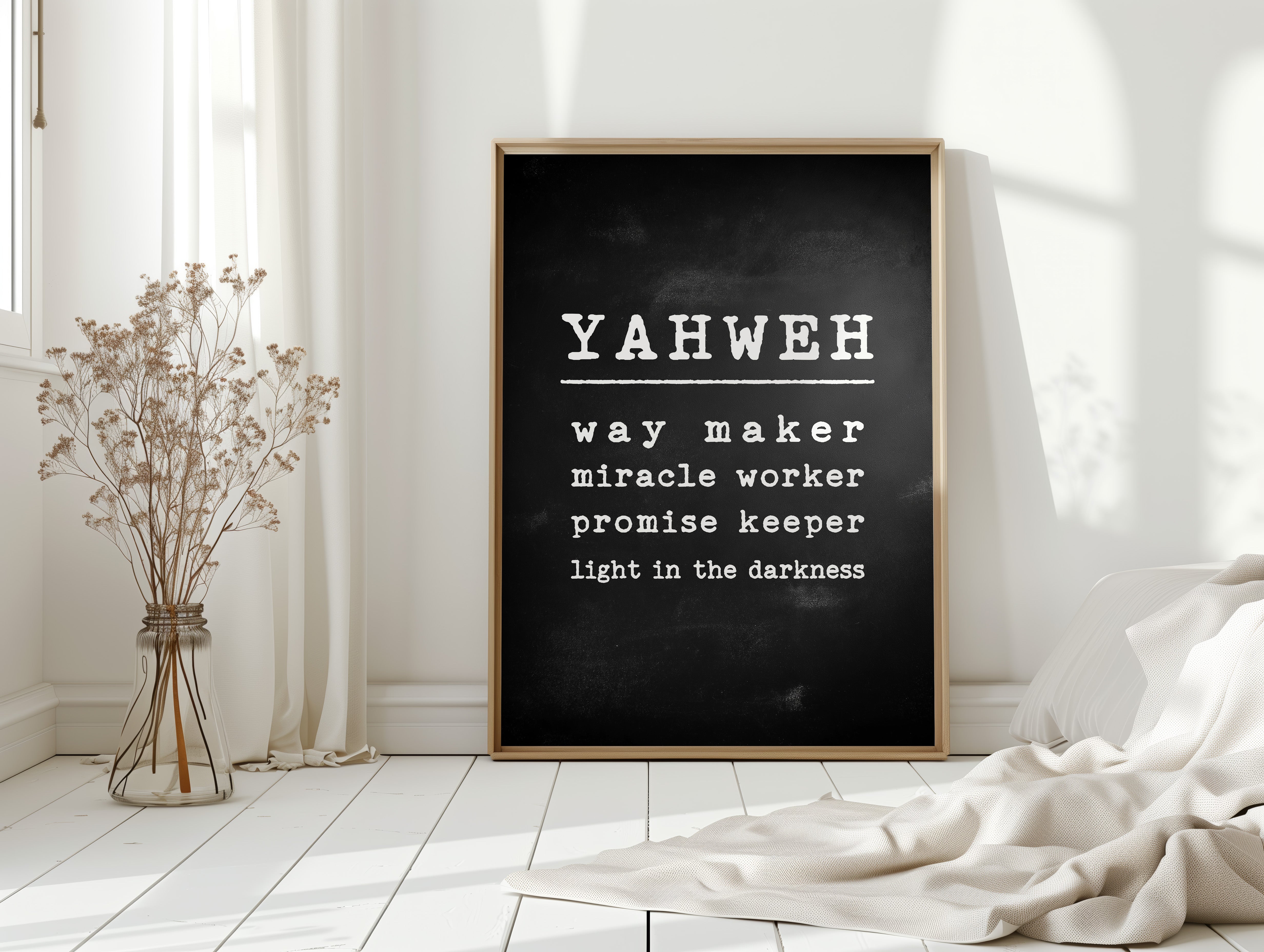 Bold and reverent, this chalkboard-style piece declares the powerful names of God—way maker, promise keeper, miracle worker—etched with clarity and purpose.