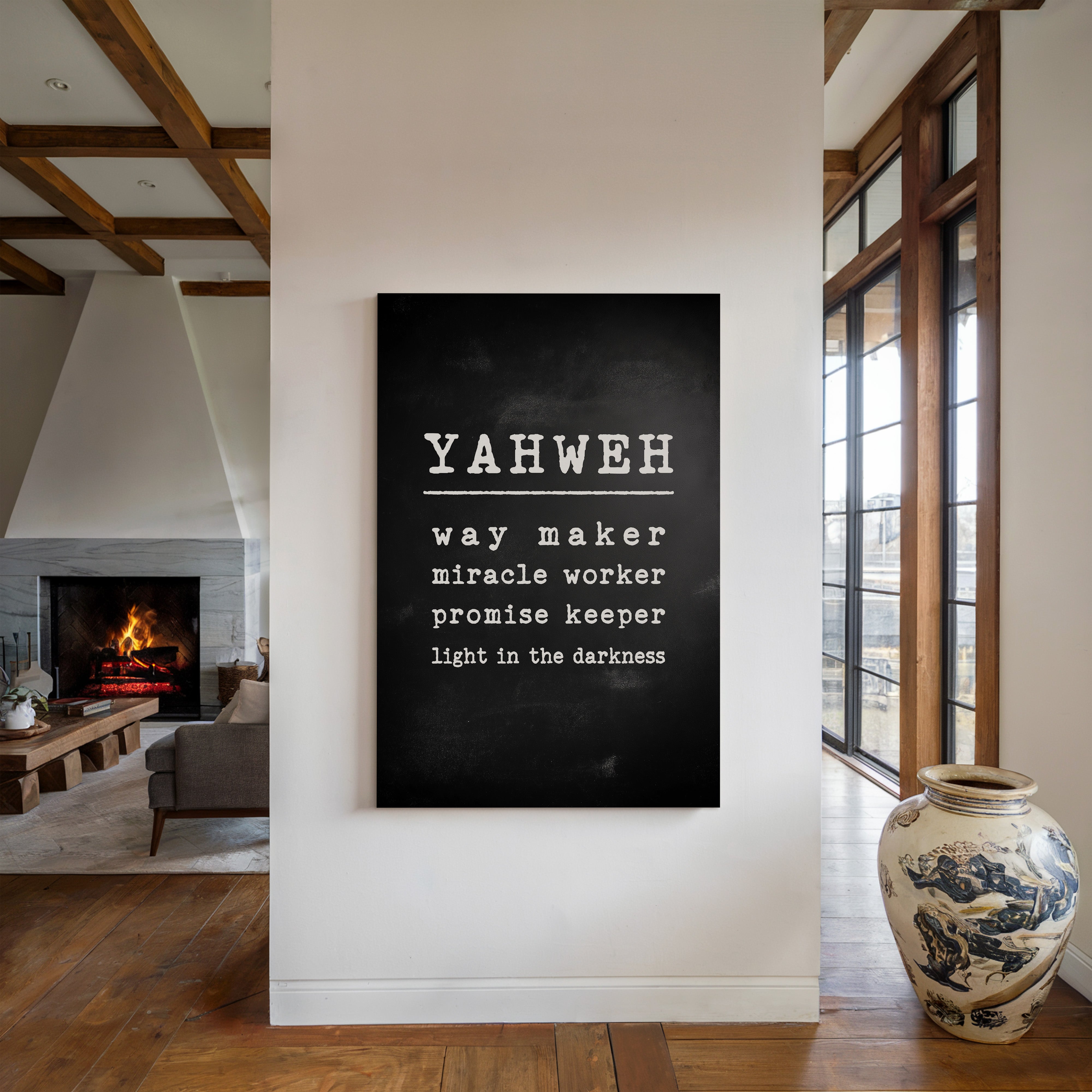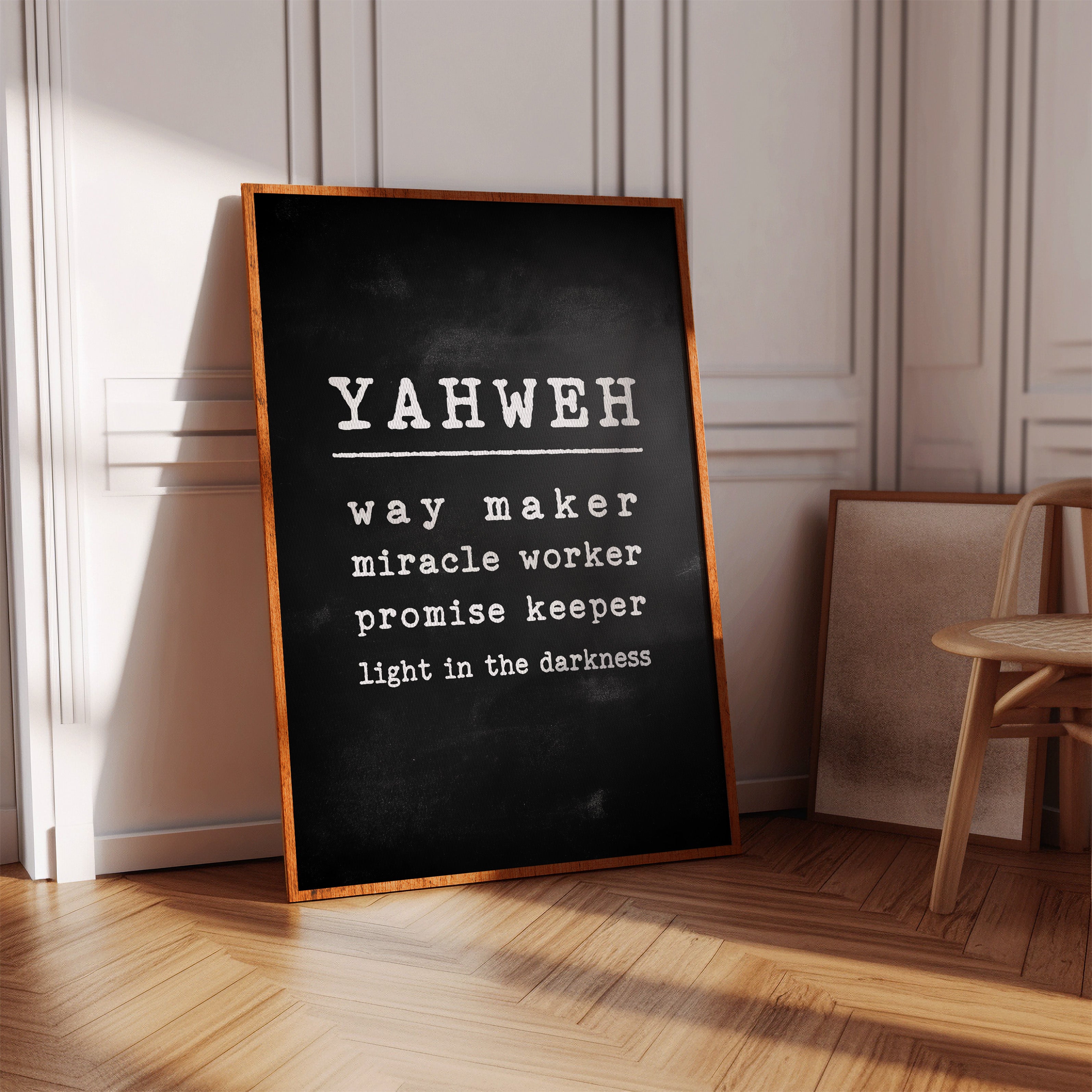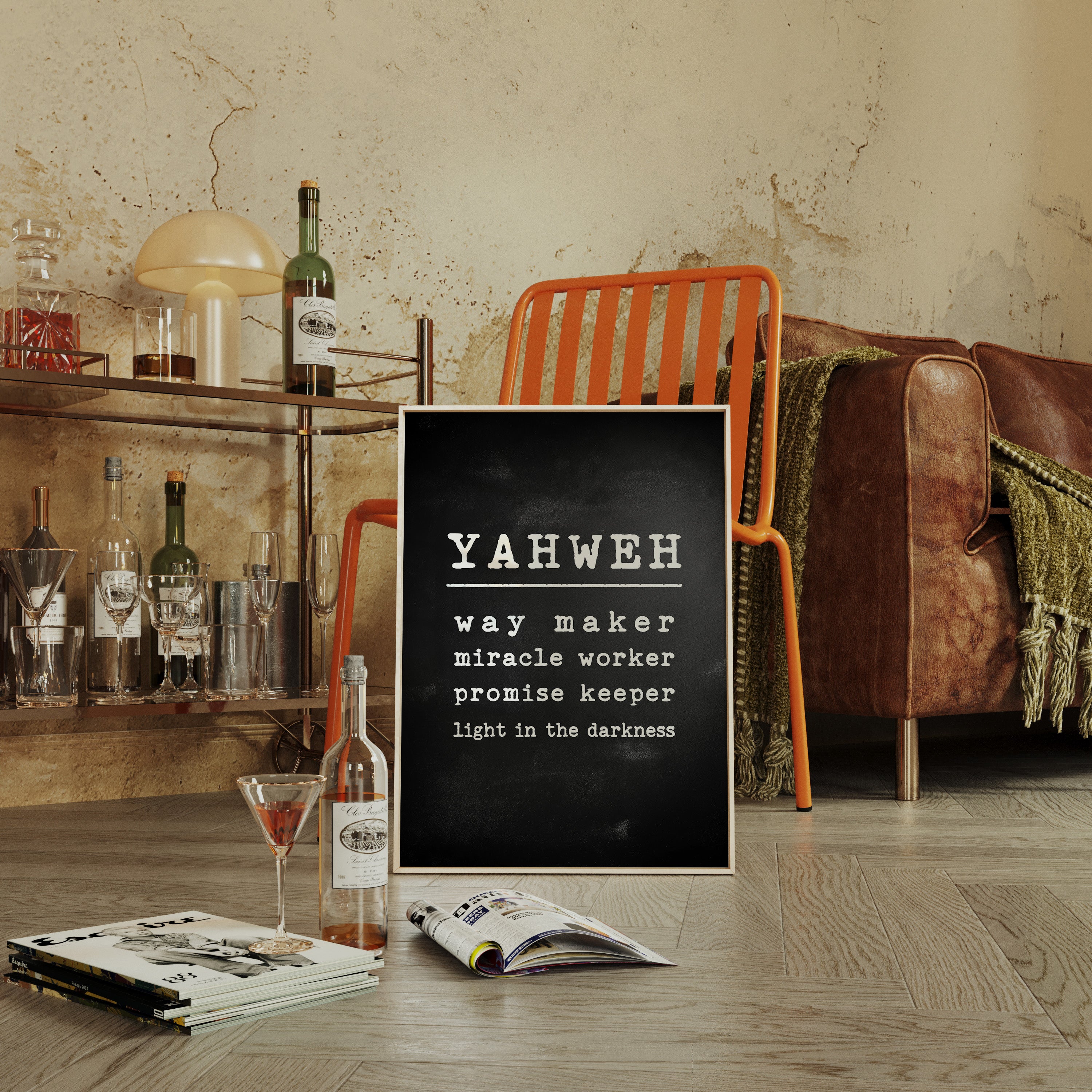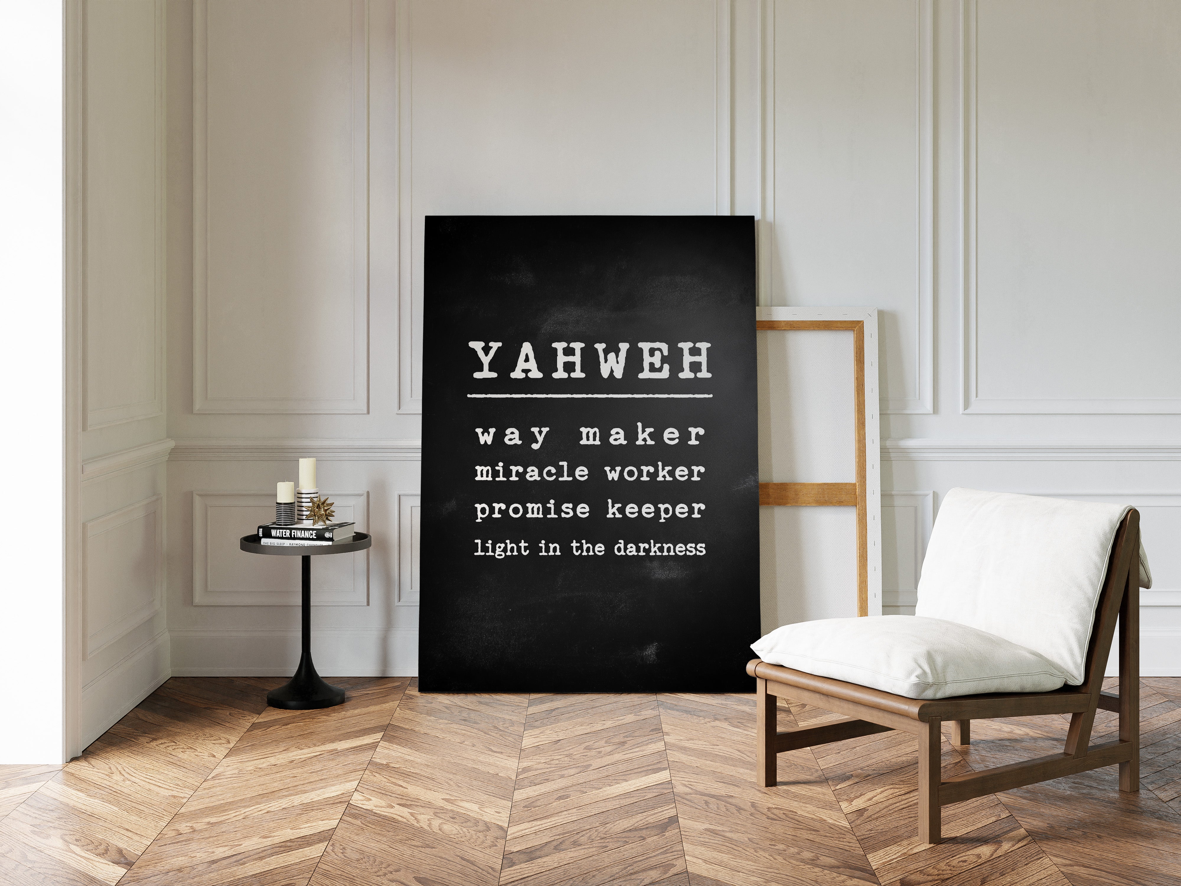 Bold and reverent, this chalkboard-style piece declares the powerful names of God—way maker, promise keeper, miracle worker—etched with clarity and purpose.