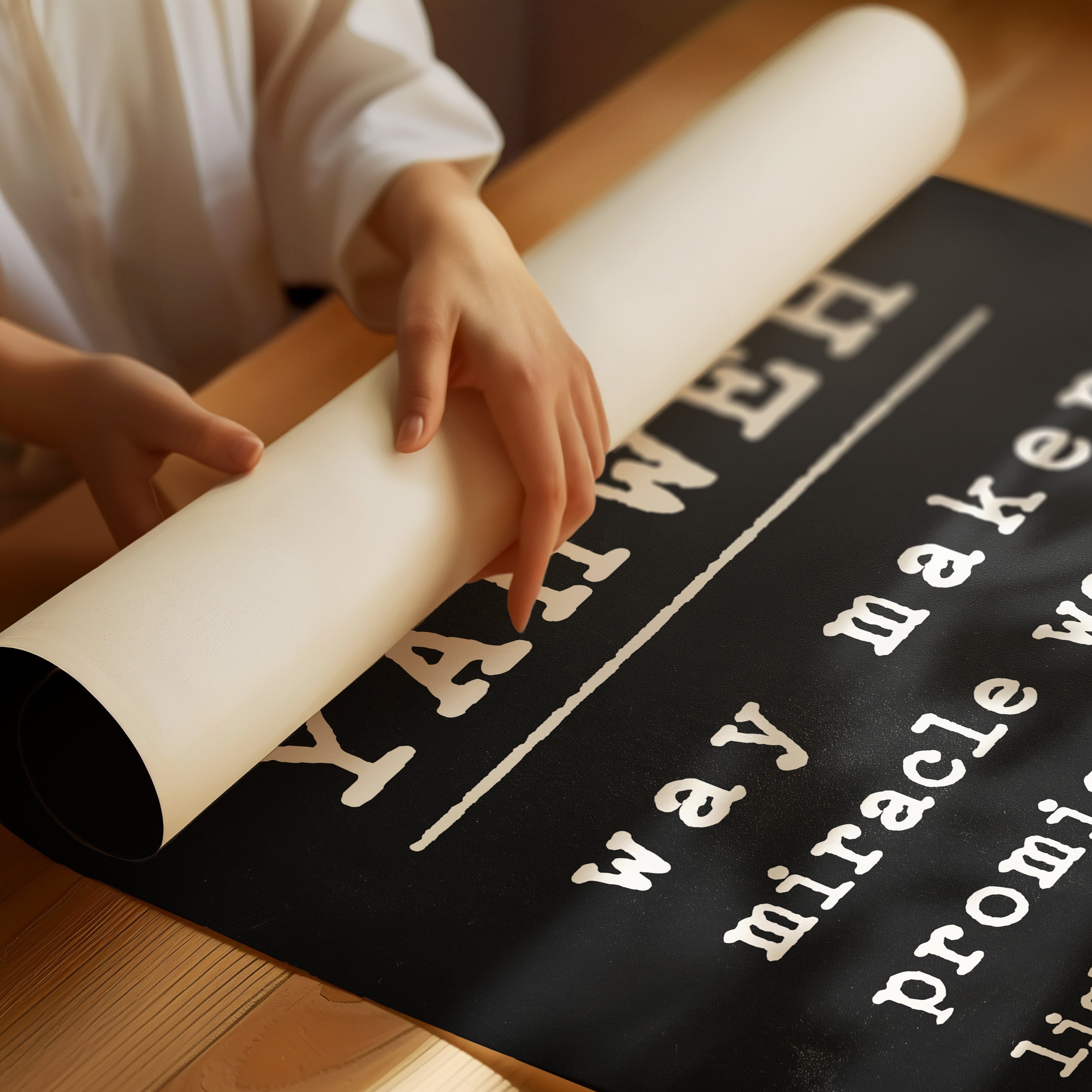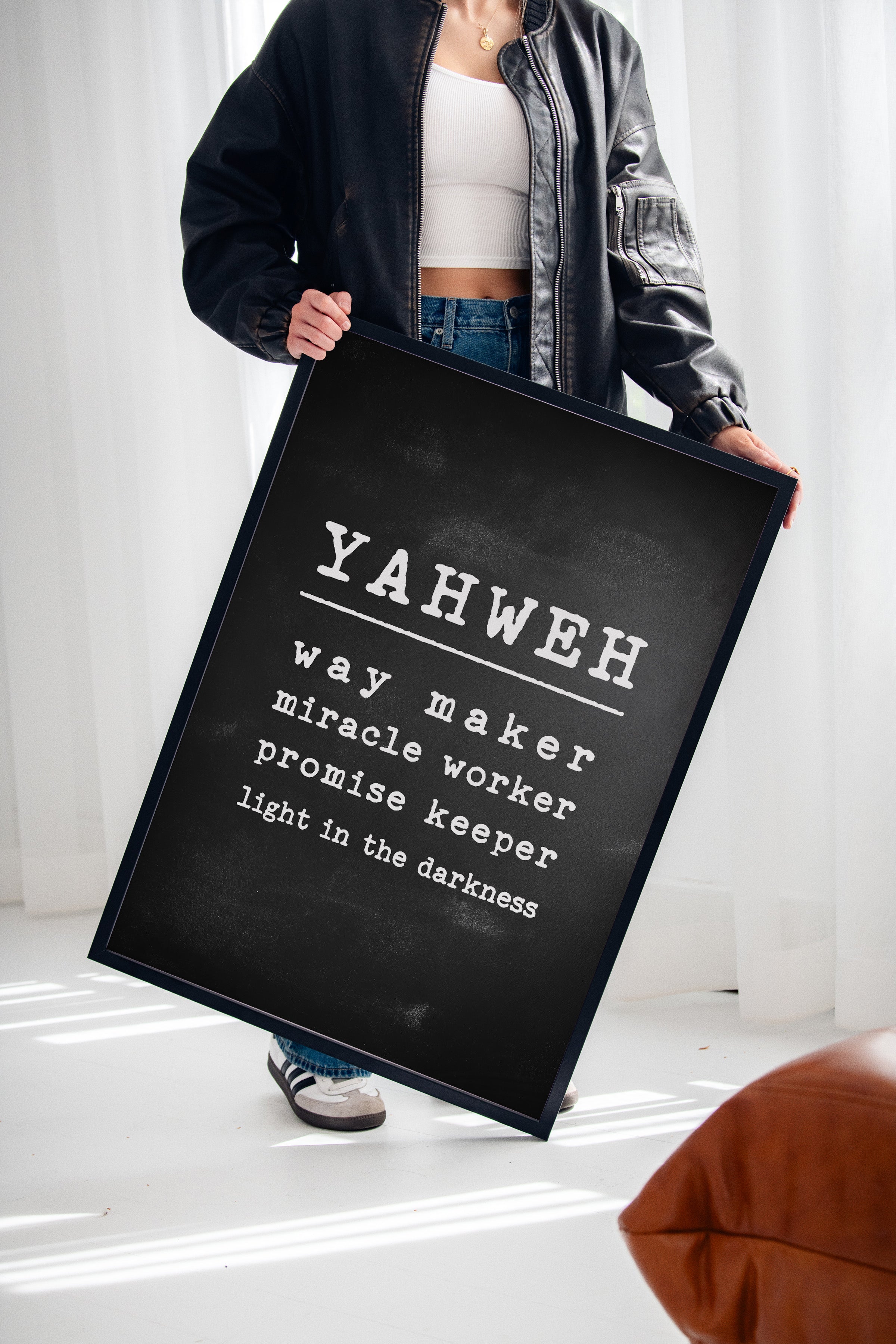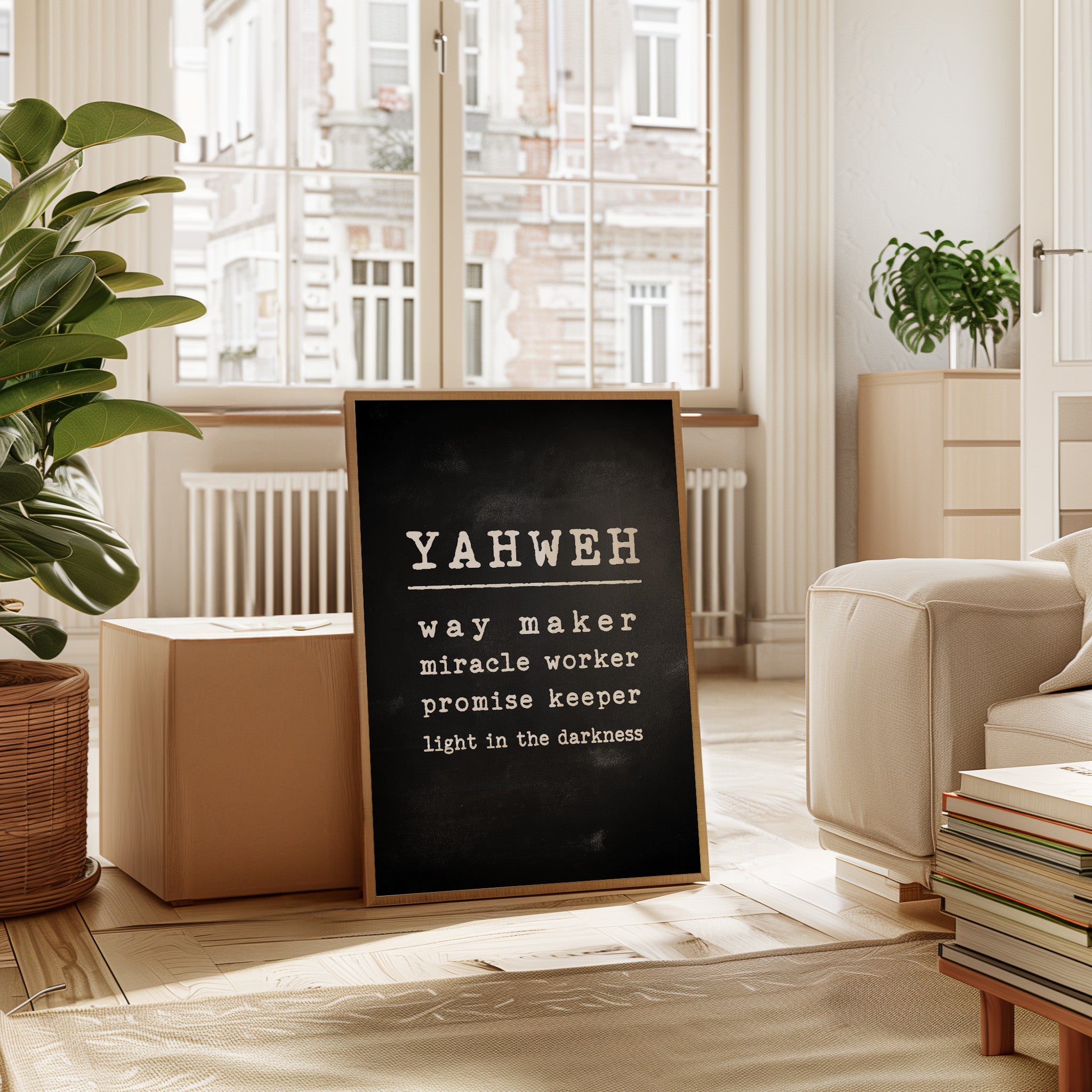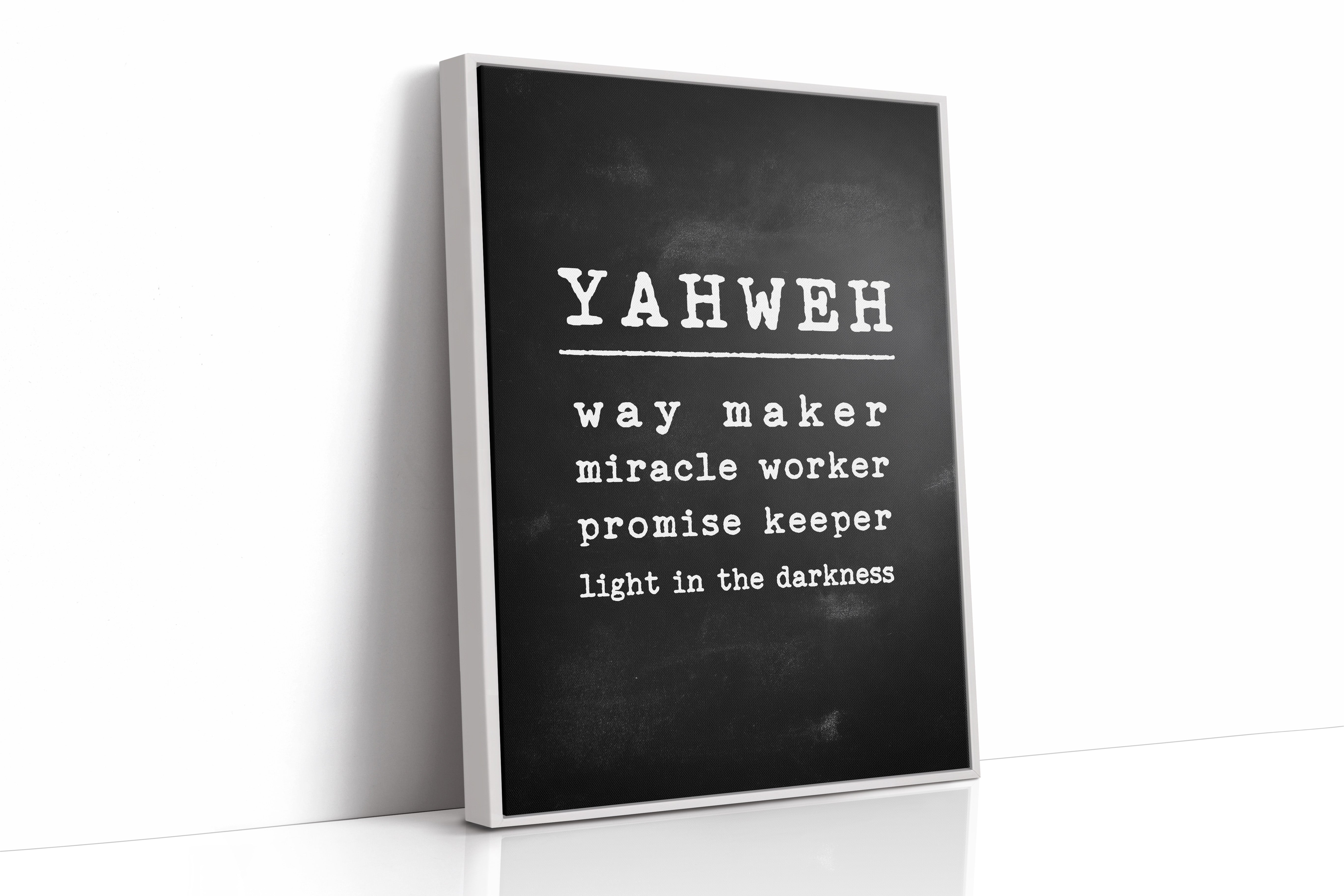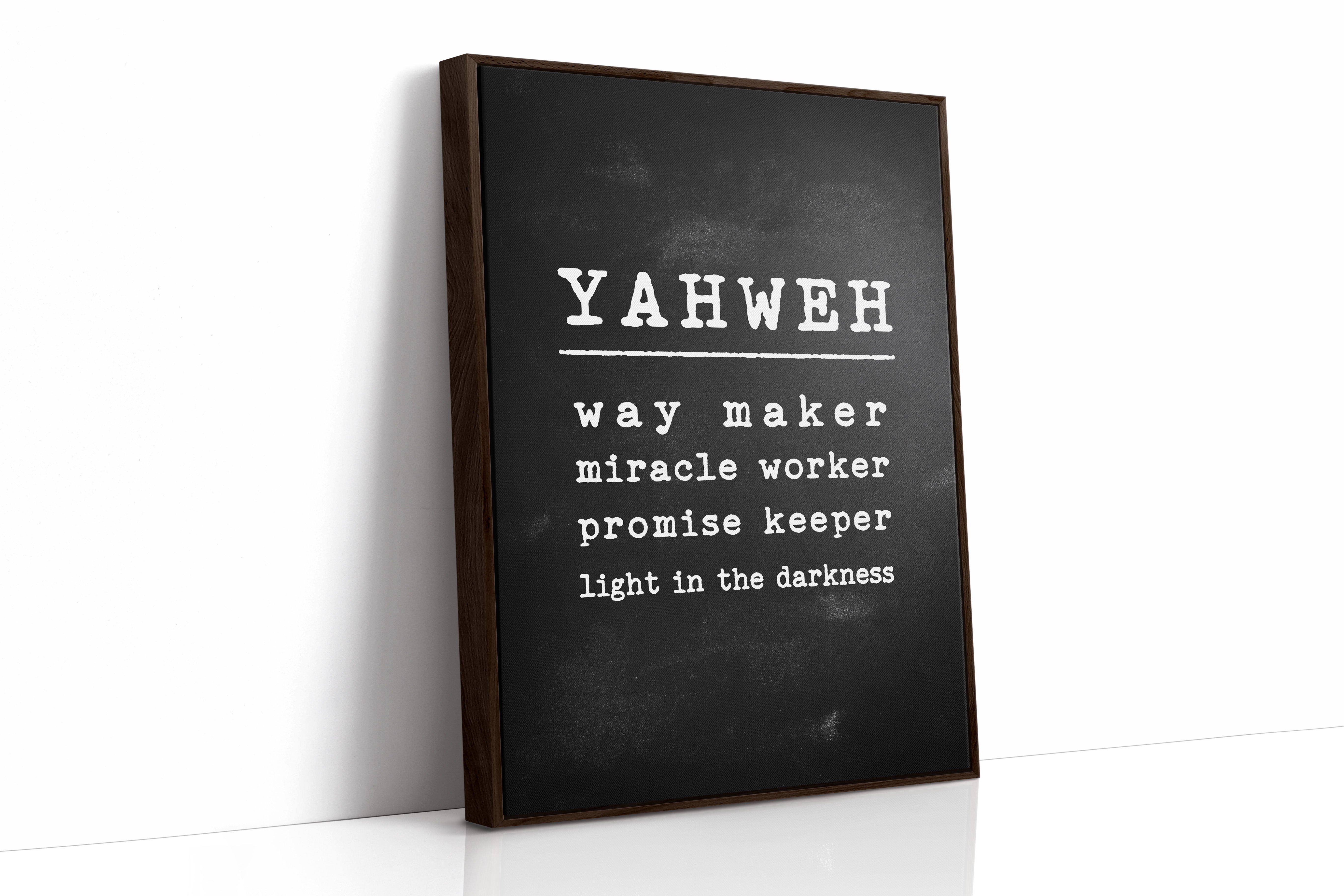Bold and reverent, this chalkboard-style piece declares the powerful names of God—way maker, promise keeper, miracle worker—etched with clarity and purpose.